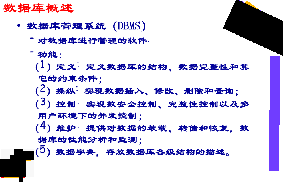 ACCESS2010基础教程数据库概述数据库概述数据库概述数据库概述6.1数据库概述举例:图书馆===数据库数据库概述数据库管理系统(DBMS)对数据库进行管理的软件.功能:(1)定义:定义数据库的结构、数据完整性和其它的约束条件;(2)操纵:实现数据插入、修改、删除和查询;(3)控制:实现数安全控制、完整性控制以及多用户环境下的并发控制;(4)维护:提供对数据的装载、转储和恢复,数据库的性能分析和监测;(5)数据字典,存放数据库各级结构的描述。应用程序利用DBMS开发的应用软件。数据库管理员(DBA)负责管理数据库资源;确定用户需求,设计、实现数据库;并负责维护和管理数据库。数据库系统(DBS)完整的数据库系统由硬件、数据库、数据库管理系统、操作系统、应用程序、数据库管理员等部分组成。应用程序三.数据库系统的体系结构二级映射用于三级模式之间的转换。(1)外模式/模式映射定义外模式和概念模式之间的对应性,这一映射使得概念模式的改变不影响外模式和应用程序,从而达到了数据的逻辑独立性。(2)模式/内模式映射定义概念模式和内模式之间的对应性,当存储结构改变即修改内模式时,只要相应改变模式/内模式映象,而模式尽量保存不变,从而达到了数据的物理独立性。数据库系统的体系结构数据模型数据模型实体集之间的联系实体集之间的联系实体集之间的联系E-R图举例:网上成绩查询管理系统的E-R图学生实体集和课程实体集之间的关系逻辑数据模型逻辑数据模型逻辑数据模型逻辑数据模型物理数据模型物理数据模型关系数据库关系数据库关系模型中的常用术语关系模型中的常用术语关系模型中的常用术语关系模型中的常用术语关系模型中的常用术语关系模型中的常用术语关系模型的特点关系的基本运算关系的基本运算关系的基本运算专门的关系运算——选择、投影、连接由E-R图设计关系模型根据概念数据模型设计关系数据模型一个实体集转换为一个关系模式,实体集的属性就是关系的属性Access简介ACCESS数据库管理系统Access的启动6.4.1创建数据库和数据表数据完整性控制参照完整性示例建立student表和sel_course表间的关联关系school数据库中各表的关联关系数据查询多种查询视图多种查询类型说明数据库组成数据库组成数据库组成数据库组成数据库组成数据库组成数据表的建立和使用建立数据表编辑数据表建立表间关系建立表间关系数据表的使用数据表的使用查询查询的类型设计视图窗口的组成课堂训练实体完整性课堂训练用户定义的完整性课堂训练参照完整性课堂训练参照完整性课堂训练参照完整性课堂训练用两个表的数据建立查询课堂训练用查询对数据进行分类汇总动手练习:建立一个学生数据库,并向该数据库中添加6个数据表,分别为:课程表、开课计划表、选课成绩表、学生表、教师表、系部表等。这几个表的字段分别如下所示:课程表(课程编号、课程名称、课程类别)说明:主键字段是课程编号,数字类型,整型,必添字段,课程名称,文本性,长度为50,必添字段,不允许空白字符串课程类别:文本性,长度为10选课成绩表(选课代码、学号、平时成绩、考试成绩、总评成绩、成绩等级)说明:选课代码,数字类型,整型,必填字段学号,数字类型,整型,必填字段平时成绩,数字类型,单精度,小数位数2考试成绩,数字类型,单精度,小数位数2总评成绩,数字类型,单精度,小数位数2成绩等级,文本,长度为2学生表(学号、姓名、性别、电话)说明:学号,主键,数字类型,长度为5,必填字段姓名,文本类型,长度为20,必填字段,不允许为空性别,文本类型,长度为2,进行有效性规则的设定及有效性文本的设定,默认为男电话,文本型,长度为13,输入掩码属性定义为9000-90000000;0;#教师表(教师编号、系部编号、姓名、性别、职称)说明:教师编号,数字类型,长度为4,主键,必填字段系部编号,数字类型,整型,不允许为空姓名,文本类型,长度20,不允许为空性别,文本类型,长度2,默认为男,不允许为空职称,文本类型,长度8系部表(系部编号、系部名称、负责人、联系电话)说明:系部编号,数字类型,整型系部名称,文本类型,50,不允许为空负责人,文本类型,50联系电话,文本类型,长度11查询总结窗体的使用