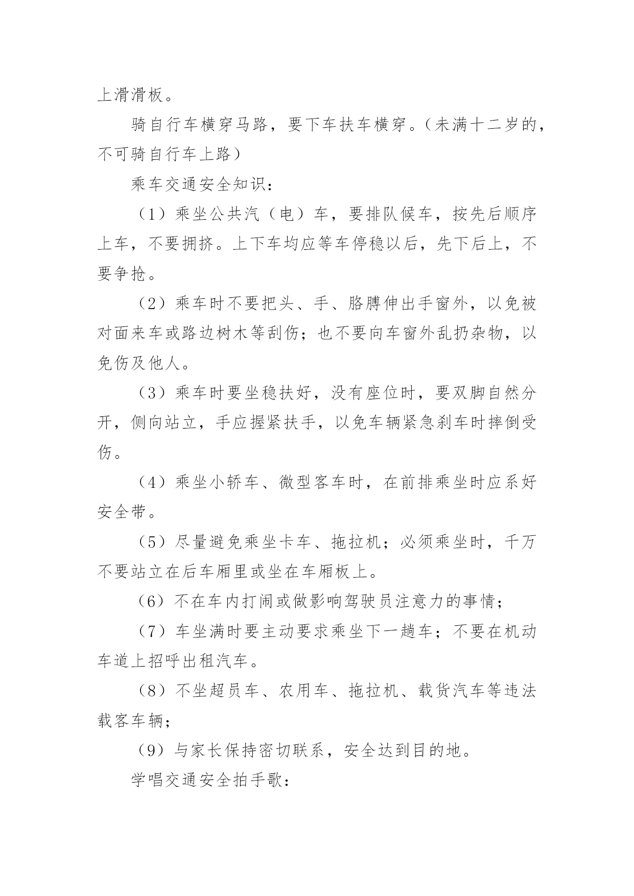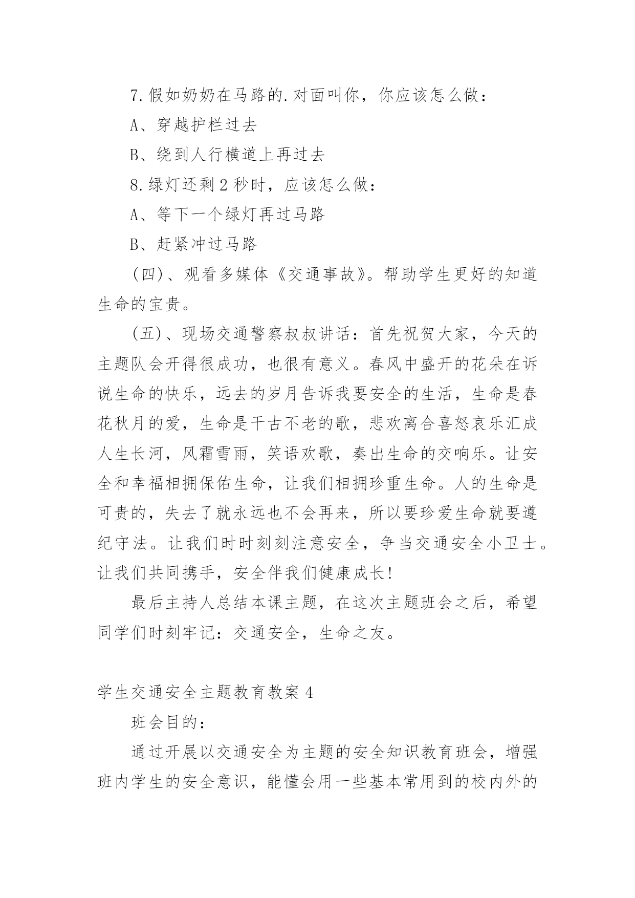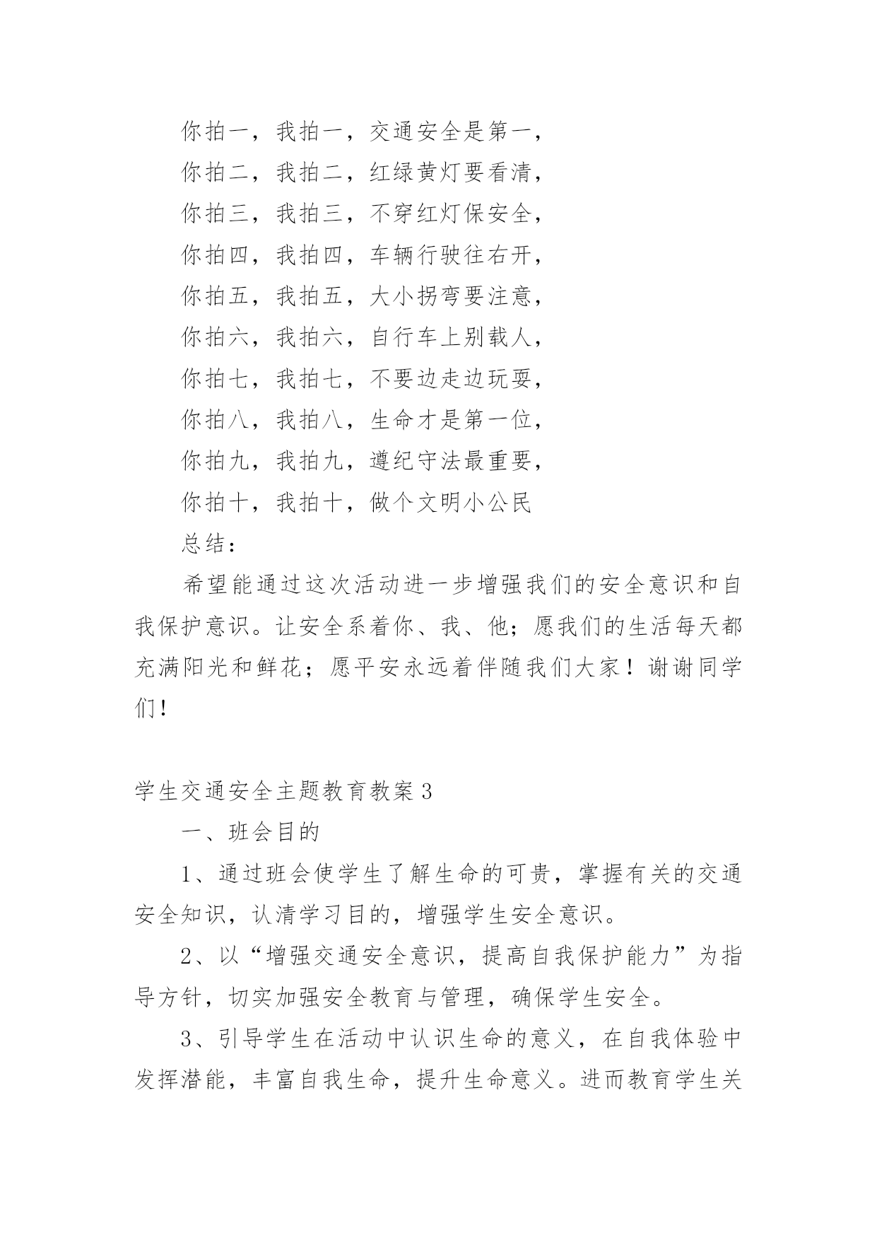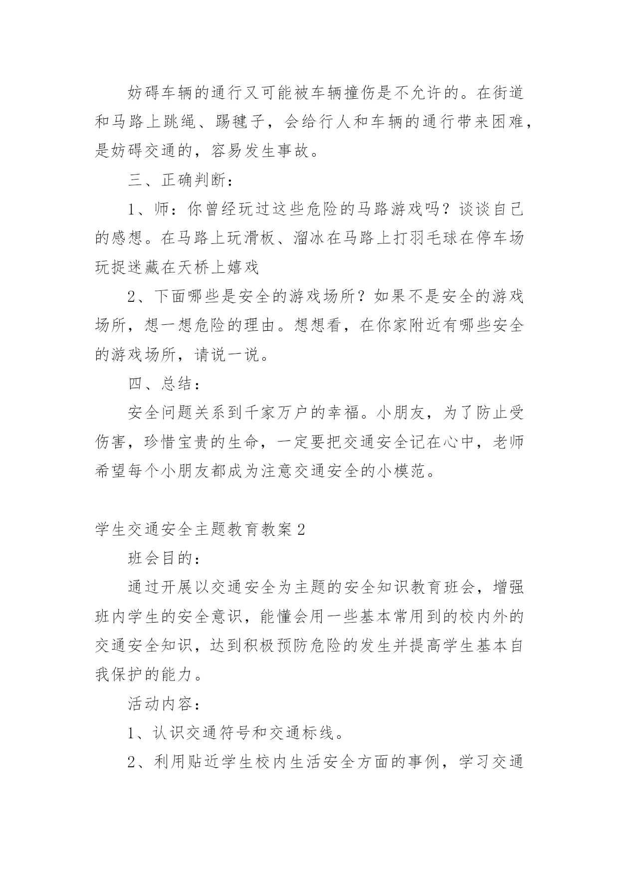 学生交通安全主题教育教案在教学工作者开展教学活动前,就有可能用到教案,借助教案可以提高教学质量,收到预期的教学效果。如何把教案做到重点突出呢?下面是小编为大家整理的学生交通安全主题教育教案,仅供参考,欢迎大家阅读。学生交通安全主题教育教案1活动目标:1、了解在道路上嬉戏的危险性。知道在马路和街道上玩耍、游戏、追逐打闹不光是单纯的违法行为,而是非常危险的。要在安全的场所嬉戏。2、了解《道路交通安全法实施条例》的有关规定,树立自我保护意识。活动时间:20xx年6月25日活动地点:教室活动过程:一、谈话导入师:同学们知道为什么每天放学我们都要宣誓,要遵守交通规则靠右行走,不在路上打闹么?生谈遵守交通规则的重要性二、回顾视频中讲述交通事故:让学生回顾观看的视频中的交通事故,讲述发生在自己身边的有关在道路上游戏的悲惨事故。师:交通是现代生活必不可少的.组成部分,它为现代人的生活提供了极大的方便。同时由于一些人重视交通安全的程度不够,它也给很多家庭带来了不幸。明辩事理:1、看图讨论:(图1)(图2)(图3)(图4)小朋友们在哪里,在干什么?接下来会发生什么事情?坐在隔离栏上聊天;闯红灯;在路上追追逃逃;肩并肩骑车2、师:你觉得他们这样做对不对?为什么?儿歌:妨碍交通危险大,事故发生在刹那,血的教训不能忘,自身安全要保障。3、师小结:同学们,马路和街道是为了通行便利而建造的。道路上的车辆川流不息,交通十分繁忙。有的同学喜欢在马路和街道玩耍、游戏、追逐、打闹,这不光是单纯的违法行为,而是非常危险的。出示《道路交通安全法实施条例》有关规定,读一读:行人不得在车行道内嬉闹,行人不得有追车、抛物击车等妨碍道路安全的行为。,行人不得在道路上使用滑板、旱冰鞋等滑行工具。4、师小结:放学以后在街道和马路上练习足球、打羽毛球,既妨碍车辆的通行又可能被车辆撞伤是不允许的。在街道和马路上跳绳、踢毽子,会给行人和车辆的通行带来困难,是妨碍交通的,容易发生事故。三、正确判断:1、师:你曾经玩过这些危险的马路游戏吗?谈谈自己的感想。在马路上玩滑板、溜冰在马路上打羽毛球在停车场玩捉迷藏在天桥上嬉戏2、下面哪些是安全的游戏场所?如果不是安全的游戏场所,想一想危险的理由。想想看,在你家附近有哪些安全的游戏场所,请说一说。四、总结:安全问题关系到千家万户的幸福。小朋友,为了防止受伤害,珍惜宝贵的生命,一定要把交通安全记在心中,老师希望每个小朋友都成为注意交通安全的小模范。学生交通安全主题教育教案2班会目的:通过开展以交通安全为主题的安全知识教育班会,增强班内学生的安全意识,能懂会用一些基本常用到的校内外的交通安全知识,达到积极预防危险的发生并提高学生基本自我保护的能力。活动内容:1、认识交通符号和交通标线。2、利用贴近学生校内生活安全方面的事例,学习交通之声。3、学唱交通儿歌。活动准备:1、收集适合学生特点的一些安全标志图片并打印部分图片。2、改编贴近学生实际的《安全歌》,收集有关交通的之声。活动过程师生问好并组织活动纪律,让班内学生明确本节班会的主题,让学生在生活中懂得珍惜爱护自己宝贵的生命,始终把安全放在第一位。接下来师引领学生回忆巩固五一前夕了解过的一些关于安全标志的图片,师问生答。认识:横穿马路应该注意些什么?横穿马路横穿马路,可能遇到的`危险因素会大大增加,应特别注意安全。穿越马路,要听从交通民警的指挥;要遵守交通规则,做到“绿灯行,红灯停”。穿越马路,要走人行横道线;在有过街天桥和过街地道的路段,应自觉走过街天桥和地下通道。穿越马路时,要走直线,不可迂回穿行;在没有人行横道的路段,应先看左边,再看右边,在确认没有机动车通过时才可以穿越马路。不要翻越道路中央的安全护栏和隔离墩,更不能在马路上滑滑板。骑自行车横穿马路,要下车扶车横穿。(未满十二岁的,不可骑自行车上路)乘车交通安全知识:(1)乘坐公共汽(电)车,要排队候车,按先后顺序上车,不要拥挤。上下车均应等车停稳以后,先下后上,不要争抢。(2)乘车时不要把头、手、胳膊伸出手窗外,以免被对面来车或路边树木等刮伤;也不要向车窗外乱扔杂物,以免伤及他人。(3)乘车时要坐稳扶好,没有座位时,要双脚自然分开,侧向站立,手应握紧扶手,以免车辆紧急刹车时摔倒受伤。(4)乘坐小轿车、微型客车时,在前排乘坐时应系好安全带。(5)尽量避免乘坐卡车、拖拉机;必须乘坐时,千万不要站立在后车厢里或坐在车厢板上。(6)不在车内打闹或做影响驾驶员注意力的事情;(7)车坐满时要主动要求乘坐下一趟车;不要在机动车道上招呼出租汽车。(8)不坐超员车、农用车、拖拉机、载货汽车等违法载客车辆;(9)与家长保持密切联系,安全达到目的地。学唱交通安全拍手歌:你拍一,我拍一,交通安全是第一,你拍二,我拍二,红绿黄灯要看清,你拍三,我拍三,不穿红灯保安全,