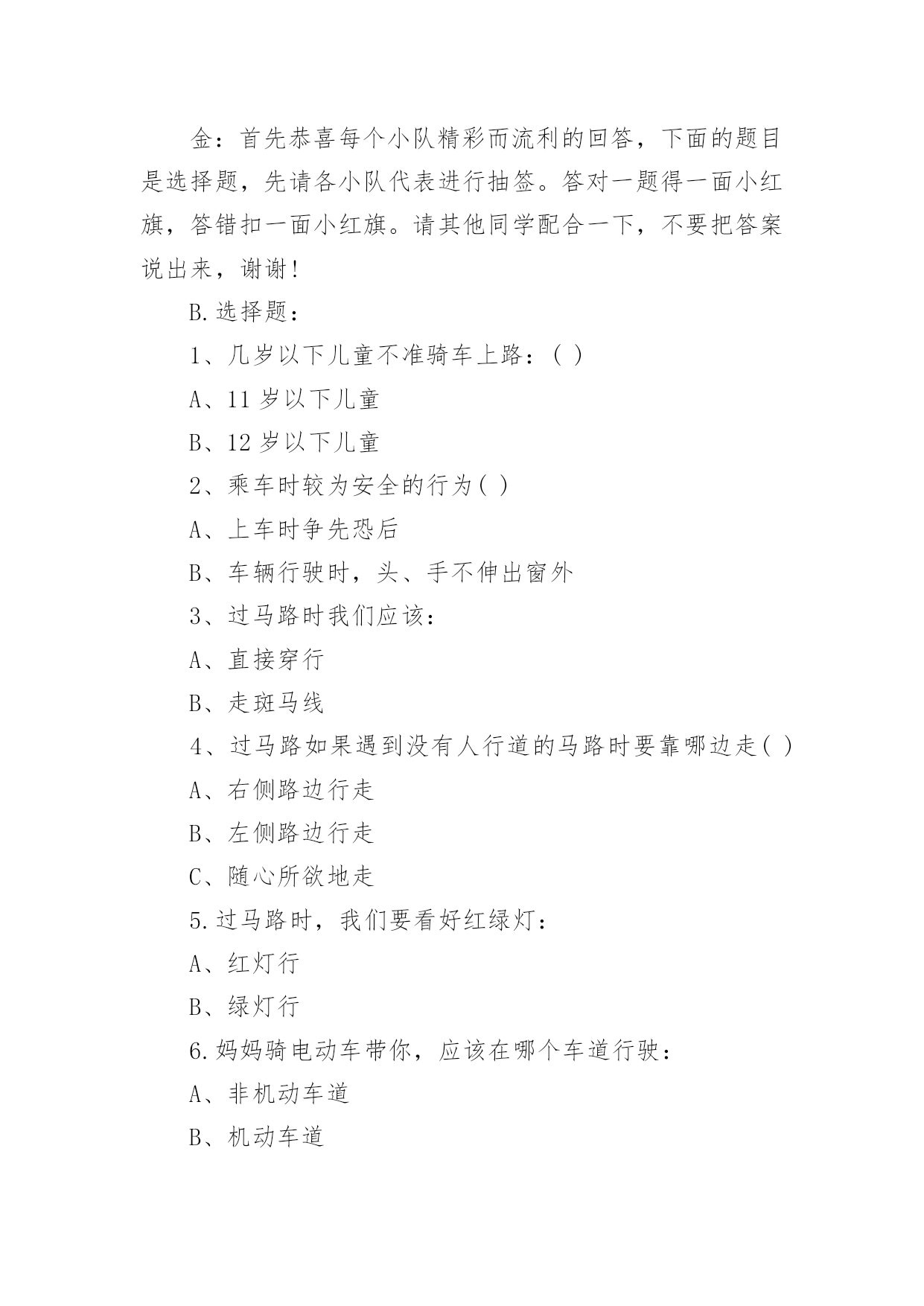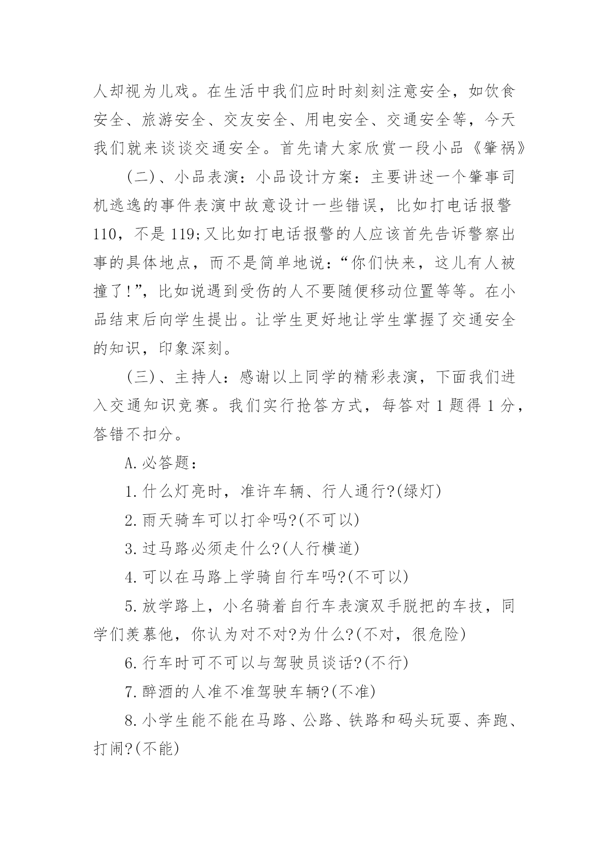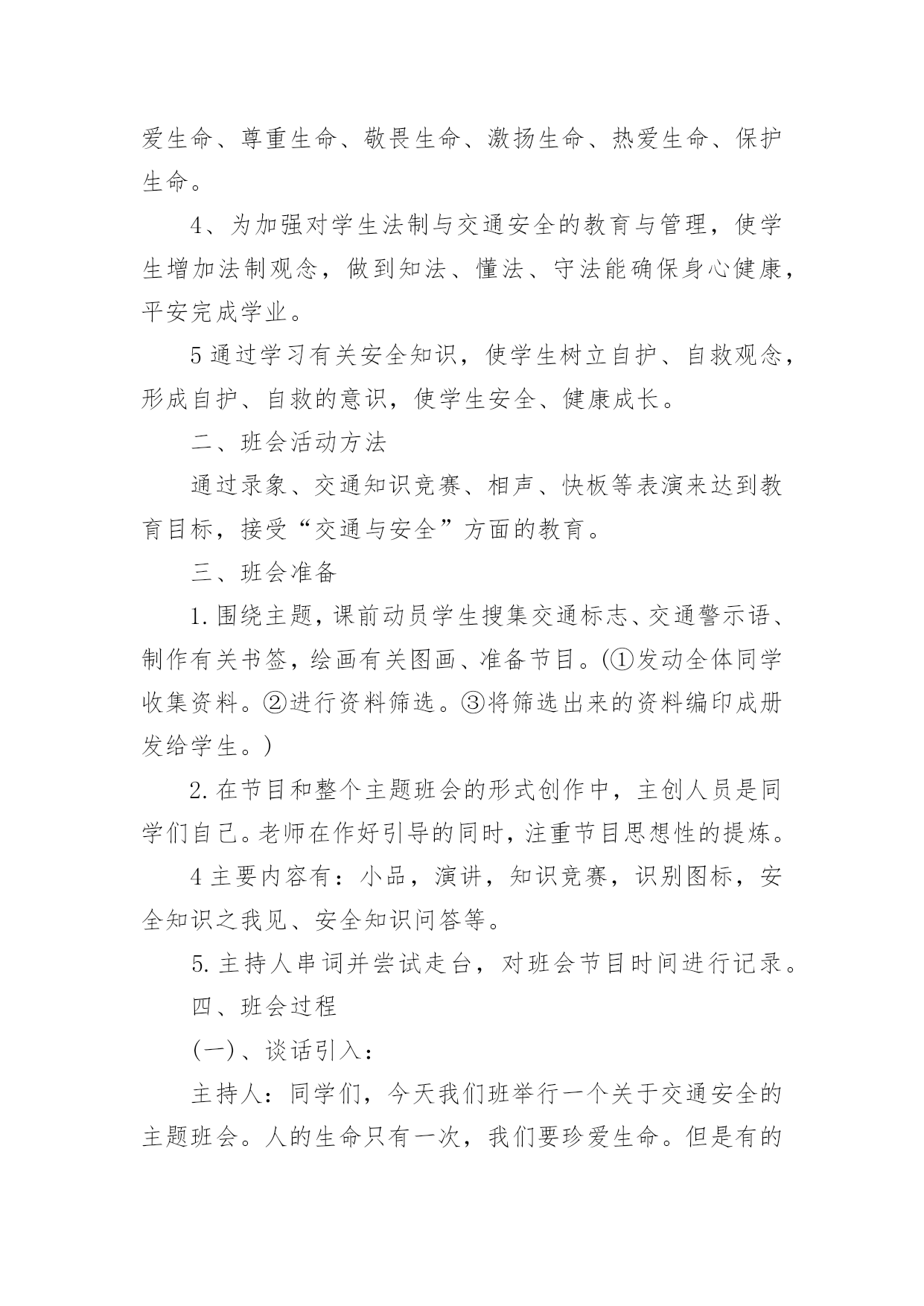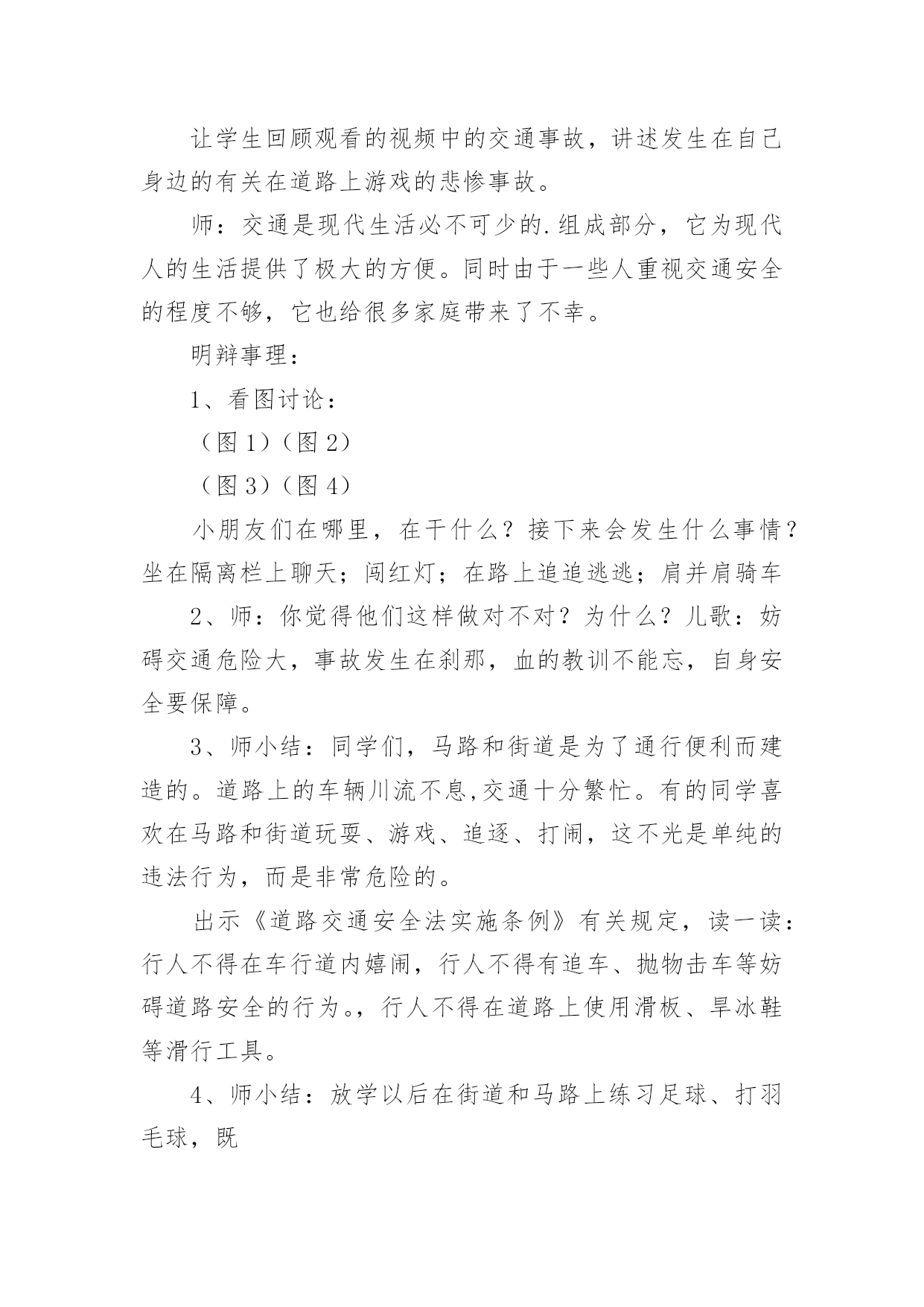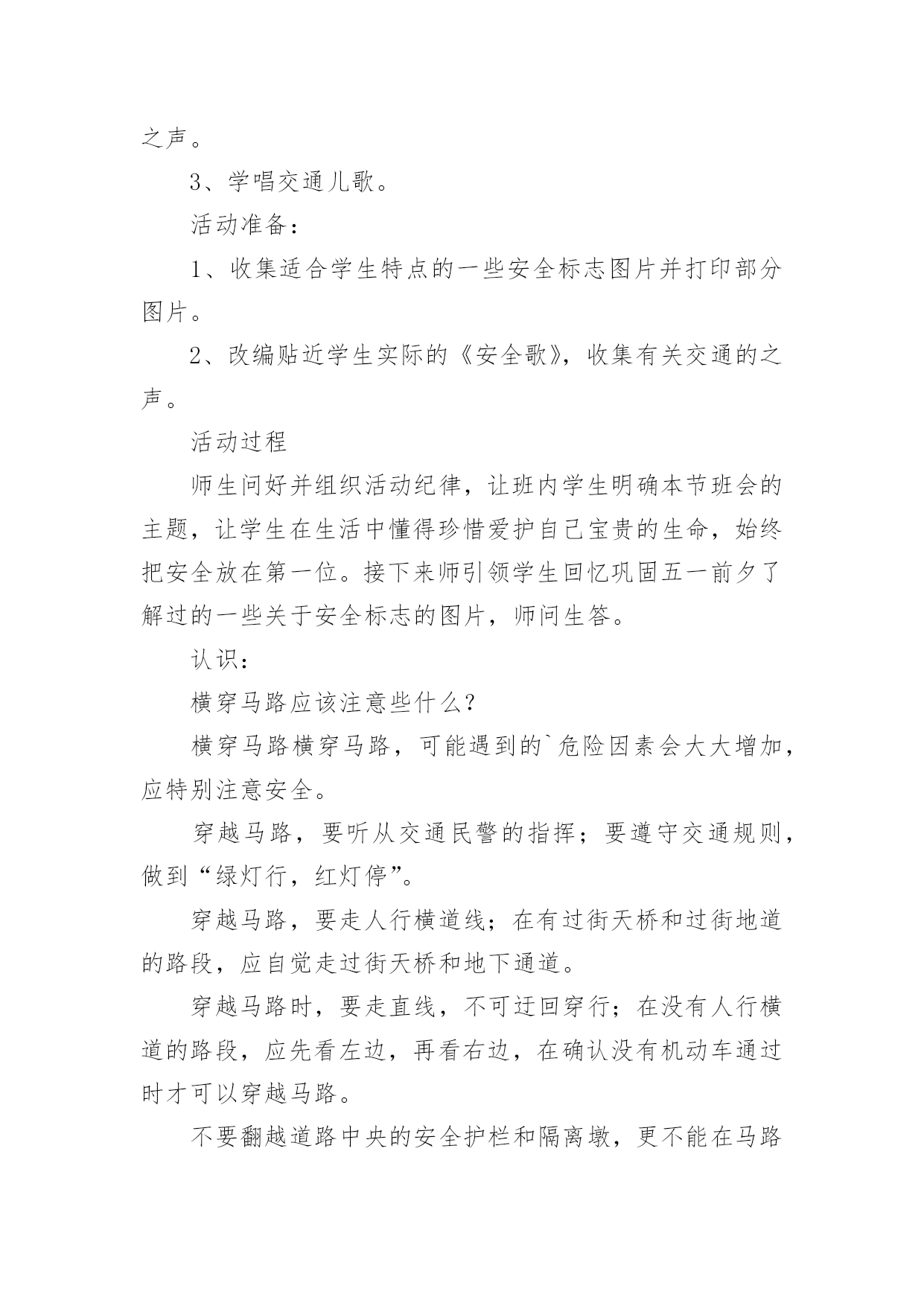 学生交通安全主题教育教案在教学工作者开展教学活动前,就有可能用到教案,借助教案可以提高教学质量,收到预期的教学效果。如何把教案做到重点突出呢?下面是小编为大家整理的学生交通安全主题教育教案,仅供参考,欢迎大家阅读。学生交通安全主题教育教案1活动目标:1、了解在道路上嬉戏的危险性。知道在马路和街道上玩耍、游戏、追逐打闹不光是单纯的违法行为,而是非常危险的。要在安全的场所嬉戏。2、了解《道路交通安全法实施条例》的有关规定,树立自我保护意识。活动时间:20xx年6月25日活动地点:教室活动过程:一、谈话导入师:同学们知道为什么每天放学我们都要宣誓,要遵守交通规则靠右行走,不在路上打闹么?生谈遵守交通规则的重要性二、回顾视频中讲述交通事故:让学生回顾观看的视频中的交通事故,讲述发生在自己身边的有关在道路上游戏的悲惨事故。师:交通是现代生活必不可少的.组成部分,它为现代人的生活提供了极大的方便。同时由于一些人重视交通安全的程度不够,它也给很多家庭带来了不幸。明辩事理:1、看图讨论:(图1)(图2)(图3)(图4)小朋友们在哪里,在干什么?接下来会发生什么事情?坐在隔离栏上聊天;闯红灯;在路上追追逃逃;肩并肩骑车2、师:你觉得他们这样做对不对?为什么?儿歌:妨碍交通危险大,事故发生在刹那,血的教训不能忘,自身安全要保障。3、师小结:同学们,马路和街道是为了通行便利而建造的。道路上的车辆川流不息,交通十分繁忙。有的同学喜欢在马路和街道玩耍、游戏、追逐、打闹,这不光是单纯的违法行为,而是非常危险的。出示《道路交通安全法实施条例》有关规定,读一读:行人不得在车行道内嬉闹,行人不得有追车、抛物击车等妨碍道路安全的行为。,行人不得在道路上使用滑板、旱冰鞋等滑行工具。4、师小结:放学以后在街道和马路上练习足球、打羽毛球,既妨碍车辆的通行又可能被车辆撞伤是不允许的。在街道和马路上跳绳、踢毽子,会给行人和车辆的通行带来困难,是妨碍交通的,容易发生事故。三、正确判断:1、师:你曾经玩过这些危险的马路游戏吗?谈谈自己的感想。在马路上玩滑板、溜冰在马路上打羽毛球在停车场玩捉迷藏在天桥上嬉戏2、下面哪些是安全的游戏场所?如果不是安全的游戏场所,想一想危险的理由。想想看,在你家附近有哪些安全的游戏场所,请说一说。四、总结:安全问题关系到千家万户的幸福。小朋友,为了防止受伤害,珍惜宝贵的生命,一定要把交通安全记在心中,老师希望每个小朋友都成为注意交通安全的小模范。学生交通安全主题教育教案2班会目的:通过开展以交通安全为主题的安全知识教育班会,增强班内学生的安全意识,能懂会用一些基本常用到的校内外的交通安全知识,达到积极预防危险的发生并提高学生基本自我保护的能力。活动内容:1、认识交通符号和交通标线。2、利用贴近学生校内生活安全方面的事例,学习交通之声。3、学唱交通儿歌。活动准备:1、收集适合学生特点的一些安全标志图片并打印部分图片。2、改编贴近学生实际的《安全歌》,收集有关交通的之声。活动过程师生问好并组织活动纪律,让班内学生明确本节班会的主题,让学生在生活中懂得珍惜爱护自己宝贵的生命,始终把安全放在第一位。接下来师引领学生回忆巩固五一前夕了解过的一些关于安全标志的图片,师问生答。认识:横穿马路应该注意些什么?横穿马路横穿马路,可能遇到的`危险因素会大大增加,应特别注意安全。穿越马路,要听从交通民警的指挥;要遵守交通规则,做到“绿灯行,红灯停”。穿越马路,要走人行横道线;在有过街天桥和过街地道的路段,应自觉走过街天桥和地下通道。穿越马路时,要走直线,不可迂回穿行;在没有人行横道的路段,应先看左边,再看右边,在确认没有机动车通过时才可以穿越马路。不要翻越道路中央的安全护栏和隔离墩,更不能在马路上滑滑板。骑自行车横穿马路,要下车扶车横穿。(未满十二岁的,不可骑自行车上路)乘车交通安全知识:(1)乘坐公共汽(电)车,要排队候车,按先后顺序上车,不要拥挤。上下车均应等车停稳以后,先下后上,不要争抢。(2)乘车时不要把头、手、胳膊伸出手窗外,以免被对面来车或路边树木等刮伤;也不要向车窗外乱扔杂物,以免伤及他人。(3)乘车时要坐稳扶好,没有座位时,要双脚自然分开,侧向站立,手应握紧扶手,以免车辆紧急刹车时摔倒受伤。(4)乘坐小轿车、微型客车时,在前排乘坐时应系好安全带。(5)尽量避免乘坐卡车、拖拉机;必须乘坐时,千万不要站立在后车厢里或坐在车厢板上。(6)不在车内打闹或做影响驾驶员注意力的事情;(7)车坐满时要主动要求乘坐下一趟车;不要在机动车道上招呼出租汽车。(8)不坐超员车、农用车、拖拉机、载货汽车等违法载客车辆;(9)与家长保持密切联系,安全达到目的地。学唱交通安全拍手歌:你拍一,我拍一,交通安全是第一,你拍二,我拍二,红绿黄灯要看清,你拍三,我拍三,不穿红灯保安全,