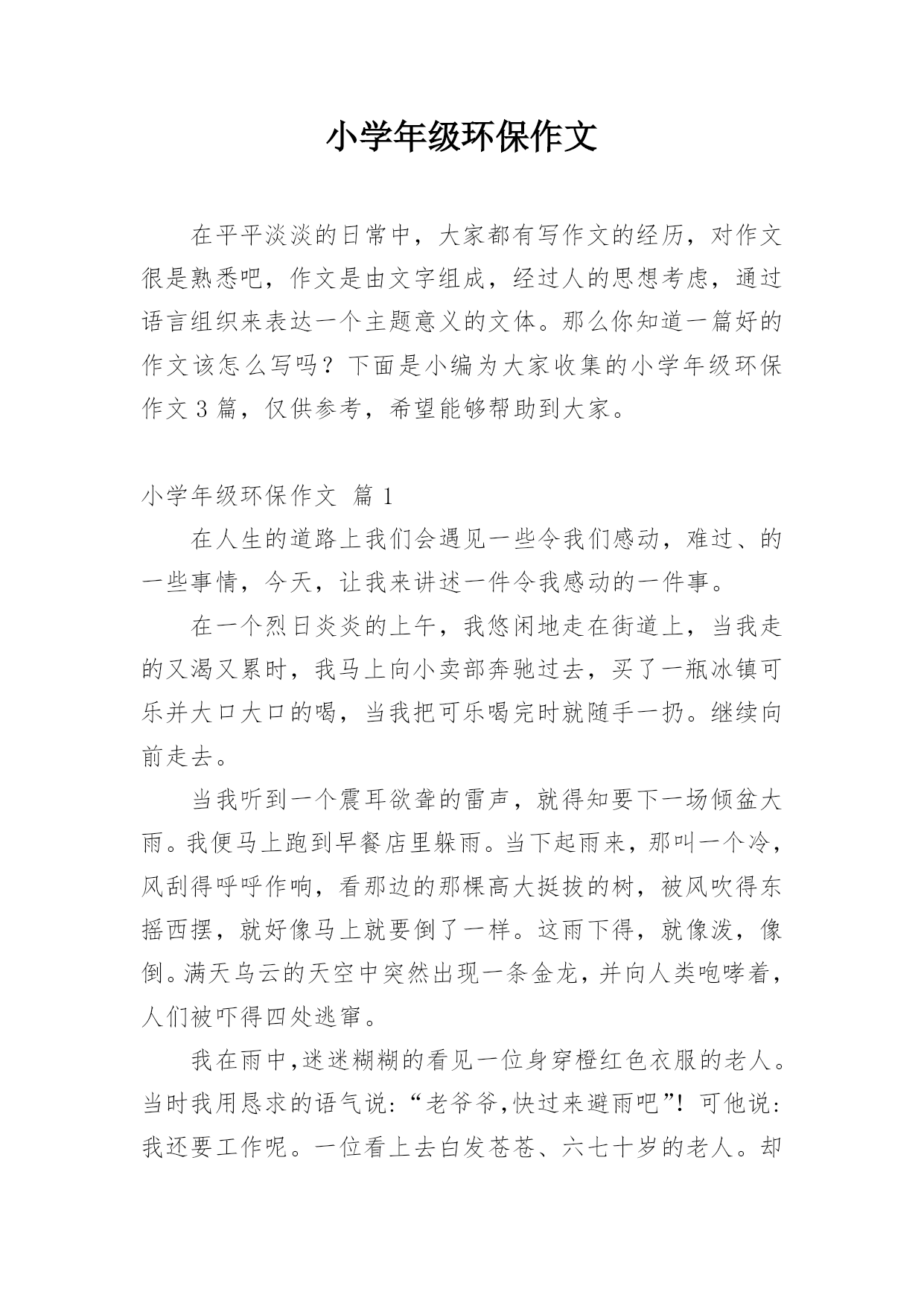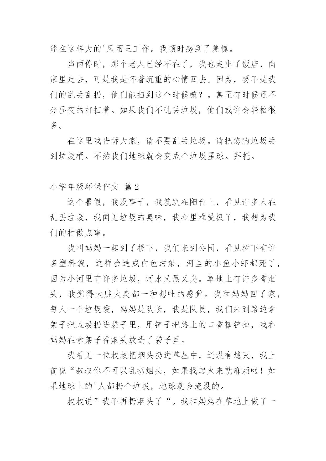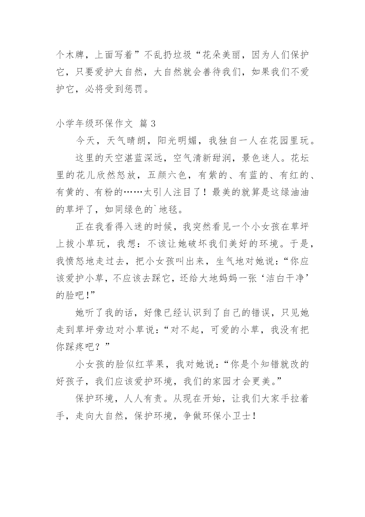 小学年级环保作文在平平淡淡的日常中,大家都有写作文的经历,对作文很是熟悉吧,作文是由文字组成,经过人的思想考虑,通过语言组织来表达一个主题意义的文体。那么你知道一篇好的作文该怎么写吗?下面是小编为大家收集的小学年级环保作文3篇,仅供参考,希望能够帮助到大家。小学年级环保作文篇1在人生的道路上我们会遇见一些令我们感动,难过、的一些事情,今天,让我来讲述一件令我感动的一件事。在一个烈日炎炎的上午,我悠闲地走在街道上,当我走的又渴又累时,我马上向小卖部奔驰过去,买了一瓶冰镇可乐并大口大口的喝,当我把可乐喝完时就随手一扔。继续向前走去。当我听到一个震耳欲聋的雷声,就得知要下一场倾盆大雨。我便马上跑到早餐店里躲雨。当下起雨来,那叫一个冷,风刮得呼呼作响,看那边的那棵高大挺拔的树,被风吹得东摇西摆,就好像马上就要倒了一样。这雨下得,就像泼,像倒。满天乌云的天空中突然出现一条金龙,并向人类咆哮着,人们被吓得四处逃窜。我在雨中,迷迷糊糊的看见一位身穿橙红色衣服的老人。当时我用恳求的语气说:“老爷爷,快过来避雨吧”!可他说:我还要工作呢。一位看上去白发苍苍、六七十岁的老人。却能在这样大的'风雨里工作。我顿时感到了羞愧。当雨停时,那个老人已经不在了,我也走出了饭店,向家里走去,可是我是怀着沉重的心情回去。因为,要不是我们的乱丢乱扔,他们能扫到这个时候嘛?。甚至有时候还不分昼夜的打扫着。如果我们不乱丢垃圾,他们或许会轻松很多。在这里我告诉大家,请不要乱丢垃圾。请把您的垃圾丢到垃圾桶。不然我们地球就会变成个垃圾星球。拜托。小学年级环保作文篇2这个暑假,我没事干,我就趴在阳台上,看见许多人在乱丢垃圾,我闻见垃圾的臭味,我心里难受极了,我想为我们的村做点事。我叫妈妈一起到了楼下,我们来到公园,看见树下有许多塑料袋,这样会造成白色污染,河里的小鱼小虾都死了,因为小河里有许多垃圾,河水又黑又臭。草地上有许多香烟头,我觉得太脏太臭都一种想吐的感觉。我和妈妈回了家,每人一个垃圾袋,妈妈是队长,我是队员,我们来到路边拿架子把垃圾扔进袋子里,用铲子把路上的口香糖铲掉,我和妈妈在拿架子香烟头放进了袋子里。我看见一位叔叔把烟头扔进草丛中,还没有熄灭,我上前说“叔叔你不可以乱扔烟头,如果找起火来就麻烦啦!如果地球上的'人都扔个垃圾,地球就会淹没的。叔叔说”我不再扔烟头了“。我和妈妈在草地上做了一个木牌,上面写着”不乱扔垃圾“花朵美丽,因为人们保护它,只要爱护大自然,大自然就会善待我们,如果我们不爱护它,必将受到惩罚。小学年级环保作文篇3今天,天气晴朗,阳光明媚,我独自一人在花园里玩。这里的天空湛蓝深远,空气清新甜润,景色迷人。花坛里的花儿欣然怒放,五颜六色,有紫的、有蓝的、有红的、有黄的、有粉的……太引人注目了!最美的就算是这绿油油的草坪了,如同绿色的`地毯。正在我看得入迷的时候,我突然看见一个小女孩在草坪上拔小草玩,我想:不该让她破坏我们美好的环境。于是,我愤怒地走过去,把小女孩叫出来,生气地对她说:“你应该爱护小草,不应该去踩它,还给大地妈妈一张‘洁白干净’的脸吧!”她听了我的话,好像已经认识到了自己的错误,只见她走到草坪旁边对小草说:“对不起,可爱的小草,我没有把你踩疼吧?”小女孩的脸似红苹果,我对她说:“你是个知错就改的好孩子,我们应该爱护环境,我们的家园才会更美。”保护环境,人人有责。从现在开始,让我们大家手拉着手,走向大自然,保护环境,争做环保小卫士!