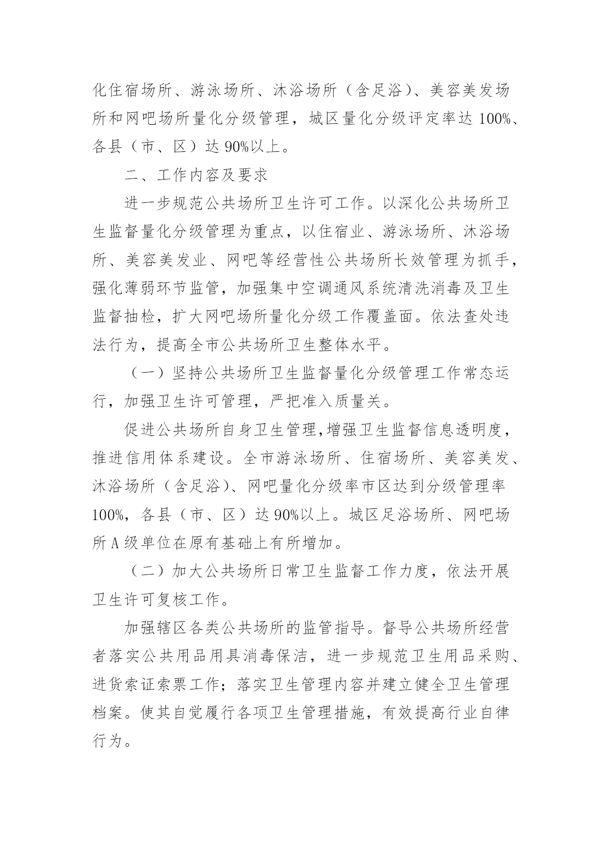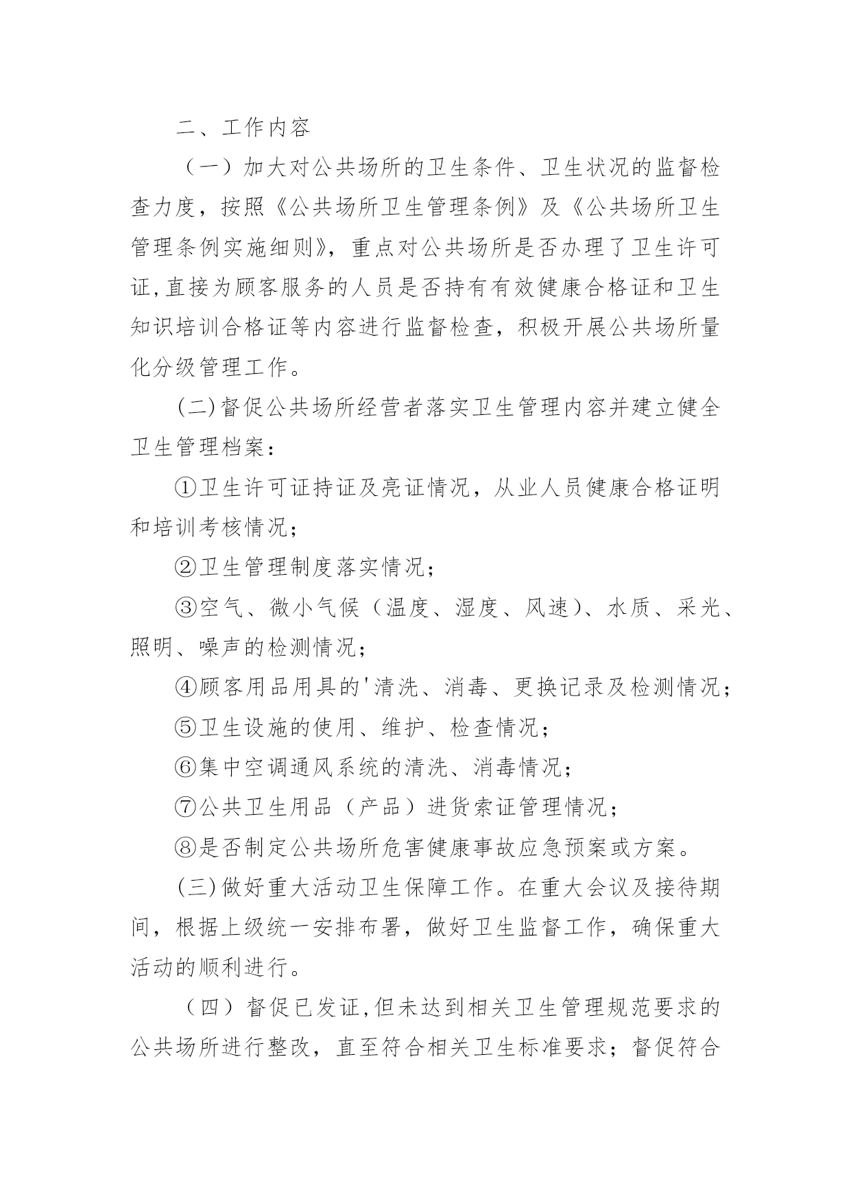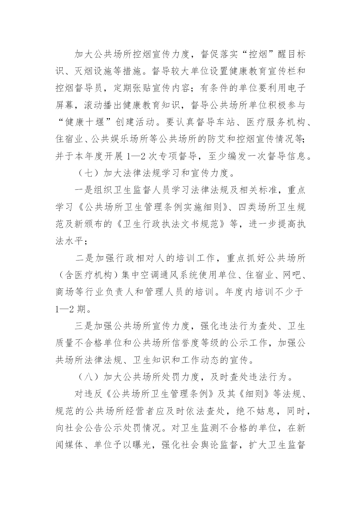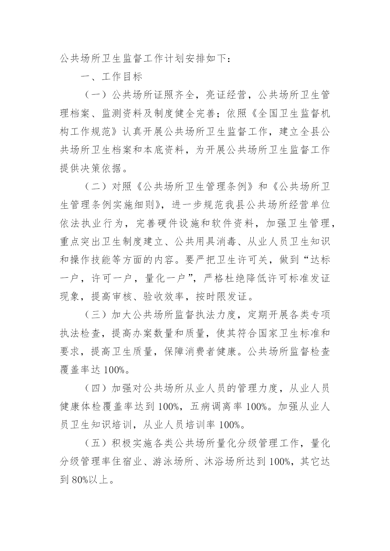 公共场所卫生监督工作计划公共场所卫生监督工作计划时间的脚步是无声的,它在不经意间流逝,我们的工作又将迎来新的进步,一起对今后的学习做个计划吧。拟起计划来就毫无头绪?下面是小编为大家整理的公共场所卫生监督工作计划,供大家参考借鉴,希望可以帮助到有需要的朋友。公共场所卫生监督工作计划1为进一步提高公共场所卫生监督管理水平与效能,预防各类传染病在公共场所传播,消除公共场所卫生隐患,依据《传染病防治法》、《公共场所卫生管理条例》、《艾滋病防治条例》、《公共场所集中空调通风系统卫生管理办法》、《住宿业卫生规范》、《游泳场所卫生规范》等法律、法规及市“五城联创”指挥部”有关工作要求,结合我市实际,制定本计划。一、工作目标通过加强对公共场所卫生监督管理工作,全面掌握各类公共场所和卫生状况,提高公共场所卫生管理水平与效能,及时消除公共场所卫生隐患,确保公共场所卫生安全,巩固”创卫”、“创文”成果。卫生监督覆盖率达100%、卫生许可证持证率达95%以上;从业人员健康证持证率达95%以上;强化住宿场所、游泳场所、沐浴场所(含足浴)、美容美发场所和网吧场所量化分级管理,城区量化分级评定率达100%、各县(市、区)达90%以上。二、工作内容及要求进一步规范公共场所卫生许可工作。以深化公共场所卫生监督量化分级管理为重点,以住宿业、游泳场所、沐浴场所、美容美发业、网吧等经营性公共场所长效管理为抓手,强化薄弱环节监管,加强集中空调通风系统清洗消毒及卫生监督抽检,扩大网吧场所量化分级工作覆盖面。依法查处违法行为,提高全市公共场所卫生整体水平。(一)坚持公共场所卫生监督量化分级管理工作常态运行,加强卫生许可管理,严把准入质量关。促进公共场所自身卫生管理,增强卫生监督信息透明度,推进信用体系建设。全市游泳场所、住宿场所、美容美发、沐浴场所(含足浴)、网吧量化分级率市区达到分级管理率100%,各县(市、区)达90%以上。城区足浴场所、网吧场所A级单位在原有基础上有所增加。(二)加大公共场所日常卫生监督工作力度,依法开展卫生许可复核工作。加强辖区各类公共场所的监管指导。督导公共场所经营者落实公共用品用具消毒保洁,进一步规范卫生用品采购、进货索证索票工作;落实卫生管理内容并建立健全卫生管理档案。使其自觉履行各项卫生管理措施,有效提高行业自律行为。(三)加强“五小行业”卫生监管和查处力度,巩固“创卫”“创文”成果。市城区要督促“五小行业”健全卫生制度,改善基本卫生条件,重点落实消毒、保洁和控烟措施,促进公共场所经营单位提档升级。(四)加强集中空调通风系统监管,规范开展集中空调通风系统清洗、卫生评价等工作。加强公共场所集中空调通风系统的监督检查,督促使用集中空调的公共场所经营单位制定和完善中央空调卫生管理制度及预防空调通风系统传播传染病的应急预案,定期进行清洗和消毒;开展监督抽检,对监督检查中发现的'不符合公共场所卫生标准规定或存在卫生安全隐患的,依法严肃处理,提出整改意见和要求,并予以曝光;对于存在重大隐患的,应及时向当地政府报告。着力推进星级宾馆、大型商场、洗浴场所、医疗机构等场所集中空调通风系统的监督监测,并将抽检结果向社会公布。各县(市区)督导集中空调通风系统规范清洗和卫生评价全年不少于3家。(五)组织开展专项行动,认真完成上级部署的专项整治工作,加强公共场所日常卫生监测工作。充分利用现场快速监测设施设备,组织开展公共场所日常监督监测工作,重点开展住宿业、游泳场所、足浴、美容美发业、网吧等公共场所专项执法行动与监督监测。同时,认真完成省、市安排的年度卫生监督重点抽检工作任务。(六)加强公共场所控烟与健康教育督导工作。加大公共场所控烟宣传力度,督促落实“控烟”醒目标识、灭烟设施等措施。督导较大单位设置健康教育宣传栏和控烟督导员,定期张贴宣传内容;有条件的单位要利用电子屏幕,滚动播出健康教育知识,督导公共场所单位积极参与“健康十堰”创建活动。要认真督导车站、医疗服务机构、住宿业、公共娱乐场所等公共场所的防艾和控烟宣传情况等;并于本年度开展1—2次专项督导,至少编发一次督导信息。(七)加大法律法规学习和宣传力度。一是组织卫生监督人员学习法律法规及相关标准,重点学习《公共场所卫生管理条例实施细则》、四类场所卫生规范及新颁布的《卫生行政执法文书规范》等,进一步提高执法水平;二是加强行政相对人的培训工作,重点抓好公共场所(含医疗机构)集中空调通风系统使用单位、住宿业、网吧、商场等行业负责人和管理人员的培训。年度内培训不少于1—2期。三是加强公共场所宣传力度,强化违法行为查处、卫生质量不合格单位和公共场所信誉度等级的公示工作,加强公共场所法律法规、卫生知识和工作动态的宣传。(八)加大公共场所处罚力度,及时查处违法行为。对违反《公共场所卫生管理条例》及其《细则》等法规、规范的