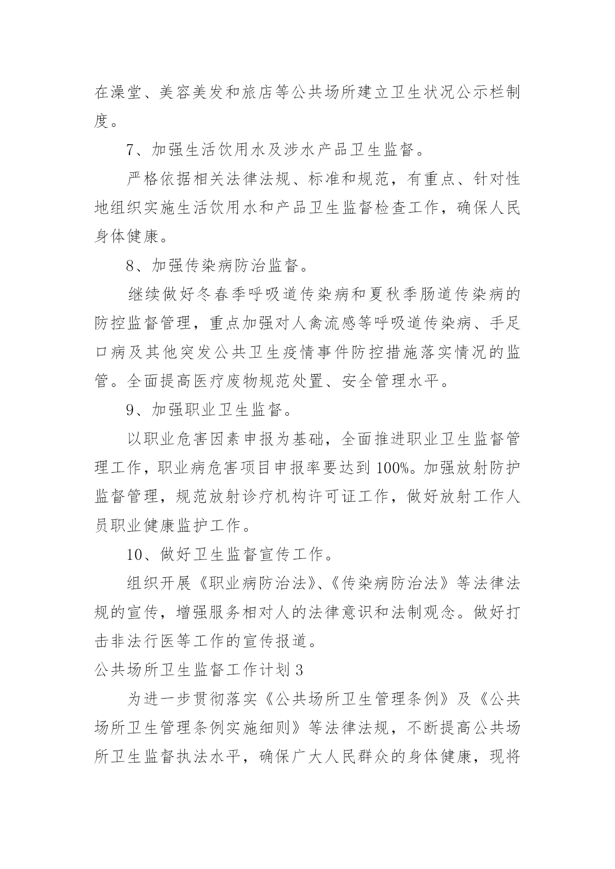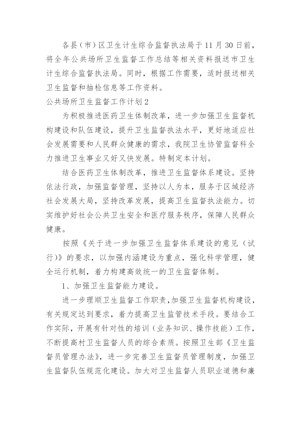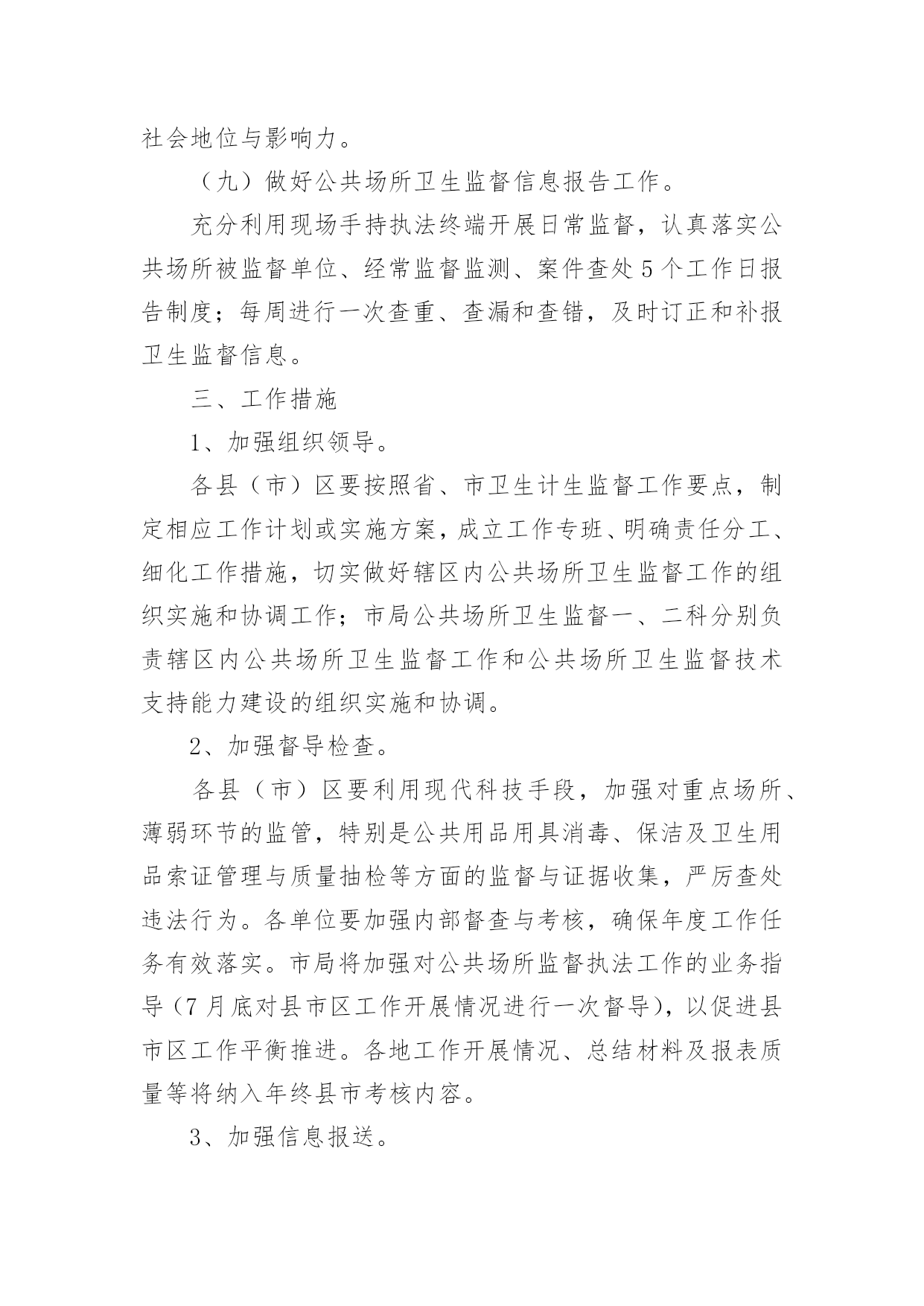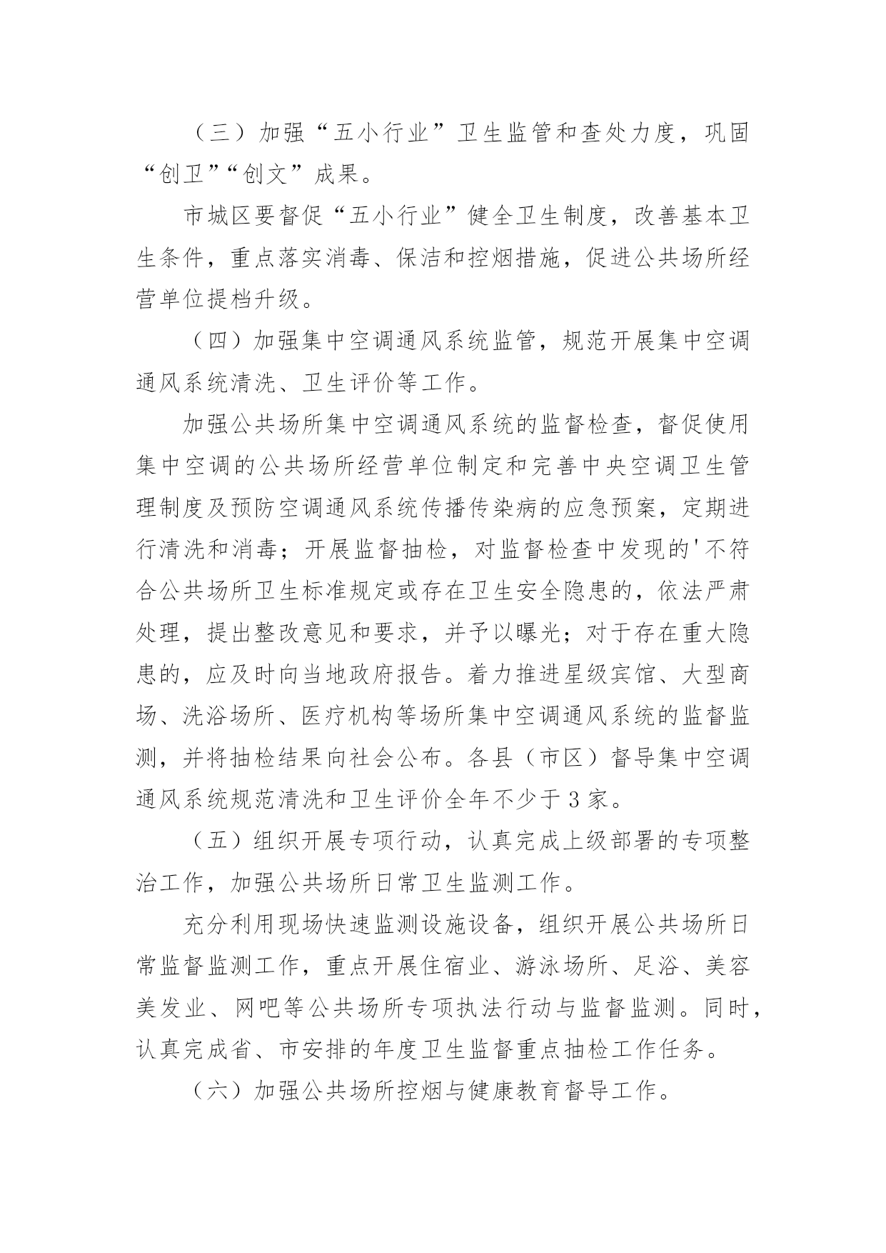 公共场所卫生监督工作计划公共场所卫生监督工作计划时间的脚步是无声的,它在不经意间流逝,我们的工作又将迎来新的进步,一起对今后的学习做个计划吧。拟起计划来就毫无头绪?下面是小编为大家整理的公共场所卫生监督工作计划,供大家参考借鉴,希望可以帮助到有需要的朋友。公共场所卫生监督工作计划1为进一步提高公共场所卫生监督管理水平与效能,预防各类传染病在公共场所传播,消除公共场所卫生隐患,依据《传染病防治法》、《公共场所卫生管理条例》、《艾滋病防治条例》、《公共场所集中空调通风系统卫生管理办法》、《住宿业卫生规范》、《游泳场所卫生规范》等法律、法规及市“五城联创”指挥部”有关工作要求,结合我市实际,制定本计划。一、工作目标通过加强对公共场所卫生监督管理工作,全面掌握各类公共场所和卫生状况,提高公共场所卫生管理水平与效能,及时消除公共场所卫生隐患,确保公共场所卫生安全,巩固”创卫”、“创文”成果。卫生监督覆盖率达100%、卫生许可证持证率达95%以上;从业人员健康证持证率达95%以上;强化住宿场所、游泳场所、沐浴场所(含足浴)、美容美发场所和网吧场所量化分级管理,城区量化分级评定率达100%、各县(市、区)达90%以上。二、工作内容及要求进一步规范公共场所卫生许可工作。以深化公共场所卫生监督量化分级管理为重点,以住宿业、游泳场所、沐浴场所、美容美发业、网吧等经营性公共场所长效管理为抓手,强化薄弱环节监管,加强集中空调通风系统清洗消毒及卫生监督抽检,扩大网吧场所量化分级工作覆盖面。依法查处违法行为,提高全市公共场所卫生整体水平。(一)坚持公共场所卫生监督量化分级管理工作常态运行,加强卫生许可管理,严把准入质量关。促进公共场所自身卫生管理,增强卫生监督信息透明度,推进信用体系建设。全市游泳场所、住宿场所、美容美发、沐浴场所(含足浴)、网吧量化分级率市区达到分级管理率100%,各县(市、区)达90%以上。城区足浴场所、网吧场所A级单位在原有基础上有所增加。(二)加大公共场所日常卫生监督工作力度,依法开展卫生许可复核工作。加强辖区各类公共场所的监管指导。督导公共场所经营者落实公共用品用具消毒保洁,进一步规范卫生用品采购、进货索证索票工作;落实卫生管理内容并建立健全卫生管理档案。使其自觉履行各项卫生管理措施,有效提高行业自律行为。(三)加强“五小行业”卫生监管和查处力度,巩固“创卫”“创文”成果。市城区要督促“五小行业”健全卫生制度,改善基本卫生条件,重点落实消毒、保洁和控烟措施,促进公共场所经营单位提档升级。(四)加强集中空调通风系统监管,规范开展集中空调通风系统清洗、卫生评价等工作。加强公共场所集中空调通风系统的监督检查,督促使用集中空调的公共场所经营单位制定和完善中央空调卫生管理制度及预防空调通风系统传播传染病的应急预案,定期进行清洗和消毒;开展监督抽检,对监督检查中发现的'不符合公共场所卫生标准规定或存在卫生安全隐患的,依法严肃处理,提出整改意见和要求,并予以曝光;对于存在重大隐患的,应及时向当地政府报告。着力推进星级宾馆、大型商场、洗浴场所、医疗机构等场所集中空调通风系统的监督监测,并将抽检结果向社会公布。各县(市区)督导集中空调通风系统规范清洗和卫生评价全年不少于3家。(五)组织开展专项行动,认真完成上级部署的专项整治工作,加强公共场所日常卫生监测工作。充分利用现场快速监测设施设备,组织开展公共场所日常监督监测工作,重点开展住宿业、游泳场所、足浴、美容美发业、网吧等公共场所专项执法行动与监督监测。同时,认真完成省、市安排的年度卫生监督重点抽检工作任务。(六)加强公共场所控烟与健康教育督导工作。加大公共场所控烟宣传力度,督促落实“控烟”醒目标识、灭烟设施等措施。督导较大单位设置健康教育宣传栏和控烟督导员,定期张贴宣传内容;有条件的单位要利用电子屏幕,滚动播出健康教育知识,督导公共场所单位积极参与“健康十堰”创建活动。要认真督导车站、医疗服务机构、住宿业、公共娱乐场所等公共场所的防艾和控烟宣传情况等;并于本年度开展1—2次专项督导,至少编发一次督导信息。(七)加大法律法规学习和宣传力度。一是组织卫生监督人员学习法律法规及相关标准,重点学习《公共场所卫生管理条例实施细则》、四类场所卫生规范及新颁布的《卫生行政执法文书规范》等,进一步提高执法水平;二是加强行政相对人的培训工作,重点抓好公共场所(含医疗机构)集中空调通风系统使用单位、住宿业、网吧、商场等行业负责人和管理人员的培训。年度内培训不少于1—2期。三是加强公共场所宣传力度,强化违法行为查处、卫生质量不合格单位和公共场所信誉度等级的公示工作,加强公共场所法律法规、卫生知识和工作动态的宣传。(八)加大公共场所处罚力度,及时查处违法行为。对违反《公共场所卫生管理条例》及其《细则》等法规、规范的