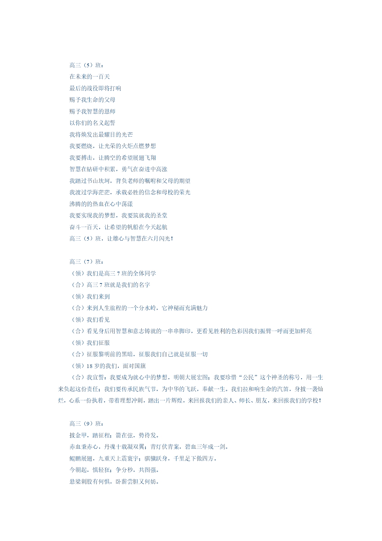 各班高考百日誓词高三(1)班:为了06年的高考更加辉煌,今天,我们在这里庄严宣誓:拼搏100天,让汗水哺育不凡;拼搏100天,让智慧灌溉内涵;拼搏100天,让激情释放灿烂;拼搏100天,让实力螯头独揽!100天,我们将给三年充实的高中生活画上一个圆满的句号。100天,我们将给青春画上一个破折号,她将引领我们走向更辉煌的明天!高三(2)班:(领誓人)当我们面对高考,我们要有“会当凌绝顶,一览众山小”的雄心壮志;当我们面对未来,我们要有“会当水击三千尺,自信人生二百年”的从容气魄。百日攻坚,面对高考我们选择无悔青春!在这里,我们高三(2)班的全体同学,向我们敬爱的老师和家长们保证:(全班同学):加足马力,飚到底!一百天,迎接所有挑战,一百天,用汗水让你记住:我们是高三2班!高三(3)班:仅余百日,我们于庄严的国旗下宣誓:我们要忘记昨天的光荣与遗憾,我们要把今天当作生命中的最重要的一天,我们要在明天的战场上奋力一搏。破釜沉舟,天道酬勤,卧薪尝胆,皇天不负。我们是石,是辉映星空的玉石;我们是蕾,是绽放春天的花蕾;我们是泉,是滋润幽谷的清泉;我们是舟,是有历经江海的方舟。我们要以真理埋葬怀疑,我们要用信心驱赶黑暗,我们要借拼搏实现梦想!高三(4)班:我,是高三4班的学生,决胜高考是我不懈的追求,拼搏一百天是我庄严的承诺!一百天,我将唱出青春无悔;一百天,我将笑吟十二年等待。百炼成钢,百日流芳,打造人生新篇章。我,绝不作懦弱无能的退缩;绝不作毫无意义的彷徨。我要带着从容的微笑,去赢得我志在必得的辉煌。让微笑写满父母殷切的面庞,让微笑挂在老师欣慰的脸上。奋战一百天,让飞翔的梦在六月张开翅膀;奋战一百天,让雄心和智慧在六月闪光!长风破浪,直济沧海,蟾宫折挂,舍我其谁!高三(5)班:在未来的一百天最后的战役即将打响赐予我生命的父母赐予我智慧的恩师以你们的名义起誓我将焕发出最耀目的光芒我要燃烧,让光荣的火炬点燃梦想我要搏击,让腾空的希望展翅飞翔智慧在钻研中积累,勇气在奋进中高涨我踏过书山坎坷,背负老师的嘱咐和父母的期望我渡过学海茫茫,承载必胜的信念和母校的荣光沸腾的的热血在心中荡漾我要实现我的梦想,我要筑就我的圣堂奋斗一百天,让希望的帆船在今天起航高三(5)班,让雄心与智慧在六月闪光!高三(7)班:(领)我们是高三7班的全体同学(合)高三7班就是我们的名字(领)我们来到(合)来到人生旅程的一个分水岭,它神秘而充满魅力(领)我们看见(合)看见身后用智慧和意志铸就的一串串脚印,更看见胜利的色彩因我们振臂一呼而更加鲜亮(领)我们征服(合)征服黎明前的黑暗,征服我们自己就是征服一切(领)18岁的我们,面对国旗(合)我宣誓:我要成为就心中的梦想,明朝大展宏图;我要珍惜“公民”这个神圣的称号,用一生来负起这份责任;我们要传承民族气节,为中华的飞跃,奉献一生。我们拉和响生命的汽笛,身披一袭灿烂,心系一份执着,带着理想冲刺,踏出一片辉煌,来回报我们的亲人、师长、朋友,来回报我们的学校!高三(9)班:披金甲,踏征程;箭在弦,势待发。赤血秉赤心,丹魂十载凝双翼;青灯伏青案,碧血三年成一剑。鲲鹏展翅,九重天上震寰宇;骐骥跃身,千里足下傲四方。今朝起,慎轻狂;争分秒,共图强。悬梁刺股有何惧,卧薪尝胆又何妨。誓言已盟,一言擎九鼎;豪言既出,一句值千金。今我仰头向天誓,我不夺魁更有谁!高三(11)班:看,18岁,我已站立在成人的舞台;听,一场攻坚的战斗即将打响。我们戎装在身,我们摩拳擦掌,我们志在必得!三年求学路,我们也曾天真,我们也曾跌倒,我们也曾迷茫。但是,现实教我们成熟,自信将我们扶起,责任与使命为我们指明了前进的方向,拂去尘埃,抖擞精神,一鼓作气,我们挥汗躬耕一刻千金!为美好前程而努力,为孝敬父母而拼搏,为报效祖国而争分夺秒发奋图强!100天,我们会目标明确,方法合理,持之以恒,百折不挠;100天,我们要用自己的实践验证一个事实,书写一段佳话,创造一个奇迹!100天,我们要让历史记住:高三11班,原来真的很捧!高三(12)班:黄沙百战穿金甲,不破楼兰终不还我们肩负父母的期望,谨记恩师的嘱托,承载毕生的信念和母校的荣光,此刻我们信心百倍,豪情满怀。在高考冲刺阶段的一百天里我们决心:珍惜每一秒,拼搏每一刻,奋斗一百天。我们一定做到严格自律,争分夺秒,全力以赴,我们一定做到认真听课,专注学习,积极应战,请父母放心,请老师放心,请母校放心,我们一定会以最刻苦的精神,最饱满的热情,最昂扬的斗志,创造高考佳绩续写母校辉煌!高三(13)班:我们13班全体同学,向含辛茹苦抚育我们成长的父母起誓,向呕心沥血献身讲台的老师