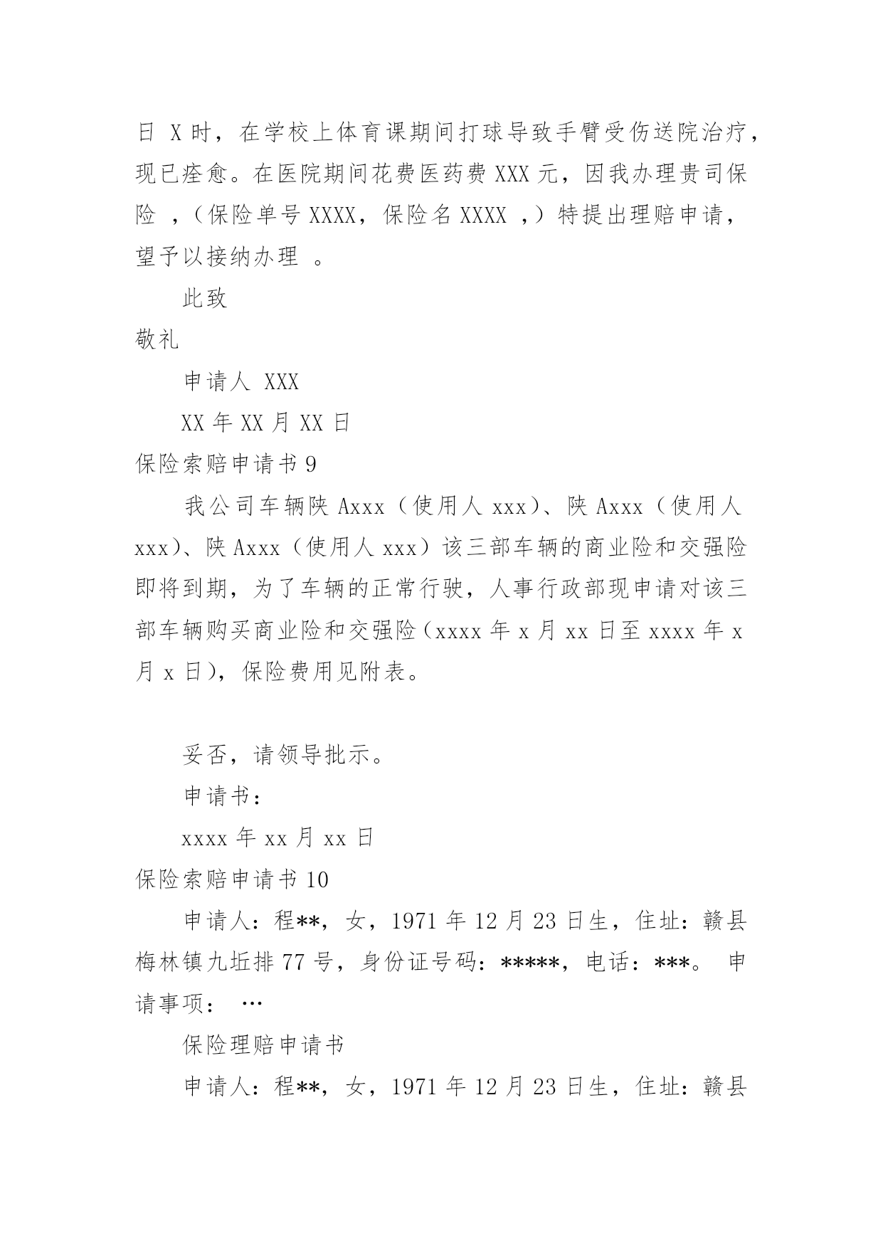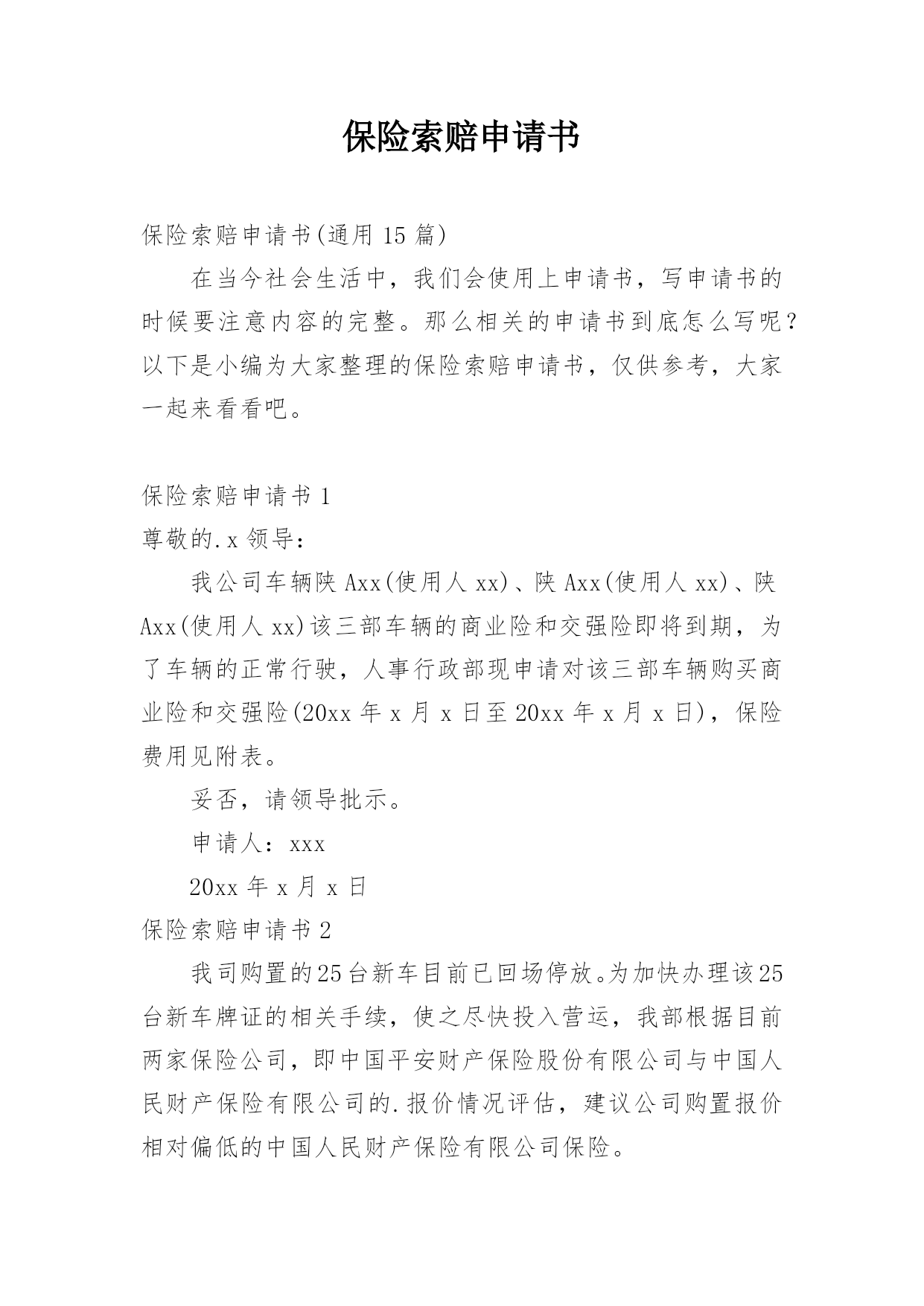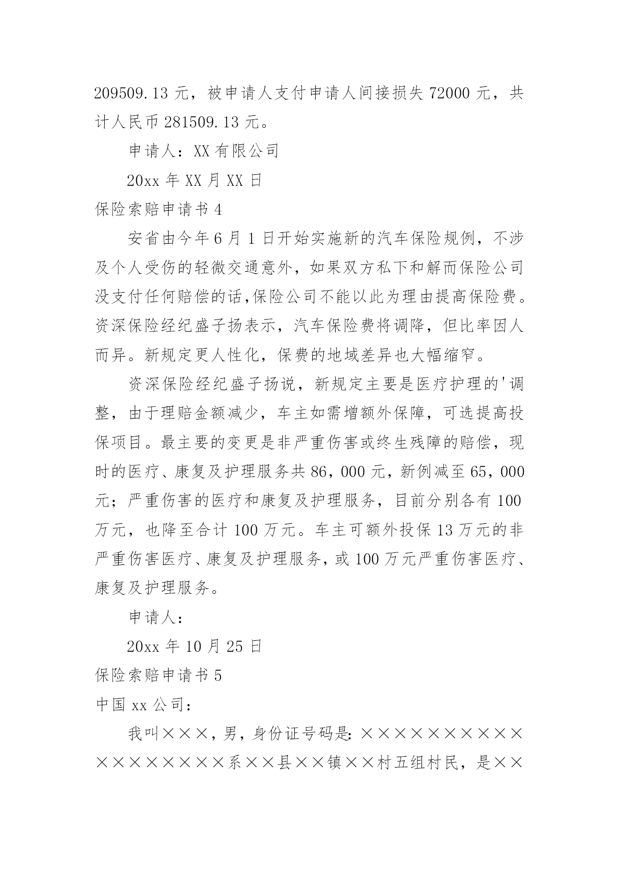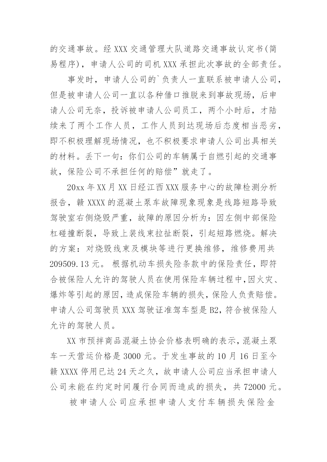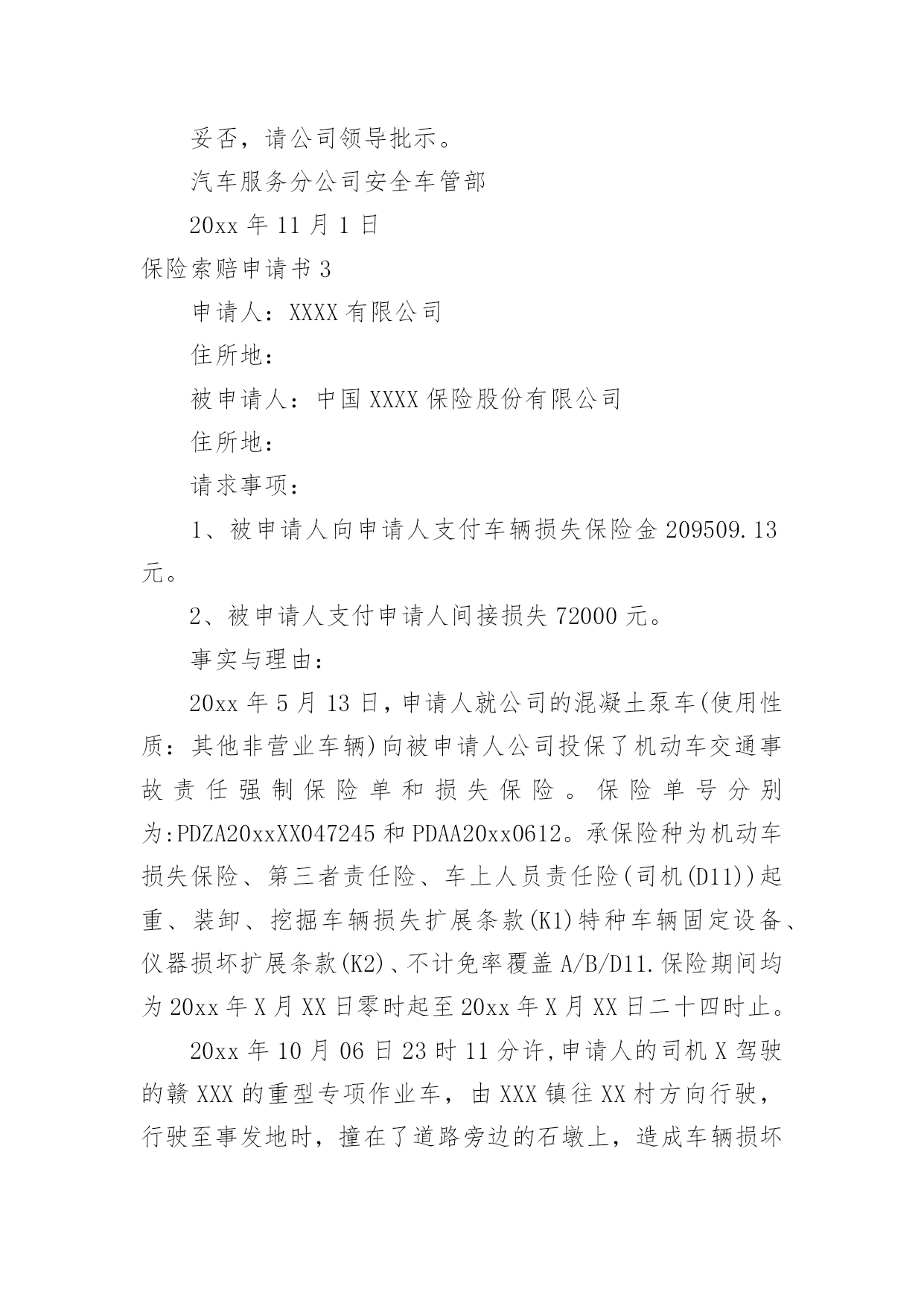 保险索赔申请书保险索赔申请书(通用15篇)在当今社会生活中,我们会使用上申请书,写申请书的时候要注意内容的完整。那么相关的申请书到底怎么写呢?以下是小编为大家整理的保险索赔申请书,仅供参考,大家一起来看看吧。保险索赔申请书1尊敬的.x领导:我公司车辆陕Axx(使用人xx)、陕Axx(使用人xx)、陕Axx(使用人xx)该三部车辆的商业险和交强险即将到期,为了车辆的正常行驶,人事行政部现申请对该三部车辆购买商业险和交强险(20xx年x月x日至20xx年x月x日),保险费用见附表。妥否,请领导批示。申请人:xxx20xx年x月x日保险索赔申请书2我司购置的25台新车目前已回场停放。为加快办理该25台新车牌证的相关手续,使之尽快投入营运,我部根据目前两家保险公司,即中国平安财产保险股份有限公司与中国人民财产保险有限公司的.报价情况评估,建议公司购置报价相对偏低的中国人民财产保险有限公司保险。妥否,请公司领导批示。汽车服务分公司安全车管部20xx年11月1日保险索赔申请书3申请人:XXXX有限公司住所地:被申请人:中国XXXX保险股份有限公司住所地:请求事项:1、被申请人向申请人支付车辆损失保险金209509.13元。2、被申请人支付申请人间接损失72000元。事实与理由:20xx年5月13日,申请人就公司的混凝土泵车(使用性质:其他非营业车辆)向被申请人公司投保了机动车交通事故责任强制保险单和损失保险。保险单号分别为:PDZA20xxXX047245和PDAA20xx0612。承保险种为机动车损失保险、第三者责任险、车上人员责任险(司机(D11))起重、装卸、挖掘车辆损失扩展条款(K1)特种车辆固定设备、仪器损坏扩展条款(K2)、不计免率覆盖A/B/D11.保险期间均为20xx年X月XX日零时起至20xx年X月XX日二十四时止。20xx年10月06日23时11分许,申请人的司机X驾驶的赣XXX的重型专项作业车,由XXX镇往XX村方向行驶,行驶至事发地时,撞在了道路旁边的石墩上,造成车辆损坏的交通事故。经XXX交通管理大队道路交通事故认定书(简易程序),申请人公司的司机XXX承担此次事故的全部责任。事发时,申请人公司的`负责人一直联系被申请人公司,但是被申请人公司一直以各种借口推脱来到事故现场,后申请人公司无奈,投诉被申请人公司员工,两个小时后,才陆续来了两个工作人员,工作人员到达现场后态度相当恶劣,即不积极理解现场情况,也不积极要求申请人公司出具相关的材料。丢下一句:你们公司的车辆属于自燃引起的交通事故,保险公司不承担任何的赔偿”就走了。20xx年XX月XX日经江西XXX服务中心的故障检测分析报告,赣XXXX的混凝土泵车故障现象现象是线路短路导致驾驶室右侧烧毁严重,故障的原因分析为:因左侧中部保险杠碰撞断裂,导致上装线束拉扯断裂,引起短路燃烧。解决的方案:对烧毁线束及模块等进行更换维修,维修费用共209509.13元。根据机动车损失险条款中的保险责任,即符合被保险人允许的驾驶人员在使用保险车辆过程中,因火灾、爆炸等引起的原因,造成保险车辆的损失,保险人负责赔偿。申请人公司驾驶员XXX驾驶证准驾车型是B2,符合被保险人允许的驾驶人员。XX市预拌商品混凝土协会价格表明确的表示,混凝土泵车一天营运价格是3000元。于发生事故的10月16日至今赣XXXX停用已达24天之久,故申请人公司应当承担申请人公司未能在约定时间履行合同而造成的损失,共72000元。被申请人公司应承担申请人支付车辆损失保险金209509.13元,被申请人支付申请人间接损失72000元,共计人民币281509.13元。申请人:XX有限公司20xx年XX月XX日保险索赔申请书4安省由今年6月1日开始实施新的汽车保险规例,不涉及个人受伤的轻微交通意外,如果双方私下和解而保险公司没支付任何赔偿的话,保险公司不能以此为理由提高保险费。资深保险经纪盛子扬表示,汽车保险费将调降,但比率因人而异。新规定更人性化,保费的地域差异也大幅缩窄。资深保险经纪盛子扬说,新规定主要是医疗护理的'调整,由于理赔金额减少,车主如需增额外保障,可选提高投保项目。最主要的变更是非严重伤害或终生残障的赔偿,现时的医疗、康复及护理服务共86,000元,新例减至65,000元;严重伤害的医疗和康复及护理服务,目前分别各有100万元,也降至合计100万元。车主可额外投保13万元的非严重伤害医疗、康复及护理服务,或100万元严重伤害医疗、康复及护理服务。申请人:20xx年10月25日保险索赔申请书5中国xx公司:我叫×××,男,身份证号码是:××××××××××××××××××系××县××镇××村五组村民,是××中学九年级学生×××(男,身份证号码是:××××××××××××××××××,××××年××月参加贵