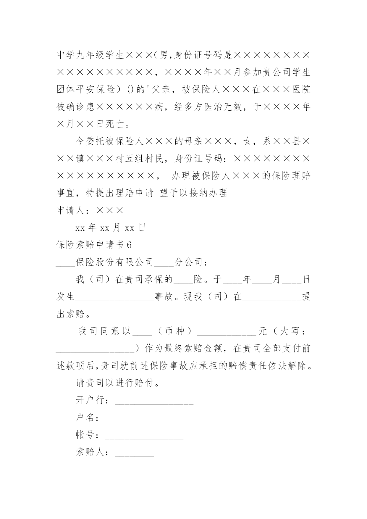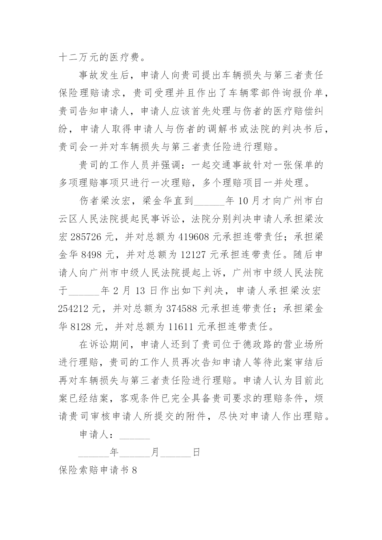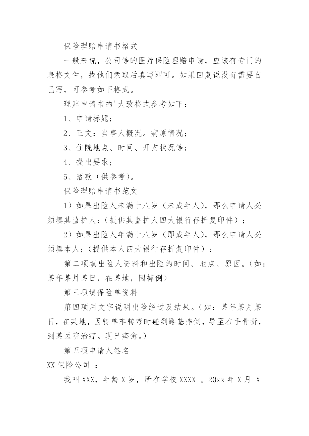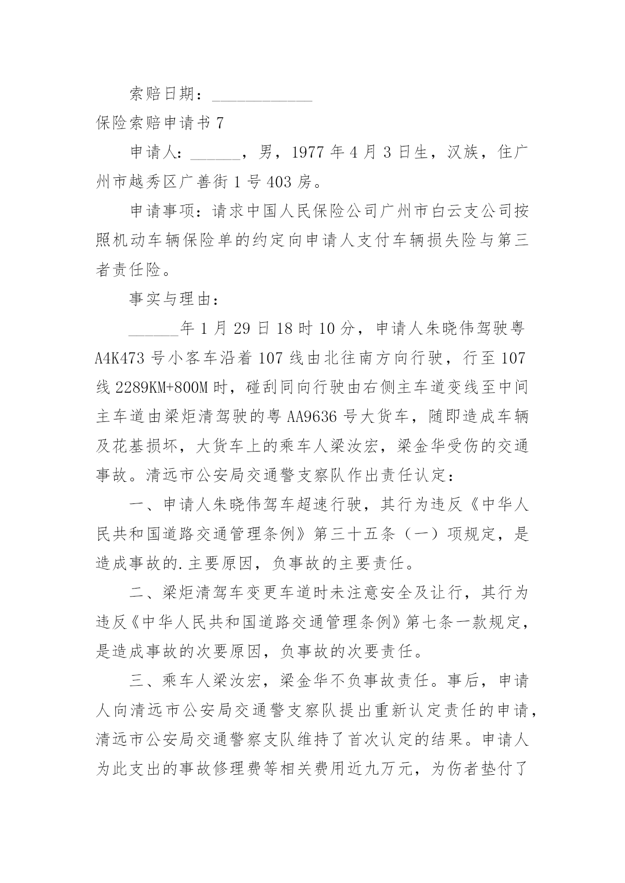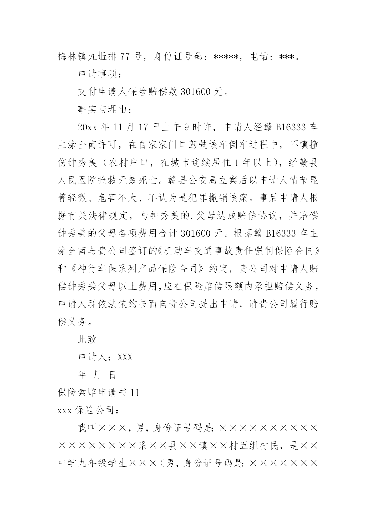 保险索赔申请书保险索赔申请书(通用15篇)在当今社会生活中,我们会使用上申请书,写申请书的时候要注意内容的完整。那么相关的申请书到底怎么写呢?以下是小编为大家整理的保险索赔申请书,仅供参考,大家一起来看看吧。保险索赔申请书1尊敬的.x领导:我公司车辆陕Axx(使用人xx)、陕Axx(使用人xx)、陕Axx(使用人xx)该三部车辆的商业险和交强险即将到期,为了车辆的正常行驶,人事行政部现申请对该三部车辆购买商业险和交强险(20xx年x月x日至20xx年x月x日),保险费用见附表。妥否,请领导批示。申请人:xxx20xx年x月x日保险索赔申请书2我司购置的25台新车目前已回场停放。为加快办理该25台新车牌证的相关手续,使之尽快投入营运,我部根据目前两家保险公司,即中国平安财产保险股份有限公司与中国人民财产保险有限公司的.报价情况评估,建议公司购置报价相对偏低的中国人民财产保险有限公司保险。妥否,请公司领导批示。汽车服务分公司安全车管部20xx年11月1日保险索赔申请书3申请人:XXXX有限公司住所地:被申请人:中国XXXX保险股份有限公司住所地:请求事项:1、被申请人向申请人支付车辆损失保险金209509.13元。2、被申请人支付申请人间接损失72000元。事实与理由:20xx年5月13日,申请人就公司的混凝土泵车(使用性质:其他非营业车辆)向被申请人公司投保了机动车交通事故责任强制保险单和损失保险。保险单号分别为:PDZA20xxXX047245和PDAA20xx0612。承保险种为机动车损失保险、第三者责任险、车上人员责任险(司机(D11))起重、装卸、挖掘车辆损失扩展条款(K1)特种车辆固定设备、仪器损坏扩展条款(K2)、不计免率覆盖A/B/D11.保险期间均为20xx年X月XX日零时起至20xx年X月XX日二十四时止。20xx年10月06日23时11分许,申请人的司机X驾驶的赣XXX的重型专项作业车,由XXX镇往XX村方向行驶,行驶至事发地时,撞在了道路旁边的石墩上,造成车辆损坏的交通事故。经XXX交通管理大队道路交通事故认定书(简易程序),申请人公司的司机XXX承担此次事故的全部责任。事发时,申请人公司的`负责人一直联系被申请人公司,但是被申请人公司一直以各种借口推脱来到事故现场,后申请人公司无奈,投诉被申请人公司员工,两个小时后,才陆续来了两个工作人员,工作人员到达现场后态度相当恶劣,即不积极理解现场情况,也不积极要求申请人公司出具相关的材料。丢下一句:你们公司的车辆属于自燃引起的交通事故,保险公司不承担任何的赔偿”就走了。20xx年XX月XX日经江西XXX服务中心的故障检测分析报告,赣XXXX的混凝土泵车故障现象现象是线路短路导致驾驶室右侧烧毁严重,故障的原因分析为:因左侧中部保险杠碰撞断裂,导致上装线束拉扯断裂,引起短路燃烧。解决的方案:对烧毁线束及模块等进行更换维修,维修费用共209509.13元。根据机动车损失险条款中的保险责任,即符合被保险人允许的驾驶人员在使用保险车辆过程中,因火灾、爆炸等引起的原因,造成保险车辆的损失,保险人负责赔偿。申请人公司驾驶员XXX驾驶证准驾车型是B2,符合被保险人允许的驾驶人员。XX市预拌商品混凝土协会价格表明确的表示,混凝土泵车一天营运价格是3000元。于发生事故的10月16日至今赣XXXX停用已达24天之久,故申请人公司应当承担申请人公司未能在约定时间履行合同而造成的损失,共72000元。被申请人公司应承担申请人支付车辆损失保险金209509.13元,被申请人支付申请人间接损失72000元,共计人民币281509.13元。申请人:XX有限公司20xx年XX月XX日保险索赔申请书4安省由今年6月1日开始实施新的汽车保险规例,不涉及个人受伤的轻微交通意外,如果双方私下和解而保险公司没支付任何赔偿的话,保险公司不能以此为理由提高保险费。资深保险经纪盛子扬表示,汽车保险费将调降,但比率因人而异。新规定更人性化,保费的地域差异也大幅缩窄。资深保险经纪盛子扬说,新规定主要是医疗护理的'调整,由于理赔金额减少,车主如需增额外保障,可选提高投保项目。最主要的变更是非严重伤害或终生残障的赔偿,现时的医疗、康复及护理服务共86,000元,新例减至65,000元;严重伤害的医疗和康复及护理服务,目前分别各有100万元,也降至合计100万元。车主可额外投保13万元的非严重伤害医疗、康复及护理服务,或100万元严重伤害医疗、康复及护理服务。申请人:20xx年10月25日保险索赔申请书5中国xx公司:我叫×××,男,身份证号码是:××××××××××××××××××系××县××镇××村五组村民,是××中学九年级学生×××(男,身份证号码是:××××××××××××××××××,××××年××月参加贵