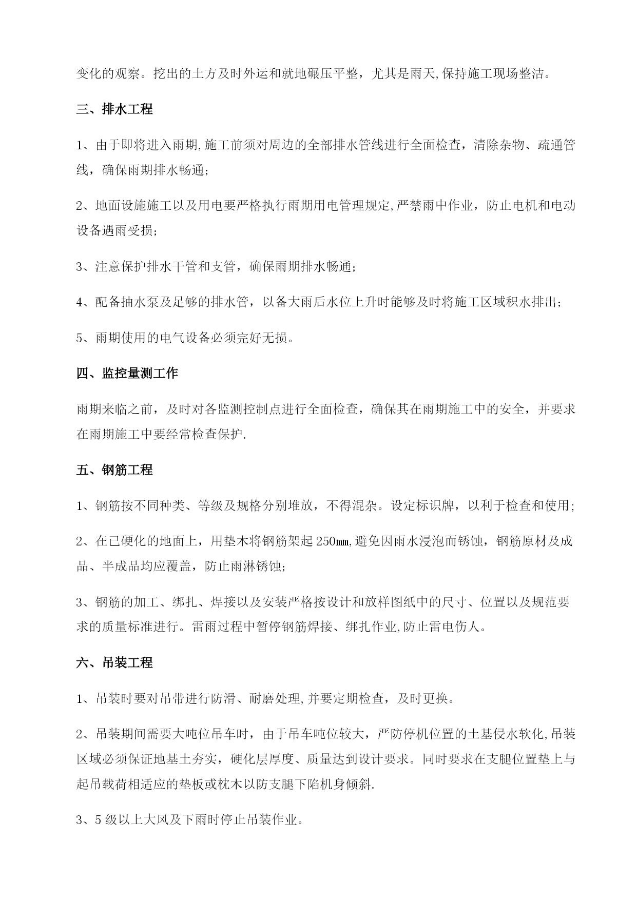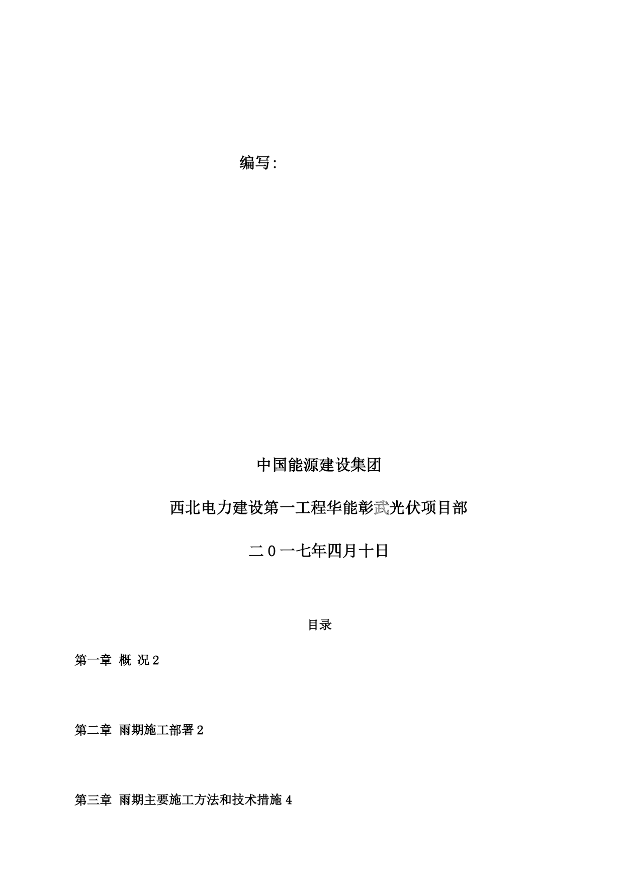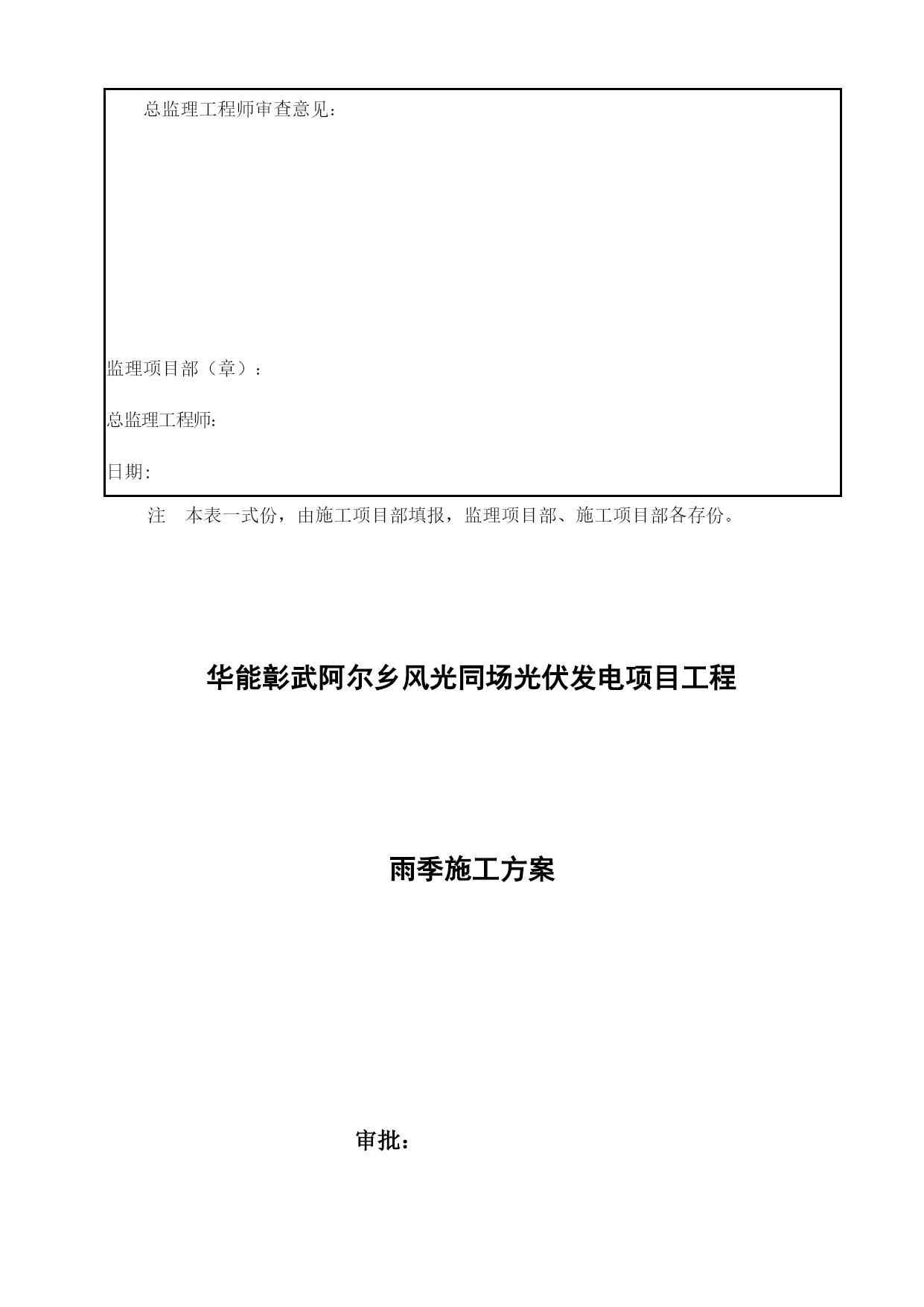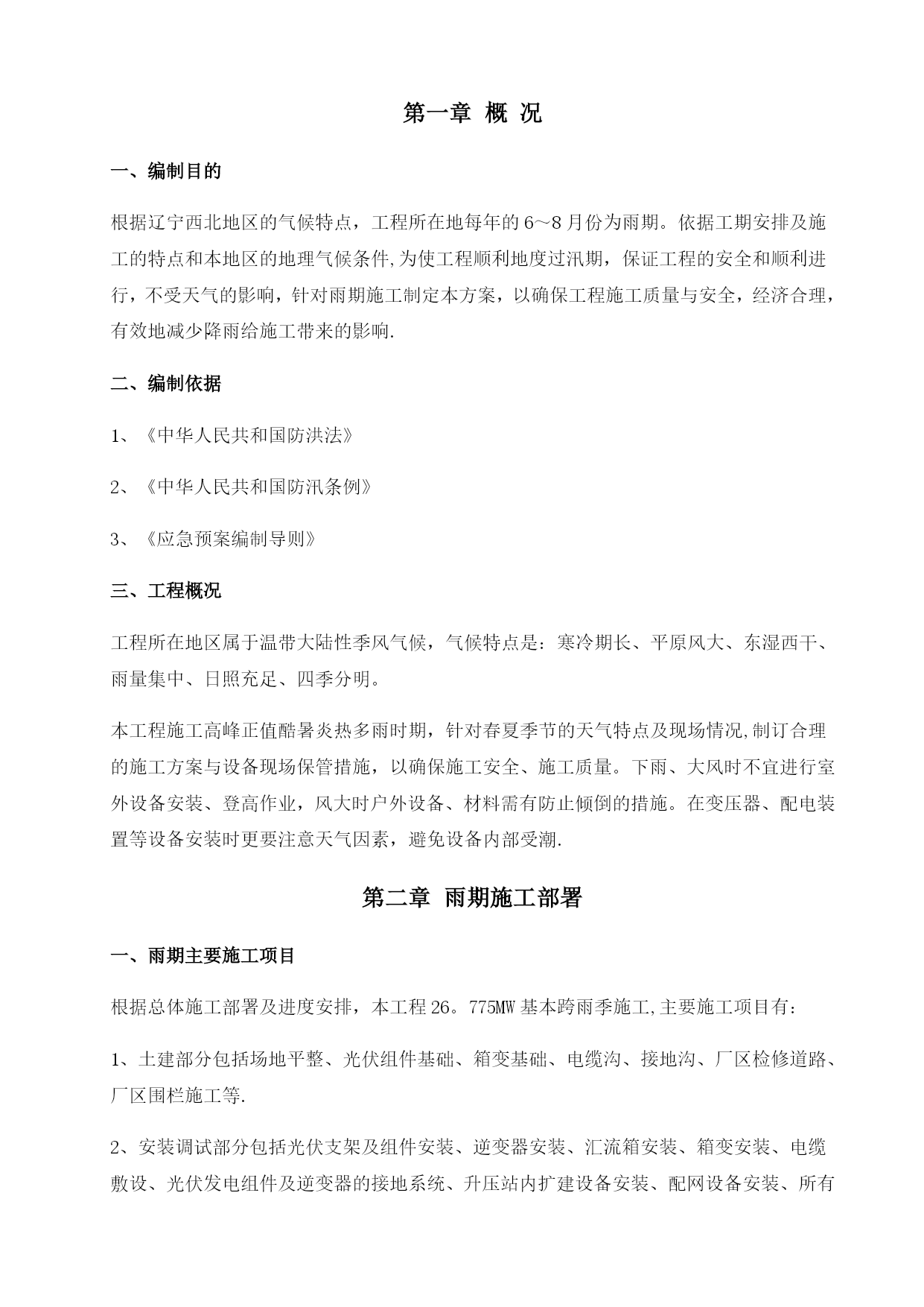 雨季施工方案32079实用文档(实用文档,可以直接使用,可编辑优秀版资料,欢迎下载)雨季施工方案报审表工程名称:华能彰武阿尔乡风光同场光伏发电项目编号:SJSB2-XB01-007致湖南中天监理工程华能彰武阿尔乡风光同场光伏发电项目监理项目部:现报上华能彰武阿尔乡风光同场光伏发电项目雨季工程施工方案(措施),请审查.附件:华能彰武阿尔乡风光同场光伏发电项目雨季施工方案施工项目部(章):项目经理:日期:专业监理工程师审查意见:专业监理工程师:日期:总监理工程师审查意见:监理项目部(章):总监理工程师:日期:注本表一式份,由施工项目部填报,监理项目部、施工项目部各存份。华能彰武阿尔乡风光同场光伏发电项目工程雨季施工方案审批:编写:中国能源建设集团西北电力建设第一工程华能彰武光伏项目部二0一七年四月十日目录TOC\o"1-2"\h\uHYPERLINK\l”_Toc22078”第一章概况PAGEREF_Toc220782HYPERLINK\l"_Toc19513"第二章雨期施工部署PAGEREF_Toc195132HYPERLINK\l”_Toc4084”第三章雨期主要施工方法和技术措施PAGEREF_Toc40844HYPERLINK\l”_Toc29739”第四章质量保证措施PAGEREF_Toc297397HYPERLINK\l”_Toc6143"第五章雨期施工安全措施PAGEREF_Toc61437HYPERLINK\l"_Toc24331”第六章文明施工及环保措施PAGEREF_Toc243319HYPERLINK\l"_Toc18047"第七章雨季“三防”应急预案PAGEREF_Toc180479第一章概况一、编制目的根据辽宁西北地区的气候特点,工程所在地每年的6~8月份为雨期。依据工期安排及施工的特点和本地区的地理气候条件,为使工程顺利地度过汛期,保证工程的安全和顺利进行,不受天气的影响,针对雨期施工制定本方案,以确保工程施工质量与安全,经济合理,有效地减少降雨给施工带来的影响.二、编制依据1、《中华人民共和国防洪法》2、《中华人民共和国防汛条例》3、《应急预案编制导则》三、工程概况工程所在地区属于温带大陆性季风气候,气候特点是:寒冷期长、平原风大、东湿西干、雨量集中、日照充足、四季分明。本工程施工高峰正值酷暑炎热多雨时期,针对春夏季节的天气特点及现场情况,制订合理的施工方案与设备现场保管措施,以确保施工安全、施工质量。下雨、大风时不宜进行室外设备安装、登高作业,风大时户外设备、材料需有防止倾倒的措施。在变压器、配电装置等设备安装时更要注意天气因素,避免设备内部受潮.第二章雨期施工部署一、雨期主要施工项目根据总体施工部署及进度安排,本工程26。775MW基本跨雨季施工,主要施工项目有:1、土建部分包括场地平整、光伏组件基础、箱变基础、电缆沟、接地沟、厂区检修道路、厂区围栏施工等.2、安装调试部分包括光伏支架及组件安装、逆变器安装、汇流箱安装、箱变安装、电缆敷设、光伏发电组件及逆变器的接地系统、升压站内扩建设备安装、配网设备安装、所有分系统及整套调试工作、单机试验及交接试验等.二、雨期施工部署1、雨期施工前,要组织有关人员认真分析雨期施工生产,根据雨期施工项目,编制雨期施工措施,所需材料要在雨期施工前准备好。2、做好施工人员的雨期施工培训工作,组织相关人员进行一次施工现场准备工作的全面检查,包括临时设施、临电、机械设备等项工作。3、检查施工现场排水设施,疏通各种排水渠道,清理雨水排水口,保证雨天排水通畅.4、现场道路及两旁都有一定的坡度,保证不滑、不陷、不积水。清理现场障碍物,保持现场道路通畅。道路两旁一定范围内尽量不堆放物品,若堆放其高度不宜超过1。5m,保证视野开阔,道路畅通。5、施工现场、工棚、仓库等工程各分管部门要在雨期前进行全面检查和整修,保证基础、道路不塌陷,房间不漏雨,场区不积水。三、雨期施工领导小组为了便于统一领导,加强领导班子的核心作用,成立项目部雨期施工领导小组:组长:黄志强副组长:王道林、耿少玉组员:赵连涛、吴浩、刘文辉、张永录每日由领导小组收看天气预报,以指导施工活动。进行重大施工活动前,应向气象部门咨询活动期间的预期天气情况,再作出适当的安排.现场管理人员应掌握当天的天气情况,以便及时采取有效的措施进行处理.若现场出现紧急情况,现场施工人员应及时上报领导小组,由领导小组根据现场的实际情况按照应急预案的措施进行抢险。各级人