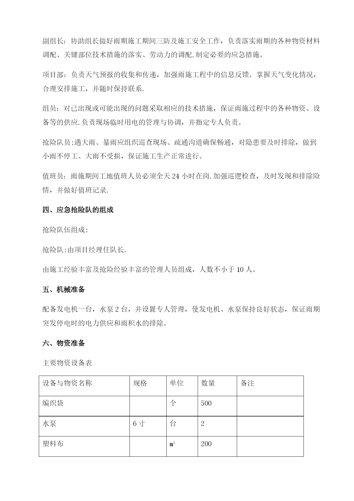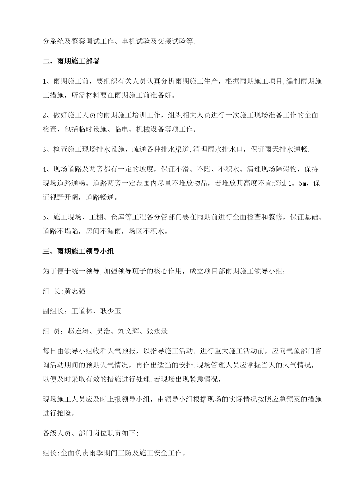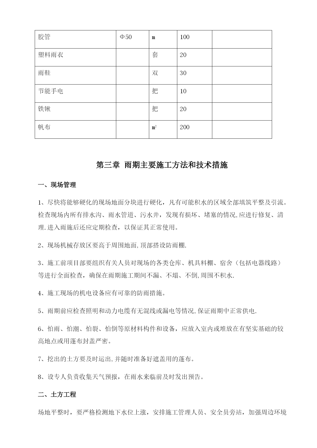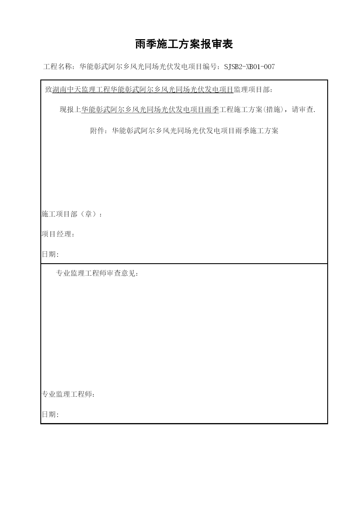 雨季施工方案32079实用文档(实用文档,可以直接使用,可编辑优秀版资料,欢迎下载)雨季施工方案报审表工程名称:华能彰武阿尔乡风光同场光伏发电项目编号:SJSB2-XB01-007致湖南中天监理工程华能彰武阿尔乡风光同场光伏发电项目监理项目部:现报上华能彰武阿尔乡风光同场光伏发电项目雨季工程施工方案(措施),请审查.附件:华能彰武阿尔乡风光同场光伏发电项目雨季施工方案施工项目部(章):项目经理:日期:专业监理工程师审查意见:专业监理工程师:日期:总监理工程师审查意见:监理项目部(章):总监理工程师:日期:注本表一式份,由施工项目部填报,监理项目部、施工项目部各存份。华能彰武阿尔乡风光同场光伏发电项目工程雨季施工方案审批:编写:中国能源建设集团西北电力建设第一工程华能彰武光伏项目部二0一七年四月十日目录TOC\o"1-2"\h\uHYPERLINK\l”_Toc22078”第一章概况PAGEREF_Toc220782HYPERLINK\l"_Toc19513"第二章雨期施工部署PAGEREF_Toc195132HYPERLINK\l”_Toc4084”第三章雨期主要施工方法和技术措施PAGEREF_Toc40844HYPERLINK\l”_Toc29739”第四章质量保证措施PAGEREF_Toc297397HYPERLINK\l”_Toc6143"第五章雨期施工安全措施PAGEREF_Toc61437HYPERLINK\l"_Toc24331”第六章文明施工及环保措施PAGEREF_Toc243319HYPERLINK\l"_Toc18047"第七章雨季“三防”应急预案PAGEREF_Toc180479第一章概况一、编制目的根据辽宁西北地区的气候特点,工程所在地每年的6~8月份为雨期。依据工期安排及施工的特点和本地区的地理气候条件,为使工程顺利地度过汛期,保证工程的安全和顺利进行,不受天气的影响,针对雨期施工制定本方案,以确保工程施工质量与安全,经济合理,有效地减少降雨给施工带来的影响.二、编制依据1、《中华人民共和国防洪法》2、《中华人民共和国防汛条例》3、《应急预案编制导则》三、工程概况工程所在地区属于温带大陆性季风气候,气候特点是:寒冷期长、平原风大、东湿西干、雨量集中、日照充足、四季分明。本工程施工高峰正值酷暑炎热多雨时期,针对春夏季节的天气特点及现场情况,制订合理的施工方案与设备现场保管措施,以确保施工安全、施工质量。下雨、大风时不宜进行室外设备安装、登高作业,风大时户外设备、材料需有防止倾倒的措施。在变压器、配电装置等设备安装时更要注意天气因素,避免设备内部受潮.第二章雨期施工部署一、雨期主要施工项目根据总体施工部署及进度安排,本工程26。775MW基本跨雨季施工,主要施工项目有:1、土建部分包括场地平整、光伏组件基础、箱变基础、电缆沟、接地沟、厂区检修道路、厂区围栏施工等.2、安装调试部分包括光伏支架及组件安装、逆变器安装、汇流箱安装、箱变安装、电缆敷设、光伏发电组件及逆变器的接地系统、升压站内扩建设备安装、配网设备安装、所有分系统及整套调试工作、单机试验及交接试验等.二、雨期施工部署1、雨期施工前,要组织有关人员认真分析雨期施工生产,根据雨期施工项目,编制雨期施工措施,所需材料要在雨期施工前准备好。2、做好施工人员的雨期施工培训工作,组织相关人员进行一次施工现场准备工作的全面检查,包括临时设施、临电、机械设备等项工作。3、检查施工现场排水设施,疏通各种排水渠道,清理雨水排水口,保证雨天排水通畅.4、现场道路及两旁都有一定的坡度,保证不滑、不陷、不积水。清理现场障碍物,保持现场道路通畅。道路两旁一定范围内尽量不堆放物品,若堆放其高度不宜超过1。5m,保证视野开阔,道路畅通。5、施工现场、工棚、仓库等工程各分管部门要在雨期前进行全面检查和整修,保证基础、道路不塌陷,房间不漏雨,场区不积水。三、雨期施工领导小组为了便于统一领导,加强领导班子的核心作用,成立项目部雨期施工领导小组:组长:黄志强副组长:王道林、耿少玉组员:赵连涛、吴浩、刘文辉、张永录每日由领导小组收看天气预报,以指导施工活动。进行重大施工活动前,应向气象部门咨询活动期间的预期天气情况,再作出适当的安排.现场管理人员应掌握当天的天气情况,以便及时采取有效的措施进行处理.若现场出现紧急情况,现场施工人员应及时上报领导小组,由领导小组根据现场的实际情况按照应急预案的措施进行抢险。各级人