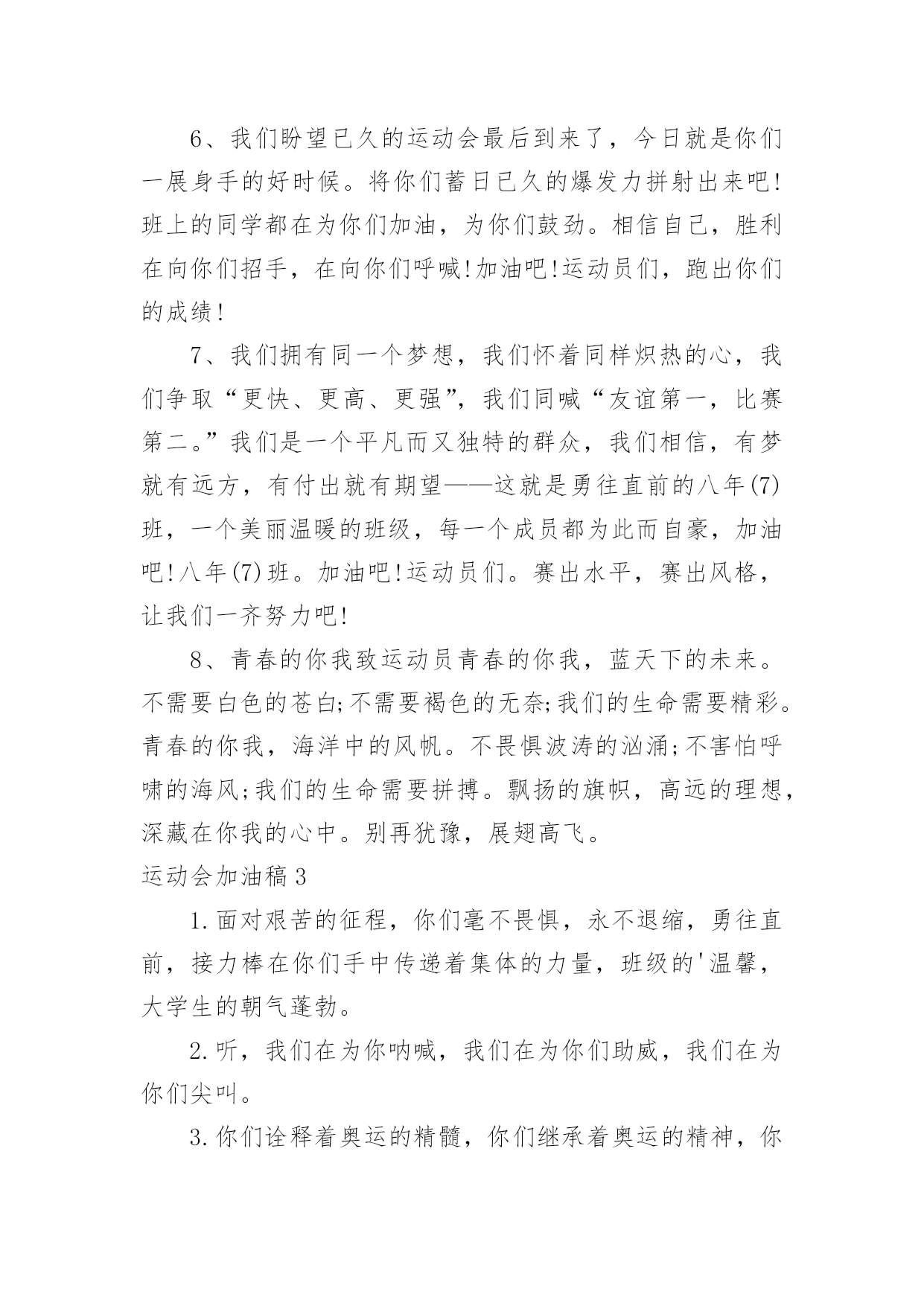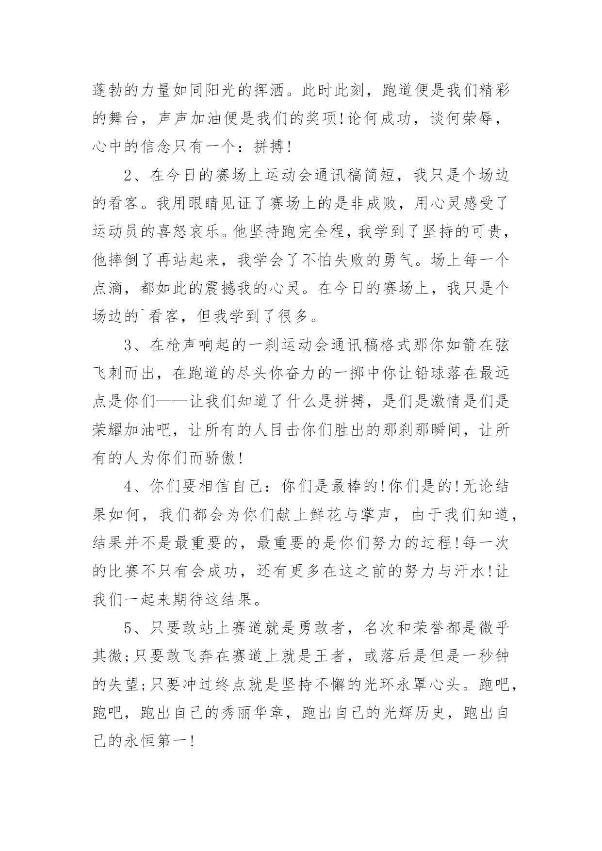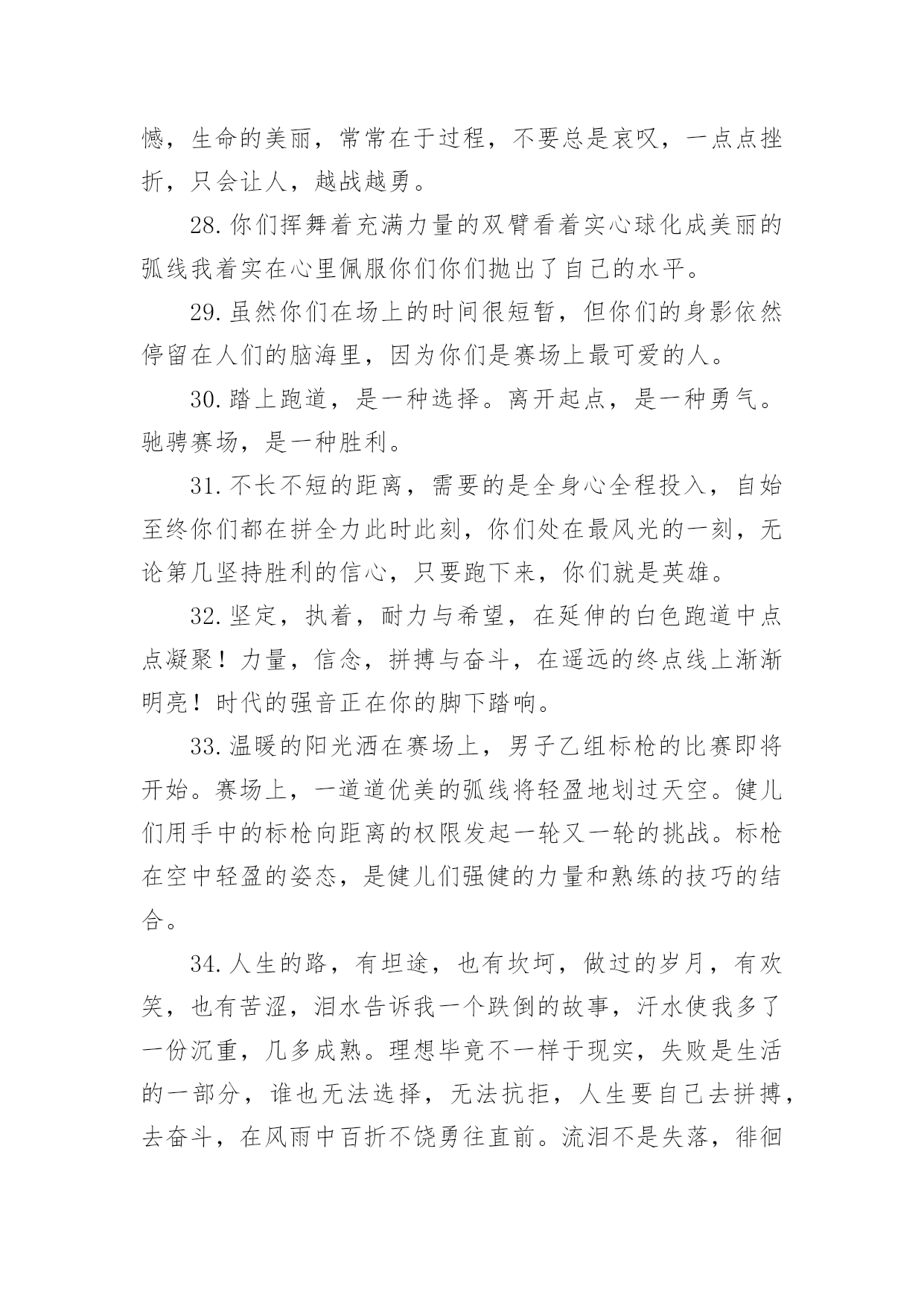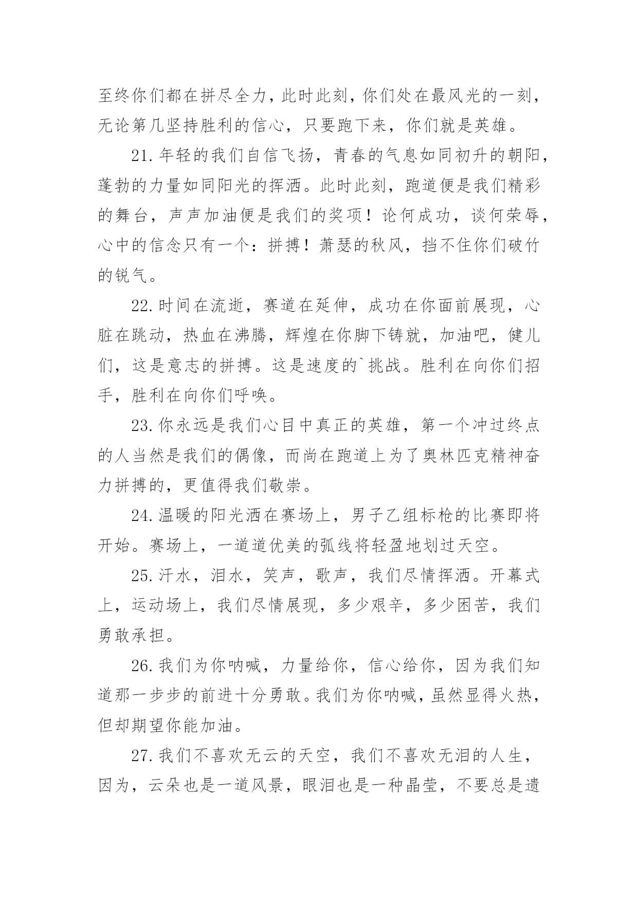 运动会加油稿运动会加油稿常用[15篇]在充满活力,日益开放的今天,越来越多人会去使用加油稿,加油稿是用于给别人加油鼓气,提升别人气势的文稿。你写加油稿时总是无从下笔?以下是小编精心整理的运动会加油稿,仅供参考,大家一起来看看吧。运动会加油稿11.你们挥舞着充满力量的双臂,看着实心球化成美丽的弧线,我着实在心里佩服你们,你们抛出了自我的水平。2.你们快如离弦之箭;疾似撒疆野马;你们的速度让我们惊叹;你们的精神让我们钦佩;流汗千日,只为今日一搏;疾踏百步,只为终点一触!3.漫漫长路,你愿一人独撑,忍受着孤独与寂寞,承受着体力与精神的压迫,只任汗水溶于泪水,可脚步却从不停歇。4.年轻的我们自信飞扬,青春的气息如同初升的朝阳,蓬勃的力量如同阳光的挥洒。此时此刻,跑道便是我们精彩的舞台,声声加油便是我们的奖项!5.我只愿做一片落叶,去点缀金黄的秋天,我只愿做一颗恒星,去装饰耀眼的星河,我只愿做一棵小树,去充实五彩的世界,我只愿坐在场边,同你们分享喜悦,努力吧,拼搏吧,无论何时何地,都会有我在你的身边。6.今日的你们英姿飒爽,今日的你们一马当先。不要放下,不要气馁。相信自己,你是最棒的!你永远都是我们心中的体育健儿!加油!7.时值秋暮冬初,虽然已过了金秋十月,然而初冬依然暖阳高照,校运动会在这样风和日丽的天气里如期举行了。8.努力吧!加油啊!时间短暂并不代表你活力短暂,距离不长却表示你成功不远,相信自己,冲啊!胜利就在眼前,失去不会再现!9.时间在流逝,赛道在延伸,成功在你面前展现。心脏在跳动,热血在沸腾,辉煌在你脚下铸就,加油吧,健儿们!10.或许失败对于你来说是一种耻辱,是一种希望的破灭。几个月的艰辛训练和满怀的希望在一刹那间付诸东流,令你沮丧,令人悲伤,但看看你用尽全力奋力拼搏的一刹那。眼眶中含着泪水的我们不这么想,你是勇敢的,你是坚强的,你用你那顽强的意志完成了你的任务。看成败人生豪迈,我们应从头再来,为你感到了骄傲。11.不为鲜花的围绕,不为刹那的荣耀,只有执着的信念,化作不停的奔跑,心中燃烧着梦想,脚下不停的步伐。12.激情青春,勇者胜:一位名人曾经说过:“风采来源于精神。”那么运动真正的风采理应来源于拼搏,不断超越自我的精神和那种“友谊第一,比赛第二”的运动品质。13.运动场上有你们的飒爽英姿,运动场上有你们拼搏的身影,面对漫漫的征程,你没有畏惧和退缩,任汗水打湿嵴背,任疲惫爬满全身,依然分离追赶,只有一个目标,只有一个信念,为班级赢得荣誉,拼搏吧,我为你们呐喊,加油。14.广阔的绿茵场,是为你们搭建的舞台。张扬吧,年轻的心,我们将为你永远喝彩!15.你说你必须要赢,也必须会赢。枪声响了,四百米,九秒却又像几个世纪,你喊着跑着,迈开大步,跨过世纪。16.看,终点就在眼前;听,同学为你呼喊。鼓起勇气奋力向前,用你的荣誉带给我们期望。17.拼搏者,你是赛场上最亮的点。在你的眼中,不在乎胜利的欢乐和失败的眼泪,完全只是为了展示生命跳跃的节拍。18.青春的脚步,青春的速度,青春的活力,青春的激情,将会在你们的身上尽情体现。迎接自我,挑战自我,战胜自我!我们相信你们必须能行,加油吧,运动员!终点就在眼前!19.也许流星并不少见,但它燃烧的刹那,留给人间最美丽的回忆!也许笑脸并不少见,但胜利的喜悦,总会留给世界精彩的一瞬!是的,那些以前美妙的东西只有短短的一瞬间,但那却把最辉煌的一刻留给了人间。胜利,是每个人所追求的,胜利的喜悦,是胜利与重新开始的转折,胜利是新的开始!20.不长不短的距离,需要的是全身心全程投入,自始至终你们都在拼尽全力,此时此刻,你们处在最风光的一刻,无论第几坚持胜利的信心,只要跑下来,你们就是英雄。21.年轻的我们自信飞扬,青春的气息如同初升的朝阳,蓬勃的力量如同阳光的挥洒。此时此刻,跑道便是我们精彩的舞台,声声加油便是我们的奖项!论何成功,谈何荣辱,心中的信念只有一个:拼搏!萧瑟的秋风,挡不住你们破竹的锐气。22.时间在流逝,赛道在延伸,成功在你面前展现,心脏在跳动,热血在沸腾,辉煌在你脚下铸就,加油吧,健儿们,这是意志的拼搏。这是速度的`挑战。胜利在向你们招手,胜利在向你们呼唤。23.你永远是我们心目中真正的英雄,第一个冲过终点的人当然是我们的偶像,而尚在跑道上为了奥林匹克精神奋力拼搏的,更值得我们敬崇。24.温暖的阳光洒在赛场上,男子乙组标枪的比赛即将开始。赛场上,一道道优美的弧线将轻盈地划过天空。25.汗水,泪水,笑声,歌声,我们尽情挥洒。开幕式上,运动场上,我们尽情展现,多少艰辛,多少困苦,我们勇敢承担。26.我们为你呐喊,力量给你,信心给你,因为我们知道那一步步的前进十分勇敢。我们为你呐喊,虽然显得火热,但却期望你能加油。27.我们不喜欢无云的天空,我们不喜欢无泪的人生,因为,云朵也是一道风景,眼泪