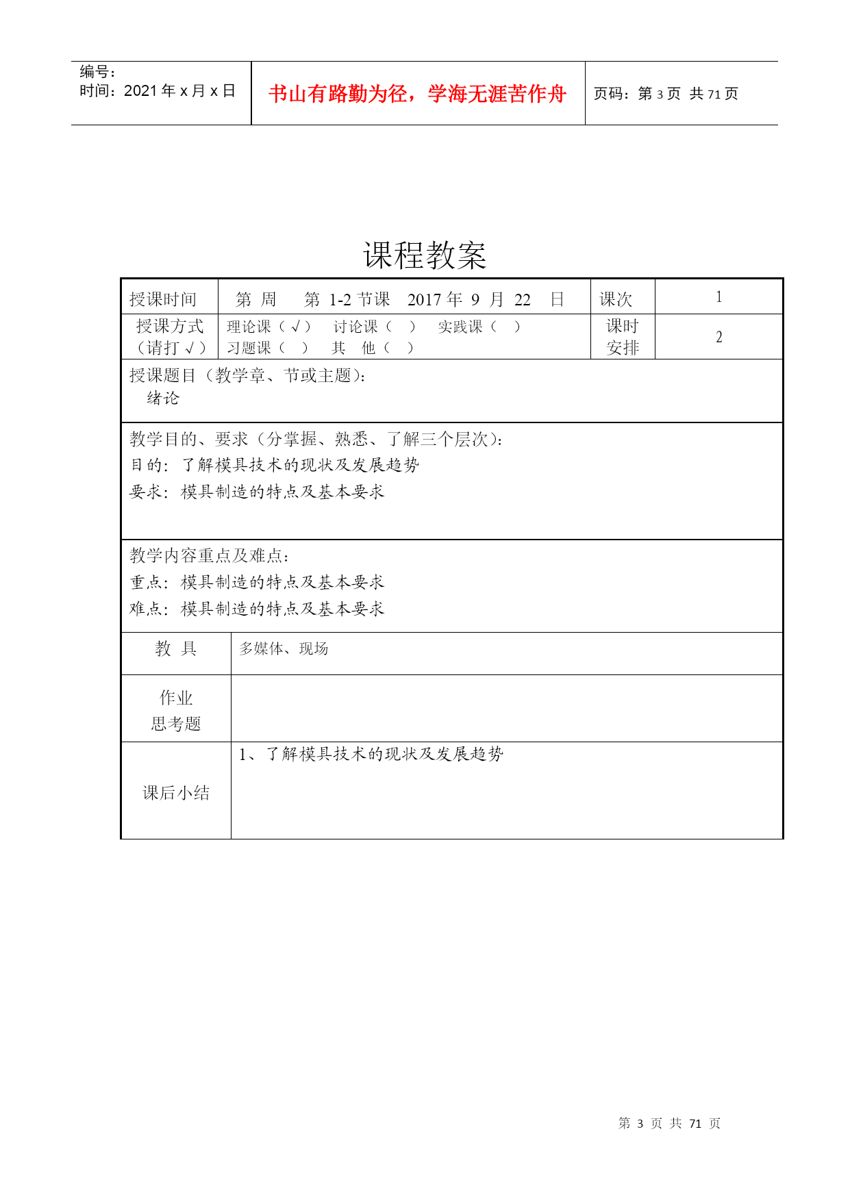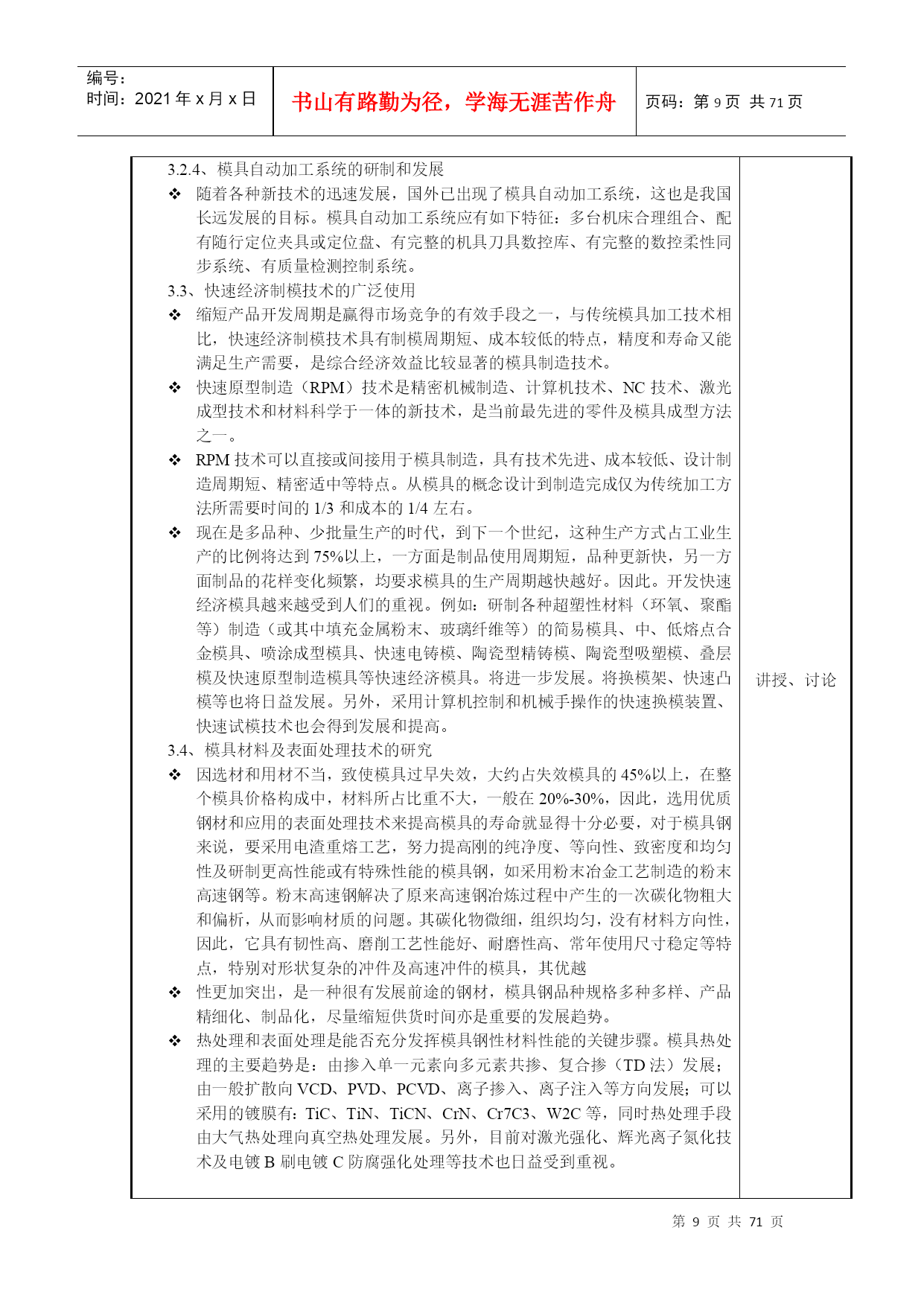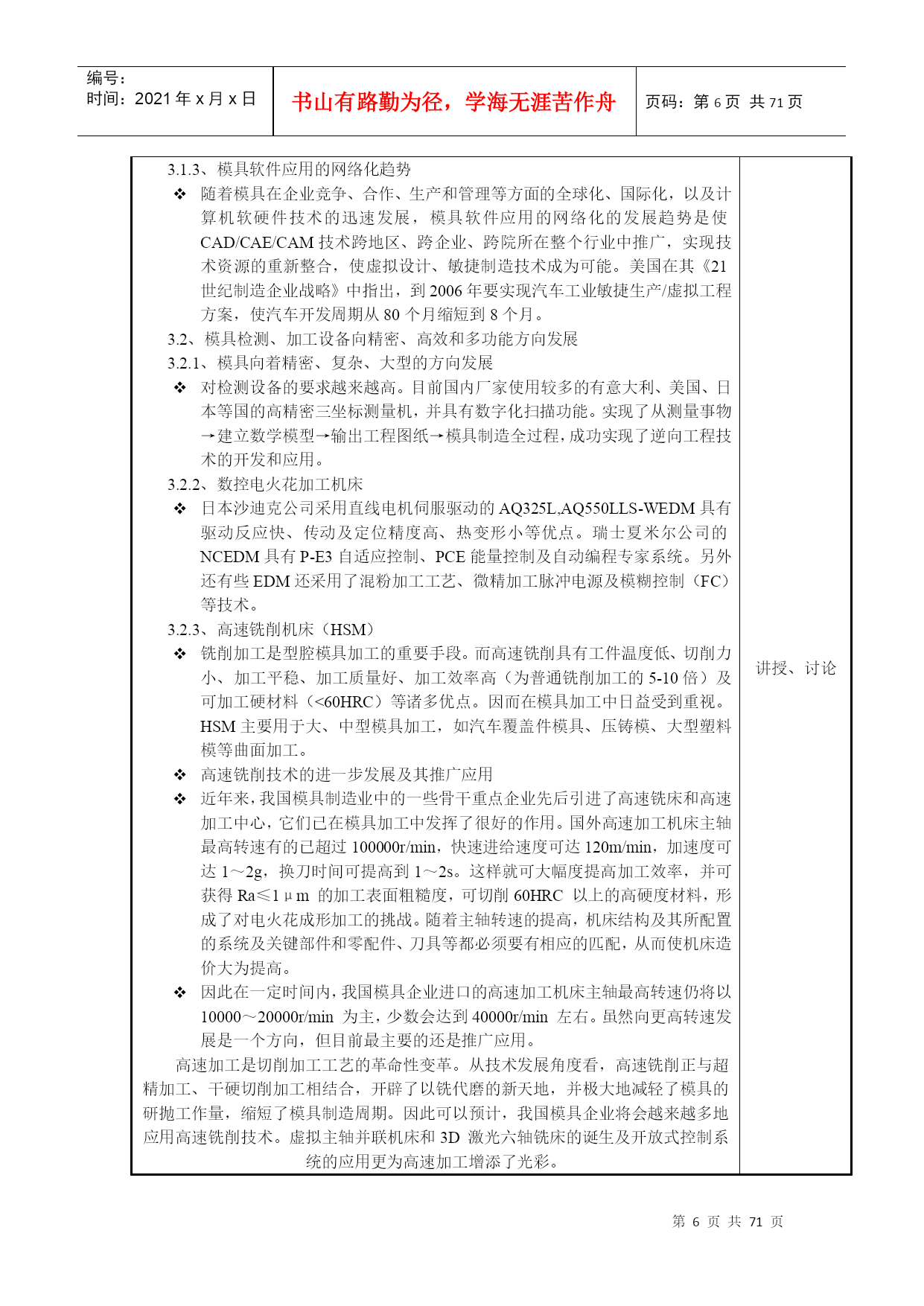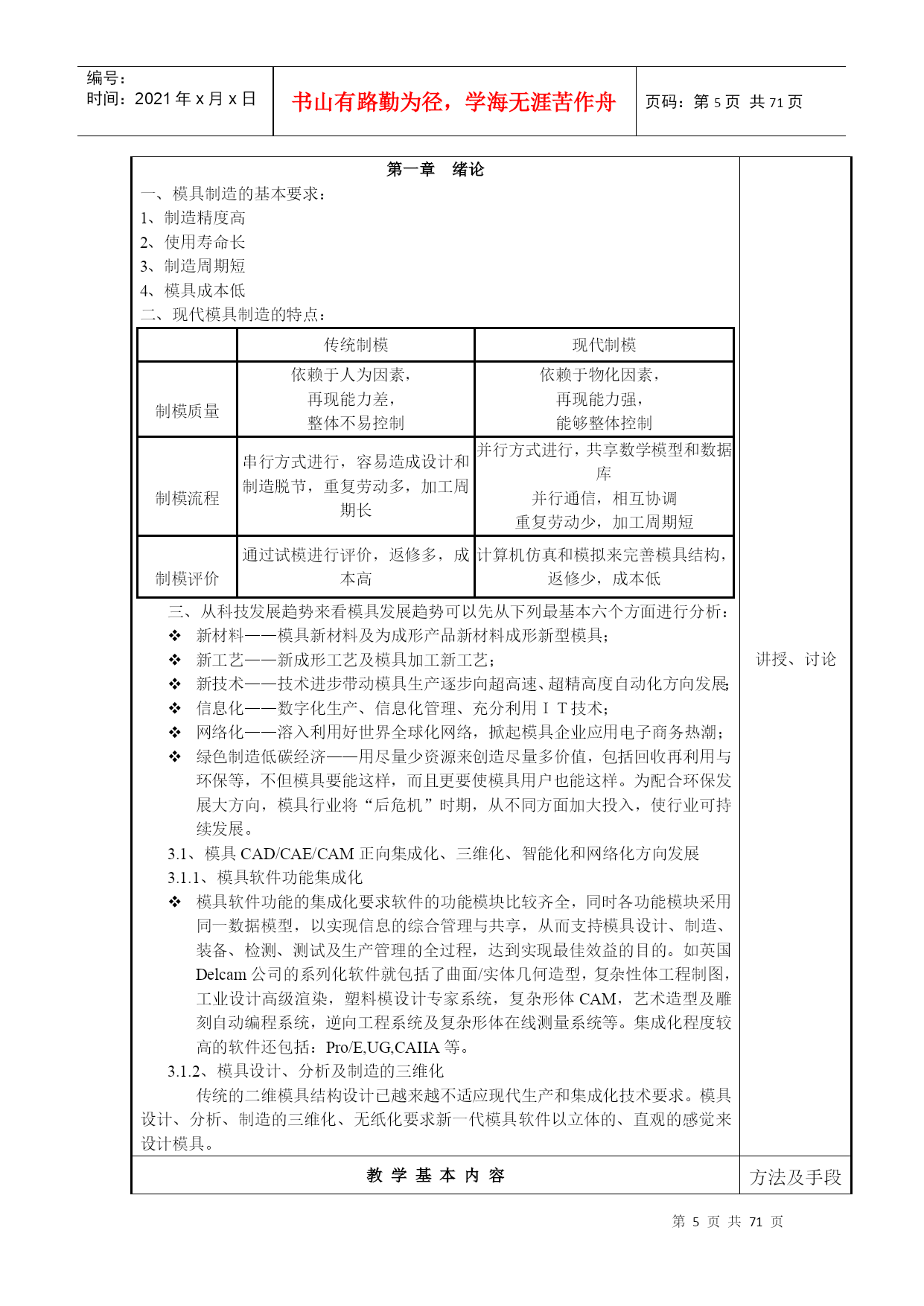 编号:时间:2021年x月x日书山有路勤为径,学海无涯苦作舟页码:第PAGE71页共NUMPAGES71页第PAGE\*MERGEFORMAT71页共NUMPAGES\*MERGEFORMAT71页教案2017―2018学年第一学期所属学院_机电与汽车工程学院_教研室数控机电教研室课程名称_模具制造技术适用班级_15模具_主讲教师___呼昊__职称__高级工程师_____2017年9月5日厦门华天涉外职业技术学院教务处制首页课程名称模具制造技术授课对象(班级)15模具课程编号1113B224课程类型必修课公共基础课();专业基础课(√);专业课()选修课专业选修课();公共选修课()授课方式课堂讲授(√);实践课()考核方式考试(√);课程教学总学时数36学分数2学时分配理论教学:36学时;实验(实训):学时选用的教材及主要参考资料序号教材名称作者出版社出版时间1模具制造技术周兰菊化工工业出版社2016.0623授课教师呼昊职称高级工程师授课时间2017—2018学年第一学期—10周注:表中()选项请打“√”。课程教案授课时间第周第1-2节课2017年9月22日课次1授课方式(请打√)理论课(√)讨论课()实践课()习题课()其他()课时安排2授课题目(教学章、节或主题):绪论教学目的、要求(分掌握、熟悉、了解三个层次):目的:了解模具技术的现状及发展趋势要求:模具制造的特点及基本要求教学内容重点及难点:重点:模具制造的特点及基本要求难点:模具制造的特点及基本要求教具多媒体、现场作业思考题课后小结1、了解模具技术的现状及发展趋势教学基本内容方法及手段第一章绪论一、模具制造的基本要求:1、制造精度高2、使用寿命长3、制造周期短4、模具成本低二、现代模具制造的特点:传统制模现代制模制模质量依赖于人为因素,再现能力差,整体不易控制依赖于物化因素,再现能力强,能够整体控制制模流程串行方式进行,容易造成设计和制造脱节,重复劳动多,加工周期长并行方式进行,共享数学模型和数据库并行通信,相互协调重复劳动少,加工周期短制模评价通过试模进行评价,返修多,成本高计算机仿真和模拟来完善模具结构,返修少,成本低三、从科技发展趋势来看模具发展趋势可以先从下列最基本六个方面进行分析:新材料——模具新材料及为成形产品新材料成形新型模具;新工艺——新成形工艺及模具加工新工艺;新技术——技术进步带动模具生产逐步向超高速、超精高度自动化方向发展;信息化——数字化生产、信息化管理、充分利用IT技术;网络化——溶入利用好世界全球化网络,掀起模具企业应用电子商务热潮;绿色制造低碳经济——用尽量少资源来创造尽量多价值,包括回收再利用与环保等,不但模具要能这样,而且更要使模具用户也能这样。为配合环保发展大方向,模具行业将“后危机”时期,从不同方面加大投入,使行业可持续发展。3.1、模具CAD/CAE/CAM正向集成化、三维化、智能化和网络化方向发展3.1.1、模具软件功能集成化模具软件功能的集成化要求软件的功能模块比较齐全,同时各功能模块采用同一数据模型,以实现信息的综合管理与共享,从而支持模具设计、制造、装备、检测、测试及生产管理的全过程,达到实现最佳效益的目的。如英国Delcam公司的系列化软件就包括了曲面/实体几何造型,复杂性体工程制图,工业设计高级渲染,塑料模设计专家系统,复杂形体CAM,艺术造型及雕刻自动编程系统,逆向工程系统及复杂形体在线测量系统等。集成化程度较高的软件还包括:Pro/E,UG,CAIIA等。3.1.2、模具设计、分析及制造的三维化传统的二维模具结构设计已越来越不适应现代生产和集成化技术要求。模具设计、分析、制造的三维化、无纸化要求新一代模具软件以立体的、直观的感觉来设计模具。讲授、讨论教学基本内容方法及手段3.1.3、模具软件应用的网络化趋势随着模具在企业竞争、合作、生产和管理等方面的全球化、国际化,以及计算机软硬件技术的迅速发展,模具软件应用的网络化的发展趋势是使CAD/CAE/CAM技术跨地区、跨企业、跨院所在整个行业中推广,实现技术资源的重新整合,使虚拟设计、敏捷制造技术成为可能。美国在其《21世纪制造企业战略》中指出,到2006年要实现汽车工业敏捷生产/虚拟工程方案,使汽车开发周期从80个月缩短到8个月。3.2、模具检测、加工设备向精密、高效和多功能方向发展3.2.1、模具向着精密、复杂、大型的方向发展对检测设备的要求越来越高。目前国内厂家使用较多的有意大利、美国、日本等国的高精密三坐标测量机,并具有数字化扫描功能。实现了从测量事物→建立数学