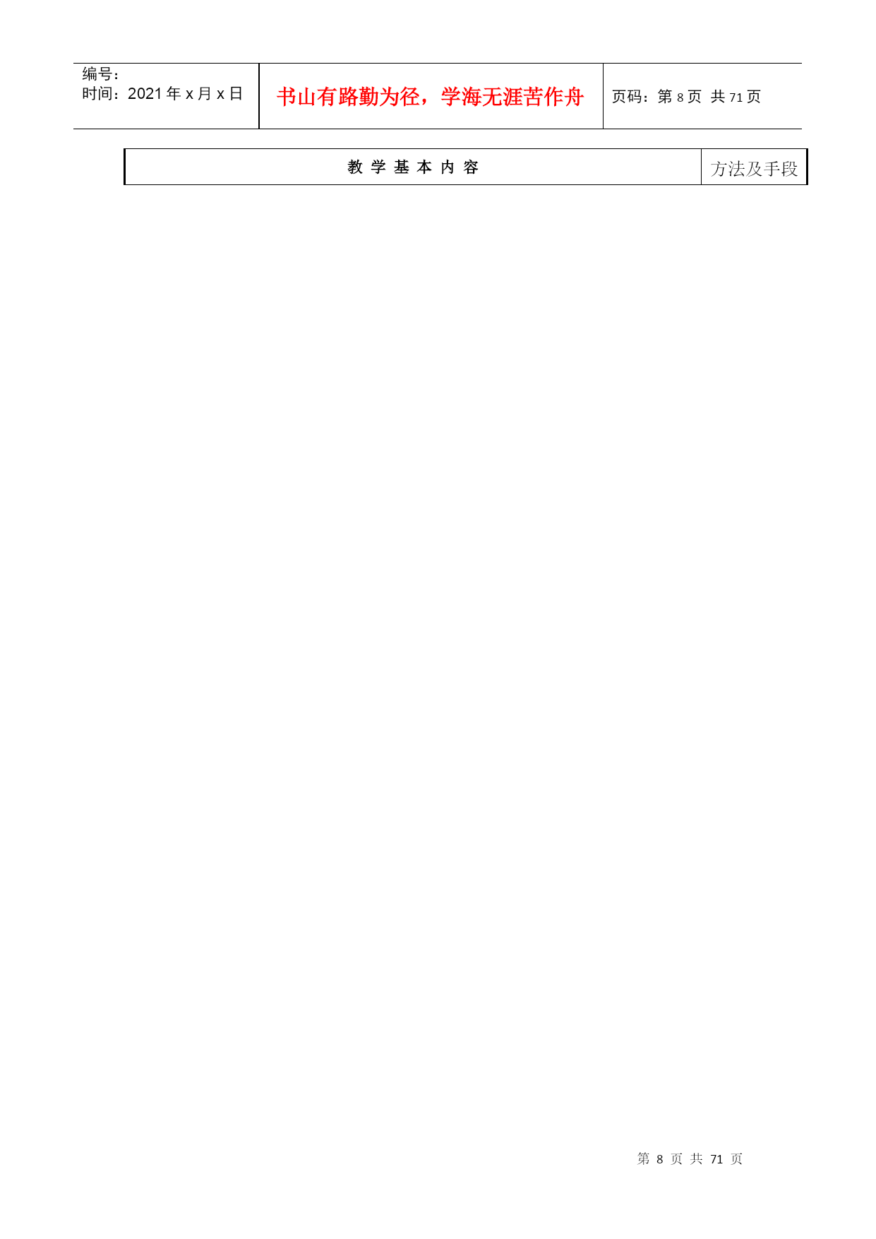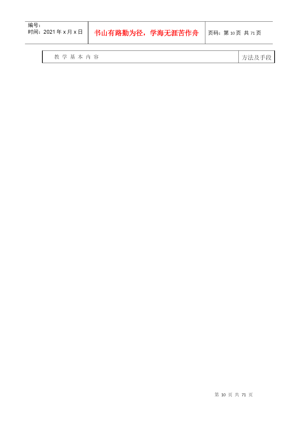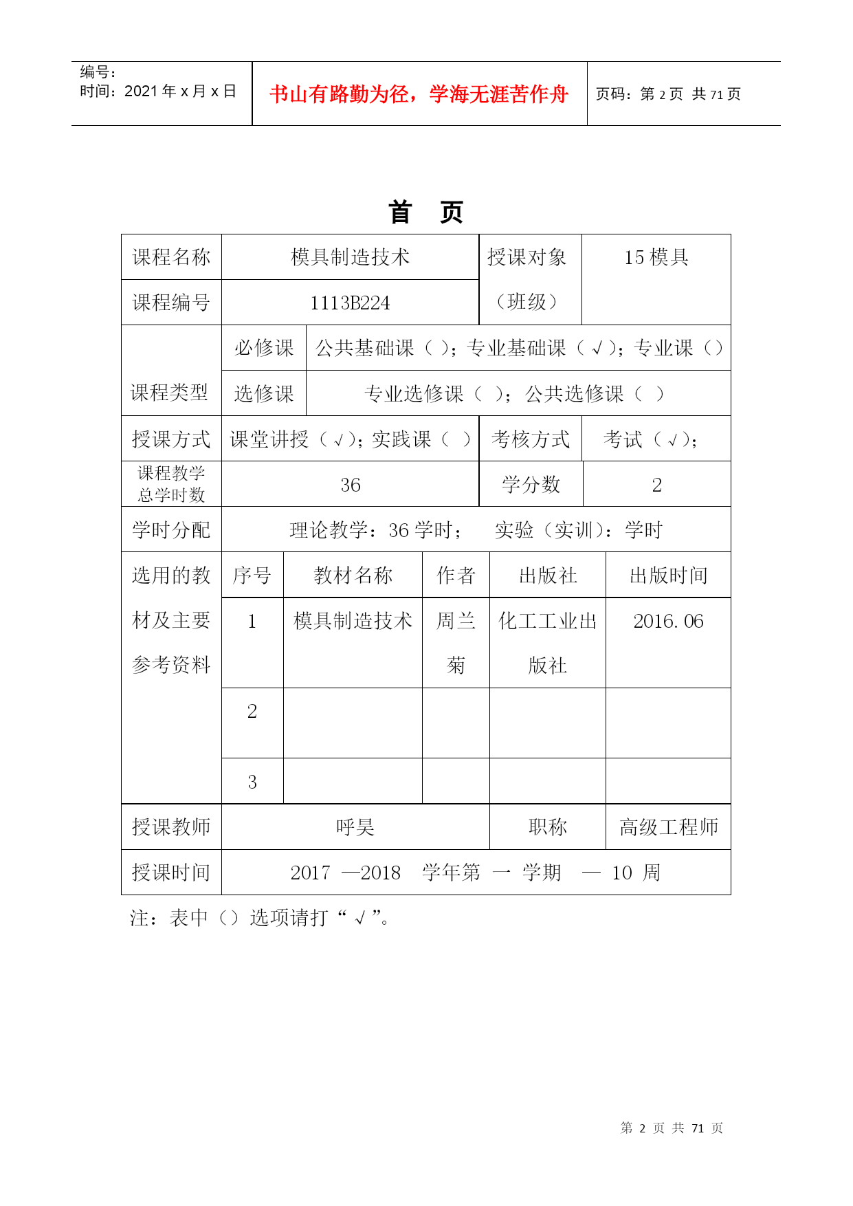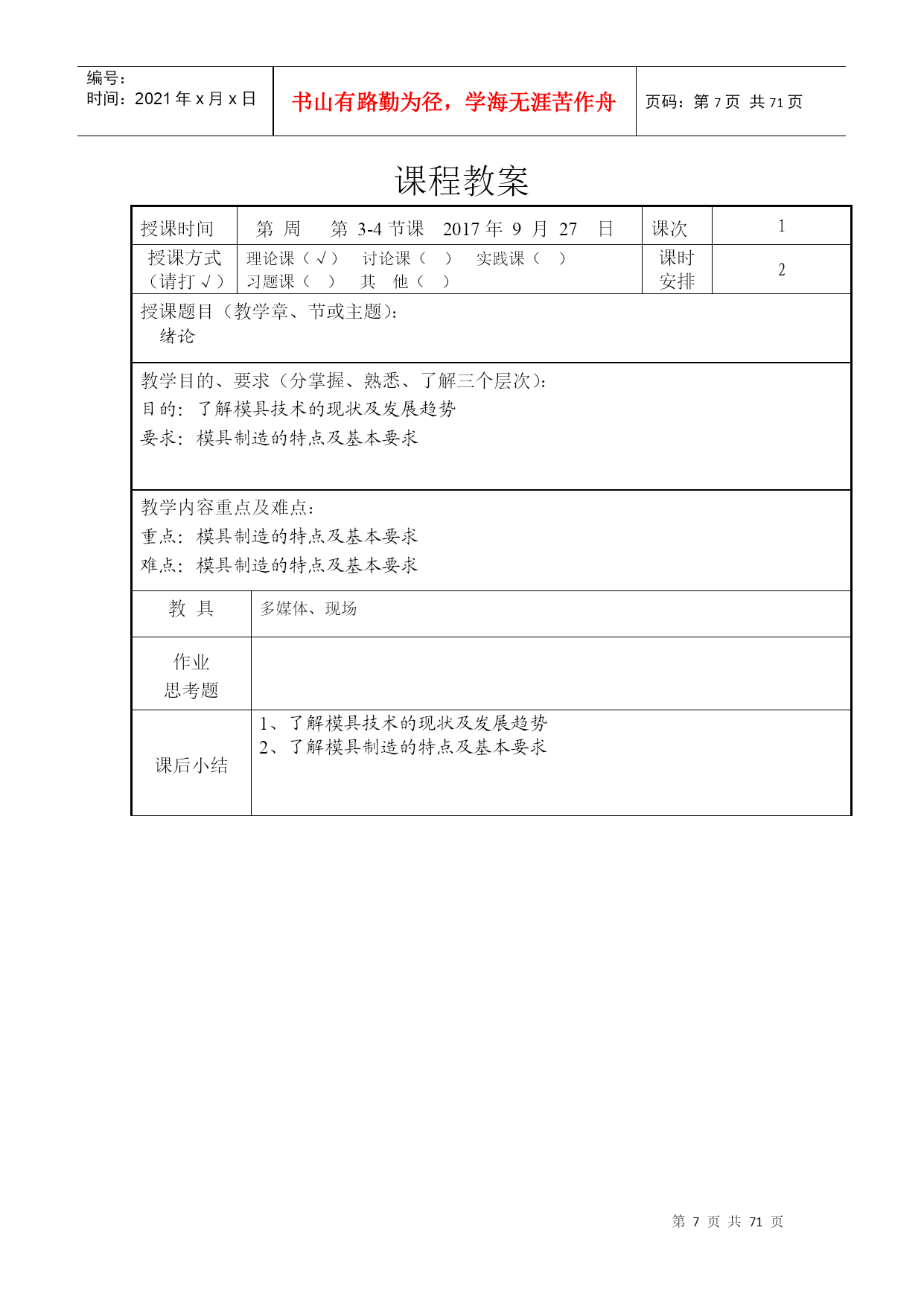 编号:时间:2021年x月x日书山有路勤为径,学海无涯苦作舟页码:第PAGE71页共NUMPAGES71页第PAGE\*MERGEFORMAT71页共NUMPAGES\*MERGEFORMAT71页教案2017―2018学年第一学期所属学院_机电与汽车工程学院_教研室数控机电教研室课程名称_模具制造技术适用班级_15模具_主讲教师___呼昊__职称__高级工程师_____2017年9月5日厦门华天涉外职业技术学院教务处制首页课程名称模具制造技术授课对象(班级)15模具课程编号1113B224课程类型必修课公共基础课();专业基础课(√);专业课()选修课专业选修课();公共选修课()授课方式课堂讲授(√);实践课()考核方式考试(√);课程教学总学时数36学分数2学时分配理论教学:36学时;实验(实训):学时选用的教材及主要参考资料序号教材名称作者出版社出版时间1模具制造技术周兰菊化工工业出版社2016.0623授课教师呼昊职称高级工程师授课时间2017—2018学年第一学期—10周注:表中()选项请打“√”。课程教案授课时间第周第1-2节课2017年9月22日课次1授课方式(请打√)理论课(√)讨论课()实践课()习题课()其他()课时安排2授课题目(教学章、节或主题):绪论教学目的、要求(分掌握、熟悉、了解三个层次):目的:了解模具技术的现状及发展趋势要求:模具制造的特点及基本要求教学内容重点及难点:重点:模具制造的特点及基本要求难点:模具制造的特点及基本要求教具多媒体、现场作业思考题课后小结1、了解模具技术的现状及发展趋势教学基本内容方法及手段第一章绪论一、模具制造的基本要求:1、制造精度高2、使用寿命长3、制造周期短4、模具成本低二、现代模具制造的特点:传统制模现代制模制模质量依赖于人为因素,再现能力差,整体不易控制依赖于物化因素,再现能力强,能够整体控制制模流程串行方式进行,容易造成设计和制造脱节,重复劳动多,加工周期长并行方式进行,共享数学模型和数据库并行通信,相互协调重复劳动少,加工周期短制模评价通过试模进行评价,返修多,成本高计算机仿真和模拟来完善模具结构,返修少,成本低三、从科技发展趋势来看模具发展趋势可以先从下列最基本六个方面进行分析:新材料——模具新材料及为成形产品新材料成形新型模具;新工艺——新成形工艺及模具加工新工艺;新技术——技术进步带动模具生产逐步向超高速、超精高度自动化方向发展;信息化——数字化生产、信息化管理、充分利用IT技术;网络化——溶入利用好世界全球化网络,掀起模具企业应用电子商务热潮;绿色制造低碳经济——用尽量少资源来创造尽量多价值,包括回收再利用与环保等,不但模具要能这样,而且更要使模具用户也能这样。为配合环保发展大方向,模具行业将“后危机”时期,从不同方面加大投入,使行业可持续发展。3.1、模具CAD/CAE/CAM正向集成化、三维化、智能化和网络化方向发展3.1.1、模具软件功能集成化模具软件功能的集成化要求软件的功能模块比较齐全,同时各功能模块采用同一数据模型,以实现信息的综合管理与共享,从而支持模具设计、制造、装备、检测、测试及生产管理的全过程,达到实现最佳效益的目的。如英国Delcam公司的系列化软件就包括了曲面/实体几何造型,复杂性体工程制图,工业设计高级渲染,塑料模设计专家系统,复杂形体CAM,艺术造型及雕刻自动编程系统,逆向工程系统及复杂形体在线测量系统等。集成化程度较高的软件还包括:Pro/E,UG,CAIIA等。3.1.2、模具设计、分析及制造的三维化传统的二维模具结构设计已越来越不适应现代生产和集成化技术要求。模具设计、分析、制造的三维化、无纸化要求新一代模具软件以立体的、直观的感觉来设计模具。讲授、讨论教学基本内容方法及手段3.1.3、模具软件应用的网络化趋势随着模具在企业竞争、合作、生产和管理等方面的全球化、国际化,以及计算机软硬件技术的迅速发展,模具软件应用的网络化的发展趋势是使CAD/CAE/CAM技术跨地区、跨企业、跨院所在整个行业中推广,实现技术资源的重新整合,使虚拟设计、敏捷制造技术成为可能。美国在其《21世纪制造企业战略》中指出,到2006年要实现汽车工业敏捷生产/虚拟工程方案,使汽车开发周期从80个月缩短到8个月。3.2、模具检测、加工设备向精密、高效和多功能方向发展3.2.1、模具向着精密、复杂、大型的方向发展对检测设备的要求越来越高。目前国内厂家使用较多的有意大利、美国、日本等国的高精密三坐标测量机,并具有数字化扫描功能。实现了从测量事物→建立数学