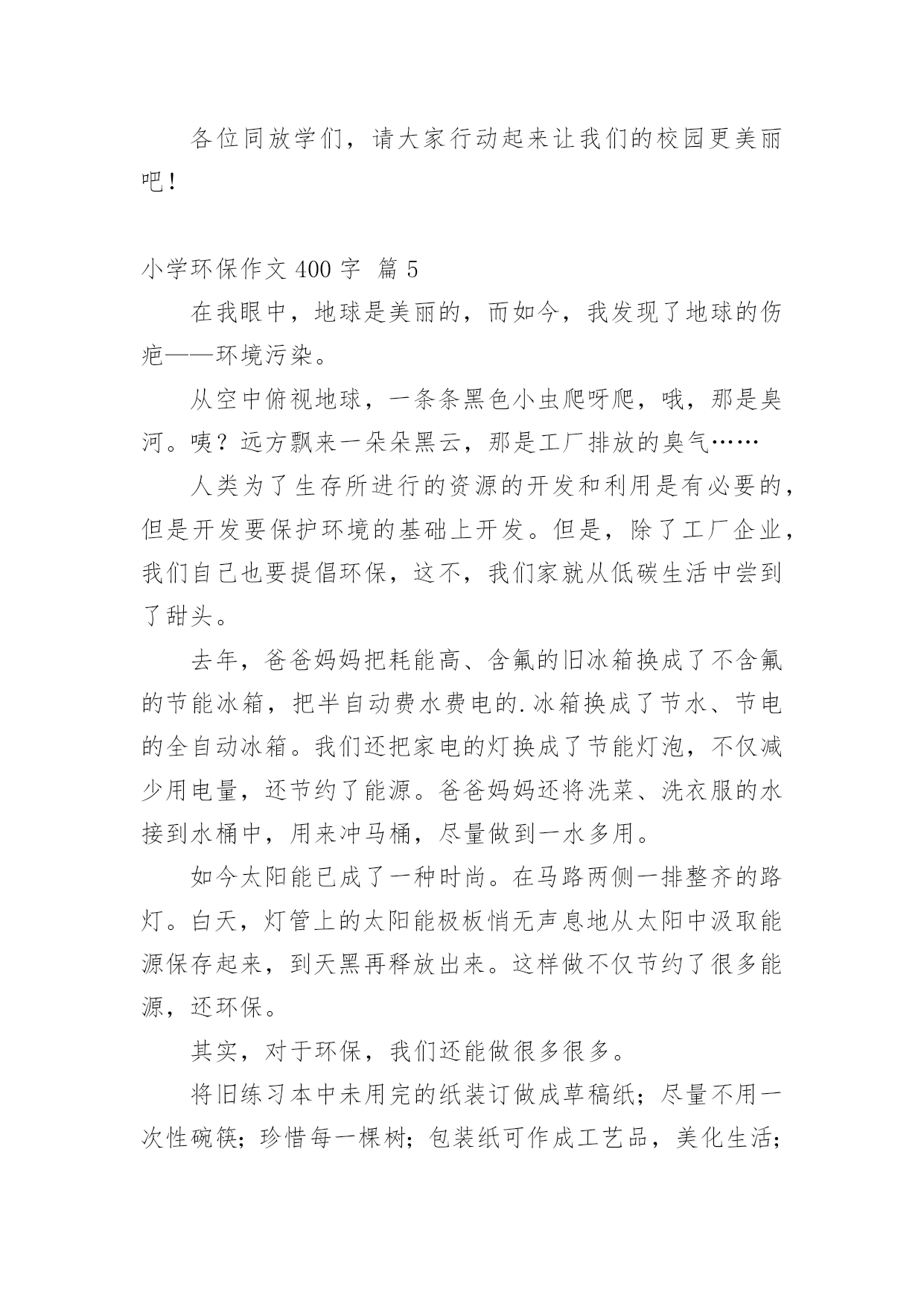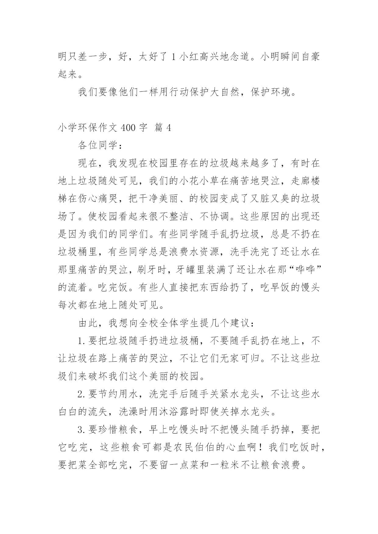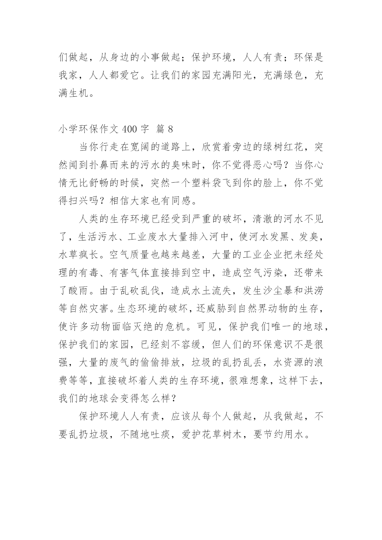 小学环保作文400字小学环保作文400字八篇在日常学习、工作抑或是生活中,大家都接触过作文吧,借助作文可以宣泄心中的情感,调节自己的心情。那么问题来了,到底应如何写一篇优秀的作文呢?以下是小编为大家收集的小学环保作文400字8篇,希望能够帮助到大家。小学环保作文400字篇1时间总是过得这么快,一眼就过了20年。如今已不像从前那样,一次性的塑料袋满天飞,沙漠不断往城市里蔓延。可现在,就算是有许多高楼大厦的地方,也能看见大片大片的树林。这时的我,有了一份目前最热门的工作——“环保发明家”。20年前,或许这是一份非常冷清的工作,可是现在,公司门口每天都热火朝天的,每天就有300到400人来应聘,可每天只有100人能录取。我们的工作非常有意义,我们把一些可回收的垃圾做成树的种子、收纳盒甚至雕塑,来美化地球。另外,我们还会做一点小发明,比如说环保车、空气吸尘器、污水排离兽,这些发明都已得到人们的认可,在我们公司中最重要的发明是修补机器人,这是我们针对臭氧层空洞而发明的,这些小机器人就等于是臭氧层的医生,而他们口中喷出的气体则是药,能在5分钟内修补2平方分米的臭氧层空洞。“叮铃铃——叮铃铃”我慢慢地睁开了眼睛,发现我躺在我家的地板上。啊,原来这都是梦啊!这时,我闪过了一个念头:为什么我不能把它变成现实呢?我走到阳台上,对着天空大喊:“我要尽自己的一份力,让地球变成一个美丽的、被绿色包围的星球!”小学环保作文400字篇2“快点快点,要迟到拉。”在一阵阵急促的声音中,我飞快地整理好我大大的书包,就匆忙的上车了。本来要求要10点到校,可是现在已经11。40了。况且我的学校在金华而我的家在东阳,虽然东阳属于金华,可是最快也要1个多小时,到哪儿都要12点。我坐在车上透过玻璃观赏着窗外的风景,过了一会儿已经来到了义乌江了,在义乌江边我看到了令我伤心的一幕,那一幕让所有关爱地球的人看到了他们也一定会伤心,因为他们在破坏地球。这也让我相信了地球上有破坏自己家园的人,我真的不敢相信我的眼睛,我冷静下来想了一会儿才半信半疑。这些人做的事都是一丁点小事——乱扔垃圾。不过这些人扔垃圾的方式多种多样,真令我“大开眼界“:第一个人:他手里拿着一个刚吃完的苹果核,先往四周看了看,大概是在找哪儿有垃圾桶。可是四周都没有垃圾桶,他就把手一举,手腕儿往前一翘,苹果核就从他手里弹出去了。还有一个人他手里有个塑料袋,大概是嫌拿在手里麻烦,连四周有没有垃圾桶都没看过就把手一抬,伸到江边,五个手指头一松,那只塑料袋就轻飘飘的落到了江面上随风而去。如果每个人都像他们那样世界将变成什么样子!小学环保作文400字篇3一天,小明和小红正开开心心地走在回家的路上,突然他们闻到一阵臭味扑面而来,他们俩赶紧把鼻子捂了起来。原来前面有个果皮箱,臭味是从果皮箱旁边的垃圾堆中发出来的。地面一片狼藉,全是张兮兮的垃圾。小明说:这些人怎么那么没有公德心啊!小红说;是啊,每天保洁阿姨们都那么辛苦,有人还天天随手扔垃圾。小红说着就向前走去,带上一次性手套准备要捡垃圾。他看到小明还愣在那里一动不动。就气愤地对他说:小明你为什么不来帮忙啊,老师每天都对我们说要保护大自然,不能乱扔垃圾,现在你怎么在那儿一动也不动啊!小明说;我知道,我在想办法呢。说完他灵光一闪,趴在地上,从书包里拿出一幅红色的大纸和笔,在地上认真地写着什么。小红又问:那你想到了什么办法。写好了你就知道了。小明自信地回答道。小红快速地把地上的垃圾捡了起来,全都扔进了垃圾箱。小明在纸上工整地写上了几个大字。小明从包里拿出了502强力胶把纸贴在了果皮箱上。文明只差一步,好,太好了1小红高兴地念道。小明瞬间自豪起来。我们要像他们一样用行动保护大自然,保护环境。小学环保作文400字篇4各位同学:现在,我发现在校园里存在的垃圾越来越多了,有时在地上垃圾随处可见,我们的小花小草在痛苦地哭泣,走廊楼梯在伤心痛哭,把干净美丽、的校园变成了又脏又臭的垃圾场了。使校园看起来很不整洁、不协调。这些原因的出现还是因为我们的同学们。有些同学随手乱扔垃圾,总是不扔在垃圾桶里,有些同学总是浪费水资源,洗手洗完了还让水在那里痛苦的哭泣,刷牙时,牙罐里装满了还让水在那“哗哗”的流着。吃完饭。有些人直接把东西给扔了,吃早饭的馒头每次都在地上随处可见。由此,我想向全校全体学生提几个建议:1.要把垃圾随手扔进垃圾桶,不要随手乱扔在地上,不让垃圾在路上痛苦的哭泣,不让它们无家可归。不让这些垃圾们来破坏我们这个美丽的校园。2.要节约用水,洗完手后随手关紧水龙头,不让这些水白白的流失,洗澡时用沐浴露时即使关掉水龙头。3.要珍惜粮食,早上吃馒头时不把馒头随手扔掉,要把它吃完,这些粮食可都是农民伯伯的心血啊!我们吃饭时,要把菜全部吃完,不要留一点菜和一粒米不让粮食浪费。各位同放学们,请大家行动起