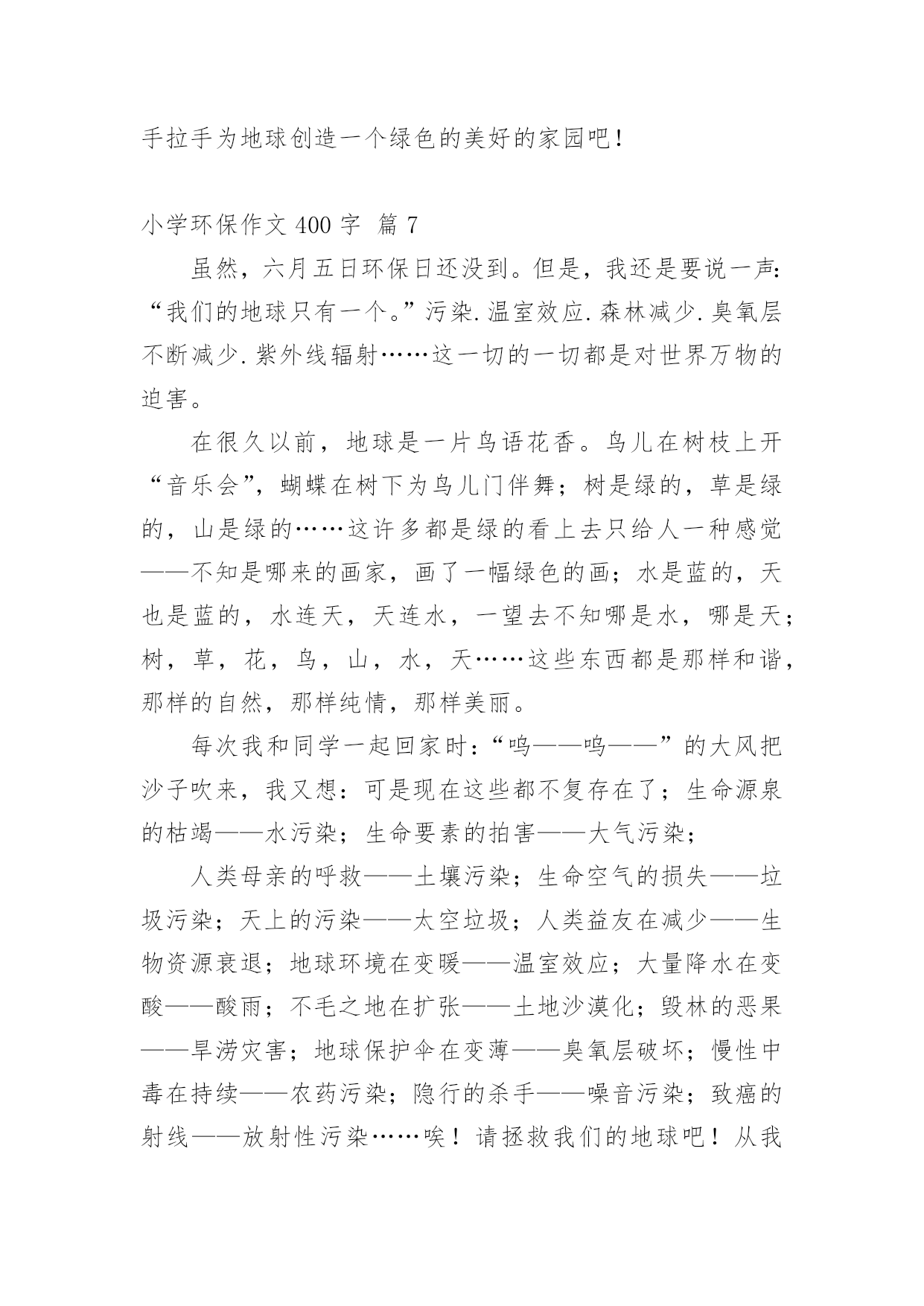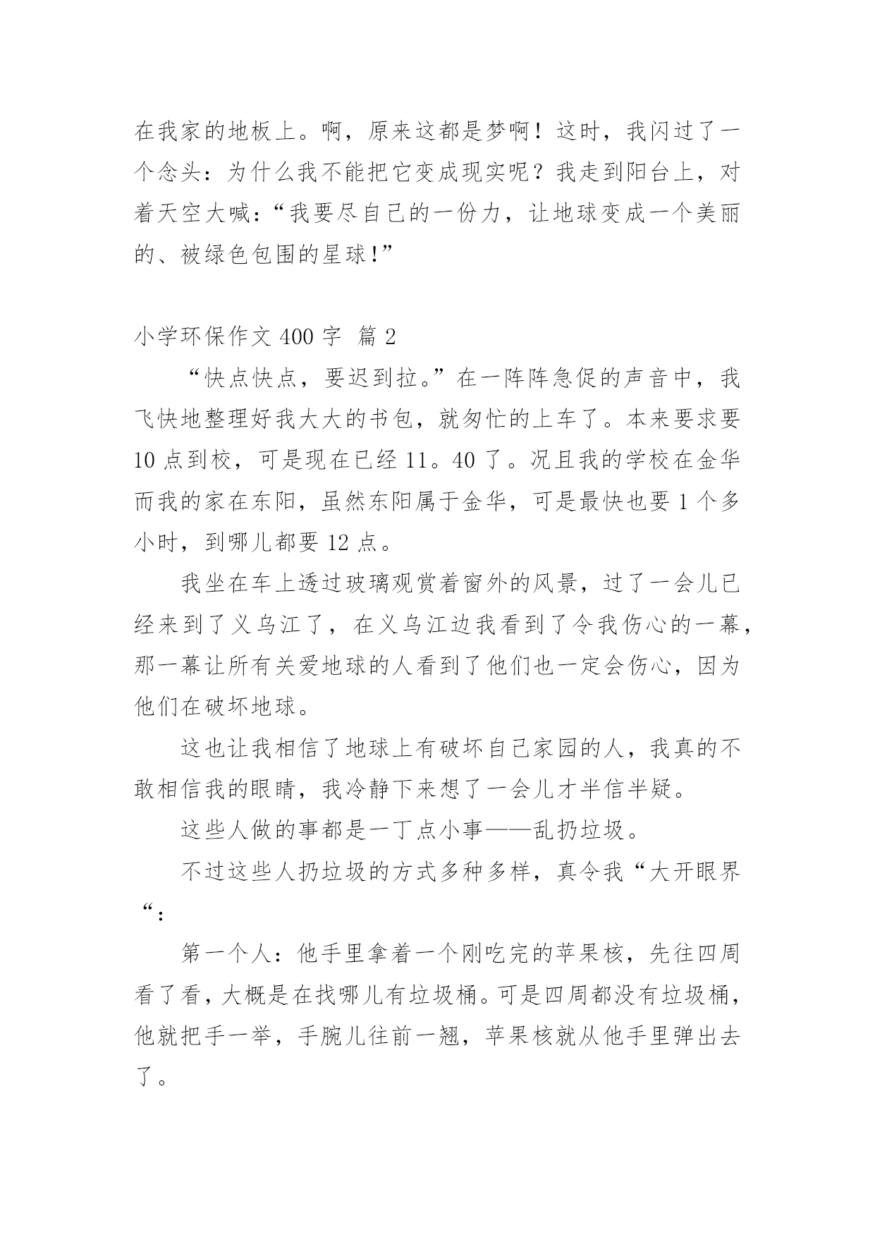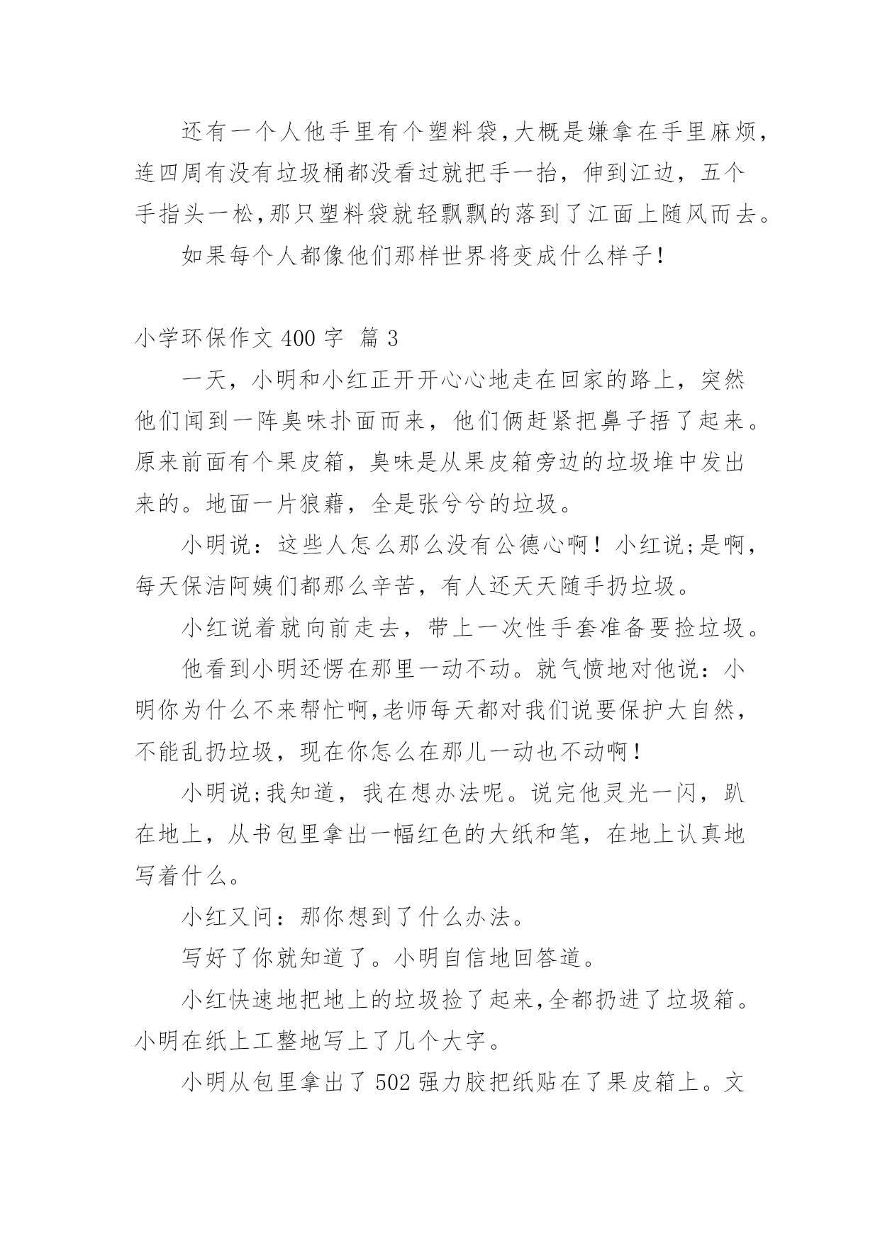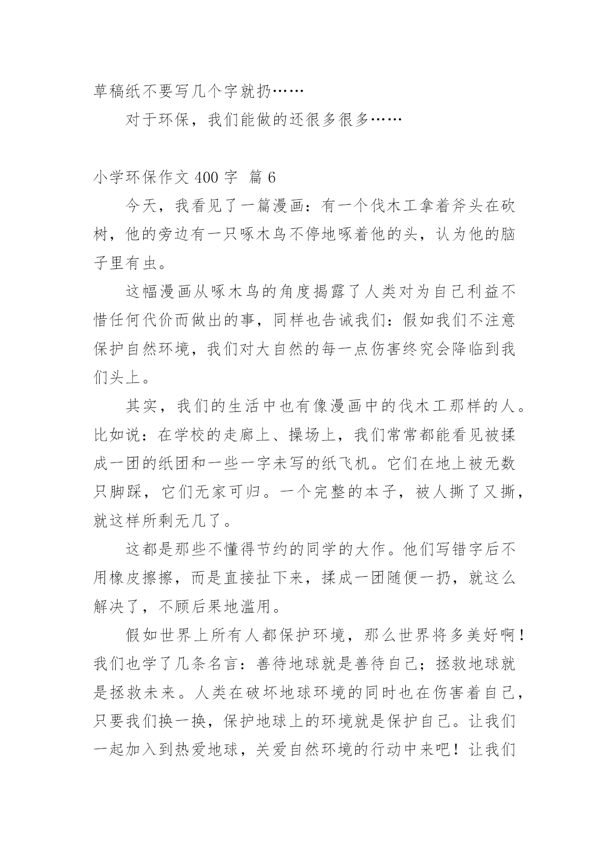 小学环保作文400字小学环保作文400字八篇在日常学习、工作抑或是生活中,大家都接触过作文吧,借助作文可以宣泄心中的情感,调节自己的心情。那么问题来了,到底应如何写一篇优秀的作文呢?以下是小编为大家收集的小学环保作文400字8篇,希望能够帮助到大家。小学环保作文400字篇1时间总是过得这么快,一眼就过了20年。如今已不像从前那样,一次性的塑料袋满天飞,沙漠不断往城市里蔓延。可现在,就算是有许多高楼大厦的地方,也能看见大片大片的树林。这时的我,有了一份目前最热门的工作——“环保发明家”。20年前,或许这是一份非常冷清的工作,可是现在,公司门口每天都热火朝天的,每天就有300到400人来应聘,可每天只有100人能录取。我们的工作非常有意义,我们把一些可回收的垃圾做成树的种子、收纳盒甚至雕塑,来美化地球。另外,我们还会做一点小发明,比如说环保车、空气吸尘器、污水排离兽,这些发明都已得到人们的认可,在我们公司中最重要的发明是修补机器人,这是我们针对臭氧层空洞而发明的,这些小机器人就等于是臭氧层的医生,而他们口中喷出的气体则是药,能在5分钟内修补2平方分米的臭氧层空洞。“叮铃铃——叮铃铃”我慢慢地睁开了眼睛,发现我躺在我家的地板上。啊,原来这都是梦啊!这时,我闪过了一个念头:为什么我不能把它变成现实呢?我走到阳台上,对着天空大喊:“我要尽自己的一份力,让地球变成一个美丽的、被绿色包围的星球!”小学环保作文400字篇2“快点快点,要迟到拉。”在一阵阵急促的声音中,我飞快地整理好我大大的书包,就匆忙的上车了。本来要求要10点到校,可是现在已经11。40了。况且我的学校在金华而我的家在东阳,虽然东阳属于金华,可是最快也要1个多小时,到哪儿都要12点。我坐在车上透过玻璃观赏着窗外的风景,过了一会儿已经来到了义乌江了,在义乌江边我看到了令我伤心的一幕,那一幕让所有关爱地球的人看到了他们也一定会伤心,因为他们在破坏地球。这也让我相信了地球上有破坏自己家园的人,我真的不敢相信我的眼睛,我冷静下来想了一会儿才半信半疑。这些人做的事都是一丁点小事——乱扔垃圾。不过这些人扔垃圾的方式多种多样,真令我“大开眼界“:第一个人:他手里拿着一个刚吃完的苹果核,先往四周看了看,大概是在找哪儿有垃圾桶。可是四周都没有垃圾桶,他就把手一举,手腕儿往前一翘,苹果核就从他手里弹出去了。还有一个人他手里有个塑料袋,大概是嫌拿在手里麻烦,连四周有没有垃圾桶都没看过就把手一抬,伸到江边,五个手指头一松,那只塑料袋就轻飘飘的落到了江面上随风而去。如果每个人都像他们那样世界将变成什么样子!小学环保作文400字篇3一天,小明和小红正开开心心地走在回家的路上,突然他们闻到一阵臭味扑面而来,他们俩赶紧把鼻子捂了起来。原来前面有个果皮箱,臭味是从果皮箱旁边的垃圾堆中发出来的。地面一片狼藉,全是张兮兮的垃圾。小明说:这些人怎么那么没有公德心啊!小红说;是啊,每天保洁阿姨们都那么辛苦,有人还天天随手扔垃圾。小红说着就向前走去,带上一次性手套准备要捡垃圾。他看到小明还愣在那里一动不动。就气愤地对他说:小明你为什么不来帮忙啊,老师每天都对我们说要保护大自然,不能乱扔垃圾,现在你怎么在那儿一动也不动啊!小明说;我知道,我在想办法呢。说完他灵光一闪,趴在地上,从书包里拿出一幅红色的大纸和笔,在地上认真地写着什么。小红又问:那你想到了什么办法。写好了你就知道了。小明自信地回答道。小红快速地把地上的垃圾捡了起来,全都扔进了垃圾箱。小明在纸上工整地写上了几个大字。小明从包里拿出了502强力胶把纸贴在了果皮箱上。文明只差一步,好,太好了1小红高兴地念道。小明瞬间自豪起来。我们要像他们一样用行动保护大自然,保护环境。小学环保作文400字篇4各位同学:现在,我发现在校园里存在的垃圾越来越多了,有时在地上垃圾随处可见,我们的小花小草在痛苦地哭泣,走廊楼梯在伤心痛哭,把干净美丽、的校园变成了又脏又臭的垃圾场了。使校园看起来很不整洁、不协调。这些原因的出现还是因为我们的同学们。有些同学随手乱扔垃圾,总是不扔在垃圾桶里,有些同学总是浪费水资源,洗手洗完了还让水在那里痛苦的哭泣,刷牙时,牙罐里装满了还让水在那“哗哗”的流着。吃完饭。有些人直接把东西给扔了,吃早饭的馒头每次都在地上随处可见。由此,我想向全校全体学生提几个建议:1.要把垃圾随手扔进垃圾桶,不要随手乱扔在地上,不让垃圾在路上痛苦的哭泣,不让它们无家可归。不让这些垃圾们来破坏我们这个美丽的校园。2.要节约用水,洗完手后随手关紧水龙头,不让这些水白白的流失,洗澡时用沐浴露时即使关掉水龙头。3.要珍惜粮食,早上吃馒头时不把馒头随手扔掉,要把它吃完,这些粮食可都是农民伯伯的心血啊!我们吃饭时,要把菜全部吃完,不要留一点菜和一粒米不让粮食浪费。各位同放学们,请大家行动起