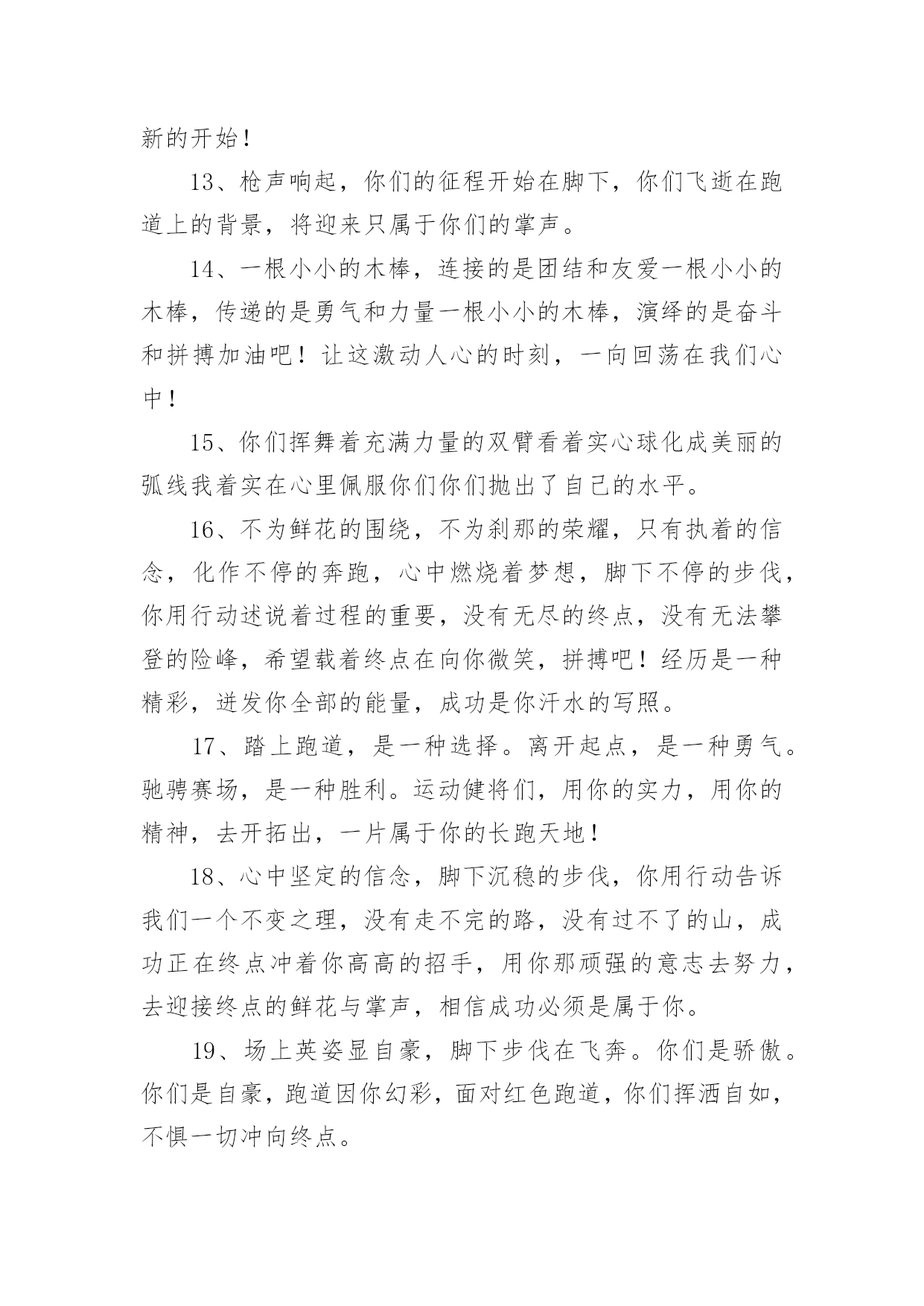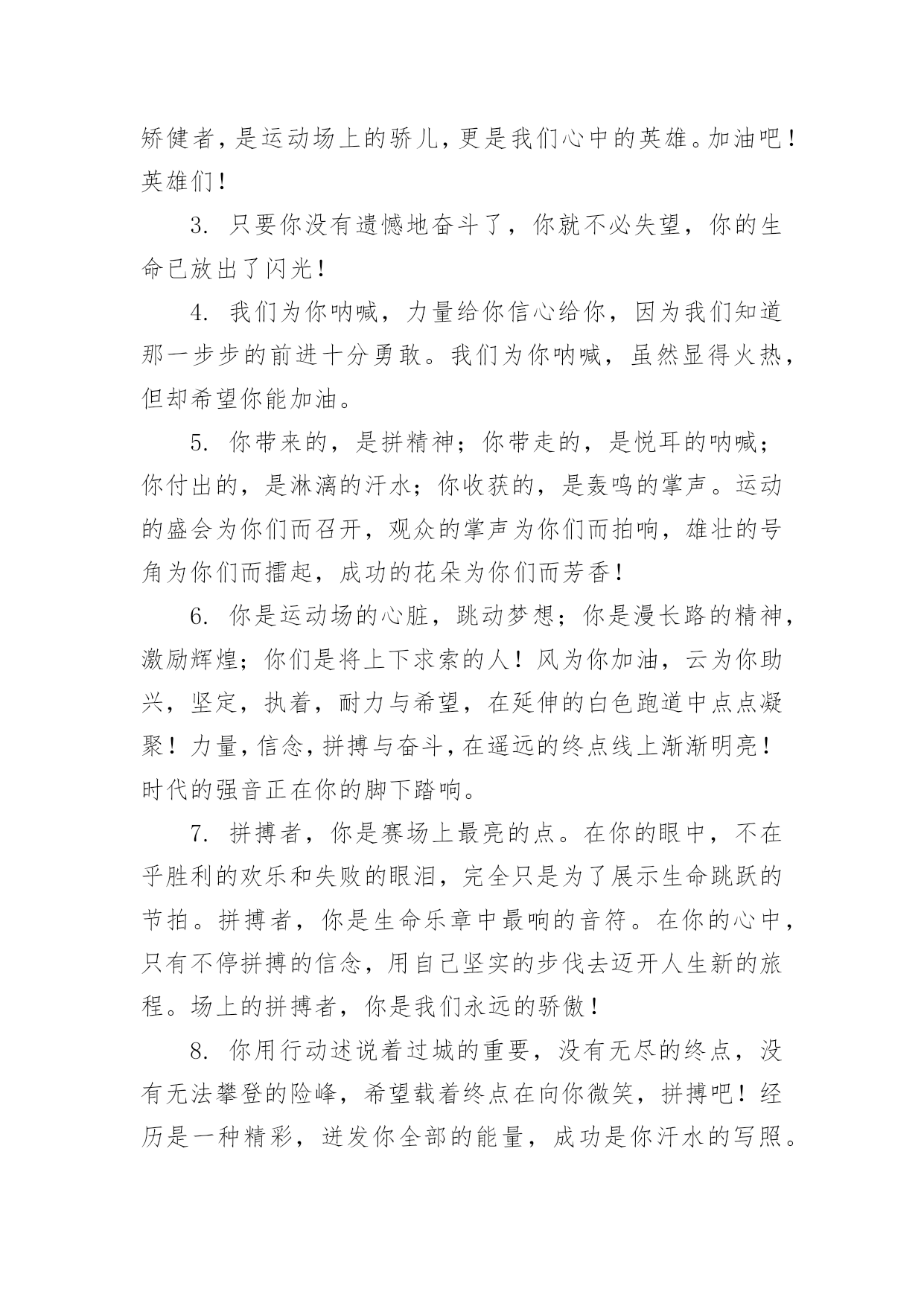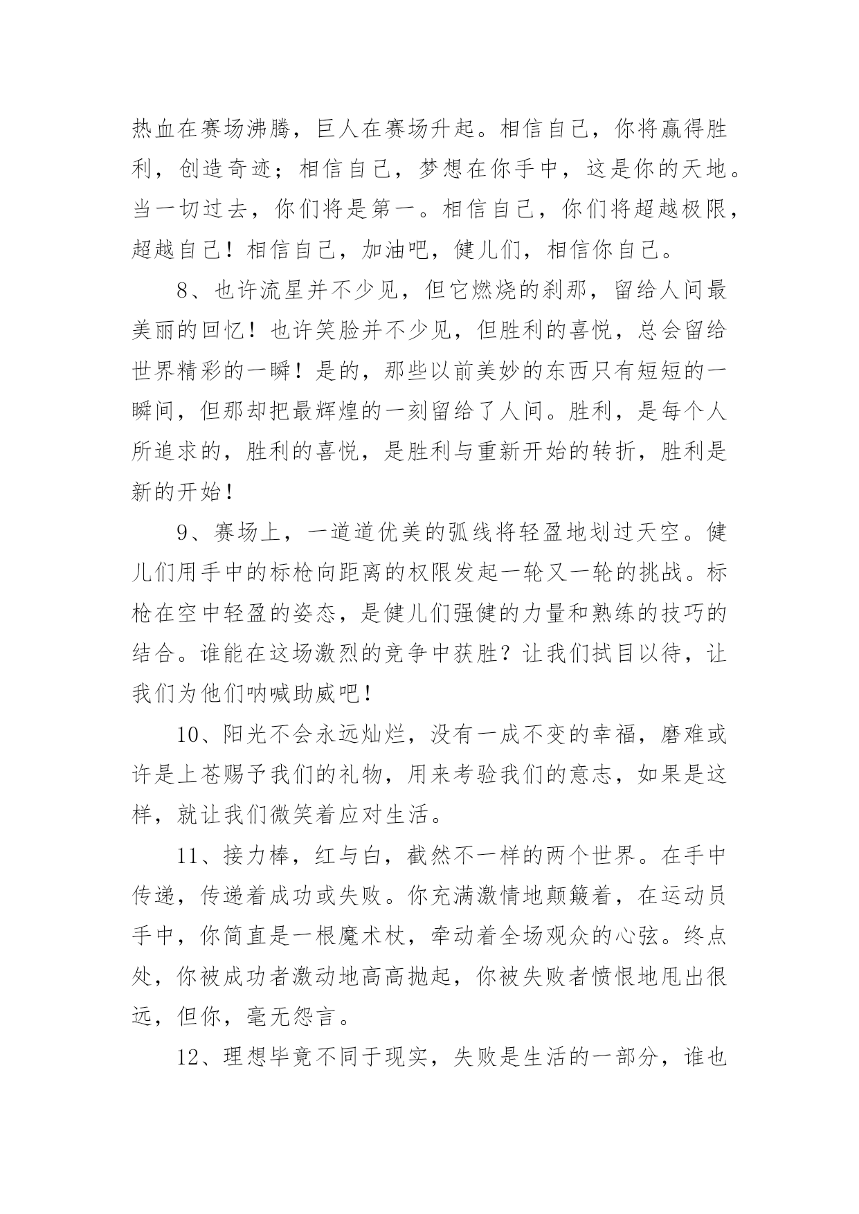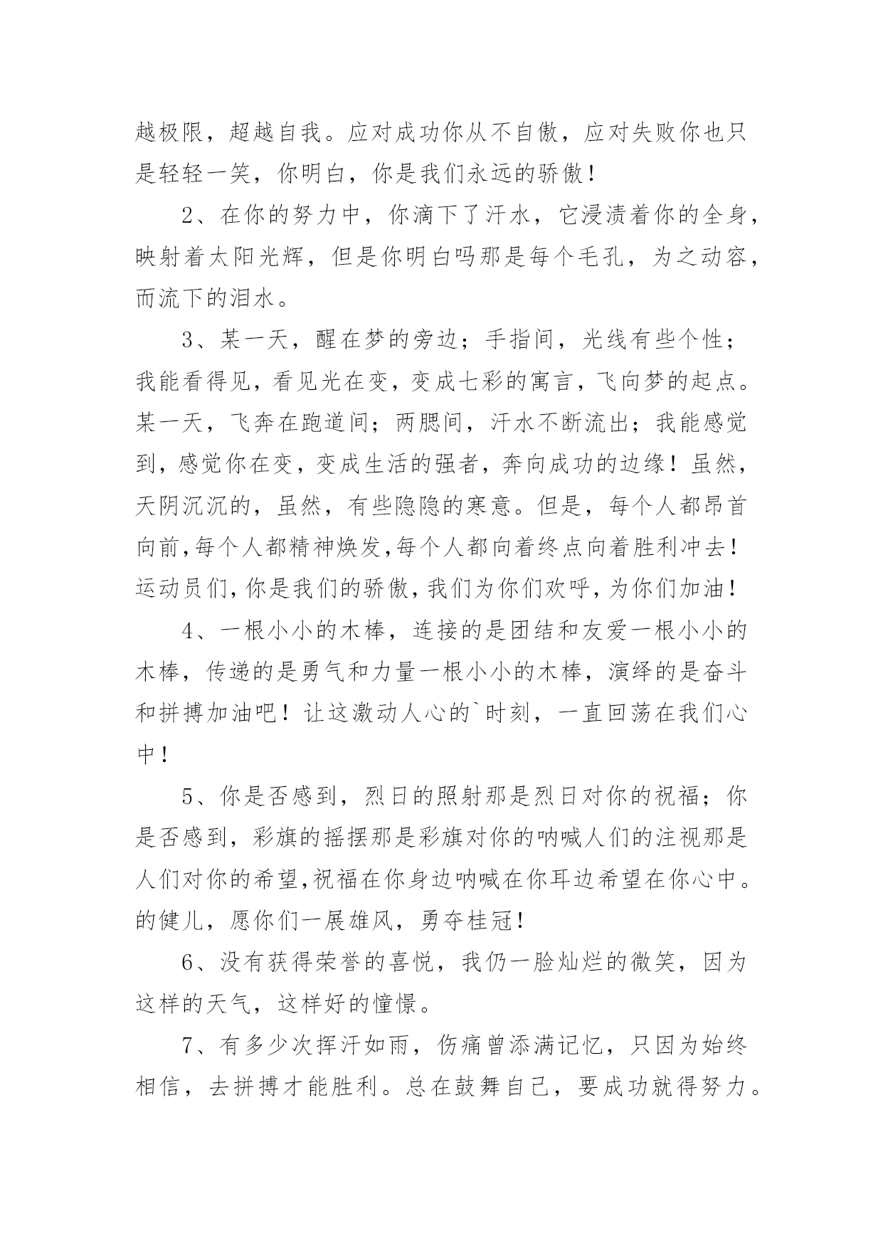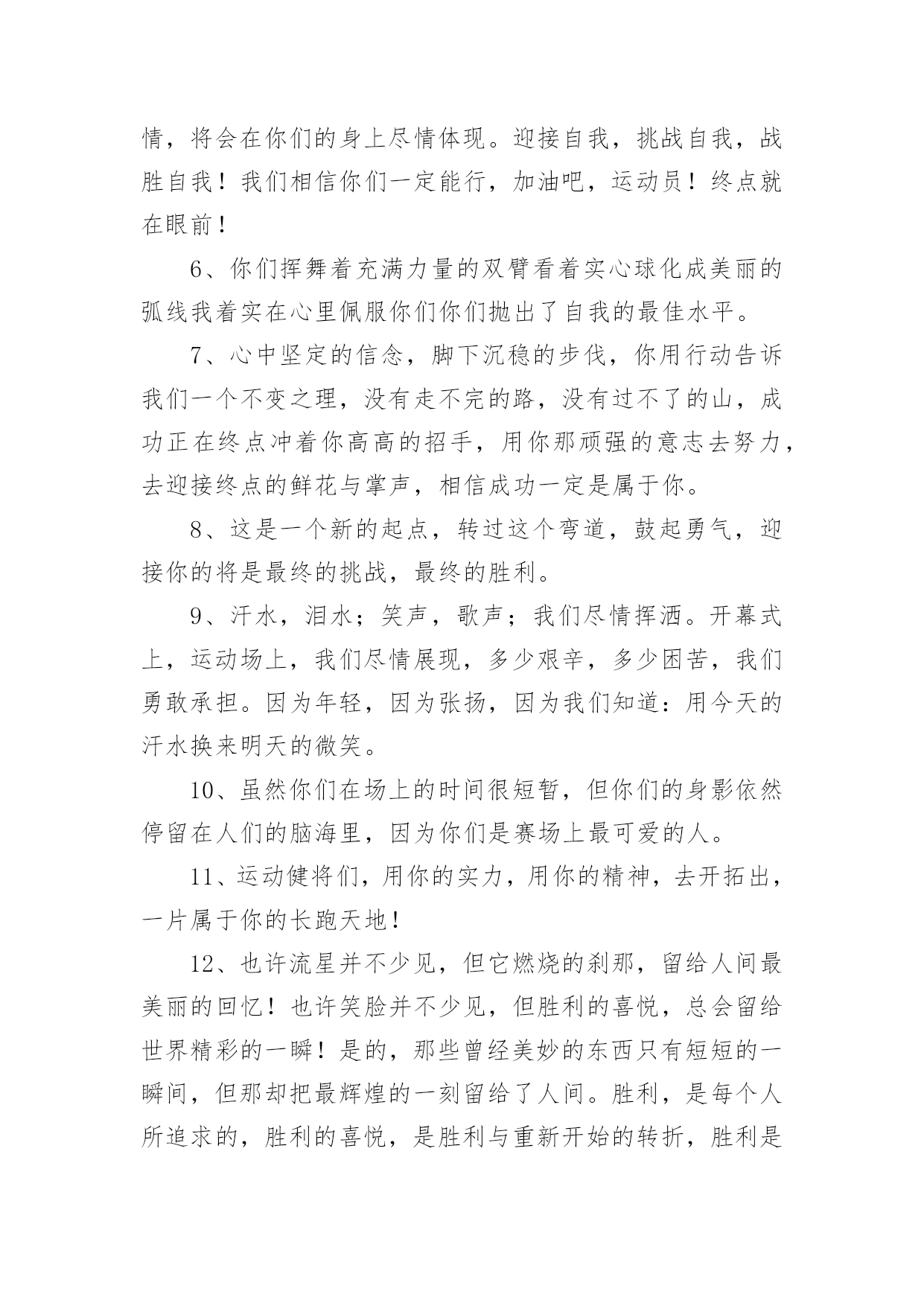 运动会加油稿(推荐)运动会加油稿在快速变化和不断变革的今天,需要使用加油稿的场合越来越多,加油稿是鼓励激励对方的文稿。你写加油稿时总是无从下笔?下面是小编为大家收集的运动会加油稿,欢迎阅读与收藏。运动会加油稿1理想毕竟不同于现实,失败是生活的一部分,谁也无法选择,无法拒绝。人生要自己去拼搏,去奋斗,在风雨中百折不挠,勇往前进,流泪不是失落,徘徊不是迷惑。加油吧,运动健儿们!不为掌声的诠释,不为刻意的征服,只有辛勤的汗水化作追求的脚步,心中坚定的信念,脚下沉稳的步伐,你用行动诉说着一个不变的`真理,没有比脚更长的路,没有比人更高的山,希望在终点向你招手,努力吧!运动会加油稿21.真心祝愿机会是什么?是不可错过的刹那间。呐喊是什么?是为那刹那间的真心祝愿。加油加油你肯定听到了那一声声呐喊你肯定看到了那双双期待的眼睛你肯定感受到了那发自内心的祝愿2.一根小小的木棒,连接的是团结和友爱一根小小的木棒,传递的是勇气和力量一根小小的木棒,演绎的是奋斗和拼搏加油吧!让这激动人心的时刻,一直回荡在我们心中!3.你的汗水洒在跑道,浇灌着成功的花朵开放。你的.欢笑飞扬在赛场,为班争光数你最棒。跑吧,追吧在这广阔的赛场上,你似骏马似离铉的箭。跑吧,追吧你比虎猛比豹强4.生活中,我们每天都在尝试尝试中,我们走向成功品味失败,走过心灵的阴雨晴空运动员们,不要放弃尝试无论失败与否重的是你勇于参与的精神,付出的背后是胜利无论是否成功,我们永远赞美你,你们永远是我们的骄傲,5.致失败者倒下的时候,生命又怎能屹立!歪歪斜斜的身影,又怎耐的住风雨的洗礼。你若有一个不屈的灵魂,脚下才会有一方坚实的土地。昨天的失败已经过去,胜利不仅仅是一个美好的话题。6.米的跑道上,你正在飞驰,面对如此遥远的路途,你也许腿脚发麻,你也许有些茫然。但你可知道,在你身后,有同学们一双双期待的眼睛;在你身后,是你日日苦练的汗水。鼓起勇气,奋勇向前吧!为了集体的荣誉,为了祖国的明天!运动会加油稿31、数不请你跨出了多少坚实的步履,数不请你留下了多少汗滴。只有那悦耳的加油声,在你耳边环绕,激励你超越极限,超越自我。应对成功你从不自傲,应对失败你也只是轻轻一笑,你明白,你是我们永远的骄傲!2、在你的努力中,你滴下了汗水,它浸渍着你的全身,映射着太阳光辉,但是你明白吗那是每个毛孔,为之动容,而流下的泪水。3、某一天,醒在梦的旁边;手指间,光线有些个性;我能看得见,看见光在变,变成七彩的寓言,飞向梦的起点。某一天,飞奔在跑道间;两腮间,汗水不断流出;我能感觉到,感觉你在变,变成生活的强者,奔向成功的边缘!虽然,天阴沉沉的,虽然,有些隐隐的寒意。但是,每个人都昂首向前,每个人都精神焕发,每个人都向着终点向着胜利冲去!运动员们,你是我们的骄傲,我们为你们欢呼,为你们加油!4、一根小小的木棒,连接的是团结和友爱一根小小的木棒,传递的是勇气和力量一根小小的木棒,演绎的是奋斗和拼搏加油吧!让这激动人心的`时刻,一直回荡在我们心中!5、你是否感到,烈日的照射那是烈日对你的祝福;你是否感到,彩旗的摇摆那是彩旗对你的呐喊人们的注视那是人们对你的希望,祝福在你身边呐喊在你耳边希望在你心中。的健儿,愿你们一展雄风,勇夺桂冠!6、没有获得荣誉的喜悦,我仍一脸灿烂的微笑,因为这样的天气,这样好的憧憬。7、有多少次挥汗如雨,伤痛曾添满记忆,只因为始终相信,去拼搏才能胜利。总在鼓舞自己,要成功就得努力。热血在赛场沸腾,巨人在赛场升起。相信自己,你将赢得胜利,创造奇迹;相信自己,梦想在你手中,这是你的天地。当一切过去,你们将是第一。相信自己,你们将超越极限,超越自己!相信自己,加油吧,健儿们,相信你自己。8、也许流星并不少见,但它燃烧的刹那,留给人间最美丽的回忆!也许笑脸并不少见,但胜利的喜悦,总会留给世界精彩的一瞬!是的,那些以前美妙的东西只有短短的一瞬间,但那却把最辉煌的一刻留给了人间。胜利,是每个人所追求的,胜利的喜悦,是胜利与重新开始的转折,胜利是新的开始!9、赛场上,一道道优美的弧线将轻盈地划过天空。健儿们用手中的标枪向距离的权限发起一轮又一轮的挑战。标枪在空中轻盈的姿态,是健儿们强健的力量和熟练的技巧的结合。谁能在这场激烈的竞争中获胜?让我们拭目以待,让我们为他们呐喊助威吧!10、阳光不会永远灿烂,没有一成不变的幸福,磨难或许是上苍赐予我们的礼物,用来考验我们的意志,如果是这样,就让我们微笑着应对生活。11、接力棒,红与白,截然不一样的两个世界。在手中传递,传递着成功或失败。你充满激情地颠簸着,在运动员手中,你简直是一根魔术杖,牵动着全场观众的心弦。终点处,你被成功者激动地高高抛起,你被失败者愤恨地甩出很远,但你,毫无怨言。12、理想毕竟不同于现实,失败是生活的一部分,谁也无法选择,无法拒绝。人生要自己去拼搏,