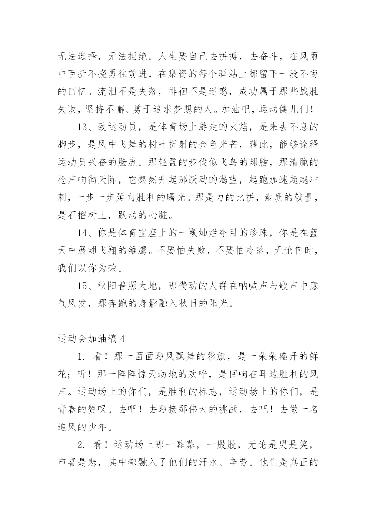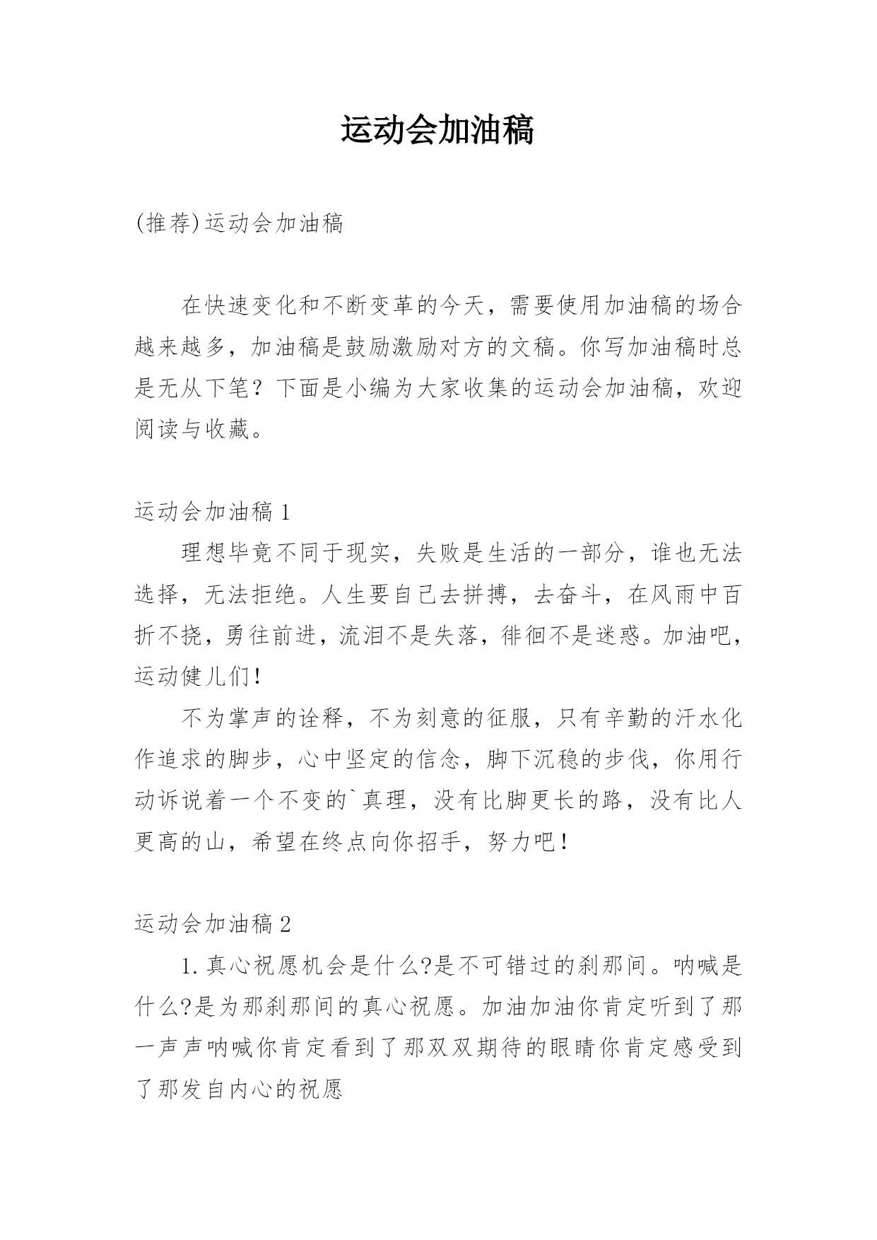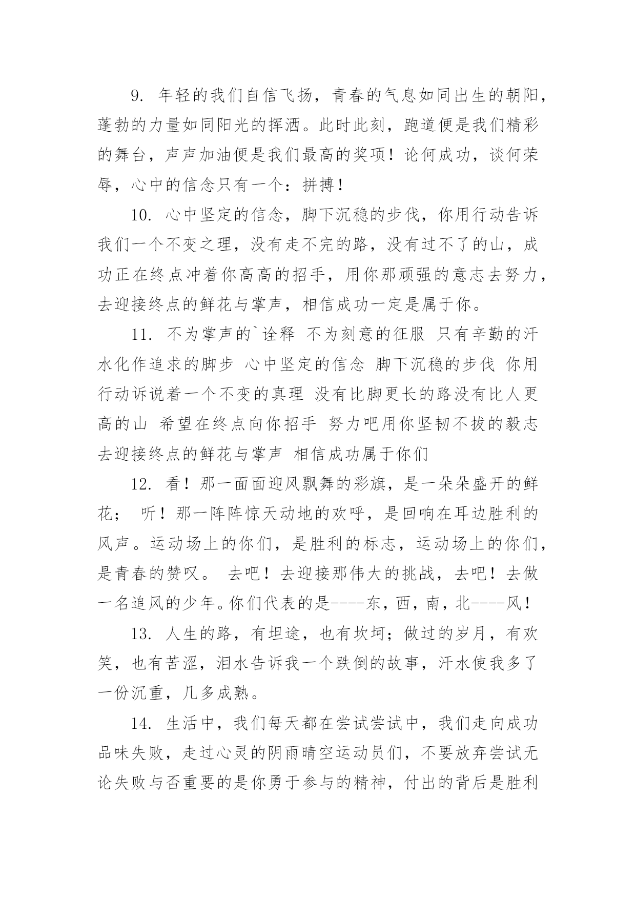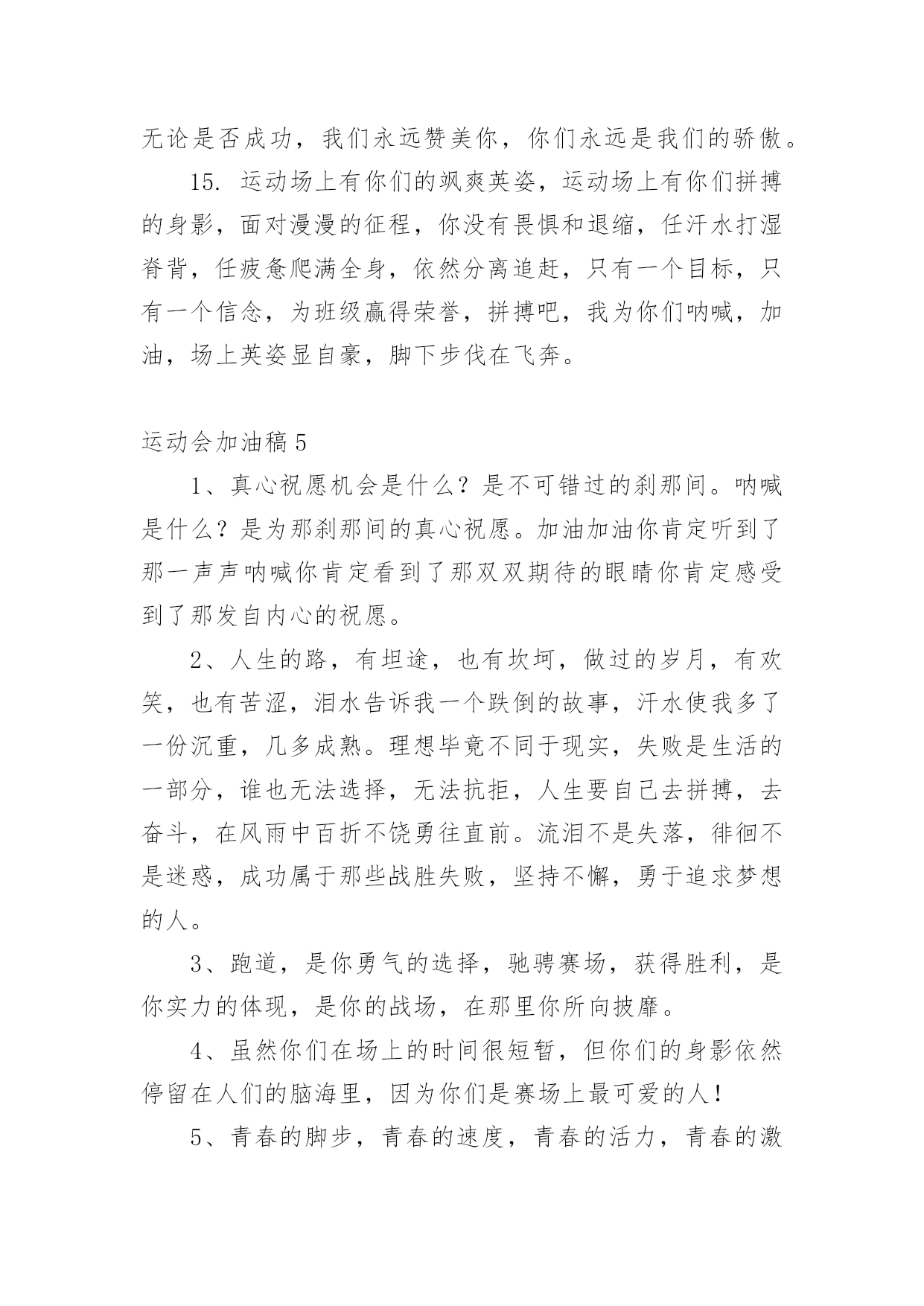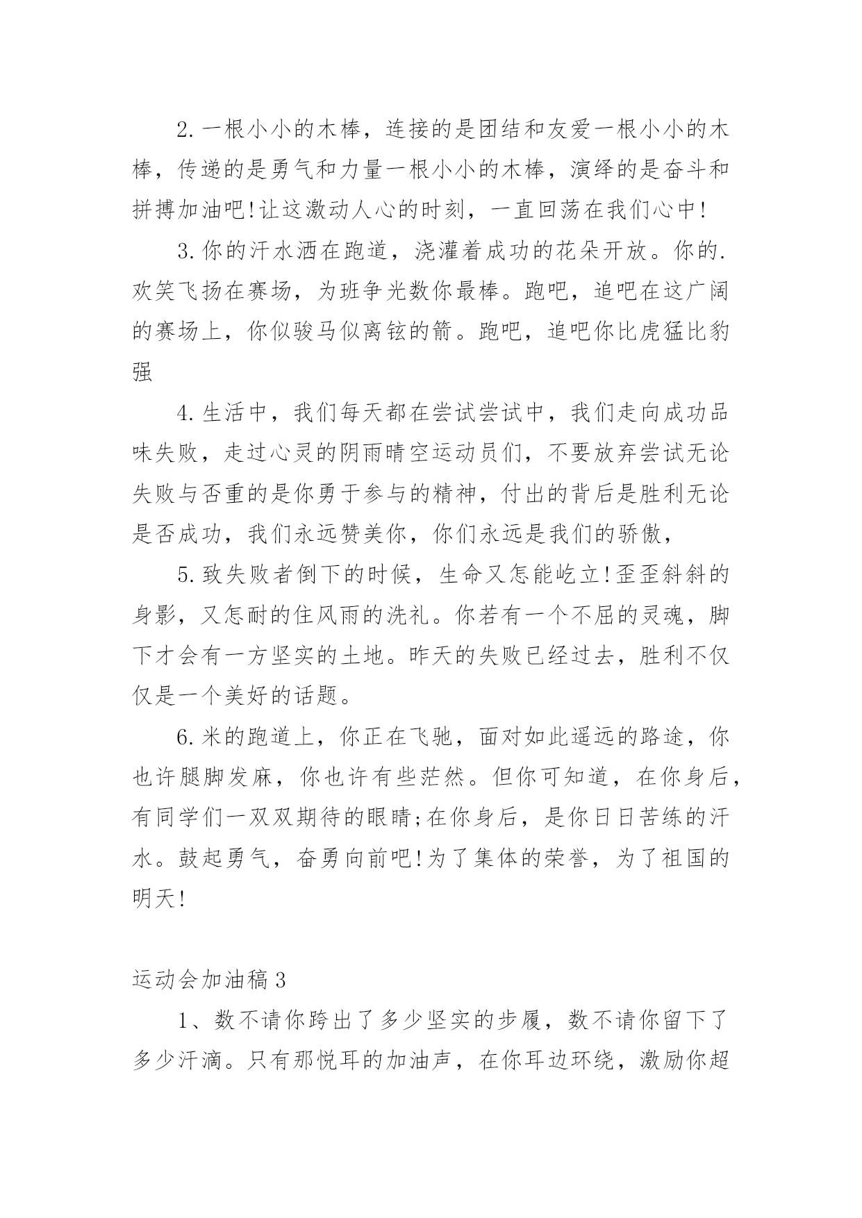 运动会加油稿(推荐)运动会加油稿在快速变化和不断变革的今天,需要使用加油稿的场合越来越多,加油稿是鼓励激励对方的文稿。你写加油稿时总是无从下笔?下面是小编为大家收集的运动会加油稿,欢迎阅读与收藏。运动会加油稿1理想毕竟不同于现实,失败是生活的一部分,谁也无法选择,无法拒绝。人生要自己去拼搏,去奋斗,在风雨中百折不挠,勇往前进,流泪不是失落,徘徊不是迷惑。加油吧,运动健儿们!不为掌声的诠释,不为刻意的征服,只有辛勤的汗水化作追求的脚步,心中坚定的信念,脚下沉稳的步伐,你用行动诉说着一个不变的`真理,没有比脚更长的路,没有比人更高的山,希望在终点向你招手,努力吧!运动会加油稿21.真心祝愿机会是什么?是不可错过的刹那间。呐喊是什么?是为那刹那间的真心祝愿。加油加油你肯定听到了那一声声呐喊你肯定看到了那双双期待的眼睛你肯定感受到了那发自内心的祝愿2.一根小小的木棒,连接的是团结和友爱一根小小的木棒,传递的是勇气和力量一根小小的木棒,演绎的是奋斗和拼搏加油吧!让这激动人心的时刻,一直回荡在我们心中!3.你的汗水洒在跑道,浇灌着成功的花朵开放。你的.欢笑飞扬在赛场,为班争光数你最棒。跑吧,追吧在这广阔的赛场上,你似骏马似离铉的箭。跑吧,追吧你比虎猛比豹强4.生活中,我们每天都在尝试尝试中,我们走向成功品味失败,走过心灵的阴雨晴空运动员们,不要放弃尝试无论失败与否重的是你勇于参与的精神,付出的背后是胜利无论是否成功,我们永远赞美你,你们永远是我们的骄傲,5.致失败者倒下的时候,生命又怎能屹立!歪歪斜斜的身影,又怎耐的住风雨的洗礼。你若有一个不屈的灵魂,脚下才会有一方坚实的土地。昨天的失败已经过去,胜利不仅仅是一个美好的话题。6.米的跑道上,你正在飞驰,面对如此遥远的路途,你也许腿脚发麻,你也许有些茫然。但你可知道,在你身后,有同学们一双双期待的眼睛;在你身后,是你日日苦练的汗水。鼓起勇气,奋勇向前吧!为了集体的荣誉,为了祖国的明天!运动会加油稿31、数不请你跨出了多少坚实的步履,数不请你留下了多少汗滴。只有那悦耳的加油声,在你耳边环绕,激励你超越极限,超越自我。应对成功你从不自傲,应对失败你也只是轻轻一笑,你明白,你是我们永远的骄傲!2、在你的努力中,你滴下了汗水,它浸渍着你的全身,映射着太阳光辉,但是你明白吗那是每个毛孔,为之动容,而流下的泪水。3、某一天,醒在梦的旁边;手指间,光线有些个性;我能看得见,看见光在变,变成七彩的寓言,飞向梦的起点。某一天,飞奔在跑道间;两腮间,汗水不断流出;我能感觉到,感觉你在变,变成生活的强者,奔向成功的边缘!虽然,天阴沉沉的,虽然,有些隐隐的寒意。但是,每个人都昂首向前,每个人都精神焕发,每个人都向着终点向着胜利冲去!运动员们,你是我们的骄傲,我们为你们欢呼,为你们加油!4、一根小小的木棒,连接的是团结和友爱一根小小的木棒,传递的是勇气和力量一根小小的木棒,演绎的是奋斗和拼搏加油吧!让这激动人心的`时刻,一直回荡在我们心中!5、你是否感到,烈日的照射那是烈日对你的祝福;你是否感到,彩旗的摇摆那是彩旗对你的呐喊人们的注视那是人们对你的希望,祝福在你身边呐喊在你耳边希望在你心中。的健儿,愿你们一展雄风,勇夺桂冠!6、没有获得荣誉的喜悦,我仍一脸灿烂的微笑,因为这样的天气,这样好的憧憬。7、有多少次挥汗如雨,伤痛曾添满记忆,只因为始终相信,去拼搏才能胜利。总在鼓舞自己,要成功就得努力。热血在赛场沸腾,巨人在赛场升起。相信自己,你将赢得胜利,创造奇迹;相信自己,梦想在你手中,这是你的天地。当一切过去,你们将是第一。相信自己,你们将超越极限,超越自己!相信自己,加油吧,健儿们,相信你自己。8、也许流星并不少见,但它燃烧的刹那,留给人间最美丽的回忆!也许笑脸并不少见,但胜利的喜悦,总会留给世界精彩的一瞬!是的,那些以前美妙的东西只有短短的一瞬间,但那却把最辉煌的一刻留给了人间。胜利,是每个人所追求的,胜利的喜悦,是胜利与重新开始的转折,胜利是新的开始!9、赛场上,一道道优美的弧线将轻盈地划过天空。健儿们用手中的标枪向距离的权限发起一轮又一轮的挑战。标枪在空中轻盈的姿态,是健儿们强健的力量和熟练的技巧的结合。谁能在这场激烈的竞争中获胜?让我们拭目以待,让我们为他们呐喊助威吧!10、阳光不会永远灿烂,没有一成不变的幸福,磨难或许是上苍赐予我们的礼物,用来考验我们的意志,如果是这样,就让我们微笑着应对生活。11、接力棒,红与白,截然不一样的两个世界。在手中传递,传递着成功或失败。你充满激情地颠簸着,在运动员手中,你简直是一根魔术杖,牵动着全场观众的心弦。终点处,你被成功者激动地高高抛起,你被失败者愤恨地甩出很远,但你,毫无怨言。12、理想毕竟不同于现实,失败是生活的一部分,谁也无法选择,无法拒绝。人生要自己去拼搏,
