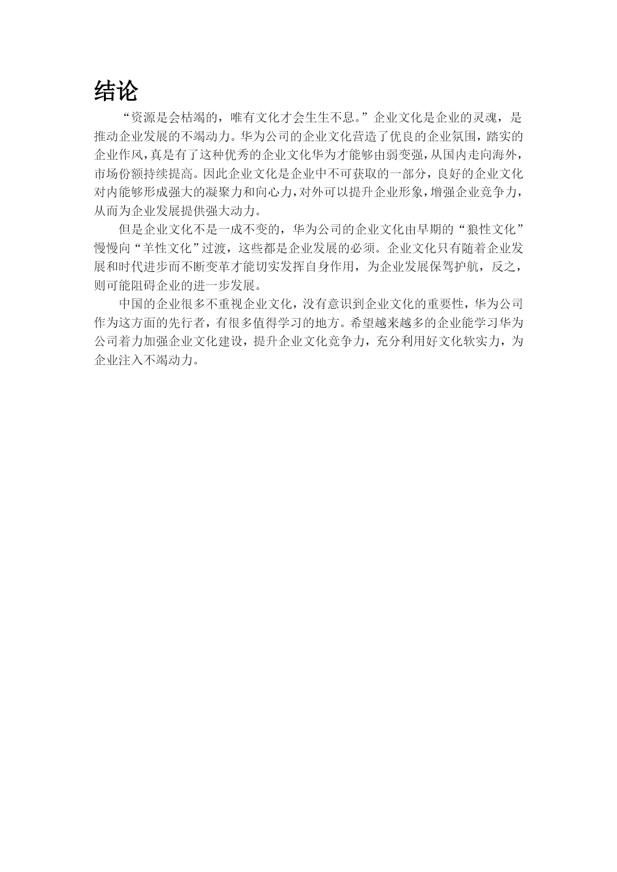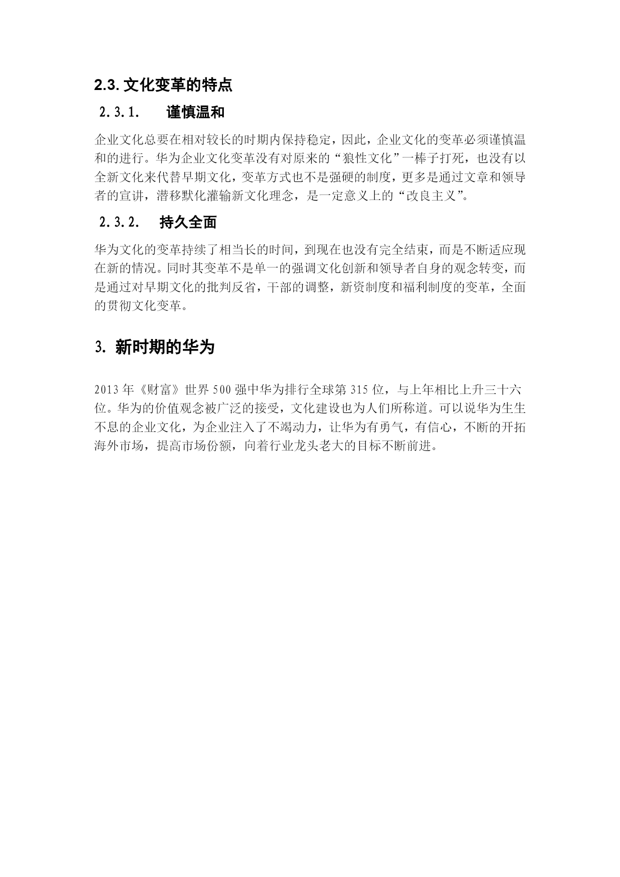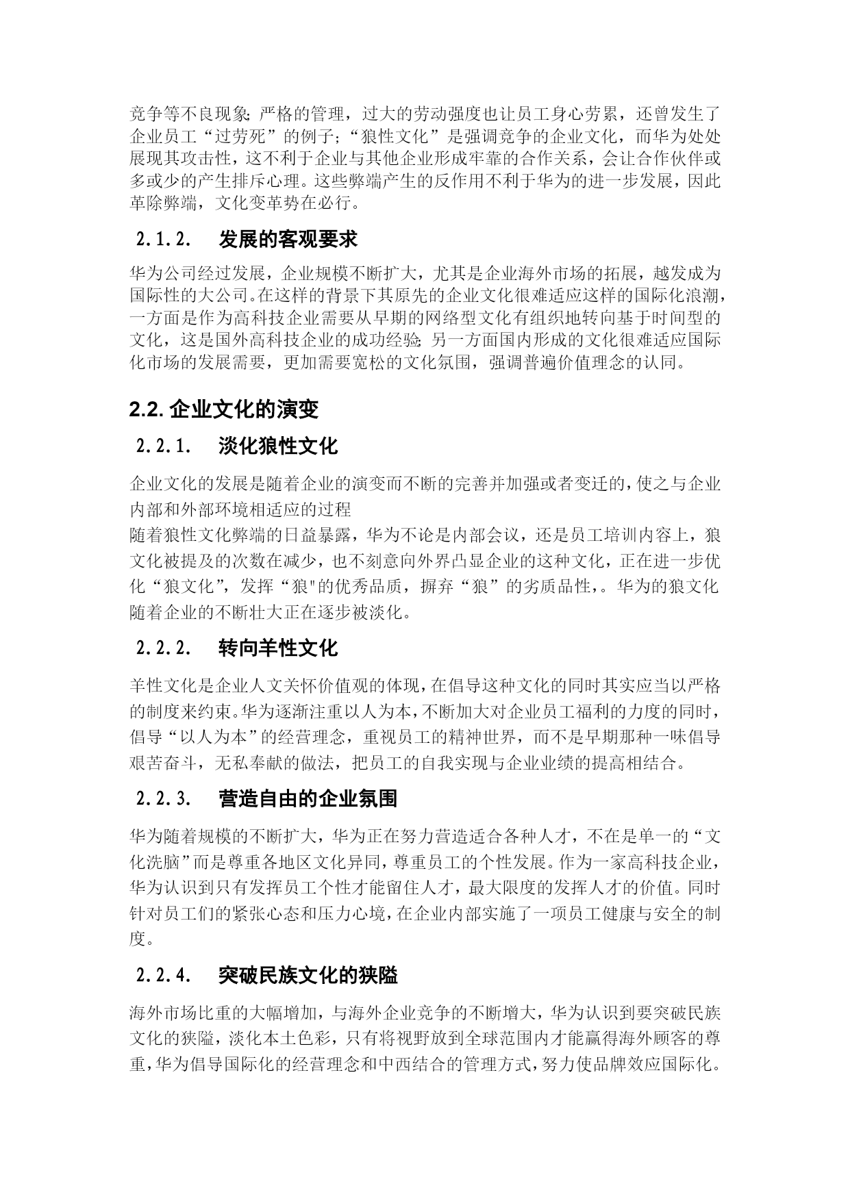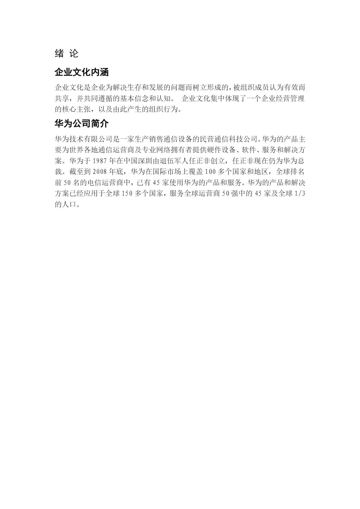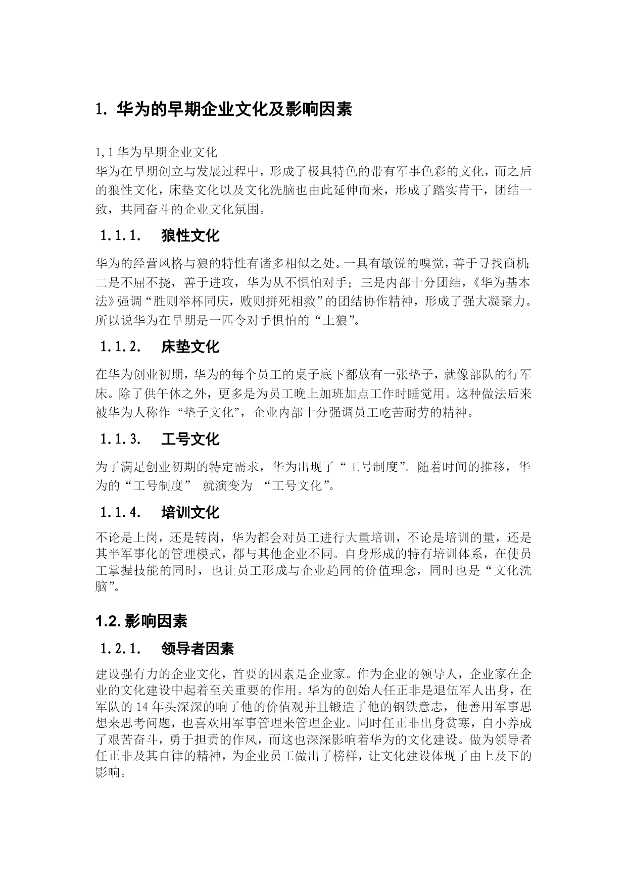 本科生课程论文论文题目:华为的企业文化初探课程名称:现代企业管理任课教师:翟绪军学生姓名:金华送学生学号:20124101105专业(领域):会计学摘要现代企业管理研究发现:凡是成功的企业都有优秀的文化,反之,凡是失败的企业都存在着不良的文化。企业的文化建设对企业的发展起着越来越重要的作用。华为作为中国的优秀企业,在其创立与发展的过程中形成了独特的企业文化,也推动着企业的巨大进步。随着企业的不断发展,华为的企业文化也以温和的方式发生着变革。本文通过对华为企业文化的分析,探讨企业文化的重要性以及变革的必要性。关键词:企业文化,华为,狼文化,演变绪论企业文化内涵企业文化是企业为解决生存和发展的问题而树立形成的,被组织成员认为有效而共享,并共同遵循的基本信念和认知。企业文化集中体现了一个企业经营管理的核心主张,以及由此产生的组织行为。华为公司简介HYPERLINK"http://baike.baidu.com/view/355733.htm"华为技术有限公司是一家HYPERLINK"http://baike.baidu.com/view/172873.htm"生产销售HYPERLINK"http://baike.baidu.com/view/15007.htm"通信设备的HYPERLINK"http://baike.baidu.com/view/3128895.htm"民营通信科技公司。华为的产品主要为世界各地通信HYPERLINK"http://baike.baidu.com/view/969221.htm"运营商及专业网络拥有者提供HYPERLINK"http://baike.baidu.com/view/25278.htm"硬件设备、HYPERLINK"http://baike.baidu.com/view/37.htm"软件、服务和HYPERLINK"http://baike.baidu.com/view/1038216.htm"解决方案。华为于1987年在中国HYPERLINK"http://baike.baidu.com/view/3329.htm"深圳由退伍军人任正非创立,任正非现在仍为华为总裁。截至到2008年底,华为在国际市场上覆盖100多个国家和地区,全球排名前50名的HYPERLINK"http://baike.baidu.com/view/1379352.htm"电信运营商中,已有45家使用华为的产品和服务。华为的产品和解决HYPERLINK"http://baike.baidu.com/view/556358.htm"方案已经应用于全球150多个HYPERLINK"http://baike.baidu.com/view/8426.htm"国家,服务全球HYPERLINK"http://baike.baidu.com/view/969221.htm"运营商50强中的45家及全球1/3的人口。华为的早期企业文化及影响因素1,1华为早期企业文化华为在早期创立与发展过程中,形成了极具特色的带有军事色彩的文化,而之后的狼性文化,床垫文化以及文化洗脑也由此延伸而来,形成了踏实肯干,团结一致,共同奋斗的企业文化氛围。狼HYPERLINK"http://wiki.mbalib.com/wiki/%C0%C7%D0%D4%CE%C4%BB%AF"性文化华为的经营风格与狼的特性有诸多相似之处。一具有敏锐的嗅觉,善于寻找商机;二是不屈不挠,善于进攻,华为从不惧怕对手;三是内部十分团结,《华为基本法》强调“胜则举杯同庆,败则拼死相救”的团结协作精神,形成了强大凝聚力。所以说华为在早期是一匹令对手惧怕的“土狼”。床垫文化在华为创业初期,华为的每个员工的桌子底下都放有一张垫子,就像部队的行军床。除了供午休之外,更多是为员工晚上加班加点工作时睡觉用。这种做法后来被华为人称作“垫子文化”,企业内部十分强调员工吃苦耐劳的精神。工号文化为了满足创业初期的特定需求,华为出现了“工号制度”。随着时间的推移,华为的“工号制度”就演变为“工号文化”。培训文化不论是上岗,还是转岗,华为都会对员工进行大量培训,不论是培训的量,还是其半军事化的管理模式,都与其他企业不同。自身形成的特有培训体系,在使员工掌握技能的同时,也让员工形成与企业趋同的价值理念,同时也是“文化洗脑”。影响因素领导者因素建设强有力的企业文化,首要的因素是企业家。作为企业的领导人,企业家在企业的文化建设中起着至关重要的作用。华为的创始人任正非是退伍军人出身,在军队的14年头深深的响了他的价值观并且锻造了他的