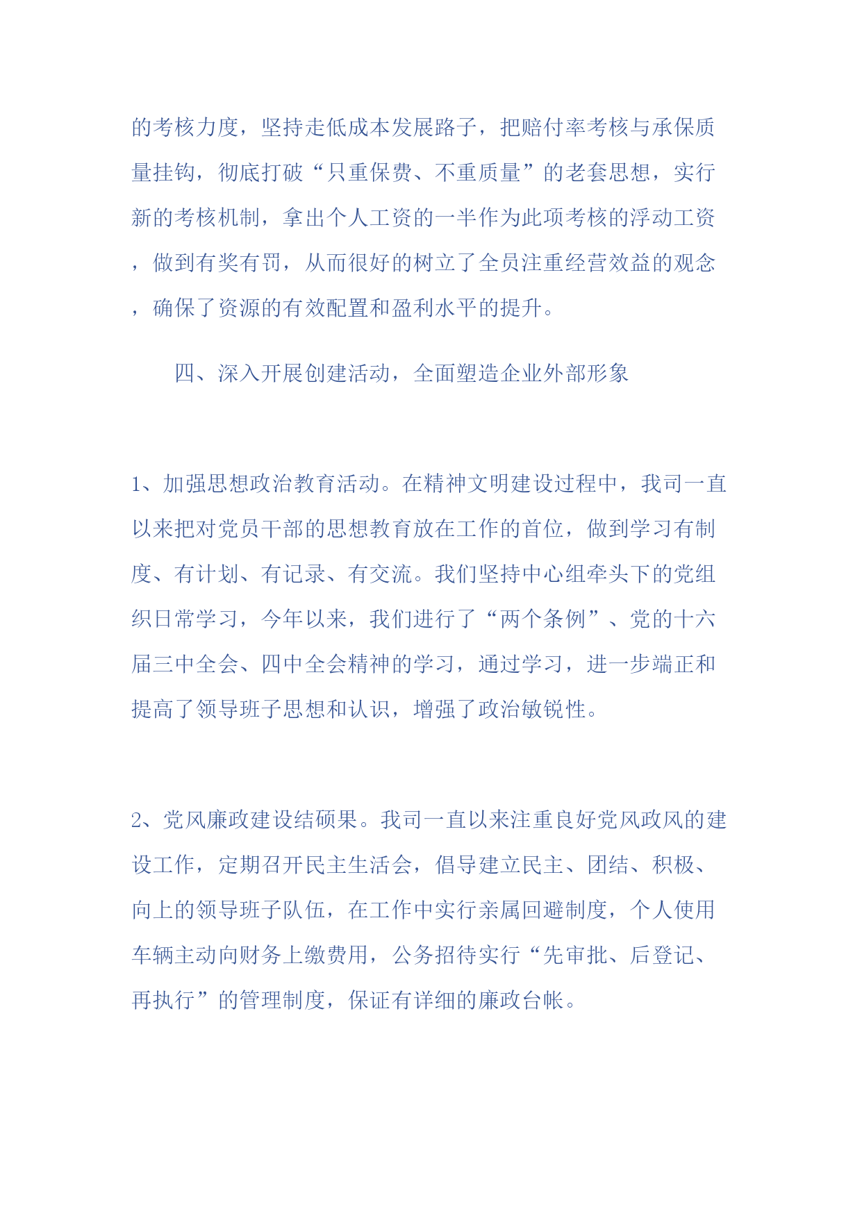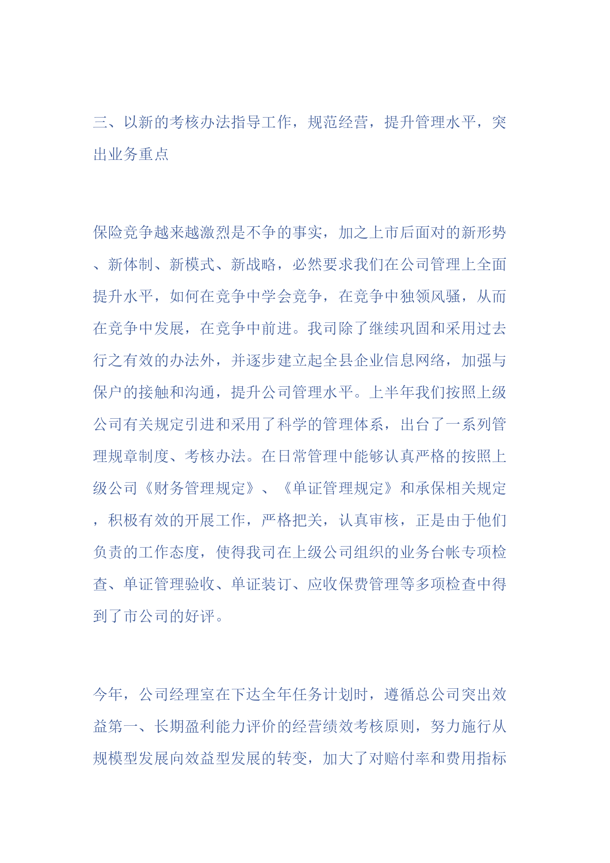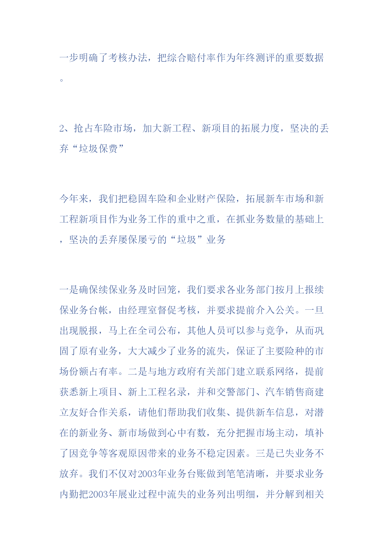 保险工作总结2004年是人保财险股份制改革上市后的第一个年度。这一年,是我司面临压力攻艰克难的一年,是面对新变化、落实新机制、执行新规定的第一年。我司在市分公司党委、总经理室的正确领导下,在全体员工的奋力拼搏下,取得了一定的经营业绩。2004年,我司实收毛保费****万元,同比增长*%,已赚净保费***万元,净利润***万元,赔付率为**%。较好地完成了上级公司下达的任务指标。一、围绕目标,落实计划,紧抓业务工作1、计划落实早、措施实2004年初,我司经理室就针对**地区保险市场变化及2003年全年保费收入情况进行综合分析,将上级公司下达我司的各项指标进行层层分解,把计划分解成月计划,月月盘点、月月落实,有效的保证了对计划落实情况及时的进行监控和调整。在制定全年任务时充分考虑险种结构优化和业务承保质量,进一步明确了考核办法,把综合赔付率作为年终测评的重要数据。2、抢占车险市场,加大新工程、新项目的拓展力度,坚决的丢弃“垃圾保费”今年来,我们把稳固车险和企业财产保险,拓展新车市场和新工程新项目作为业务工作的重中之重,在抓业务数量的基础上,坚决的丢弃屡保屡亏的“垃圾”业务一是确保续保业务及时回笼,我们要求各业务部门按月上报续保业务台帐,由经理室督促考核,并要求提前介入公关。一旦出现脱报,马上在全司公布,其他人员可以参与竞争,从而巩固了原有业务,大大减少了业务的流失,保证了主要险种的市场份额占有率。二是与地方政府有关部门建立联系网络,提前获悉新上项目、新上工程名录,并和交警部门、汽车销售商建立友好合作关系,请他们帮助我们收集、提供新车信息,对潜在的新业务、新市场做到心中有数,充分把握市场主动,填补了因竞争等客观原因带来的业务不稳定因素。三是已失业务不放弃。我们不仅对2003年业务台账做到笔笔清晰,并要求业务内勤把2003年展业过程中流失的业务列出明细,并分解到相关部门,要求加大公关力度,找出脱保原因,确属停产企业、转卖报废车辆的,由经办人提供确切证明;属竞争流失的,我们决不消极退出,而是主动进攻,上门听取意见和建议,改善服务手段,逐个突破,全面争取回流。四是大小齐抓,能保则保。因为企业改制、转产、资金等因素对企业财产保险形成了较大的冲击,加之竞争等因素,使的展业难度和展业成本大大增加。针对这些情况,我们充分动员,统一思想,上下形成合力,迎难而上。做到责任到人,对保费在5万元以上的实行分管经理介入,共同公关。3、在竞争中求生存,在竞争中促发展。**地区现有10家(中国财保、中国人寿、太平洋产险、太平洋寿险、中华产险、平安产险、平安寿险、天安产险、华邦代理、汇丰代理)经营财产保险业务和短期健康险业务的保险公司、营销部、代理公司,另已发现1家公司(大地产险)在我县争夺业务,而**地区人口少,企业规模小,我司面对外部竞争所带来的业务压力,保持沉着冷静,客观面对现实情况寻求对策,与竞争对手们展开了一场品牌战、服务战:一是做好地方政府主要领导工作。公司经理室多次向县委、县政府主要领导汇报工作,突出汇报我司是如何加大对**地方经济建设支持力度,是如何围绕地方政府中心开展工作的,我司积极参与了全民创业调研活动,与县领导一道走访个体、私营经济企业,不仅使县委、县政府对我司热心参与地方政府工作表示满意,还对我司正确调整业务发展方向,向中小企业提供保险保障,主动服务于他们,给予肯定。真实的让县委、县政府感到人保财险公司是真心为地方政府服务的,是值得扶持、信赖和帮助的,从而对我司工作给予了很大地倾斜。二是深入老客户企业,在客户企业中聘请信息员、联络员,并从其他保险企业抢挖业务尖子加盟我司,赢得“回流”业务,使其他保险公司的工作处于被动状态。三是服务更加人性化、亲密化,公司经理室成员年初就对县属各大系统骨干企业实行划块包干,进行了多次回访,请他们对我司工作提出意见和建议,这一举措得到了企业的充分肯定,他们认为公司领导主动登门是人保财险的优质服务的充分体现,使客户对我司更加信任。四是要求所有中层干部走出办公室,对所有中小企业必须亲自上门拜访,对所有新保客户必须当面解释条款并承诺服务项目,与企业进行不断的联络,实行零距离接触,只要客户需要必须随叫随到,提供各方面服务。五是按照向社会服务承诺和行业禁令,严格内部管控,以理赔和承保两大服务部门为切入口,全面提高公司整体服务水平。4、以分散性业务为突破口,加大市场占有面根据**当前阶段的保源情况,年初,经理室经过仔细的分析研究,确定今年把摩托车保险、家庭财产保险、学生以及人身意外险作为今年零散性险种突击,首先与交警、城市执法部门联系,请他们帮我们代理摩托车保险业务;同时与县教委取得联系,班子成员多次与分管教育的副县长、教委主任协调,最终取得他们的信任,才使我们的学平险业务有所突破。5、开展劳