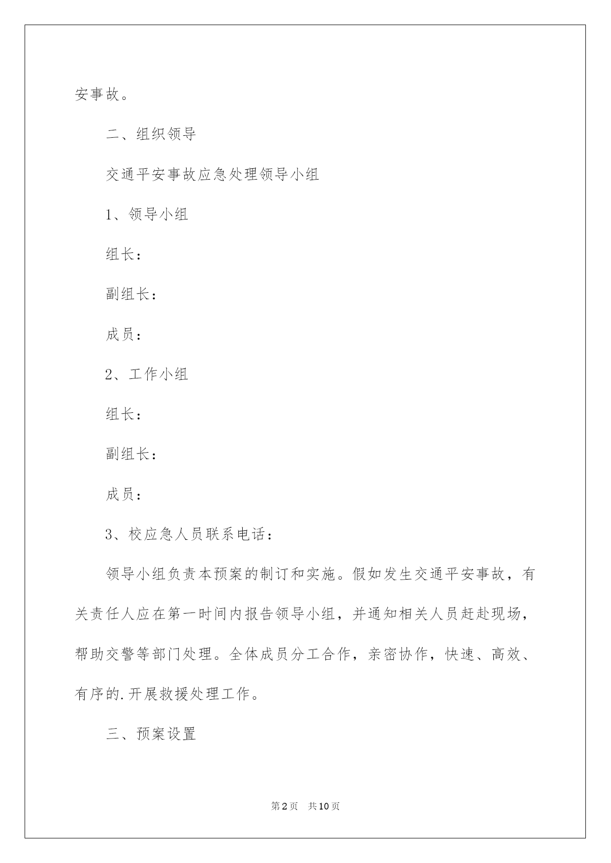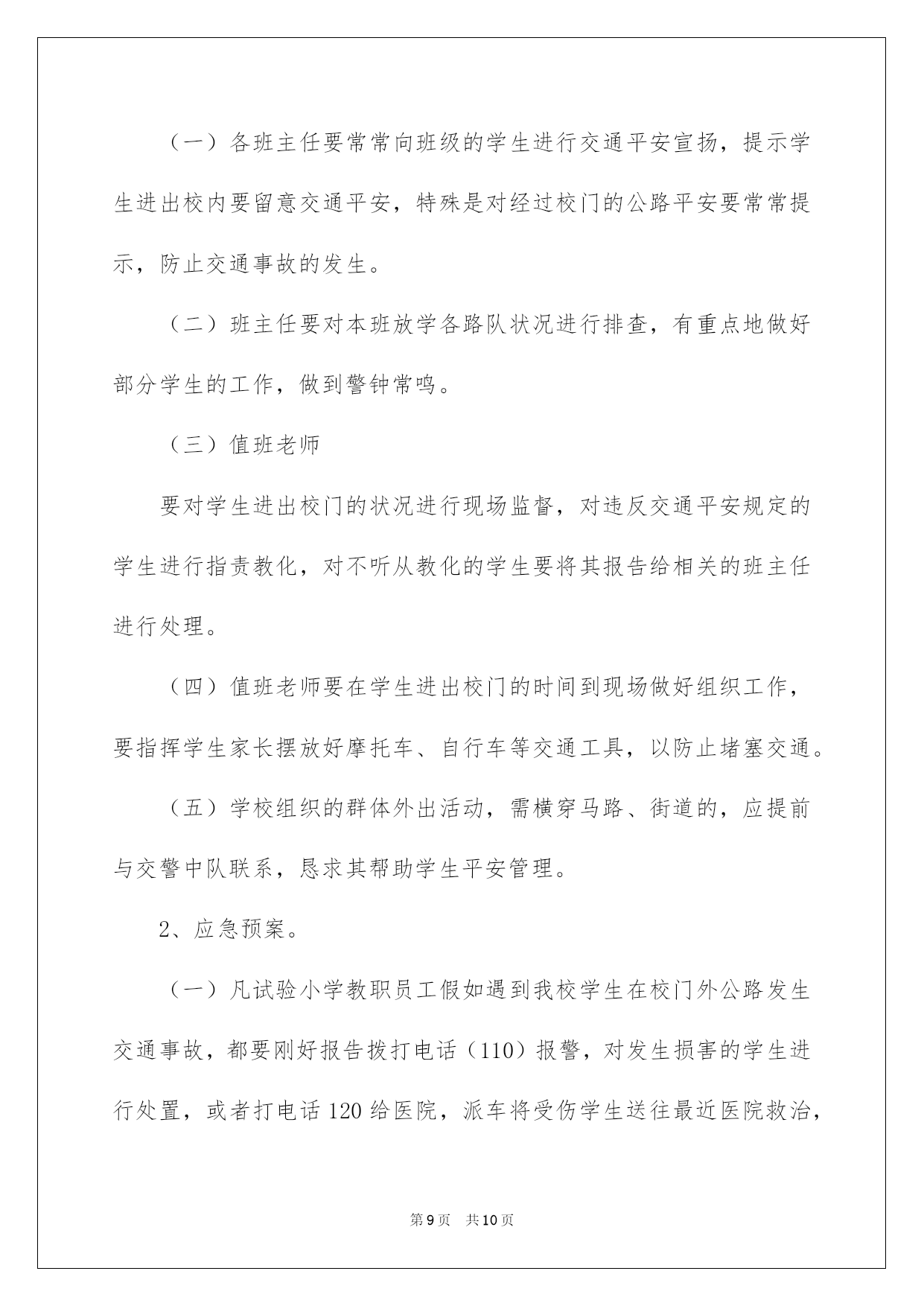 第PAGE\*Arabic\*MERGEFORMAT10页共NUMPAGES\*Arabic\*MERGEFORMAT10页第PAGE\*MERGEFORMAT10页共NUMPAGES\*MERGEFORMAT10页第PAGE\*MERGEFORMAT10页共NUMPAGES\*MERGEFORMAT10页第PAGE\*MERGEFORMAT10页共NUMPAGES\*MERGEFORMAT10页第PAGE\*MERGEFORMAT10页共NUMPAGES\*MERGEFORMAT10页第PAGE\*MERGEFORMAT10页共NUMPAGES\*MERGEFORMAT10页第PAGE\*MERGEFORMAT10页共NUMPAGES\*MERGEFORMAT10页第PAGE\*MERGEFORMAT10页共NUMPAGES\*MERGEFORMAT10页第PAGE\*MERGEFORMAT10页共NUMPAGES\*MERGEFORMAT10页第PAGE\*MERGEFORMAT10页共NUMPAGES\*MERGEFORMAT10页第PAGE\*MERGEFORMAT10页共NUMPAGES\*MERGEFORMAT10页2022学校交通安全应急预案学校交通平安应急预案在现实的学习、工作、生活中,难免会发生一些不在自己预料之中的事务,为了限制事故的发展势态,就有可能须要事先制定应急预案。那么应当如何编制应急预案呢?下面是我帮大家整理的学校交通平安应急预案,仅供参考,希望能够帮助到大家。学校交通平安应急预案1为预防和削减学校交通事故的发生,保障广阔师生的生命平安,切实做好学生的交通平安管理工作,确保事故发生后能高效、有序地组织事故抢救工作,最大限度地削减人员伤亡和财产损失,维护学校正常的教化教学秩序和稳定,明确平安事故处理的责任,确保学生人身平安不受损害,依据《中华人民共和国道路交通平安法》有关精神,特制定本预案。一、平安故事本预案所指平安事故,即由学生在乘车、行路途中或老师在上下班途中所发生的意外交通平安事故;有一人以上伤亡事故即为重大平安事故。二、组织领导交通平安事故应急处理领导小组1、领导小组组长:副组长:成员:2、工作小组组长:副组长:成员:3、校应急人员联系电话:领导小组负责本预案的制订和实施。假如发生交通平安事故,有关责任人应在第一时间内报告领导小组,并通知相关人员赶赴现场,帮助交警等部门处理。全体成员分工合作,亲密协作,快速、高效、有序的.开展救援处理工作。三、预案设置学校依据人员特点把学校交通平安工作人员分成:现场处理组职责任务:以最短的时间到达现场,负责处理现场状况。依据现场状况确定:联系120进行急救;联系医院做好抢救打算;在交警赶来之前设置好路障,防止二次故事的发生;向校内发出指令;依据现场状况确定以下事宜:①向交警报告状况;②向医院要求,③做好抢救打算;④向教化局报告;⑤向校内发出指令。留校处理组职责任务:快速做好了解状况、做好接应工作。详细打算工作:①快速查清乘车学生的人数、详细姓名、家庭地址、家长姓名;②快速通知应急组及其他有关人员集中;③依据现场处理组的指令,快速落实医院、车辆、及有关人员。机动应急组职责任务:快速到校集中待命,做好随时打算接应的一切打算。1、交通平安事故应急报告制度。(1)事故出事后,现场老师或知情老师要在第一时间内应拔打120急救、交警部队,使学生在最短的时间内得到最有效的救助。(2)在拔打急救电话后,学校全部教职工均有权、有义务马上向学校交通平安工作领导小组正、副组长或组员报告状况;组长依据状况确定向上级及有关部门报告,状况特别特别可越级上报。2、接报事故后5分钟内必需完成以下工作:领导小组依据事故或险情状况,马上组织小组成员按应急预开展紧急救援工作。通知职能部门组织调集应急抢救人员、车辆、机械设备。组织抢救力气(现场处理组),快速赶赴现场。(留校处理组)马上通知班主任、家属等到位。3、平安事故领导小组到达现场后应急处理措施:依据现场实际发生事故状况,最大可能快速调集必需的机械设备及人员、车辆,快速投入开展抢救及突击抢救行动,调查现场状况,如有人员失踪,马上判明方位,紧急支配有关小组成员依据事故特点、事故类别,制定抢救方案,同时支配同乘学生或老师的疏散和护送问题,必要时恳求消防部门帮助抢险,请公安部门协作,疏散人群,维持现场秩序。伤员抢救:恳求出动急救车辆并做好急救打算,确保伤员得到刚好医治。自我爱护:在救助行动中,抢救机械设备和救助人员应严格执行平安操作规程,配齐平安设施和防护工具,加强自我爱护,确保抢救行动过程中