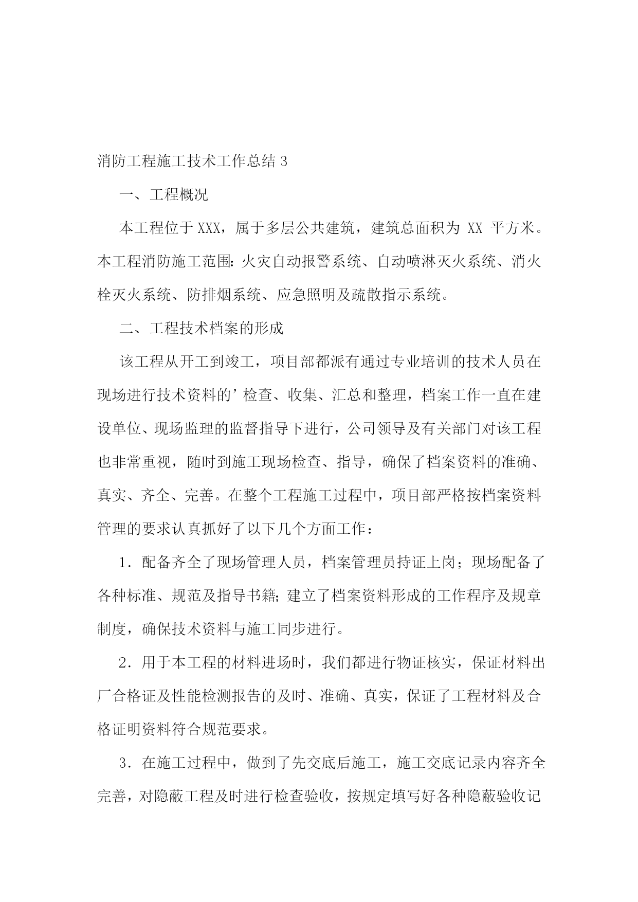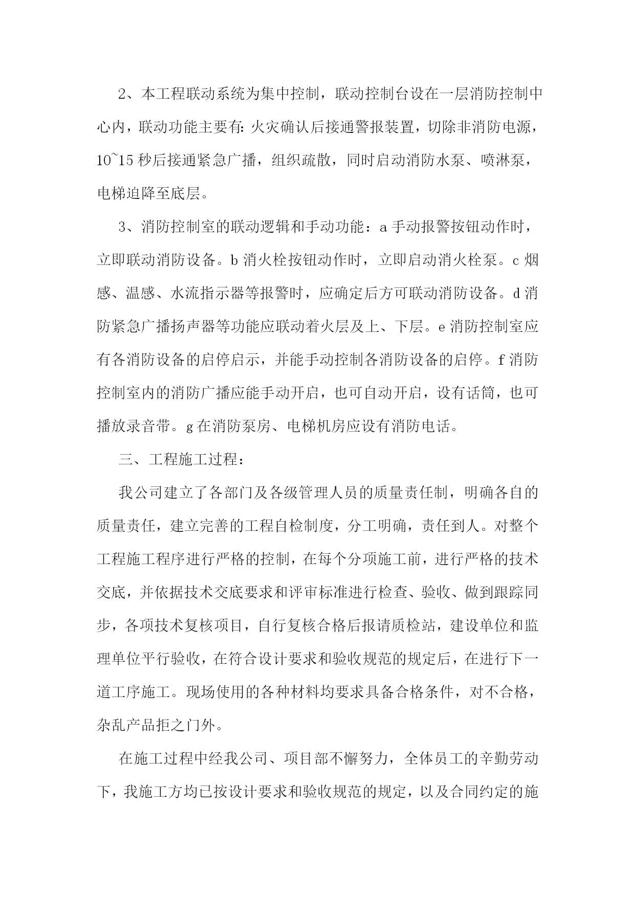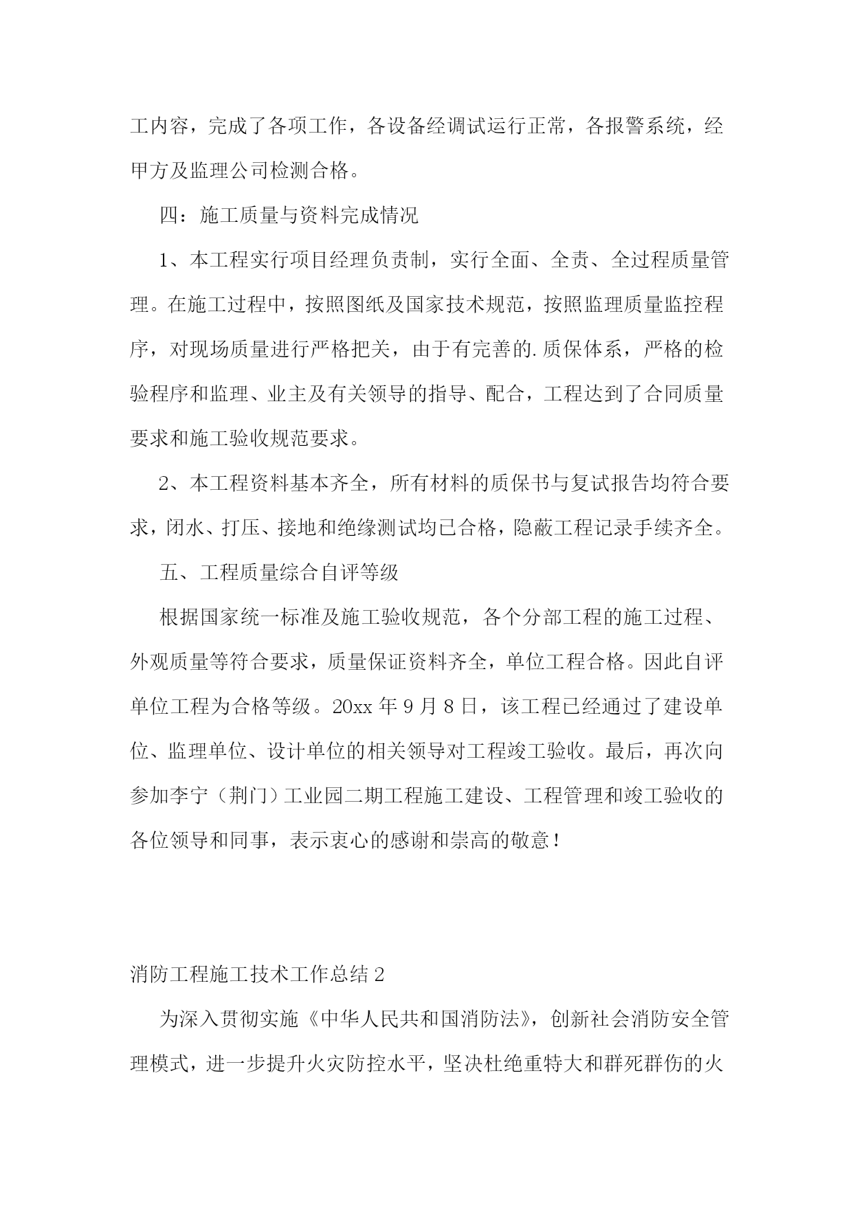 消防工程施工技术工作总结消防工程施工技术工作总结1由我单位承建的李宁(荆门)工业园鞋业生产A区1#、2#、7#、9#厂房及1#、2#员工宿舍工程,由湖北福力德鞋业有限责任公司投资,佛山市顺德建筑设计院有限公司设计,宜昌江峡监理有限责任公司监理,湖北福泰建筑装饰工程有限公司施工,荆门市建设工程质量监督站负责质量跟踪监督。本工程自开工以来,在上级领导、质监站、建设单位、设计单位、监理单位及有关部门的大力支持下,通过全体参建员工的努力和辛勤劳动,工程于20xx年4月10日通过了预验收工作,并完成了有关问题的质量整改闭合,现消防工程已具备竣工验收条件,下面就工程具体情况如下:一、工程概况:1、本工程为消防重点控制单位,本期工程共有厂房四个,一层,面积均为7770平方米,员工宿舍两栋,建筑面积皆为10252m2。厂房内配有消防自动报警系统,自动喷水灭火系统及消火栓系统。宿舍配有消火栓系统。2、建筑类别及耐火等级:二类多层建筑,耐火等级为二级。二、工程使用功能:1、本工程消防报警系统采用消防中心控制系统,由自动报警系统、楼层疏散指示系统、消火栓系统、喷淋系统、消防广播和消防电话等系统组成。消防中心设在门卫室,消防中心采用集中报警控制器。2、本工程联动系统为集中控制,联动控制台设在一层消防控制中心内,联动功能主要有:火灾确认后接通警报装置,切除非消防电源,10~15秒后接通紧急广播,组织疏散,同时启动消防水泵、喷淋泵,电梯迫降至底层。3、消防控制室的联动逻辑和手动功能:a手动报警按钮动作时,立即联动消防设备。b消火栓按钮动作时,立即启动消火栓泵。c烟感、温感、水流指示器等报警时,应确定后方可联动消防设备。d消防紧急广播扬声器等功能应联动着火层及上、下层。e消防控制室应有各消防设备的启停启示,并能手动控制各消防设备的启停。f消防控制室内的消防广播应能手动开启,也可自动开启,设有话筒,也可播放录音带。g在消防泵房、电梯机房应设有消防电话。三、工程施工过程:我公司建立了各部门及各级管理人员的质量责任制,明确各自的质量责任,建立完善的工程自检制度,分工明确,责任到人。对整个工程施工程序进行严格的控制,在每个分项施工前,进行严格的技术交底,并依据技术交底要求和评审标准进行检查、验收、做到跟踪同步,各项技术复核项目,自行复核合格后报请质检站,建设单位和监理单位平行验收,在符合设计要求和验收规范的规定后,在进行下一道工序施工。现场使用的各种材料均要求具备合格条件,对不合格,杂乱产品拒之门外。在施工过程中经我公司、项目部不懈努力,全体员工的辛勤劳动下,我施工方均已按设计要求和验收规范的规定,以及合同约定的施工内容,完成了各项工作,各设备经调试运行正常,各报警系统,经甲方及监理公司检测合格。四:施工质量与资料完成情况1、本工程实行项目经理负责制,实行全面、全责、全过程质量管理。在施工过程中,按照图纸及国家技术规范,按照监理质量监控程序,对现场质量进行严格把关,由于有完善的.质保体系,严格的检验程序和监理、业主及有关领导的指导、配合,工程达到了合同质量要求和施工验收规范要求。2、本工程资料基本齐全,所有材料的质保书与复试报告均符合要求,闭水、打压、接地和绝缘测试均已合格,隐蔽工程记录手续齐全。五、工程质量综合自评等级根据国家统一标准及施工验收规范,各个分部工程的施工过程、外观质量等符合要求,质量保证资料齐全,单位工程合格。因此自评单位工程为合格等级。20xx年9月8日,该工程已经通过了建设单位、监理单位、设计单位的相关领导对工程竣工验收。最后,再次向参加李宁(荆门)工业园二期工程施工建设、工程管理和竣工验收的各位领导和同事,表示衷心的感谢和崇高的敬意!消防工程施工技术工作总结2为深入贯彻实施《中华人民共和国消防法》,创新社会消防安全管理模式,进一步提升火灾防控水平,坚决杜绝重特大和群死群伤的火灾事故发生,确保社会稳定,按照公安部和省、市政府的统一部署,结合我县的实际情况,现就年至20xx年我县构筑社会消防安全“防火墙”工程制定如下实施方案。一、工作目标以“平安、平安亚运”为目标,以落实政府部门消防工作“四项责任”、提高社会单位消防安全“四个能力”、夯实农村社区火灾防控“四个基础”、提高公安机关消防监督管理“四个水平”为着力点,力争通过三年努力,使消防工作社会化水平明显提升,社会消防安全环境明显改善。二、主要措施(一)落实政府部门消防工作“四项责任”。1、落实组织领导责任。各镇要把消防工作纳入国民经济和社会发展计划,将消防经费、公共消防设施和装备建设、社会消防力量发展、火灾隐患整改等纳入政府任期工作目标,并制定实施“十二五”消防发展规划,保障消防工作与经济社会发展相适应;定期研究解决消防工作重大问题,适时开展