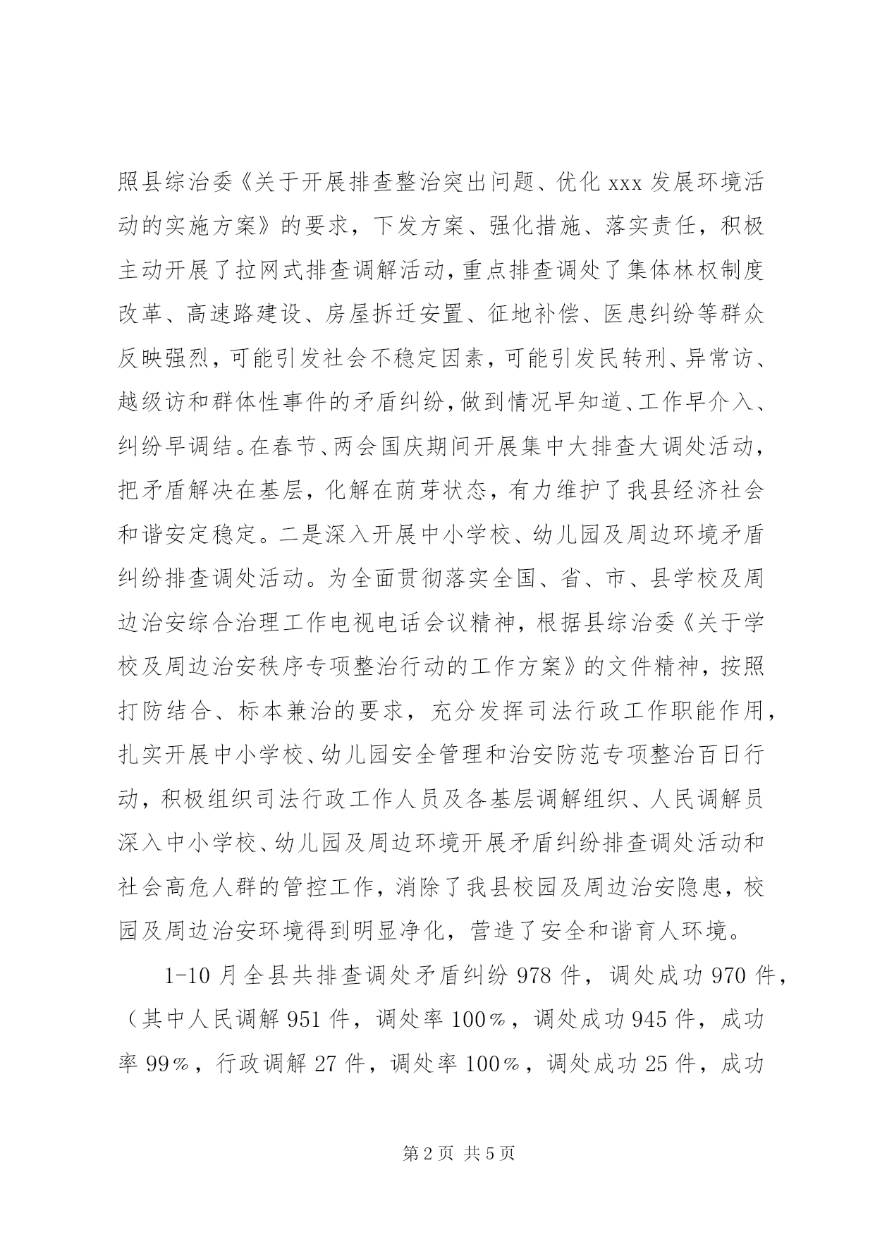 第PAGE\*Arabic\*MERGEFORMAT5页共NUMPAGES\*MERGEFORMAT5页司法局平安单位创建工作总结2010年,我局平安建设以邓小平理论和三个代表重要思想为指导,以科学发展观为统领,全面贯彻落实党的十七大、十七届五中全会和hjt总书记来闽重要讲话精神,充分履职,为我县持续开展XX县区建设提供强有力的法律服务和法制保障,全面完XX县区委、县政府下达我局参与创建平安xxx的工作目标。一、加强领导,责任到人为了确保平安建设(综治)工作落到实处,我局认真落实社会治安综合治理责任制,把综治平安建设工作摆上重要议事日程,纳入司法行政年度工作之中,局党组专门调整充实了xxx县司法行政系统平安建设(综治)工作领导小组,进一步明确了领导小组及各个科(室)的工作职责,要求各科室按年初创建计划,分工协作,把社会治安综合治理工作的实绩作为司法行政干部晋升、奖惩的重要依据,综治工作搞不好的严格执行一票否决,不得评先评优,不得晋级晋职,县局不定期对基层所综治工作开展情况进行考核评比,有力促进了我局平安创建活动工作的顺利开展。二、充分发挥调解职能作用,维护社会和谐稳定我局紧紧围绕深化平安xxx建设这一工作主线,以健全调解机制为抓手,以拓展调解领域为目标,以维护社会稳定为重点,充分发挥各级调解组织职能作用,深入推进社会矛盾化解,把好社会稳定的第一道防线,营造了良好社会和谐稳定环境。一是按照县综治委《关于开展排查整治突出问题、优化xxx发展环境活动的实施方案》的要求,下发方案、强化措施、落实责任,积极主动开展了拉网式排查调解活动,重点排查调处了集体林权制度改革、高速路建设、房屋拆迁安置、征地补偿、医患纠纷等群众反映强烈,可能引发社会不稳定因素,可能引发民转刑、异常访、越级访和群体性事件的矛盾纠纷,做到情况早知道、工作早介入、纠纷早调结。在春节、两会国庆期间开展集中大排查大调处活动,把矛盾解决在基层,化解在荫芽状态,有力维护了我县经济社会和谐安定稳定。二是深入开展中小学校、幼儿园及周边环境矛盾纠纷排查调处活动。为全面贯彻落实全国、省、市、县学校及周边治安综合治理工作电视电话会议精神,根据县综治委《关于学校及周边治安秩序专项整治行动的工作方案》的文件精神,按照打防结合、标本兼治的要求,充分发挥司法行政工作职能作用,扎实开展中小学校、幼儿园安全管理和治安防范专项整治百日行动,积极组织司法行政工作人员及各基层调解组织、人民调解员深入中小学校、幼儿园及周边环境开展矛盾纠纷排查调处活动和社会高危人群的管控工作,消除了我县校园及周边治安隐患,校园及周边治安环境得到明显净化,营造了安全和谐育人环境。1-10月全县共排查调处矛盾纠纷978件,调处成功970件,(其中人民调解951件,调处率100﹪,调处成功945件,成功率99﹪,行政调解27件,调处率100﹪,调处成功25件,成功率89﹪);没有发生民转刑案件和群体性械斗事件。三、不断推进社会管理创新,夯实维稳基础1、安置帮教工作取得了新成效。认真开展对全县五年内刑释人员和三年内解教人员的全面摸排和信息核查工作,并做好衔接、管控和刑释解教人员危险评估、分类帮教工作,做到底数清、情况明,同时,会同相关部门建立了三人为一小组的帮教小组,责任到人,帮教措施到人,有效的促进了我县社会安定稳定。今年来,全县共摸排出刑满释放人员753人和解除劳教人员19人,共772人都逐一登记建档,订帮教协议书,并落实了帮教措施,刑释解教人员安置率达95﹪以上,帮教率达98﹪以上,重新犯罪率控制在3﹪以内,最大限度的预防和减少重新违法犯罪。2、社区矫正工作取得了良好开局。一是制计划、明任务。根据省、市《实施意见》的要求,县委政法委、县人民法院、县人民检察院、县公安局、县司法局结合县实际情况,提出贯彻意见,并联合下发了《关于在全县试行社区矫正工作的实施意见》(宁委政[2010]50号)。二是扎实开展调查摸底。11月上旬,我局按照工作部署要求组织司法行政全体干职对全县的社区矫正对象进行全面在摸底,截止目前,我县共调查摸底出社区矫正对象181人(按照被判刑的类别来分,被判处缓刑161名、假释7名、暂予监外执行4名、剥夺政治权利3名、管制6名)。四、认真开展普法依法治理,持续创建平安单位工作。以创新普法形式,强化宣传效果为重点,认真开展法制宣传教育。一是突出领导干部学法用法重点,不断推进普法教育的深入开展。二是深入宣传《宪法》修正案和《行政许可法》等重要法律法规,认真组织指导全县开展《行政许可法》宣传活动,做好《行政许可法》的学习培训和全县公务员依法行政通用法律知识统考的组织工作,进一步促进了公务员学法用法;三是抓好基础工程,着力提高了青少年法律素质。四是抓实抓好经常性法制宣传工作。以12.4法制宣传日为重