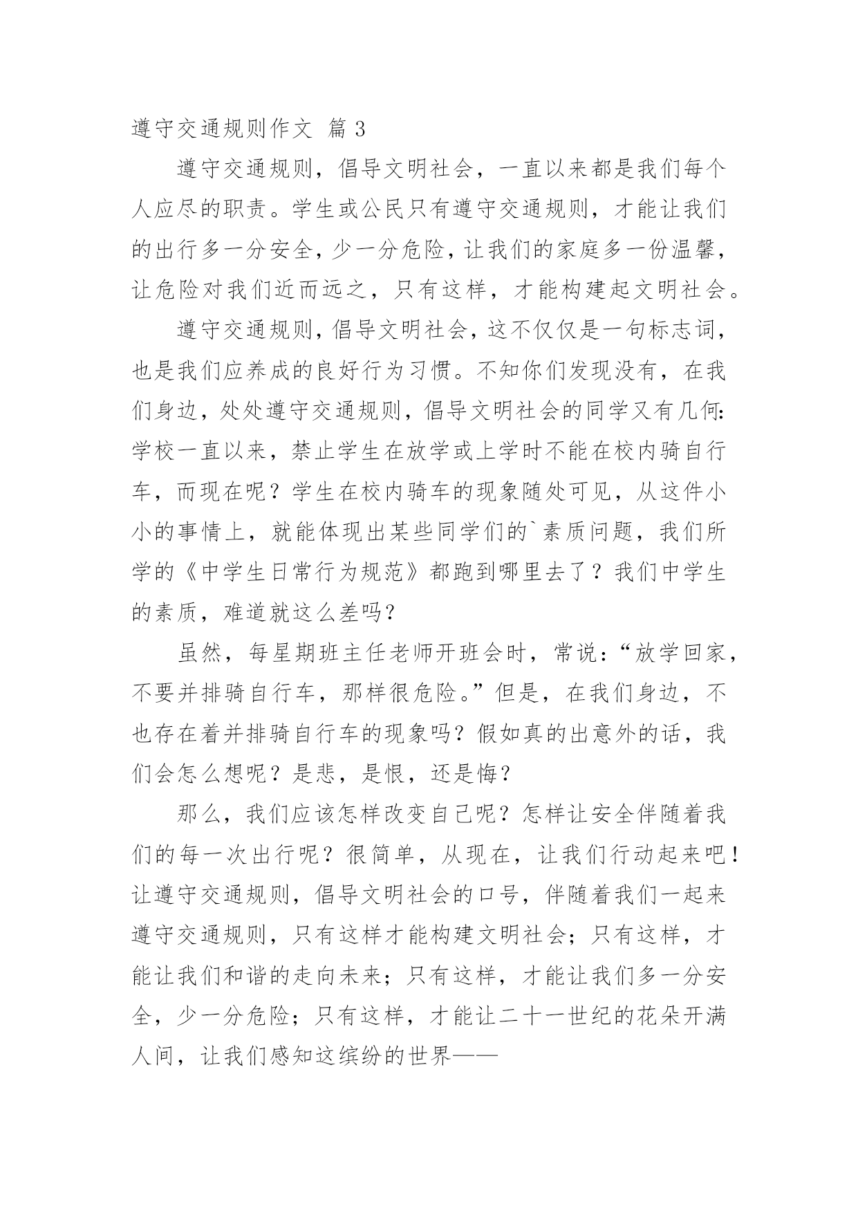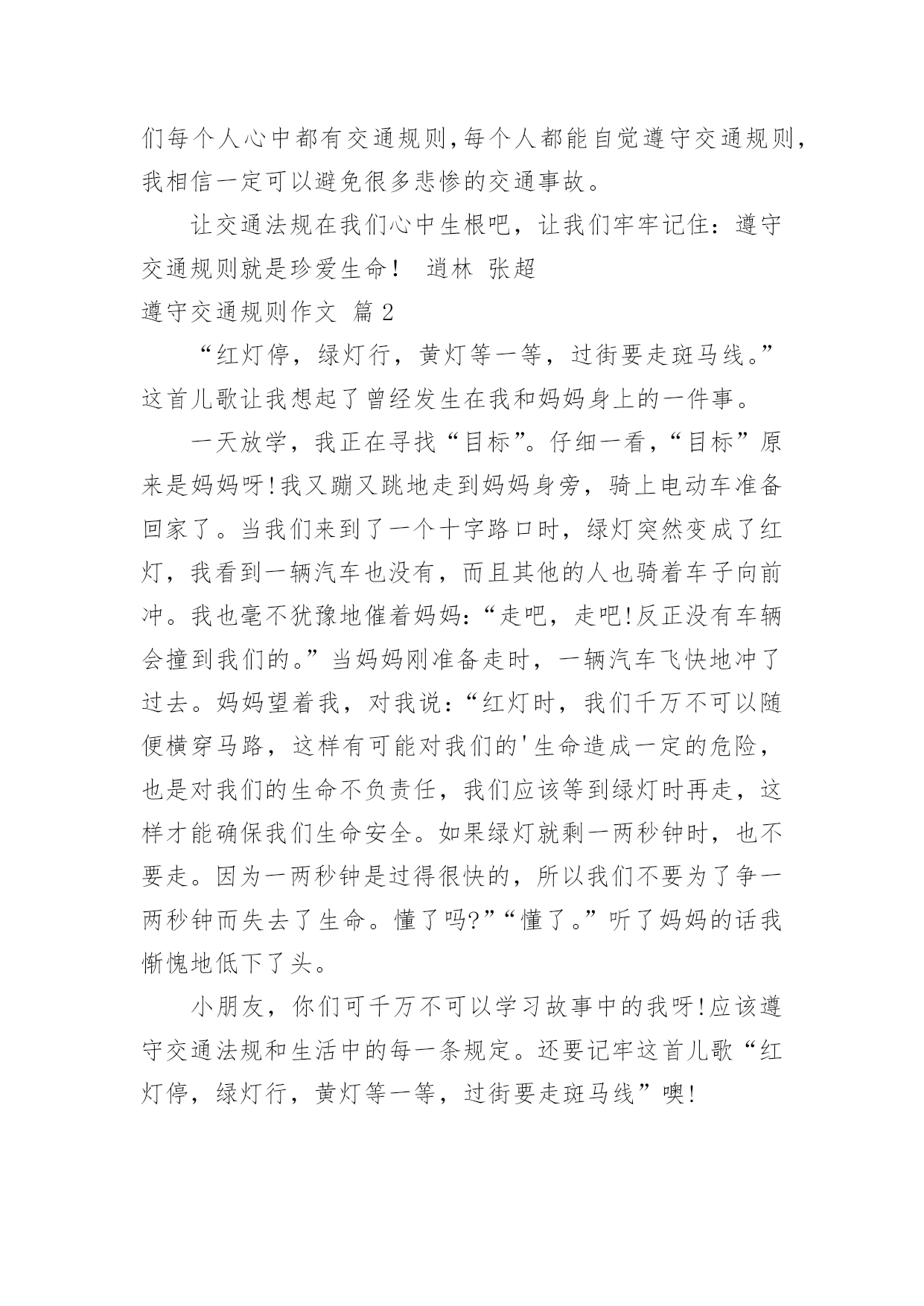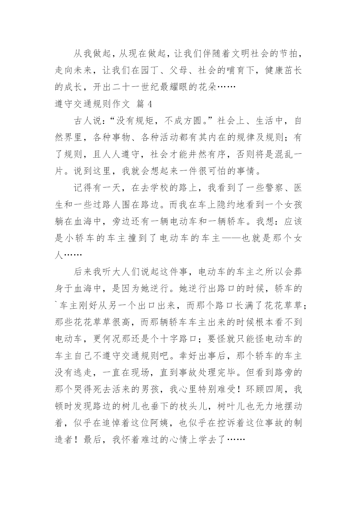 遵守交通规则作文精选遵守交通规则作文4篇在学习、工作、生活中,大家总少不了接触作文吧,作文根据写作时限的不同可以分为限时作文和非限时作文。那么,怎么去写作文呢?下面是小编收集整理的遵守交通规则作文4篇,仅供参考,大家一起来看看吧。遵守交通规则作文篇1生命只有一次,我们必须好好珍惜,珍惜自己所拥有的美好一切!前几天在报纸上看到这样一则交通事故:那是个晴朗的日子,有个男孩在马路上骑车骑得飞快,还不断闯红灯。路人想可能是他有什么急事吧,要不怎么骑得那么快,这样多危险啊!果不其然,在一个拐弯处,一辆大卡车就和这位“飞车男孩”撞上了,男孩顿时倒在了一片血泊之中。大家都围了过来。不一会儿,就见一对中年夫妇挤进了围观的队伍中,看着这个男孩,哭倒在地。他们就是这个男孩的父母。不知他们为这个倒在血泊中的孩子操了多少心,可现在只能眼睁睁地看着自己的`孩子就这样,以这种方式离去……交通事故是多么可怕啊,它就像一颗威力十足的定时炸弹,埋伏在我们的生活中,不知道什么时候就会突然爆炸,酿成人间悲剧,摧毁无数家庭。现在马路上的车辆越来越多,越来越拥挤,交通事故也越来越多,每年不知有多少生命被夺走,有多少家庭被破坏,有多少人失去亲人!同学们,如果我们每个人心中都有交通规则,每个人都能自觉遵守交通规则,我相信一定可以避免很多悲惨的交通事故。让交通法规在我们心中生根吧,让我们牢牢记住:遵守交通规则就是珍爱生命!逍林张超遵守交通规则作文篇2“红灯停,绿灯行,黄灯等一等,过街要走斑马线。”这首儿歌让我想起了曾经发生在我和妈妈身上的一件事。一天放学,我正在寻找“目标”。仔细一看,“目标”原来是妈妈呀!我又蹦又跳地走到妈妈身旁,骑上电动车准备回家了。当我们来到了一个十字路口时,绿灯突然变成了红灯,我看到一辆汽车也没有,而且其他的人也骑着车子向前冲。我也毫不犹豫地催着妈妈:“走吧,走吧!反正没有车辆会撞到我们的。”当妈妈刚准备走时,一辆汽车飞快地冲了过去。妈妈望着我,对我说:“红灯时,我们千万不可以随便横穿马路,这样有可能对我们的'生命造成一定的危险,也是对我们的生命不负责任,我们应该等到绿灯时再走,这样才能确保我们生命安全。如果绿灯就剩一两秒钟时,也不要走。因为一两秒钟是过得很快的,所以我们不要为了争一两秒钟而失去了生命。懂了吗?”“懂了。”听了妈妈的话我惭愧地低下了头。小朋友,你们可千万不可以学习故事中的我呀!应该遵守交通法规和生活中的每一条规定。还要记牢这首儿歌“红灯停,绿灯行,黄灯等一等,过街要走斑马线”噢!遵守交通规则作文篇3遵守交通规则,倡导文明社会,一直以来都是我们每个人应尽的职责。学生或公民只有遵守交通规则,才能让我们的出行多一分安全,少一分危险,让我们的家庭多一份温馨,让危险对我们近而远之,只有这样,才能构建起文明社会。遵守交通规则,倡导文明社会,这不仅仅是一句标志词,也是我们应养成的良好行为习惯。不知你们发现没有,在我们身边,处处遵守交通规则,倡导文明社会的同学又有几何:学校一直以来,禁止学生在放学或上学时不能在校内骑自行车,而现在呢?学生在校内骑车的现象随处可见,从这件小小的事情上,就能体现出某些同学们的`素质问题,我们所学的《中学生日常行为规范》都跑到哪里去了?我们中学生的素质,难道就这么差吗?虽然,每星期班主任老师开班会时,常说:“放学回家,不要并排骑自行车,那样很危险。”但是,在我们身边,不也存在着并排骑自行车的现象吗?假如真的出意外的话,我们会怎么想呢?是悲,是恨,还是悔?那么,我们应该怎样改变自己呢?怎样让安全伴随着我们的每一次出行呢?很简单,从现在,让我们行动起来吧!让遵守交通规则,倡导文明社会的口号,伴随着我们一起来遵守交通规则,只有这样才能构建文明社会;只有这样,才能让我们和谐的走向未来;只有这样,才能让我们多一分安全,少一分危险;只有这样,才能让二十一世纪的花朵开满人间,让我们感知这缤纷的世界——从我做起,从现在做起,让我们伴随着文明社会的节拍,走向未来,让我们在园丁、父母、社会的哺育下,健康茁长的成长,开出二十一世纪最耀眼的花朵……遵守交通规则作文篇4古人说:“没有规矩,不成方圆。”社会上、生活中,自然界里,各种事物、各种活动都有其内在的规律及规则;有了规则,且人人遵守,社会才能井然有序,否则将是混乱一片。说到这里,我就会想起来一件很可怕的事情。记得有一天,在去学校的路上,我看到了一些警察、医生和一些过路人围在路边。而我在车上隐约地看到一个女孩躺在血海中,旁边还有一辆电动车和一辆轿车。我想:应该是小轿车的车主撞到了电动车的车主——也就是那个女人……后来我听大人们说起这件事,电动车的车主之所以会葬身于血海中,是因为她逆行。她逆行出路口的时候,轿车的`车主刚好从另一个出口出来,而那个路口长满了花花草草;那些花花草草很高,而那辆轿车