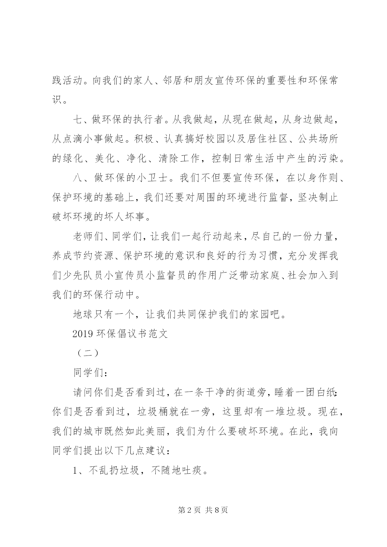 第PAGE\*Arabic\*MERGEFORMAT8页共NUMPAGES\*MERGEFORMAT8页20XX年环保倡议书范文大全2019环保倡议书范文(一)亲爱的全校老师和同学们:你们好。环境是人类及自然界所有生物赖以生存的基础。爱护地球、保护环境,节约资源义不容辞的责任。在新的一学期我们将开展以节约一滴水、一张纸、一粒米、一度电为主要内容的节约资源保护环境做地球小主人活动,在此,我们x年级xx班班委会向全校师生发出倡议:一、节约水资源,随手关上水龙头,发现滴漏,及时报修,打扫卫生时用桶接水,做到一水多用。二、节约用电,随手关闭不需要使用的电灯。三、节约粮食,不挑食,不剩饭莱,与父母外出吃饭时,饭莱点得适量,如有剩余,打包带回家。四、珍惜纸张,保护森林,节约使用练习本,用过一面的纸可装订成草稿本,用过期的挂历纸包书皮,不送精美的贺卡,积极宣传使用再生纸。五、做到垃圾分类投放,提倡绿色生活,绿色消费。六、做环保的宣传者。认真学习环保知识,积极参加环保实践活动。向我们的家人、邻居和朋友宣传环保的重要性和环保常识。七、做环保的执行者。从我做起,从现在做起,从身边做起,从点滴小事做起。积极、认真搞好校园以及居住社区、公共场所的绿化、美化、净化、清除工作,控制日常生活中产生的污染。八、做环保的小卫士。我们不但要宣传环保,在以身作则、保护环境的基础上,我们还要对周围的环境进行监督,坚决制止破坏环境的坏人坏事。老师们、同学们,让我们一起行动起来,尽自己的一份力量,养成节约资源、保护环境的意识和良好的行为习惯,充分发挥我们少先队员小宣传员小监督员的作用广泛带动家庭、社会加入到我们的环保行动中。地球只有一个,让我们共同保护我们的家园吧。2019环保倡议书范文(二)同学们:请问你们是否看到过,在一条干净的街道旁,睡着一团白纸:你们是否看到过,垃圾桶就在一旁,这里却有一堆垃圾。现在,我们的城市既然如此美丽,我们为什么要破坏环境。在此,我向同学们提出以下几点建议:1、不乱扔垃圾,不随地吐痰。2、看到有垃圾及时捡起并扔进垃圾桶。3、向人们宣传保护环境的重要性。4、如果发现有人破坏环境,要及时劝阻。同学们,我们只有一个地球,我们只有一片蓝天,我们只有一个属于自己的家园.让我们立即行动起来,从自己做起,从身边的小事做起,保护我们的生存环境,保护我们的大自然吧。2019环保倡议书范文(三)全校师生:为响应xx市政府3月10日起推行的生活垃圾分类袋装化活动,工程技术系青年志愿者服务队在这里向您倡议:请您将废旧电池投入工程技术系在校内设置的专用收集箱中。城市垃圾是当今世界的一大环境问题,对于它的管理和处置,已成为影响环境保护、威胁身体健康和阻碍城市可持续发展的一个重要因素。xx年,xx市实行了城市生活垃圾袋装化,继而又实行了生活垃圾上门收集,装潢垃圾、营业垃圾袋装。几年来,经过大家努力,使我市成为全国第一个实行生活垃圾袋装化成功的城市。当我们生活在干净舒适的环境中的时候,当xx市获得全国灭蝇先进城市的时候;我们却又有所发觉--生活垃圾还没能分类处理。过去,由于人们认识的错位,垃圾成了废物;然而,如今在许多发达国家变废为宝早已盛行,其间蕴藏着许多资源和财富,相比之下,我国现在普遍实行的垃圾填埋法就是一种浪费。据统计,xx市日产垃圾大约3000吨,按垃圾中三分之一的可利用的基数算,每年可以回收利用的资源达43.2万吨,这是一个非常庞大的数字。丰富的资源可以利用,对xx的垃圾进行科学化的管理,必将有力地推动经济的发展。所以,垃圾分类收集,是利国利民的大事、好事。世界上没有真正的垃圾,只有放错了位置和未被利用的资源。让我们立即行动起来,携手垃圾分类:不可再生类,主要是厨余垃圾、果品食品皮屑等;可再生类,主要是废纸、废塑料、废玻璃、废橡胶、废金属、动物骨头、废布等;有害类,主要袋装废电池、废显像管、旧日光灯管等。让我们从现在做起、从身边做起、从点滴做起,把我校建设为绿色学校。2019环保倡议书范文(四)亲爱的同学们:当你在这美丽的校园中学习,为我们美好的未来而努力时,相信我们每一个同学都渴望有一个干净的校园,渴望健康的生命,渴望绿色,渴望我们有一个良好的生活环境。学校是育人的场所,环境教育是提高我们思想道德素质和科学文化素质的基本手段之一,建立节约型和环境友好型校园,这不仅是学校自身发展的需要,更是我们学生应有的社会责任。为了增强大家的环境保护意识,让校园、班级环境更加整洁靓丽,有利于创建绿色和谐的校园环境,我们校园环境志愿者活动小组恳切地向师生们提出如下倡议:1、树立绿色文明观念,自觉关心环境状况,把个人环保行为视为个人文明修养的组成部分。2、不乱扔垃圾,果皮纸屑,不随地吐痰,不随意采摘校园的一草一木,爱护公共绿地。3、爱护仪器、设备和公物