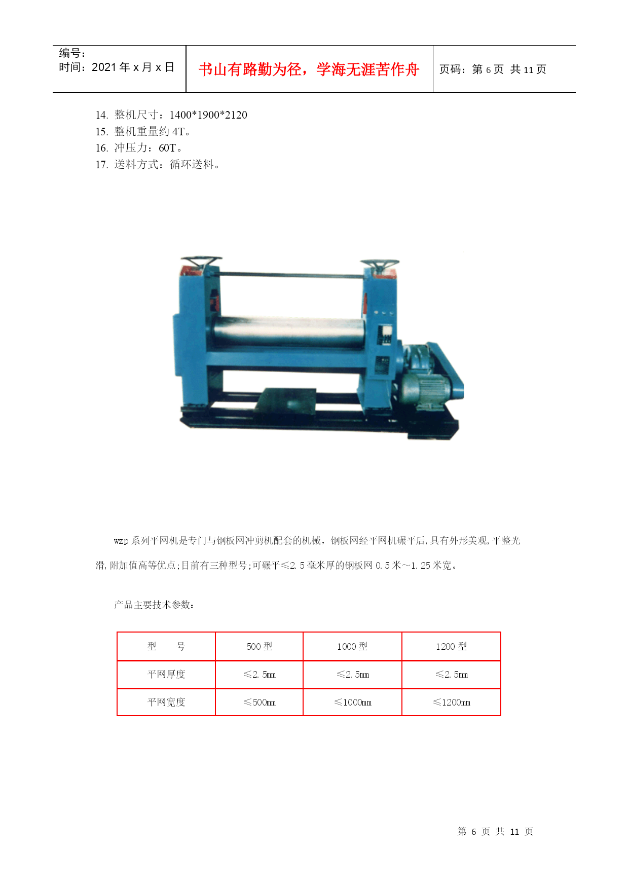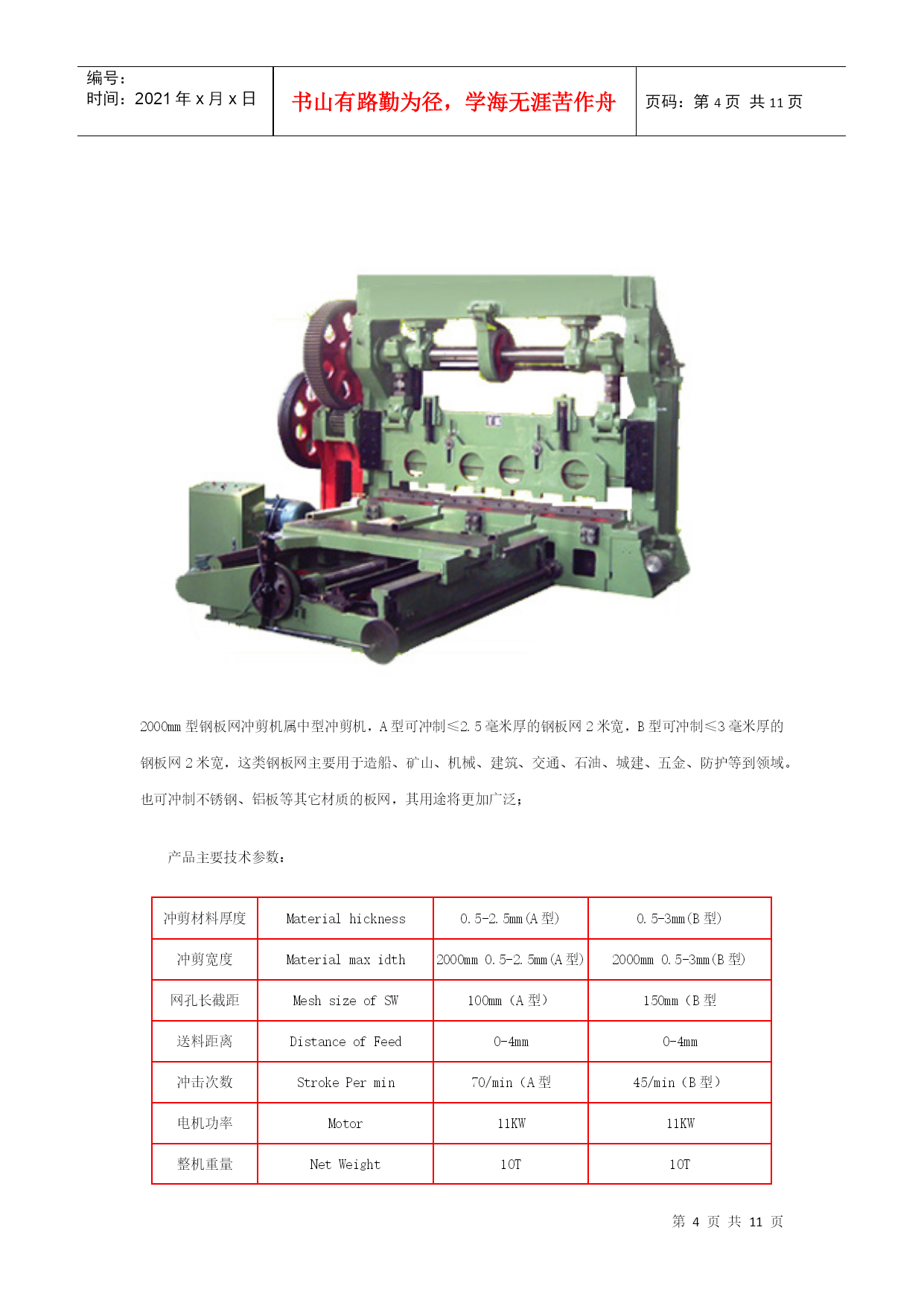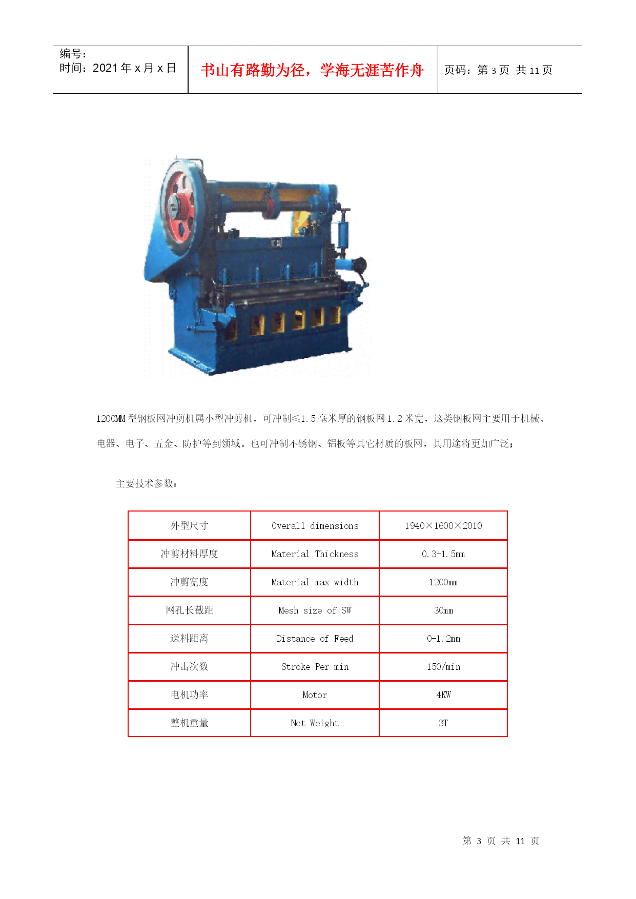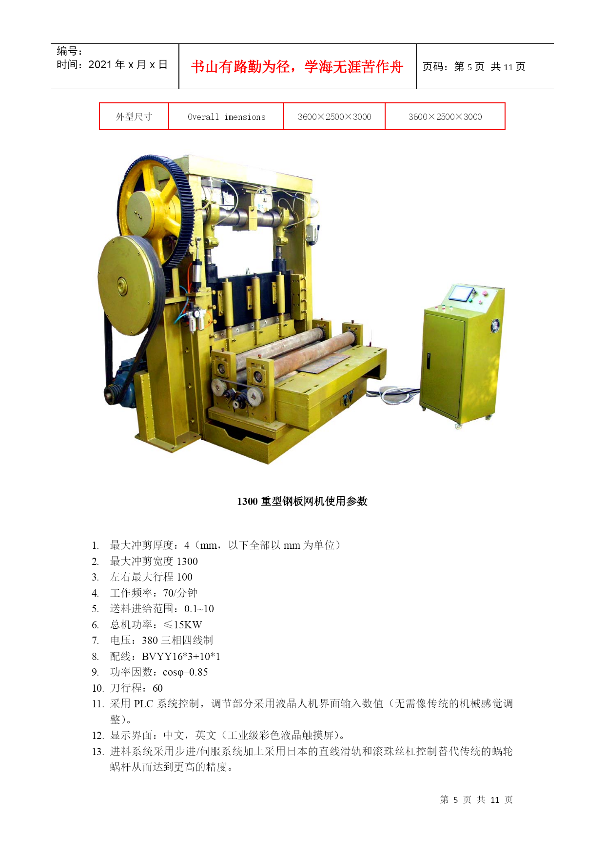 编号:时间:2021年x月x日书山有路勤为径,学海无涯苦作舟页码:第PAGE11页共NUMPAGES11页第PAGE\*MERGEFORMAT11页共NUMPAGES\*MERGEFORMAT11页500MM型钢板网冲剪机属微型冲剪机,目前有A型和B型两种型号;可冲制≤1毫米厚的钢板网0.5米宽,这类钢板网主要用于轻工、电器、微电子、五金、微电池等到领域。也可冲制不锈钢、铝板等其它材质的板网,其用途非常广泛;其中,B型机采用无油润滑,送料无级调节、自动剪断等先进技术。产品主要技术参数:冲击次数StrokePermin200-400min送料距离DistanceofFeed0-1.6mm网孔长截距MeshsizeofSW10mm外型尺寸Overalldimensions1090×710×1450mm冲剪材料厚度MaterialThickness0.1-1mm最大冲剪宽度Materialmaxwidth500mm电机功率Motor2.2KW整机重量NetWeight0.95T技术图样:1000MM型钢板网冲剪机属小型冲剪机,可冲制≤1毫米厚的钢板网1米宽,这类钢板网主要用于机械、电器、电子、五金、防护等到领域。也可冲制不锈钢、铝板等其它材质的板网,其用途非常广泛;产品主要技术参数:外型尺寸Overalldimensions(mm)1740×1400×1500冲剪材料厚度MaterialThickness0.2-1mm≤1mm最大冲剪宽度Materialmaxwidth1000mm网孔长截距MeshsizeofSW25mm25mm送料距离DistanceofFeed0-1.2mm冲击次数StrokePermin150/min电机功率Motor3KW整机重量NetWeight2T1200MM型钢板网冲剪机属小型冲剪机,可冲制≤1.5毫米厚的钢板网1.2米宽,这类钢板网主要用于机械、电器、电子、五金、防护等到领域。也可冲制不锈钢、铝板等其它材质的板网,其用途将更加广泛;主要技术参数:外型尺寸Overalldimensions1940×1600×2010冲剪材料厚度MaterialThickness0.3-1.5mm冲剪宽度Materialmaxwidth1200mm网孔长截距MeshsizeofSW30mm送料距离DistanceofFeed0-1.2mm冲击次数StrokePermin150/min电机功率Motor4KW整机重量NetWeight3T2000mm型钢板网冲剪机属中型冲剪机,A型可冲制≤2.5毫米厚的钢板网2米宽,B型可冲制≤3毫米厚的钢板网2米宽,这类钢板网主要用于造船、矿山、机械、建筑、交通、石油、城建、五金、防护等到领域。也可冲制不锈钢、铝板等其它材质的板网,其用途将更加广泛;产品主要技术参数:冲剪材料厚度Materialhickness0.5-2.5mm(A型)0.5-3mm(B型)冲剪宽度Materialmaxidth2000mm0.5-2.5mm(A型)2000mm0.5-3mm(B型)网孔长截距MeshsizeofSW100mm(A型)150mm(B型送料距离DistanceofFeed0-4mm0-4mm冲击次数StrokePermin70/min(A型45/min(B型)电机功率Motor11KW11KW整机重量NetWeight10T10T外型尺寸Overallimensions3600×2500×30003600×2500×30001300重型钢板网机使用参数最大冲剪厚度:4(mm,以下全部以mm为单位)最大冲剪宽度1300左右最大行程100工作频率:70/分钟送料进给范围:0.1~10总机功率:≤15KW电压:380三相四线制配线:BVYY16*3+10*1功率因数:cosφ=0.85刀行程:60采用PLC系统控制,调节部分采用液晶人机界面输入数值(无需像传统的机械感觉调整)。显示界面:中文,英文(工业级彩色液晶触摸屏)。进料系统采用步进/伺服系统加上采用日本的直线滑轨和滚珠丝杠控制替代传统的蜗轮蜗杆从而达到更高的精度。整机尺寸:1400*1900*2120整机重量约4T。冲压力:60T。送料方式:循环送料。wzp系列平网机是专门与钢板网冲剪机配套的机械,钢板网经平网机碾平后,具有外形美观,平整光滑,附加值高等优点;目前有三种型号;可碾平≤2.5毫米厚的钢板网0.5米~1.25米宽。产品主要技术参数:型号500型1000型1200型平网厚度≤2.5mm≤2.5mm≤2.5mm平网宽度≤500mm≤1000mm≤1200mm有筋网由热镀锌带钢冲切扩张制造而成
