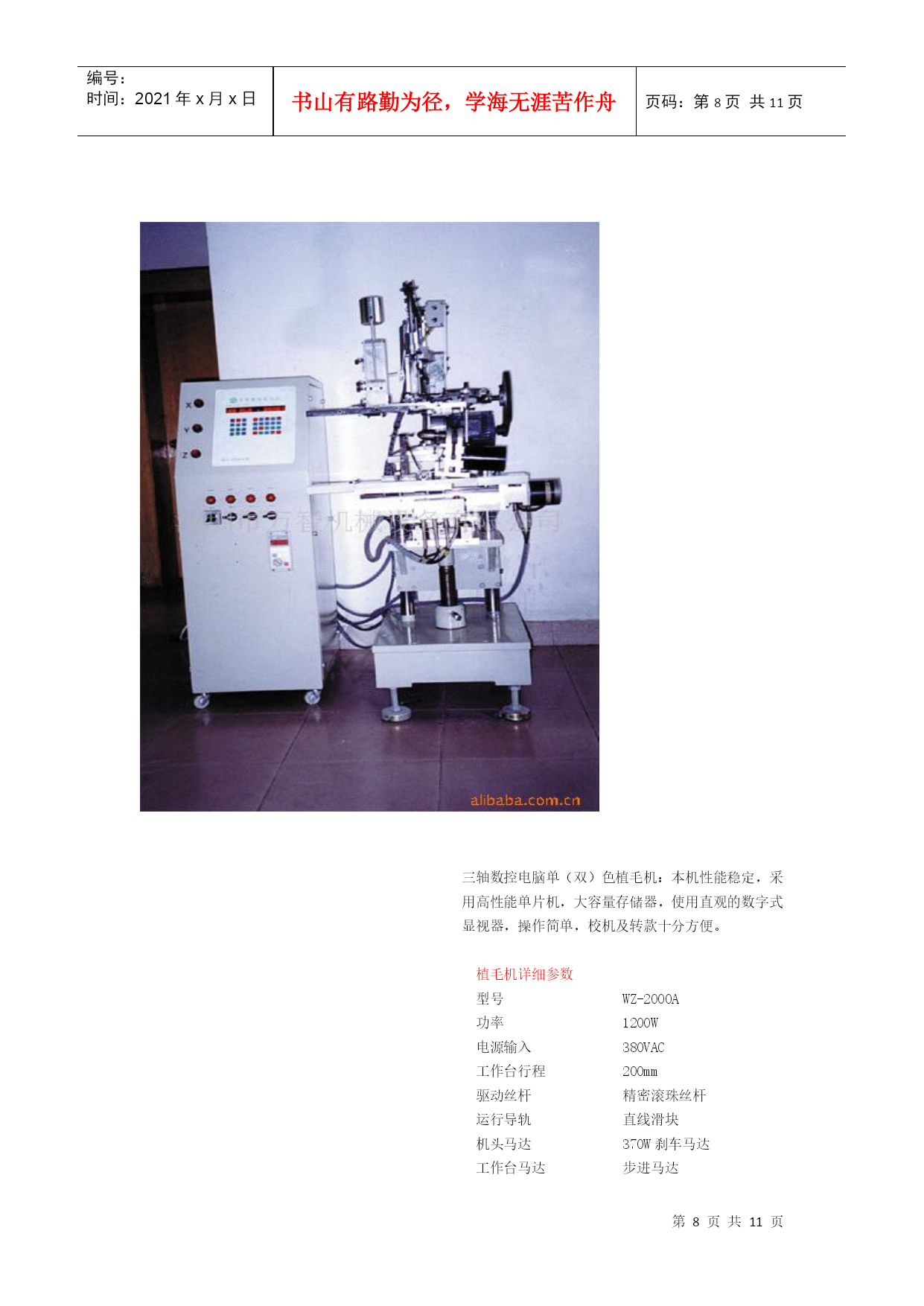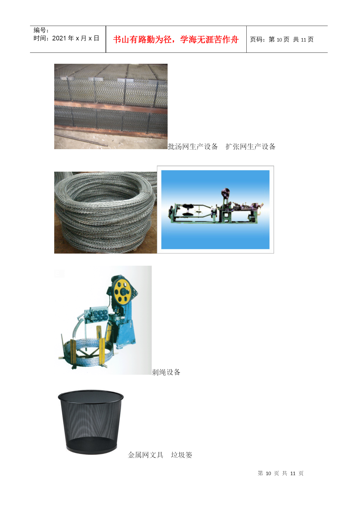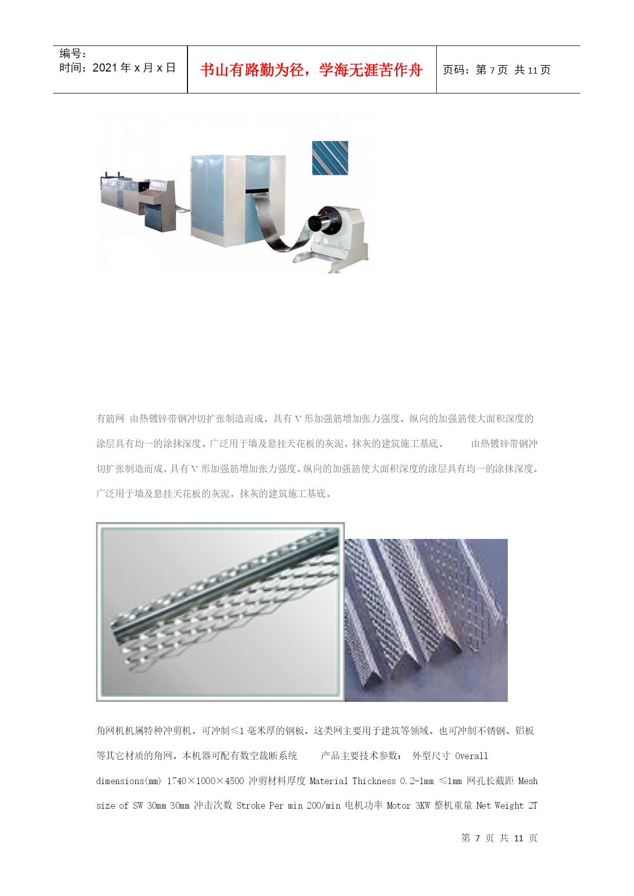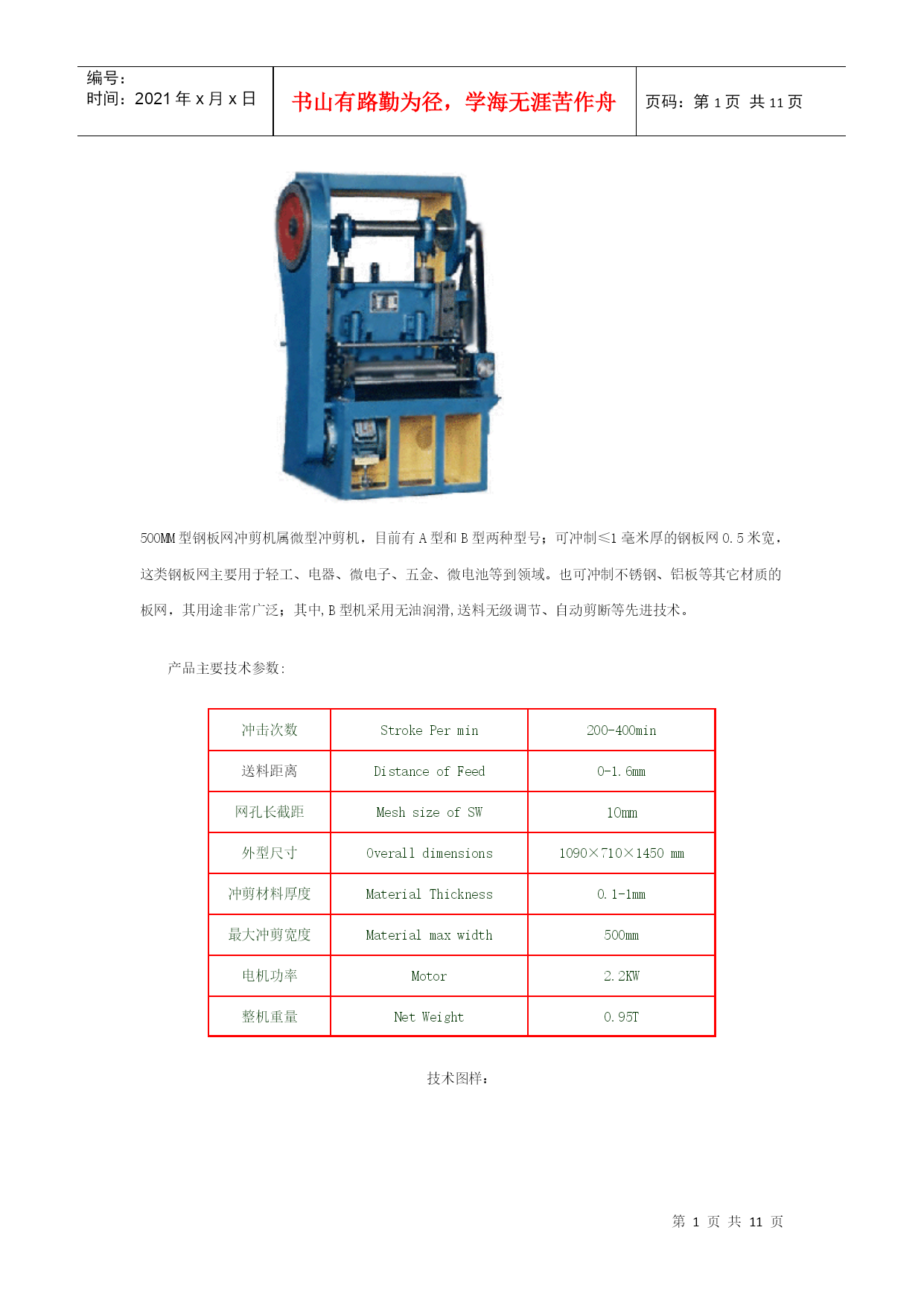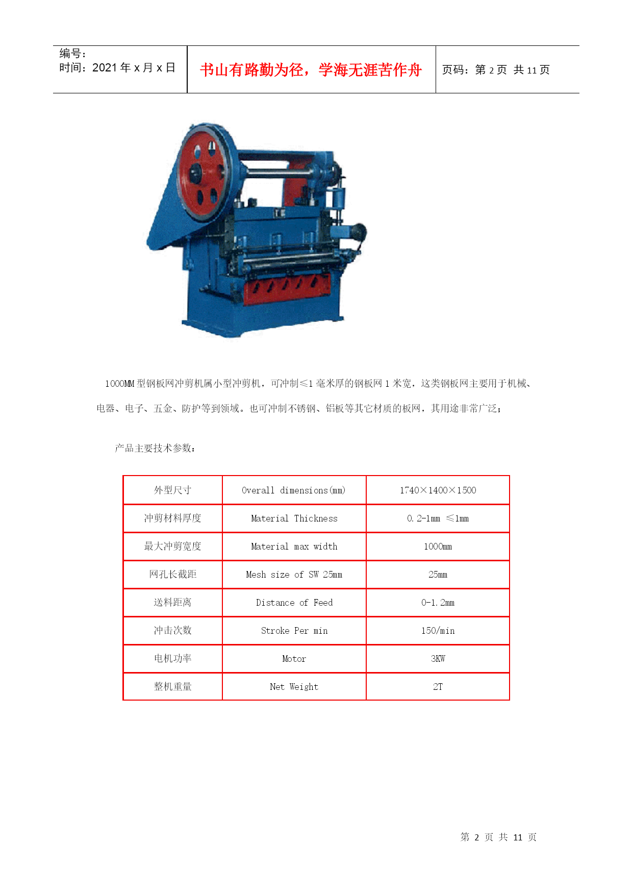 编号:时间:2021年x月x日书山有路勤为径,学海无涯苦作舟页码:第PAGE11页共NUMPAGES11页第PAGE\*MERGEFORMAT11页共NUMPAGES\*MERGEFORMAT11页500MM型钢板网冲剪机属微型冲剪机,目前有A型和B型两种型号;可冲制≤1毫米厚的钢板网0.5米宽,这类钢板网主要用于轻工、电器、微电子、五金、微电池等到领域。也可冲制不锈钢、铝板等其它材质的板网,其用途非常广泛;其中,B型机采用无油润滑,送料无级调节、自动剪断等先进技术。产品主要技术参数:冲击次数StrokePermin200-400min送料距离DistanceofFeed0-1.6mm网孔长截距MeshsizeofSW10mm外型尺寸Overalldimensions1090×710×1450mm冲剪材料厚度MaterialThickness0.1-1mm最大冲剪宽度Materialmaxwidth500mm电机功率Motor2.2KW整机重量NetWeight0.95T技术图样:1000MM型钢板网冲剪机属小型冲剪机,可冲制≤1毫米厚的钢板网1米宽,这类钢板网主要用于机械、电器、电子、五金、防护等到领域。也可冲制不锈钢、铝板等其它材质的板网,其用途非常广泛;产品主要技术参数:外型尺寸Overalldimensions(mm)1740×1400×1500冲剪材料厚度MaterialThickness0.2-1mm≤1mm最大冲剪宽度Materialmaxwidth1000mm网孔长截距MeshsizeofSW25mm25mm送料距离DistanceofFeed0-1.2mm冲击次数StrokePermin150/min电机功率Motor3KW整机重量NetWeight2T1200MM型钢板网冲剪机属小型冲剪机,可冲制≤1.5毫米厚的钢板网1.2米宽,这类钢板网主要用于机械、电器、电子、五金、防护等到领域。也可冲制不锈钢、铝板等其它材质的板网,其用途将更加广泛;主要技术参数:外型尺寸Overalldimensions1940×1600×2010冲剪材料厚度MaterialThickness0.3-1.5mm冲剪宽度Materialmaxwidth1200mm网孔长截距MeshsizeofSW30mm送料距离DistanceofFeed0-1.2mm冲击次数StrokePermin150/min电机功率Motor4KW整机重量NetWeight3T2000mm型钢板网冲剪机属中型冲剪机,A型可冲制≤2.5毫米厚的钢板网2米宽,B型可冲制≤3毫米厚的钢板网2米宽,这类钢板网主要用于造船、矿山、机械、建筑、交通、石油、城建、五金、防护等到领域。也可冲制不锈钢、铝板等其它材质的板网,其用途将更加广泛;产品主要技术参数:冲剪材料厚度Materialhickness0.5-2.5mm(A型)0.5-3mm(B型)冲剪宽度Materialmaxidth2000mm0.5-2.5mm(A型)2000mm0.5-3mm(B型)网孔长截距MeshsizeofSW100mm(A型)150mm(B型送料距离DistanceofFeed0-4mm0-4mm冲击次数StrokePermin70/min(A型45/min(B型)电机功率Motor11KW11KW整机重量NetWeight10T10T外型尺寸Overallimensions3600×2500×30003600×2500×30001300重型钢板网机使用参数最大冲剪厚度:4(mm,以下全部以mm为单位)最大冲剪宽度1300左右最大行程100工作频率:70/分钟送料进给范围:0.1~10总机功率:≤15KW电压:380三相四线制配线:BVYY16*3+10*1功率因数:cosφ=0.85刀行程:60采用PLC系统控制,调节部分采用液晶人机界面输入数值(无需像传统的机械感觉调整)。显示界面:中文,英文(工业级彩色液晶触摸屏)。进料系统采用步进/伺服系统加上采用日本的直线滑轨和滚珠丝杠控制替代传统的蜗轮蜗杆从而达到更高的精度。整机尺寸:1400*1900*2120整机重量约4T。冲压力:60T。送料方式:循环送料。wzp系列平网机是专门与钢板网冲剪机配套的机械,钢板网经平网机碾平后,具有外形美观,平整光滑,附加值高等优点;目前有三种型号;可碾平≤2.5毫米厚的钢板网0.5米~1.25米宽。产品主要技术参数:型号500型1000型1200型平网厚度≤2.5mm≤2.5mm≤2.5mm平网宽度≤500mm≤1000mm≤1200mm有筋网由热镀锌带钢冲切扩张制造而成