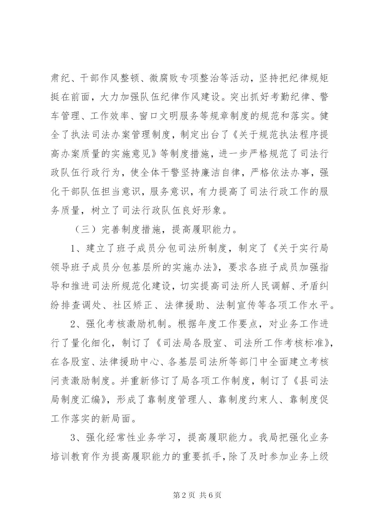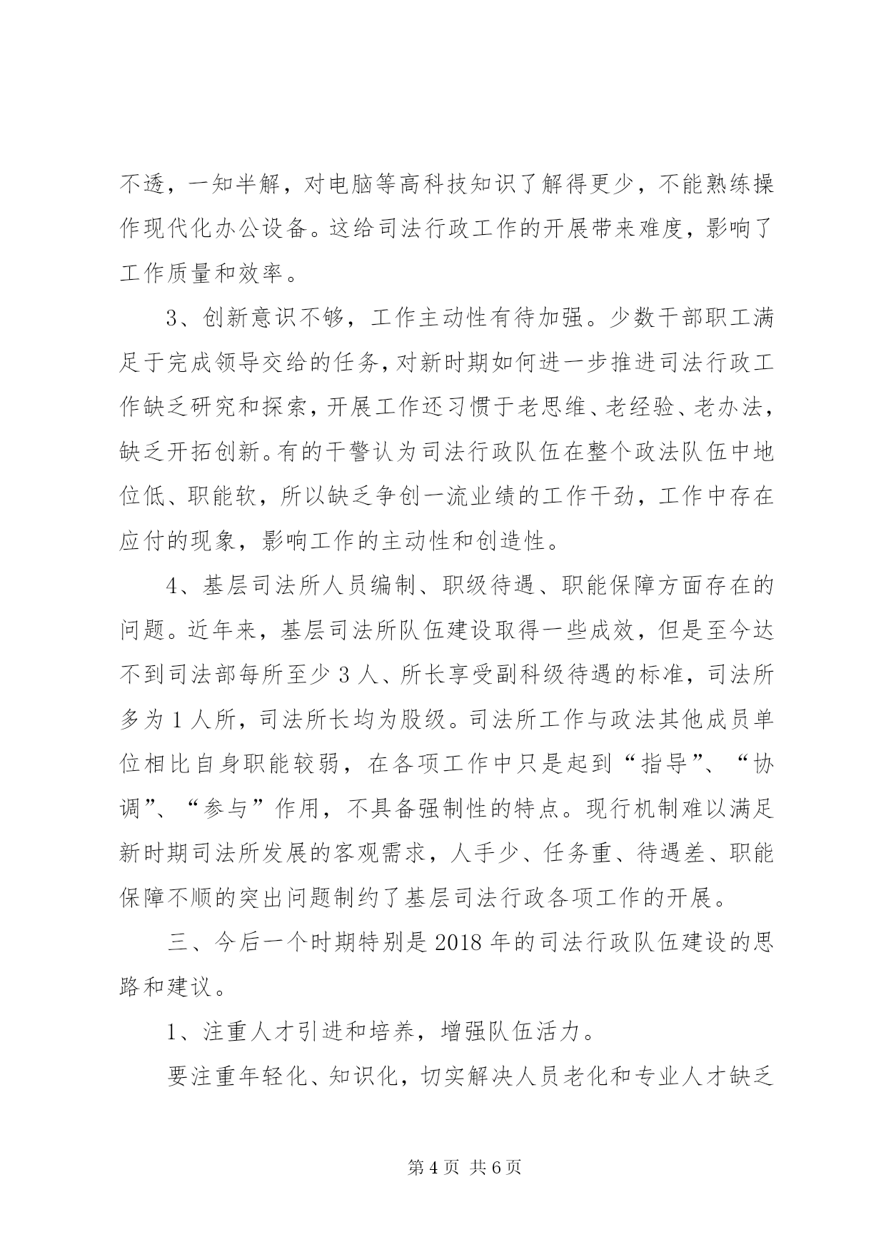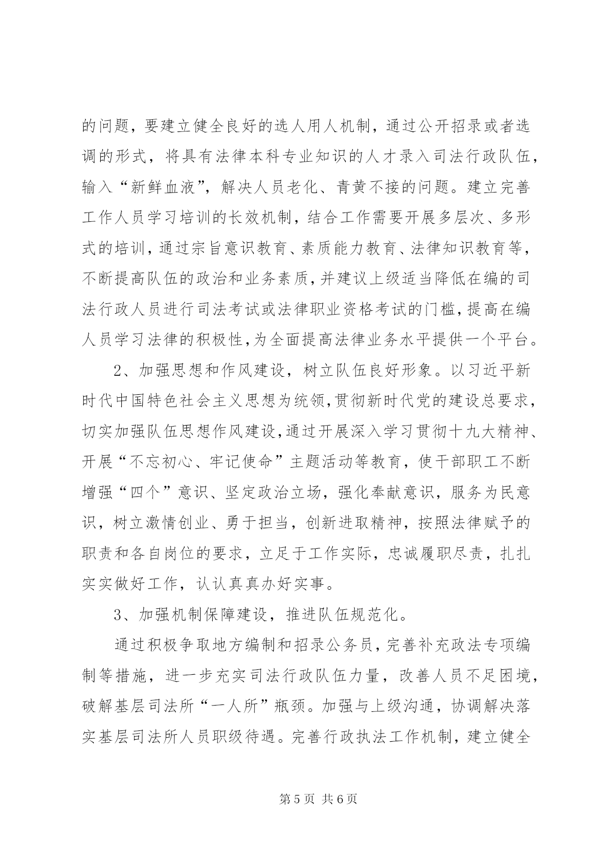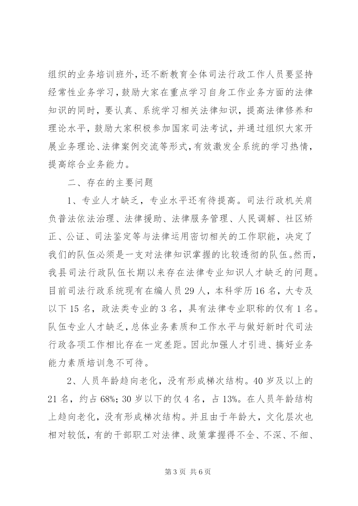 第PAGE\*Arabic\*MERGEFORMAT6页共NUMPAGES\*MERGEFORMAT6页关于司法行政队伍建设调研报告为深入学习贯彻党的十九大精神,认真谋划今后一个时期特别是2018年的队伍建设工作,按照县委政法委部署,我局就司法行政队伍建设情况进行了调研,现将有关情况报告如下:一、党的十八大以来全县司法行政队伍建设情况。党的十八大以来,县司法局坚持以“政治坚定、业务精通、作风优良、执法公正”为目标,按照“抓班子、带队伍,激活力、提效能,强素质、树形象”的思路,以教育、管理、监督为着力点,以开展党的群众路线教育实践活动、“三严三实”主题教育、“两学一做”学习教育等为载体,大力加强队伍的政治思想建设、党风廉政建设、作风建设,使干部职工的政治思想素质和业务能力得到了较大提高,工作作风得到明显改善,为促进全县发展提供法律服务和法律保障发挥了积极作用,有力的推动了各项司法行政工作的发展,树立了司法行政队伍良好形象。(一)加强政治思想教育,提高政治素质。围绕提高队伍政治思想素质,以开展“党的群众路线教育实践活动”、“三严三实”专题教育、解放思想大讨论教育活动、“两学一做”学习教育等为载体,组织全体干部深入学习党的政治理论、学习习近平总书记系列讲话、学习党的路线方针政策和决策部署,大大地提高了司法行政系统队伍的政治思想素质。(二)加强纪律作风建设,树立良好形象。认真开展了正风肃纪、干部作风整顿、微腐败专项整治等活动,坚持把纪律规矩挺在前面,大力加强队伍纪律作风建设。突出抓好考勤纪律、警车管理、工作效率、窗口文明服务等规章制度的规范和落实。健全了执法司法办案管理制度,制定出台了《关于规范执法程序提高办案质量的实施意见》等制度措施,进一步严格规范了司法行政队伍行政行为,使全体干警坚持廉洁自律,严格依法办事,强化干部队伍担当意识,服务意识,有力提高了司法行政工作的服务质量,树立了司法行政队伍良好形象。(三)完善制度措施,提高履职能力。1、建立了班子成员分包司法所制度,制定了《关于实行局领导班子成员分包基层所的实施办法》,要求各班子成员加强指导和推进司法所规范化建设,切实提高司法所人民调解、矛盾纠纷排查调处、社区矫正、法律援助、法制宣传等各项工作水平。2、强化考核激励机制。根据年度工作要点,对业务工作进行了量化细化,制订了《司法局各股室、司法所工作考核标准》,在各股室、法律援助中心、各基层司法所等部门中全面建立考核问责激励制度。并重新修订了局各项工作制度,制订了《县司法局制度汇编》,形成了靠制度管理人、靠制度约束人、靠制度促工作落实的新局面。3、强化经常性业务学习,提高履职能力。我局把强化业务培训教育作为提高履职能力的重要抓手,除了及时参加业务上级组织的业务培训班外,还不断教育全体司法行政工作人员要坚持经常性业务学习,鼓励大家在重点学习自身工作业务方面的法律知识的同时,要认真、系统学习相关法律知识,提高法律修养和理论水平,鼓励大家积极参加国家司法考试,并通过组织大家开展业务理论、法律案例交流等形式,有效激发全系统的学习热情,提高综合业务能力。二、存在的主要问题1、专业人才缺乏,专业水平还有待提高。司法行政机关肩负普法依法治理、法律援助、法律服务管理、人民调解、社区矫正、公证、司法鉴定等与法律运用密切相关的工作职能,决定了我们的队伍必须是一支对法律知识掌握的比较透彻的队伍。然而,我县司法行政队伍长期以来存在法律专业知识人才缺乏的问题。目前司法行政系统现有在编人员29人,本科学历16名,大专及以下15名,政法类专业的3名,具有法律专业职称的仅有1名。队伍专业人才缺乏,总体业务素质和工作水平与做好新时代司法行政各项工作相比存在一定差距。因此加强人才引进、搞好业务能力素质培训急不可待。2、人员年龄趋向老化,没有形成梯次结构。40岁及以上的21名,约占68%;30岁以下的仅4名,占13%。在人员年龄结构上趋向老化,没有形成梯次结构。并且由于年龄大,文化层次也相对较低,有的干部职工对法律、政策掌握得不全、不深、不细、不透,一知半解,对电脑等高科技知识了解得更少,不能熟练操作现代化办公设备。这给司法行政工作的开展带来难度,影响了工作质量和效率。3、创新意识不够,工作主动性有待加强。少数干部职工满足于完成领导交给的任务,对新时期如何进一步推进司法行政工作缺乏研究和探索,开展工作还习惯于老思维、老经验、老办法,缺乏开拓创新。有的干警认为司法行政队伍在整个政法队伍中地位低、职能软,所以缺乏争创一流业绩的工作干劲,工作中存在应付的现象,影响工作的主动性和创造性。4、基层司法所人员编制、职级待遇、职能保障方面存在的问题。近年来,基层司法所队伍建设取得一些成效,但是至今达不到司法部每所至少3人、所长享受副科级待遇的标准,司法所多为1