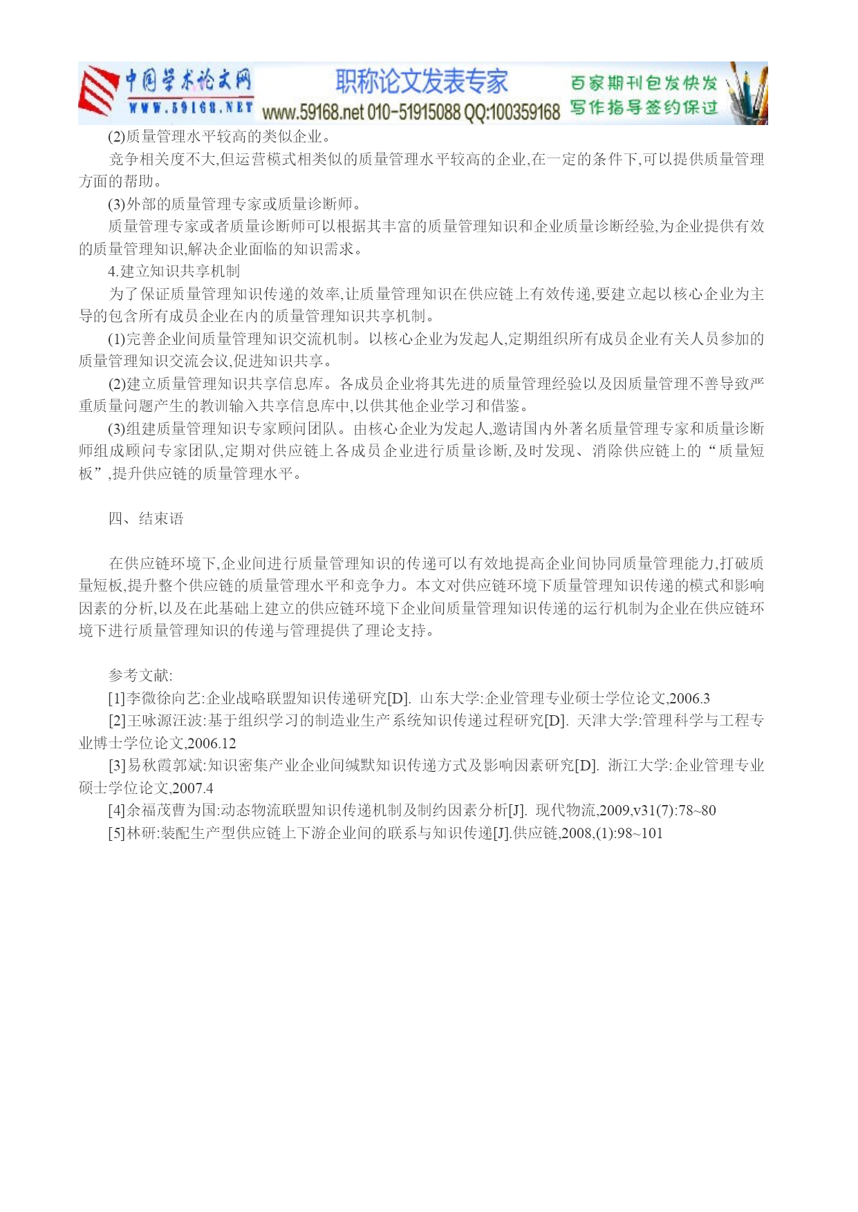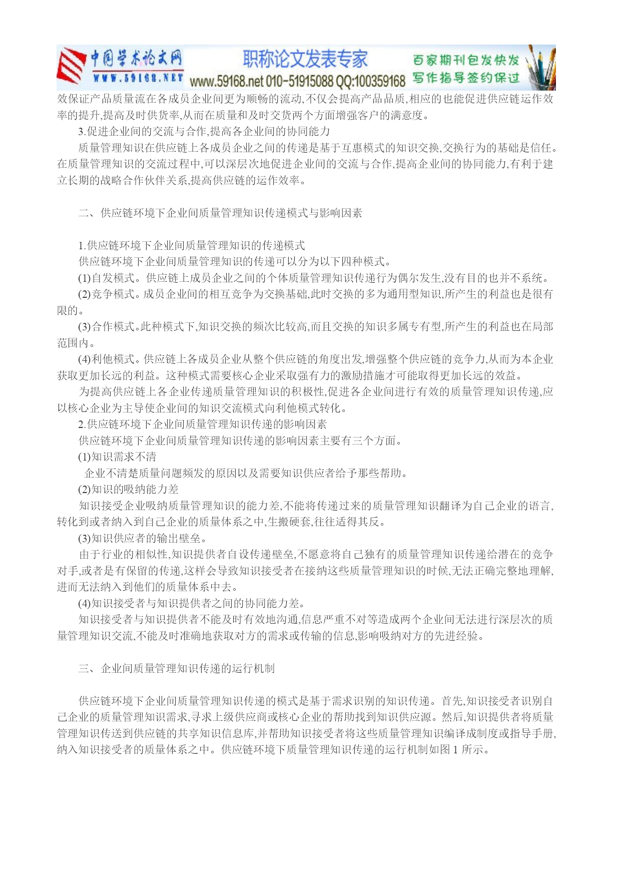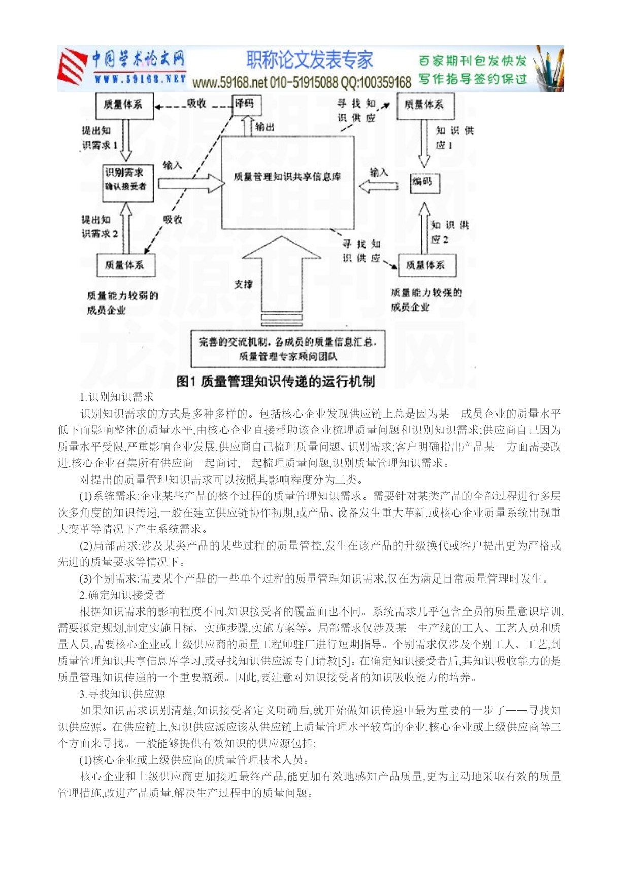 企业质量管理论文:供应链环境下企业间质量管理知识传递分析[摘要]企业间质量管理知识传递是供应链质量管理的主要研究内容之一。本文提出供应链环境下企业间质量管理知识传递的目标是打破“质量短板”,加强企业间协同质量管理,并从识别知识需求、确认知识接受者、寻找知识供应源、构建共享机制等几个方面构建了供应链环境下企业间质量管理知识传递的运行机制。[关键词]供应链质量管理质量管理知识传递质量短板全球化、信息化、网络化的迅速推进,使企业赢得竞争优势的关键资源从传统的资本、劳动力和土地等有形资源迅速地转向知识、信誉、专利等无形资源,市场竞争的焦点从已有产品的成本竞争转向对市场需求的快速反应和知识创新的竞争。知识管理在企业经营能力等方面的作用日益凸显,供应链上企业间有效的知识共享不仅能够促进企业发展,提升企业核心竞争力,更能提高整个供应链的协同效益,从而增强供应链的竞争力。企业间质量管理知识共享成为供应链上协同质量管理的关键内容之一。它可以有效消除供应链上的“质量短板”,提高供应链上各成员企业的协同质量管理效率,强化各成员企业的竞争优势,提升整个供应链的质量水平,增强整个供应链竞争能力。本文系统地阐述了供应链环境下质量管理知识传递的目标、模式、影响因素和传递步骤等,对供应链环境下企业质量间知识的传递进行了有益的探索。一、质量管理知识传递的概念和意义知识传递是由Teece首先提出的,他认为通过技术的国际转移能够帮助企业积累有价值的知识并促进技术扩散,从而缩小地区之间的技术差距。Nonaka认为知识管理中最重要的一个领域之一就是不同单元之间的知识传递。美国著名知识管理专家Davenport和Prusark认为,知识传递是把知识从知识源转移到其他人或部门的过程。美国知识管理学者SueNewell等人认为,知识转移时对组织中个人或群体创造的知识的再利用的过程。董小英从扩展知识价值的角度认为,知识转移就是把实践证明有效的知识或技能应用到不同的环境中,以提高知识的产出和应用规模的过程。尽管对于知识传递尚无统一的定义,但知识传递包含有价值的知识在不同个体或组织之间的有效交流,促进知识扩散,使得有知识需求的组织或个体通过吸纳这些有价值的知识,促进自身能力的提高,或提高组织的经济效益和运作效率等内容。因此,可以认为供应链环境下的质量管理知识传递就是企业间通过能够帮助其积累有价值的质量管理知识的转移,促进先进质量管理技术的扩散与应用,从而缩小供应链上各企业间质量管理的差距,提高质量协同能力,进而提升整个供应链的质量管理水平。质量管理知识的在供应链上各成员企业之间的传递,对各成员企业乃至整个供应链的意义主要表现在以下三个方面。1.提升各成员企业的质量管理水平,避免出现“质量短板”由于供应链上各成员企业拥有的质量管理知识参差不齐导致其质量管理水平各异,质量管理知识不足的企业成为“质量短板”,降低了整个供应链的质量水平。质量管理知识不足的企业通过吸纳供应链上其它企业所传递的质量管理知识,不断提升自身质量管理水平,消除供应链的“质量短板”,提升供应链整体的质量管理的能力与水平,创造出1+1>2的集体效应。质量管理知识在供应链上各成员企业之间的传递是互惠模式的知识交换,它使得某个成员企业所独有的质量管理知识被放大成为供应链质量管理知识的一部分,使供应链上所有企业都不同程度的受益。知识提供者能够在质量管理知识的传递过程中提炼和升华所拥有的隐性知识,促成隐性知识的显性化、制度化,在企业内部得到更广泛的应用。2.提高产品质量,增强客户满意度质量管理知识在供应链上各成员企业间的传递可以有效提高各成员企业的质量管理水平,进而可以有效保证产品质量流在各成员企业间更为顺畅的流动,不仅会提高产品品质,相应的也能促进供应链运作效率的提升,提高及时供货率,从而在质量和及时交货两个方面增强客户的满意度。3.促进企业间的交流与合作,提高各企业间的协同能力质量管理知识在供应链上各成员企业之间的传递是基于互惠模式的知识交换,交换行为的基础是信任。在质量管理知识的交流过程中,可以深层次地促进企业间的交流与合作,提高企业间的协同能力,有利于建立长期的战略合作伙伴关系,提高供应链的运作效率。二、供应链环境下企业间质量管理知识传递模式与影响因素1.供应链环境下企业间质量管理知识的传递模式供应链环境下企业间质量管理知识的传递可以分为以下四种模式。(1)自发模式。供应链上成员企业之间的个体质量管理知识传递行为偶尔发生,没有目的也并不系统。(2)竞争模式。成员企业间的相互竞争为交换基础,此时交换的多为通用型知识,所产生的利益也是很有限的。(3)合作模式。此种模式下,知识交换的频次比较高,而且交换的知识多属专有型,所产生的利益也在局部范围内。(4)利他模式。供应链上各成员企业从整个供应链的角度出发,增强整个供
