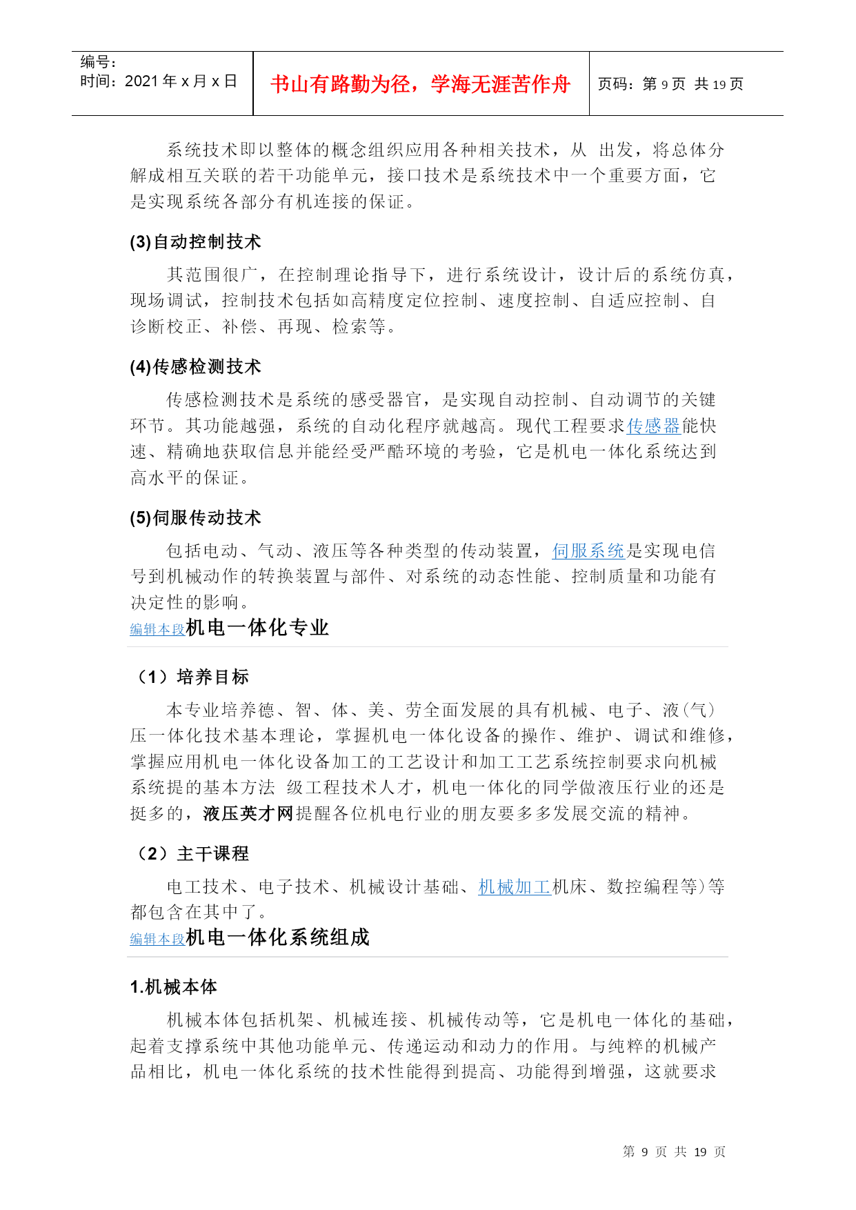 编号:时间:2021年x月x日书山有路勤为径,学海无涯苦作舟页码:第PAGE19页共NUMPAGES19页第PAGE\*MERGEFORMAT19页共NUMPAGES\*MERGEFORMAT19页机械科技名词定义中文名称:机械英文名称:machinery定义:机器与机构的总称。所属学科:HYPERLINK"http://baike.baidu.com/view/21354.htm"\t"_blank"机械工程(一级学科);HYPERLINK"http://baike.baidu.com/view/71542.htm"\t"_blank"机构学(二级学科);机构学一般名词(三级学科)本内容由HYPERLINK"http://baike.baidu.com/view/1490464.htm"\t"_blank"全国科学技术名词审定委员会审定公布目录HYPERLINK"http://baike.baidu.com/view/15257.html?wtp=tt"\l"1"词语解释HYPERLINK"http://baike.baidu.com/view/15257.html?wtp=tt"\l"1_1"基本信息HYPERLINK"http://baike.baidu.com/view/15257.html?wtp=tt"\l"1_2"释义HYPERLINK"http://baike.baidu.com/view/15257.html?wtp=tt"\l"2"简介HYPERLINK"http://baike.baidu.com/view/15257.html?wtp=tt"\l"3"机械的的概念HYPERLINK"http://baike.baidu.com/view/15257.html?wtp=tt"\l"3_1"中文概念HYPERLINK"http://baike.baidu.com/view/15257.html?wtp=tt"\l"3_2"西方概念HYPERLINK"http://baike.baidu.com/view/15257.html?wtp=tt"\l"4"机械的特征HYPERLINK"http://baike.baidu.com/view/15257.html?wtp=tt"\l"5"机械的定义HYPERLINK"http://baike.baidu.com/view/15257.html?wtp=tt"\l"5_1"1通常的解释HYPERLINK"http://baike.baidu.com/view/15257.html?wtp=tt"\l"5_2"2重要性的解释HYPERLINK"http://baike.baidu.com/view/15257.html?wtp=tt"\l"5_3"3、英语的解释HYPERLINK"http://baike.baidu.com/view/15257.html?wtp=tt"\l"5_4"4、相关的词汇HYPERLINK"http://baike.baidu.com/view/15257.html?wtp=tt"\l"5_5"5、机械设计手册HYPERLINK"http://baike.baidu.com/view/15257.html?wtp=tt"\l"6"机械工程的内容HYPERLINK"http://baike.baidu.com/view/15257.html?wtp=tt"\l"7"机械工程分类HYPERLINK"http://baike.baidu.com/view/15257.html?wtp=tt"\l"8"机电一体化的含义HYPERLINK"http://baike.baidu.com/view/15257.html?wtp=tt"\l"9"机电一体化技术具体包括HYPERLINK"http://baike.baidu.com/view/15257.html?wtp=tt"\l"9_1"(1)机械技术HYPERLINK"http://baike.baidu.com/view/15257.html?wtp=tt"\l"9_2"(2)系统技术HYPERLINK"http://baike.baidu.com/view/15257.html?wtp=tt"\l"9_3"(3)自动控制技术HYPERLINK"http://baike.baidu.com/view/15257.html?wtp=tt"\l"9_4"(4)传