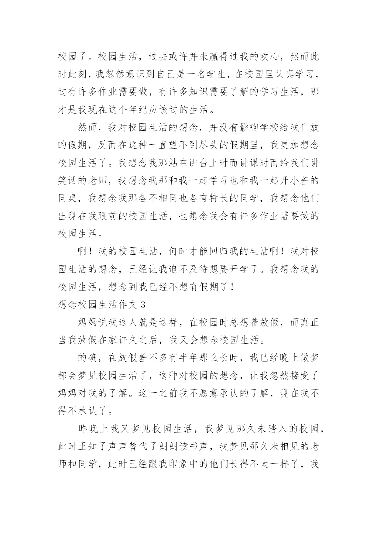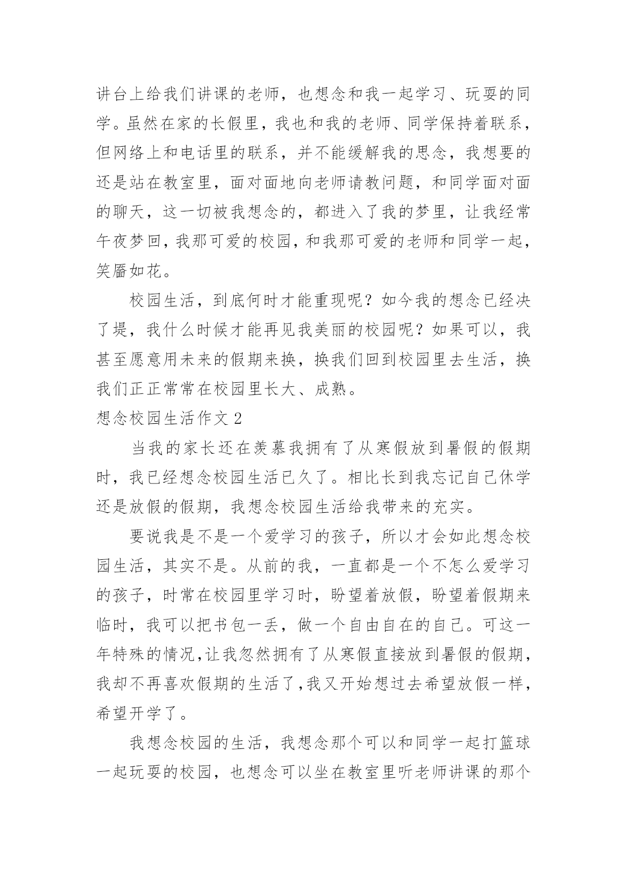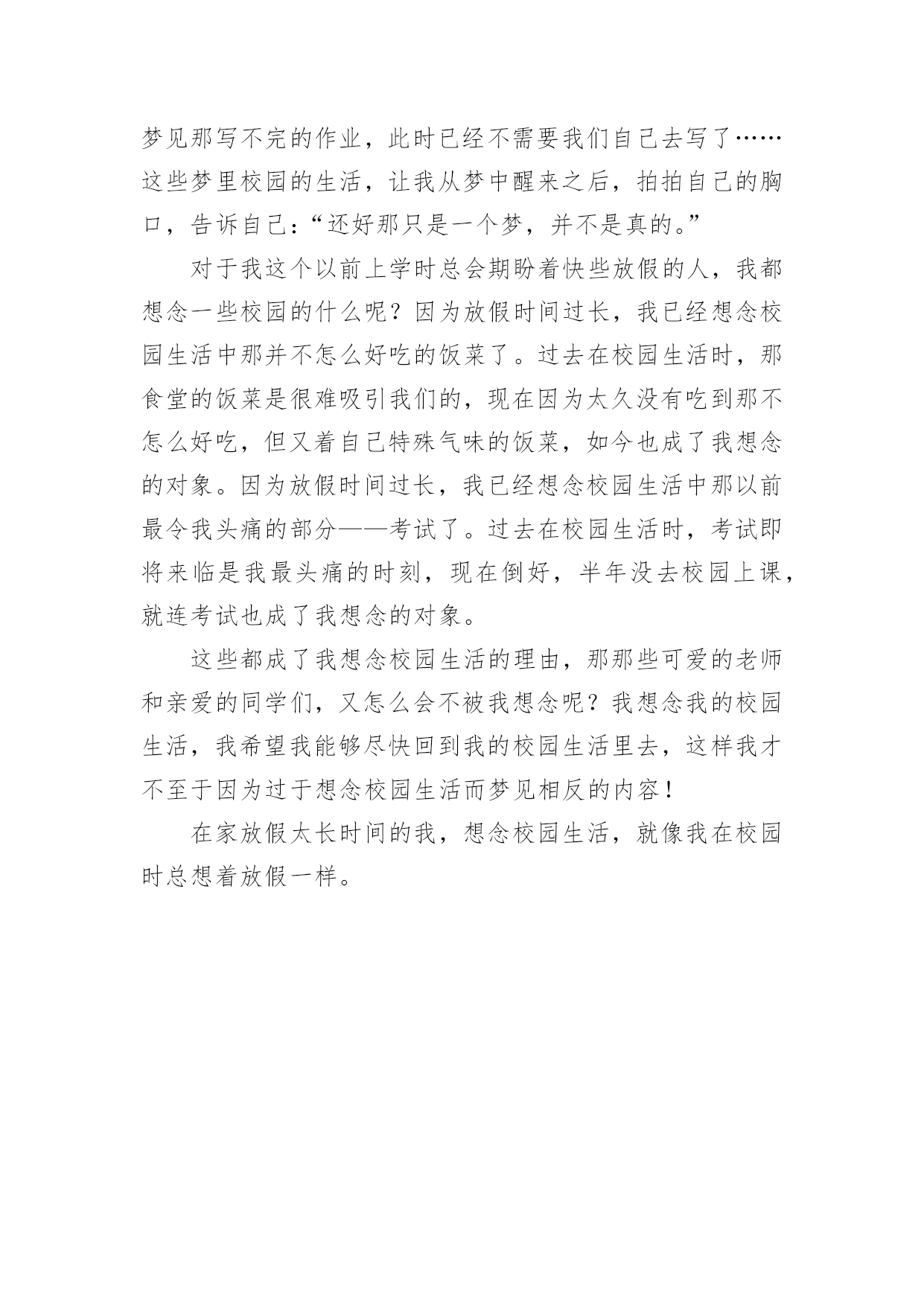 想念校园生活作文想念校园生活作文在日常学习、工作抑或是生活中,大家都有写作文的经历,对作文很是熟悉吧,作文可分为小学作文、中学作文、大学作文(论文)。你所见过的作文是什么样的呢?以下是小编整理的想念校园生活作文,仅供参考,希望能够帮助到大家。想念校园生活作文1曾经的我,想念在家的假期是我的日常生活,如今的我,想念校园生活是我的日常生活。这两种想念已经占据了我的其他日常,成为了我生活中的常态,成为了我生活中的必须。曾经的我,想念在家的假期,多数情况就是偷懒不想学习了,想着在家过一个悠然自得的寒假或者暑假,忘记校园,忘记学习,忘记这些已经让我有点累的一切。因为今年情况的特殊,在家的假期和校园生活反了过来。从过年到现在,我们的寒假都放到了暑假,什么时候开学成了一个谜,我这个想念假期的人,又开始转变过来想念校园生活了,而且这种想念,有了比想念假期更加强烈的感觉。我想,这都是因为太久没有跨入校园了吧!如今的我,想念校园里的一切。我想念我最爱去的樟树林,也想念校园里花花草草的美丽,我想念校园里一幢幢静穆的.教学楼,也想念校园里窗明几净的教室,我想念站在讲台上给我们讲课的老师,也想念和我一起学习、玩耍的同学。虽然在家的长假里,我也和我的老师、同学保持着联系,但网络上和电话里的联系,并不能缓解我的思念,我想要的还是站在教室里,面对面地向老师请教问题,和同学面对面的聊天,这一切被我想念的,都进入了我的梦里,让我经常午夜梦回,我那可爱的校园,和我那可爱的老师和同学一起,笑靥如花。校园生活,到底何时才能重现呢?如今我的想念已经决了堤,我什么时候才能再见我美丽的校园呢?如果可以,我甚至愿意用未来的假期来换,换我们回到校园里去生活,换我们正正常常在校园里长大、成熟。想念校园生活作文2当我的家长还在羡慕我拥有了从寒假放到暑假的假期时,我已经想念校园生活已久了。相比长到我忘记自己休学还是放假的假期,我想念校园生活给我带来的充实。要说我是不是一个爱学习的孩子,所以才会如此想念校园生活,其实不是。从前的我,一直都是一个不怎么爱学习的孩子,时常在校园里学习时,盼望着放假,盼望着假期来临时,我可以把书包一丢,做一个自由自在的自己。可这一年特殊的情况,让我忽然拥有了从寒假直接放到暑假的假期,我却不再喜欢假期的生活了,我又开始想过去希望放假一样,希望开学了。我想念校园的生活,我想念那个可以和同学一起打篮球一起玩耍的校园,也想念可以坐在教室里听老师讲课的那个校园了。校园生活,过去或许并未赢得过我的欢心,然而此时此刻,我忽然意识到自己是一名学生,在校园里认真学习,过有许多作业需要做,有许多知识需要了解的学习生活,那才是我现在这个年纪应该过的生活。然而,我对校园生活的想念,并没有影响学校给我们放的假期,反而在这种一直望不到尽头的假期里,我更加想念校园生活了。我想念我那站在讲台上时而讲课时而给我们讲笑话的老师,我想念我那和我一起学习也和我一起开小差的同桌,我想念我那各不相同也各有特长的同学,我想念他们出现在我眼前的校园生活,也想念我会有许多作业需要做的校园生活。啊!我的校园生活,何时才能回归我的生活啊!我对校园生活的想念,已经让我迫不及待想要开学了。我想念我的校园生活,想念到我已经不想有假期了!想念校园生活作文3妈妈说我这人就是这样,在校园时总想着放假,而真正当我放假在家许久之后,我又会想念校园生活。的确,在放假差不多有半年那么长时,我已经晚上做梦都会梦见校园生活了,这种对校园的想念,让我忽然接受了妈妈对我的了解。这一之前我不愿意承认的了解,现在我不得不承认了。昨晚上我又梦见校园生活,我梦见那久未踏入的校园,此时正知了声声替代了朗朗读书声,我梦见那久未相见的老师和同学,此时已经跟我印象中的他们长得不太一样了,我梦见那写不完的作业,此时已经不需要我们自己去写了……这些梦里校园的生活,让我从梦中醒来之后,拍拍自己的胸口,告诉自己:“还好那只是一个梦,并不是真的。”对于我这个以前上学时总会期盼着快些放假的人,我都想念一些校园的什么呢?因为放假时间过长,我已经想念校园生活中那并不怎么好吃的饭菜了。过去在校园生活时,那食堂的饭菜是很难吸引我们的,现在因为太久没有吃到那不怎么好吃,但又着自己特殊气味的饭菜,如今也成了我想念的对象。因为放假时间过长,我已经想念校园生活中那以前最令我头痛的部分——考试了。过去在校园生活时,考试即将来临是我最头痛的时刻,现在倒好,半年没去校园上课,就连考试也成了我想念的对象。这些都成了我想念校园生活的理由,那那些可爱的老师和亲爱的同学们,又怎么会不被我想念呢?我想念我的校园生活,我希望我能够尽快回到我的校园生活里去,这样我才不至于因为过于想念校园生活而梦见相反的内容!在家放假太长时间的我,想念校园生活,就像我在校园时总想着放假一样。