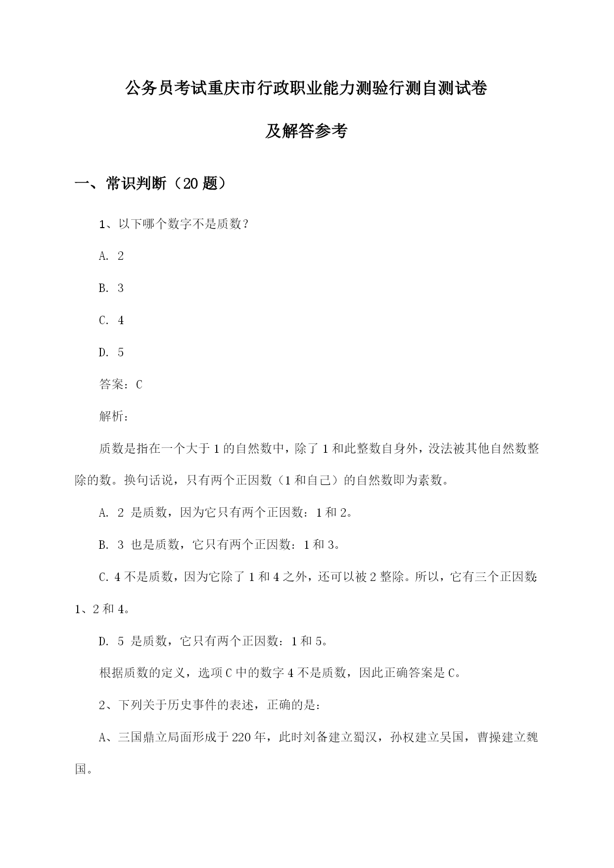 公务员考试重庆市行政职业能力测验行测自测试卷及解答参考.docx
