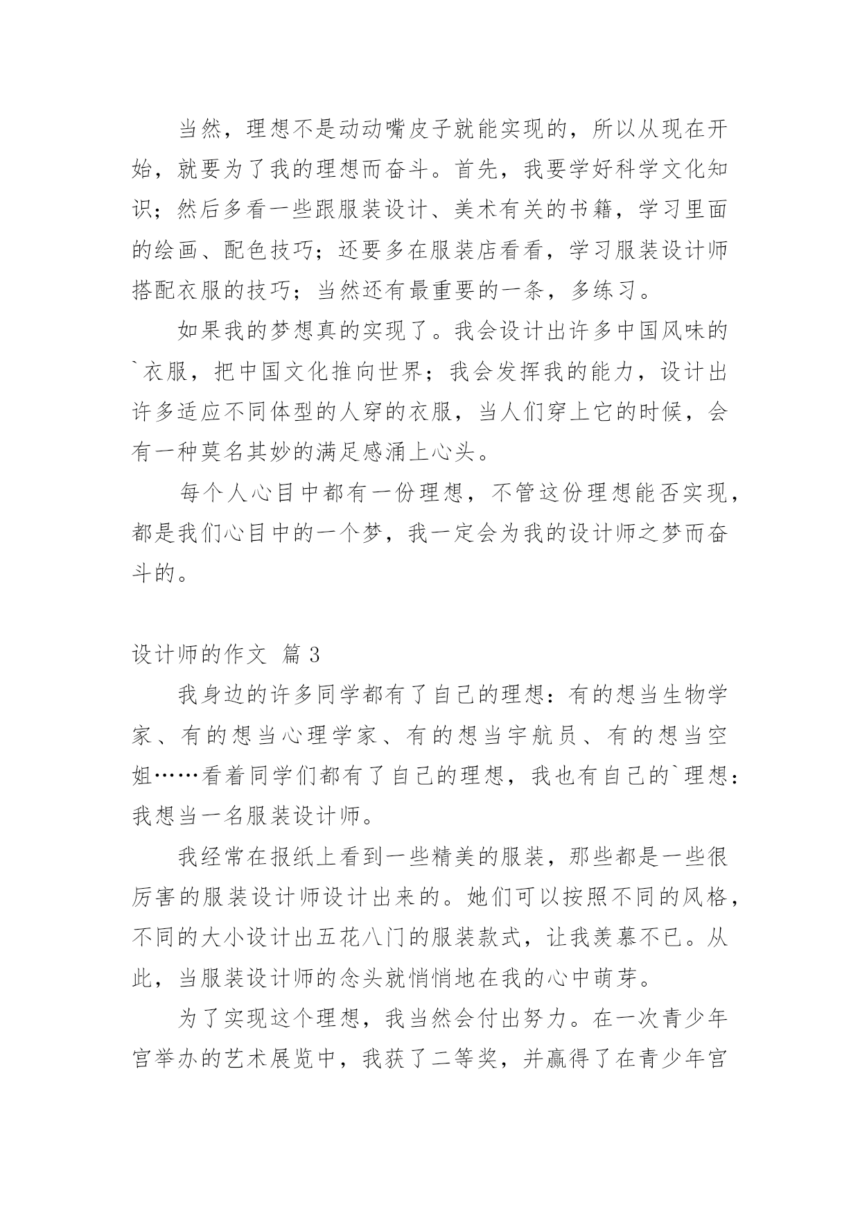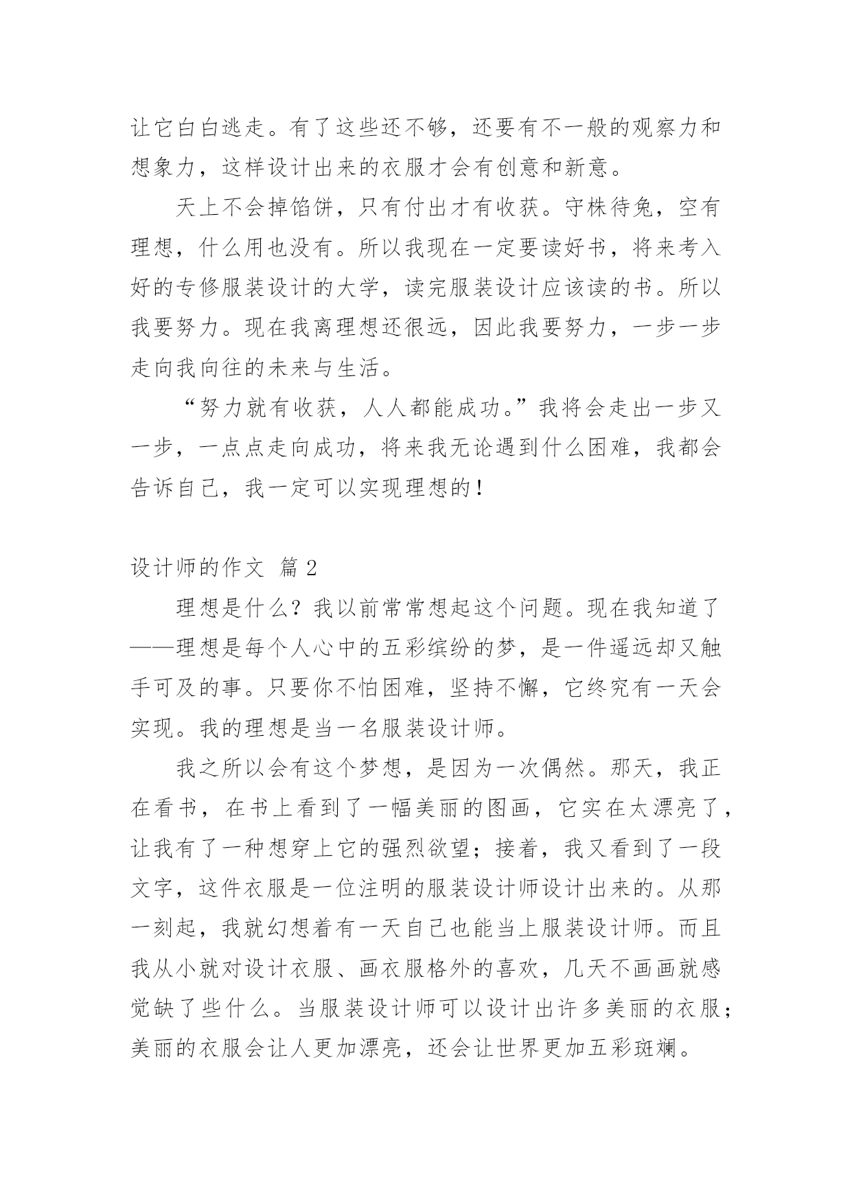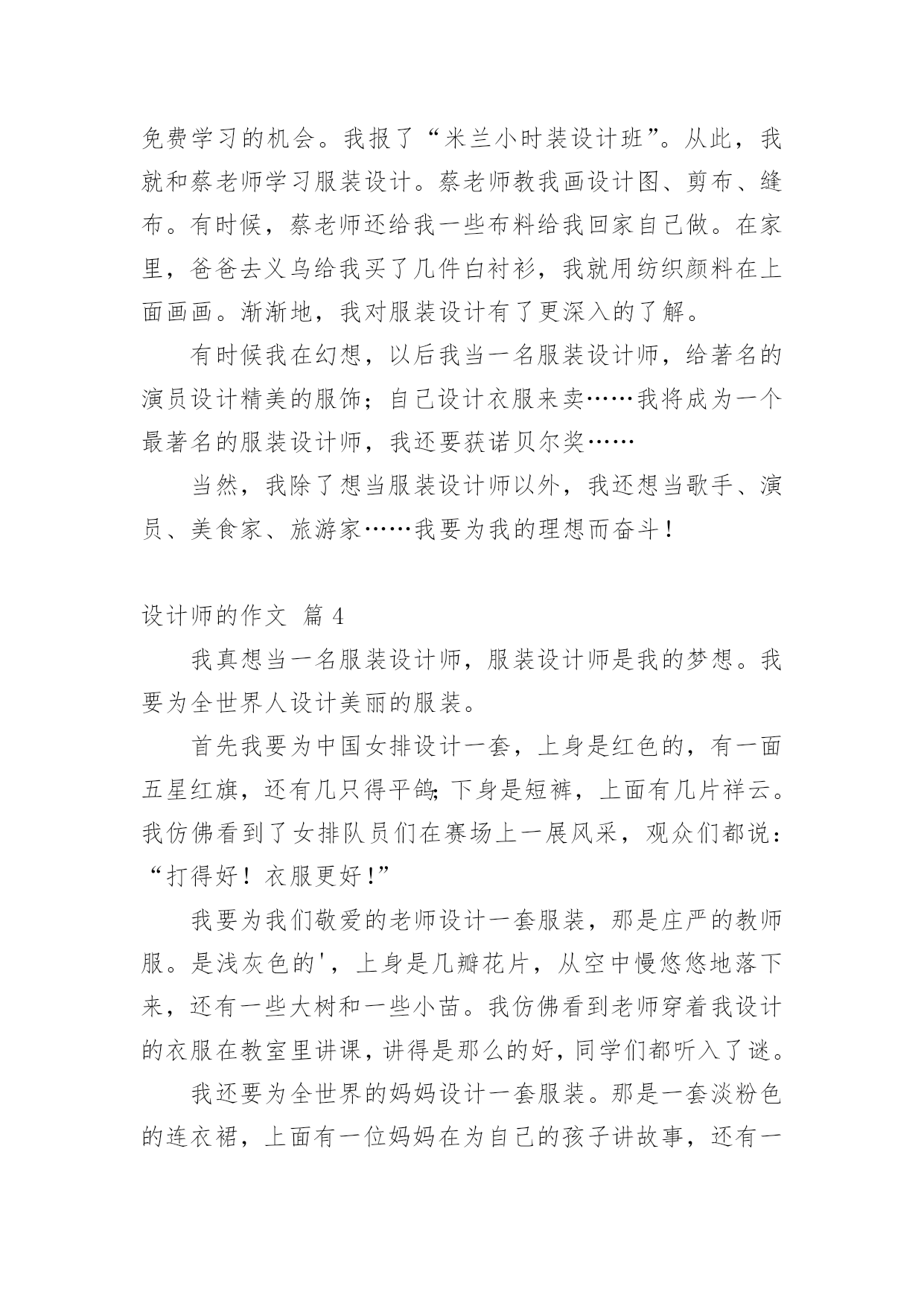设计师的作文设计师的作文4篇(优选)无论是身处学校还是步入社会,大家总少不了接触作文吧,作文要求篇章结构完整,一定要避免无结尾作文的出现。那么一般作文是怎么写的呢?下面是小编为大家收集的设计师的作文4篇,仅供参考,欢迎大家阅读。设计师的作文篇1每个人都有自己的理想,当然我也不会例外。在我那小小的百宝箱里,有着许多五彩缤纷的记忆和理想。我的理想有很多,比如说成为一个美食家、旅游家、作家等等。可最闪亮,也是我最想实现的还是那个成为服装设计师的理想。它就像一棵大树,高大笔挺,深深地扎根在我的心中。从小我就喜欢画画。自从我会拿笔,我就会在纸上乱涂乱画,虽然画出来的东西连我自己也看不懂。可正是这样,为我走向我的理想——服装设计师而搭建好爬上去的梯子。每当我看着电视里的T台模特穿着设计师精心设计的具有创意而美丽的衣服向世人展示服装的魅力和服装设计的概念,把一个又一个的'设计师推上服装的舞台,从那时我就决定要当一个服装设计师。走服装设计师这条路先要具备很深厚的美术功底,其次还要拥有设计师所具备的反应能力,能把心里所想的图像很快地画在纸上。因为灵感会一下子从脑子里溜走,千万不能让它白白逃走。有了这些还不够,还要有不一般的观察力和想象力,这样设计出来的衣服才会有创意和新意。天上不会掉馅饼,只有付出才有收获。守株待兔,空有理想,什么用也没有。所以我现在一定要读好书,将来考入好的专修服装设计的大学,读完服装设计应该读的书。所以我要努力。现在我离理想还很远,因此我要努力,一步一步走向我向往的未来与生活。“努力就有收获,人人都能成功。”我将会走出一步又一步,一点点走向成功,将来我无论遇到什么困难,我都会告诉自己,我一定可以实现理想的!设计师的作文篇2理想是什么?我以前常常想起这个问题。现在我知道了——理想是每个人心中的五彩缤纷的梦,是一件遥远却又触手可及的事。只要你不怕困难,坚持不懈,它终究有一天会实现。我的理想是当一名服装设计师。我之所以会有这个梦想,是因为一次偶然。那天,我正在看书,在书上看到了一幅美丽的图画,它实在太漂亮了,让我有了一种想穿上它的强烈欲望;接着,我又看到了一段文字,这件衣服是一位注明的服装设计师设计出来的。从那一刻起,我就幻想着有一天自己也能当上服装设计师。而且我从小就对设计衣服、画衣服格外的喜欢,几天不画画就感觉缺了些什么。当服装设计师可以设计出许多美丽的衣服;美丽的衣服会让人更加漂亮,还会让世界更加五彩斑斓。当然,理想不是动动嘴皮子就能实现的,所以从现在开始,就要为了我的理想而奋斗。首先,我要学好科学文化知识;然后多看一些跟服装设计、美术有关的书籍,学习里面的绘画、配色技巧;还要多在服装店看看,学习服装设计师搭配衣服的技巧;当然还有最重要的一条,多练习。如果我的梦想真的实现了。我会设计出许多中国风味的`衣服,把中国文化推向世界;我会发挥我的能力,设计出许多适应不同体型的人穿的衣服,当人们穿上它的时候,会有一种莫名其妙的满足感涌上心头。每个人心目中都有一份理想,不管这份理想能否实现,都是我们心目中的一个梦,我一定会为我的设计师之梦而奋斗的。设计师的作文篇3我身边的许多同学都有了自己的理想:有的想当生物学家、有的想当心理学家、有的想当宇航员、有的想当空姐……看着同学们都有了自己的理想,我也有自己的`理想:我想当一名服装设计师。我经常在报纸上看到一些精美的服装,那些都是一些很厉害的服装设计师设计出来的。她们可以按照不同的风格,不同的大小设计出五花八门的服装款式,让我羡慕不已。从此,当服装设计师的念头就悄悄地在我的心中萌芽。为了实现这个理想,我当然会付出努力。在一次青少年宫举办的艺术展览中,我获了二等奖,并赢得了在青少年宫免费学习的机会。我报了“米兰小时装设计班”。从此,我就和蔡老师学习服装设计。蔡老师教我画设计图、剪布、缝布。有时候,蔡老师还给我一些布料给我回家自己做。在家里,爸爸去义乌给我买了几件白衬衫,我就用纺织颜料在上面画画。渐渐地,我对服装设计有了更深入的了解。有时候我在幻想,以后我当一名服装设计师,给著名的演员设计精美的服饰;自己设计衣服来卖……我将成为一个最著名的服装设计师,我还要获诺贝尔奖……当然,我除了想当服装设计师以外,我还想当歌手、演员、美食家、旅游家……我要为我的理想而奋斗!设计师的作文篇4我真想当一名服装设计师,服装设计师是我的梦想。我要为全世界人设计美丽的服装。首先我要为中国女排设计一套,上身是红色的,有一面五星红旗,还有几只得平鸽;下身是短裤,上面有几片祥云。我仿佛看到了女排队员们在赛场上一展风采,观众们都说:“打得好!衣服更好!”我要为我们敬爱的老师设计一套服装,那是庄严的教师服。是浅灰色的',上身是几瓣花片,从空中慢悠悠地落下来,还有一些大树和一些小苗。我仿佛看到老师穿着我设计的衣服在教室里讲课,