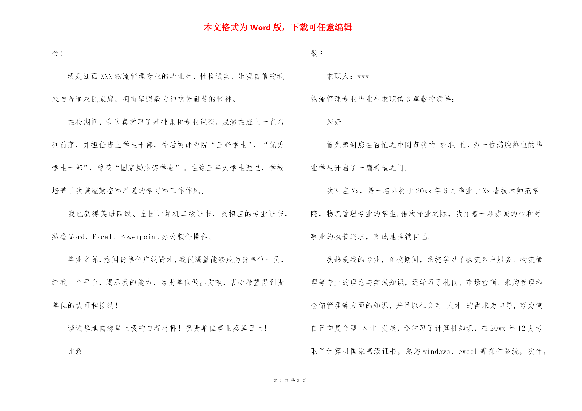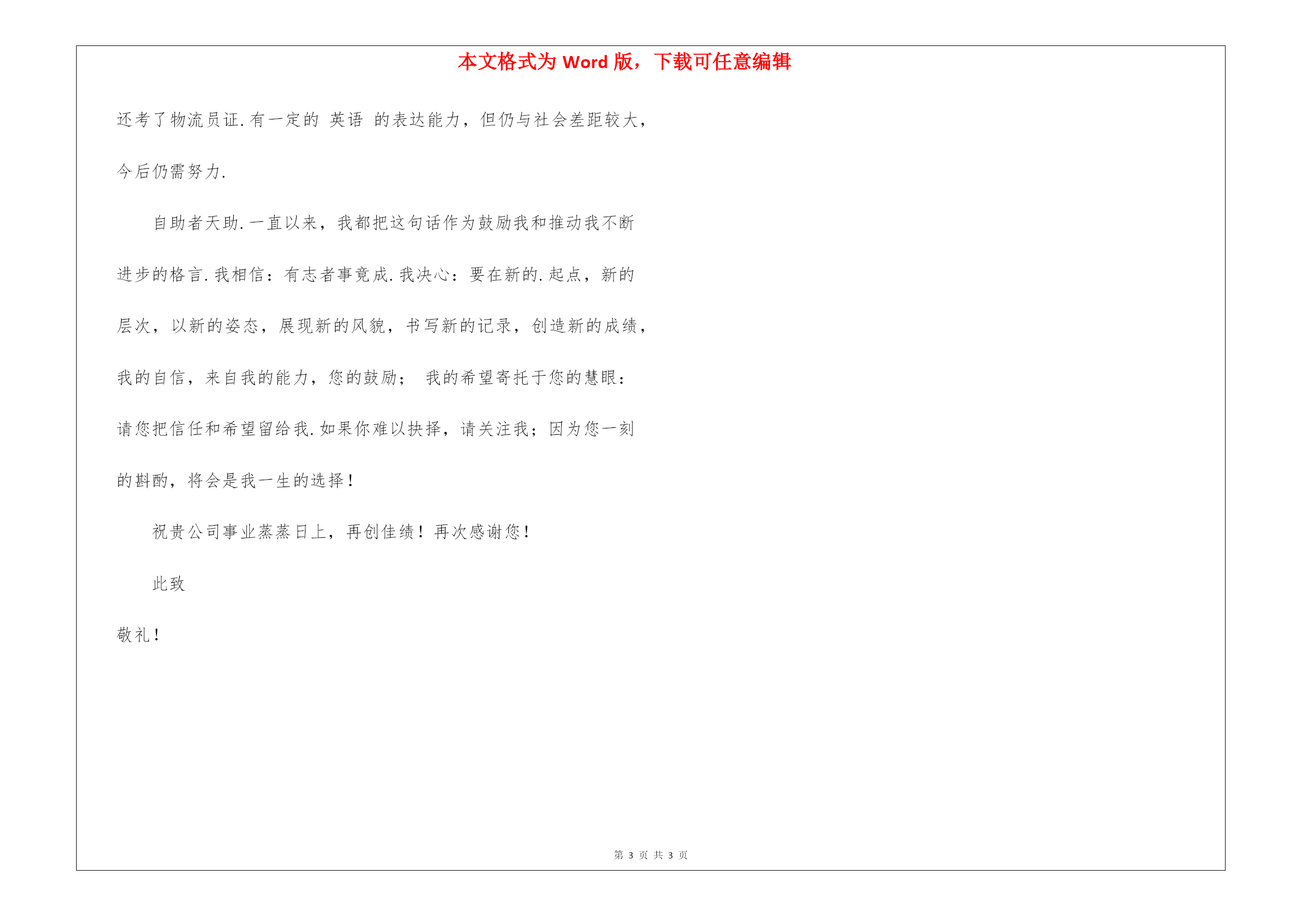 本文格式为Word版,下载可任意编辑第PAGE\*MERGEFORMAT3页共NUMPAGES\*MERGEFORMAT3页物流管理专业毕业生求职信物流管理专业毕业生求职信时间是箭,去来迅疾,找工作对于我们说已越来越近,这时候需要提前写好求职信了哦。求职信怎么写才能具有特色?以下是我整理的物流管理专业毕业生求职信,仅供参考,大家一起来看看吧。物流管理专业毕业生求职信1尊敬的领导:您好!我写此信是为应聘贵公司xxx职位,很高兴在网上看到您的招聘信息,并一直期望加盟贵公司。我即将毕业于西安财经学院,在校期间我学习了很多知识,如报关实务,国际贸易,供应链管理,国际物流,国际货运代理,企业战略管理仓储与配送管理,物流信息管理,采购管理,财务管理,生产与运作管理,企业管理(物流)组织行为学,市场营销,经济学原理物,流学概论,统计学原理,会计学原理,管理学原理等课程。还参加了学校组织的第三方物流实训,物流流程实训,物流实务实训,仓储业务实训,网上模拟综合实训等实训操作课,本人具备一定的管理和策划能力,熟悉各种办公软件的操作。个人简历和其他材料已于附件,我十分希望能成为贵公司的有力竞争者,并希望收到面试通知,电话:xxxx111感谢您阅读此信并考虑我的应聘要求!此致敬礼求职者:xxxx物流管理专业毕业生求职信2尊敬的领导:您好!首先,真诚地感谢您在百忙之中展开这封信,给我一个求职的机会!我是江西XXX物流管理专业的毕业生,性格诚实,乐观自信的我来自普通农民家庭,拥有坚强毅力和吃苦耐劳的精神。在校期间,我认真学习了基础课和专业课程,成绩在班上一直名列前茅,并担任班上学生干部,先后被评为院“三好学生”,“优秀学生干部”,曾获“国家励志奖学金”。在这三年大学生涯里,学校培养了我谦虚勤奋和严谨的学习和工作作风。我已获得英语四级、全国计算机二级证书,及相应的专业证书,熟悉Word、Excel、Powerpoint办公软件操作。毕业之际,悉闻贵单位广纳贤才,我很渴望能够成为贵单位一员,给我一个平台,竭尽我的能力,为贵单位做出贡献,衷心希望得到贵单位的认可和接纳!谨诚挚地向您呈上我的自荐材料!祝贵单位事业蒸蒸日上!此致敬礼求职人:xxx物流管理专业毕业生求职信3尊敬的领导:您好!首先感谢您在百忙之中阅览我的求职信,为一位满腔热血的毕业学生开启了一扇希望之门.我叫庄Xx,是一名即将于20xx年6月毕业于Xx省技术师范学院,物流管理专业的学生.借次择业之际,我怀着一颗赤诚的心和对事业的执着追求,真诚地推销自己.我热爱我的专业,在校期间,系统学习了物流客户服务、物流管理等专业的理论与实践知识,还学习了礼仪、市场营销、采购管理和仓储管理等方面的知识,并且以社会对人才的需求为向导,努力使自己向复合型人才发展,还学习了计算机知识,在20xx年12月考取了计算机国家高级证书,熟悉windows、excel等操作系统,次年,还考了物流员证.有一定的英语的表达能力,但仍与社会差距较大,今后仍需努力.自助者天助.一直以来,我都把这句话作为鼓励我和推动我不断进步的格言.我相信:有志者事竟成.我决心:要在新的.起点,新的层次,以新的姿态,展现新的风貌,书写新的记录,创造新的成绩,我的自信,来自我的能力,您的鼓励;我的希望寄托于您的慧眼:请您把信任和希望留给我.如果你难以抉择,请关注我;因为您一刻的斟酌,将会是我一生的选择!祝贵公司事业蒸蒸日上,再创佳绩!再次感谢您!此致敬礼!