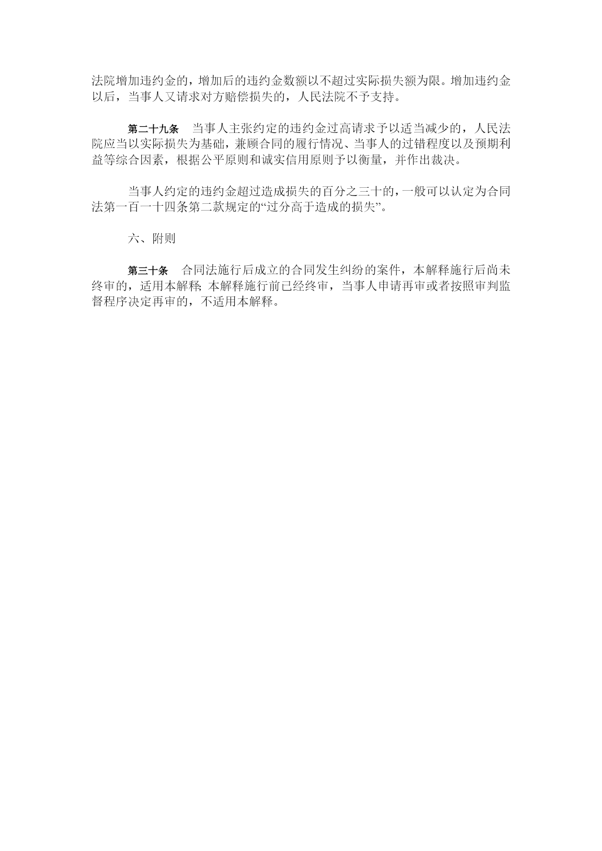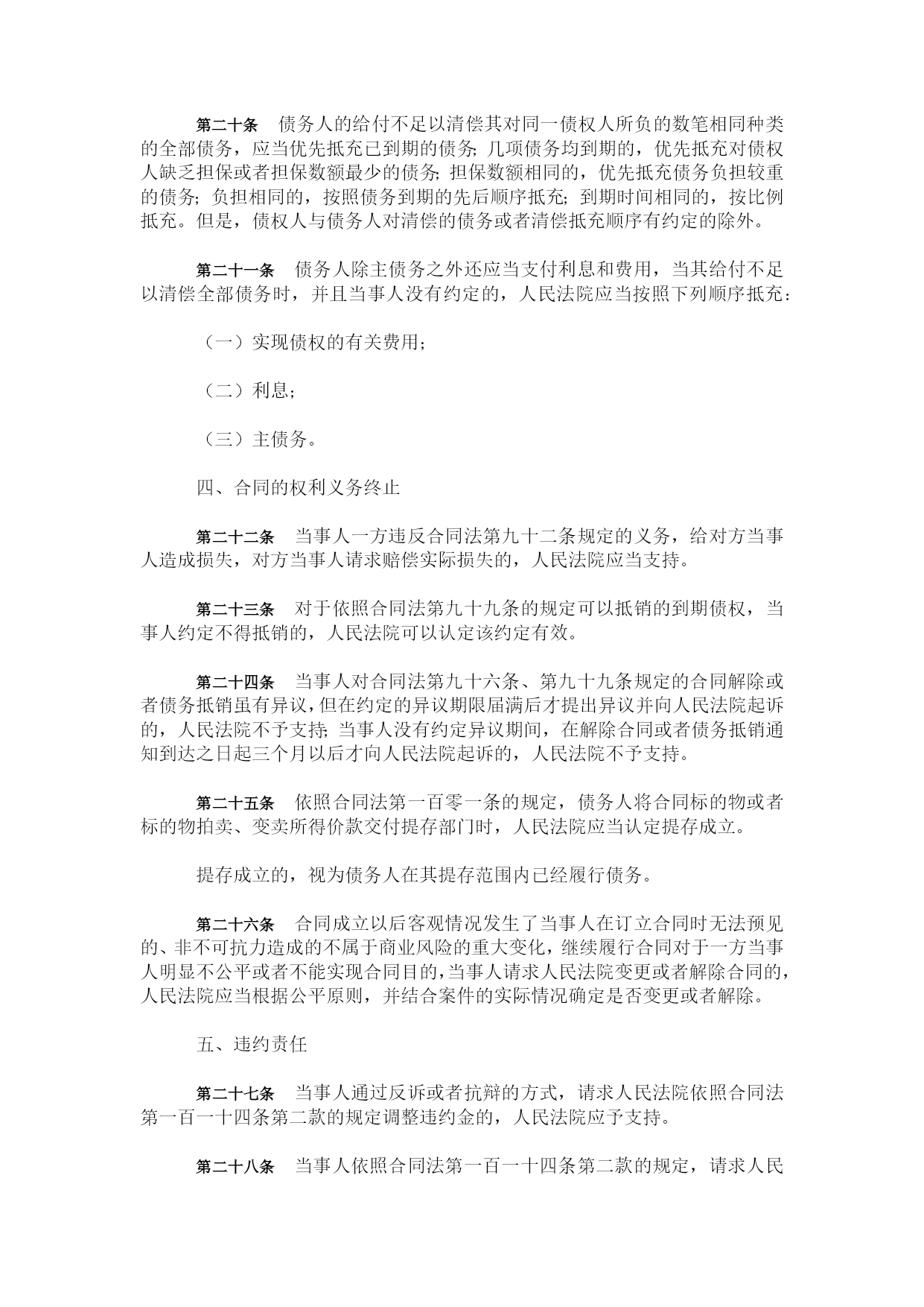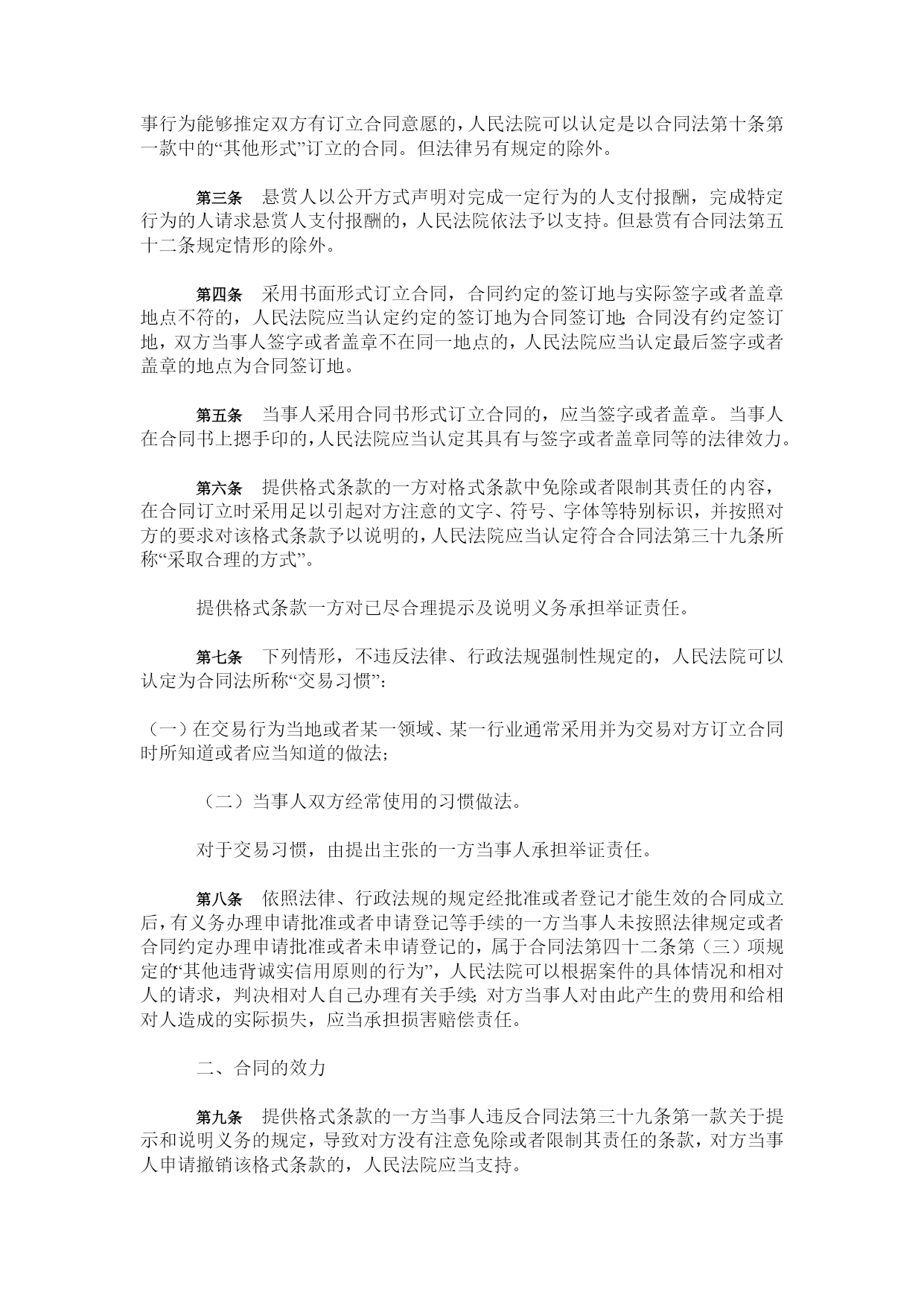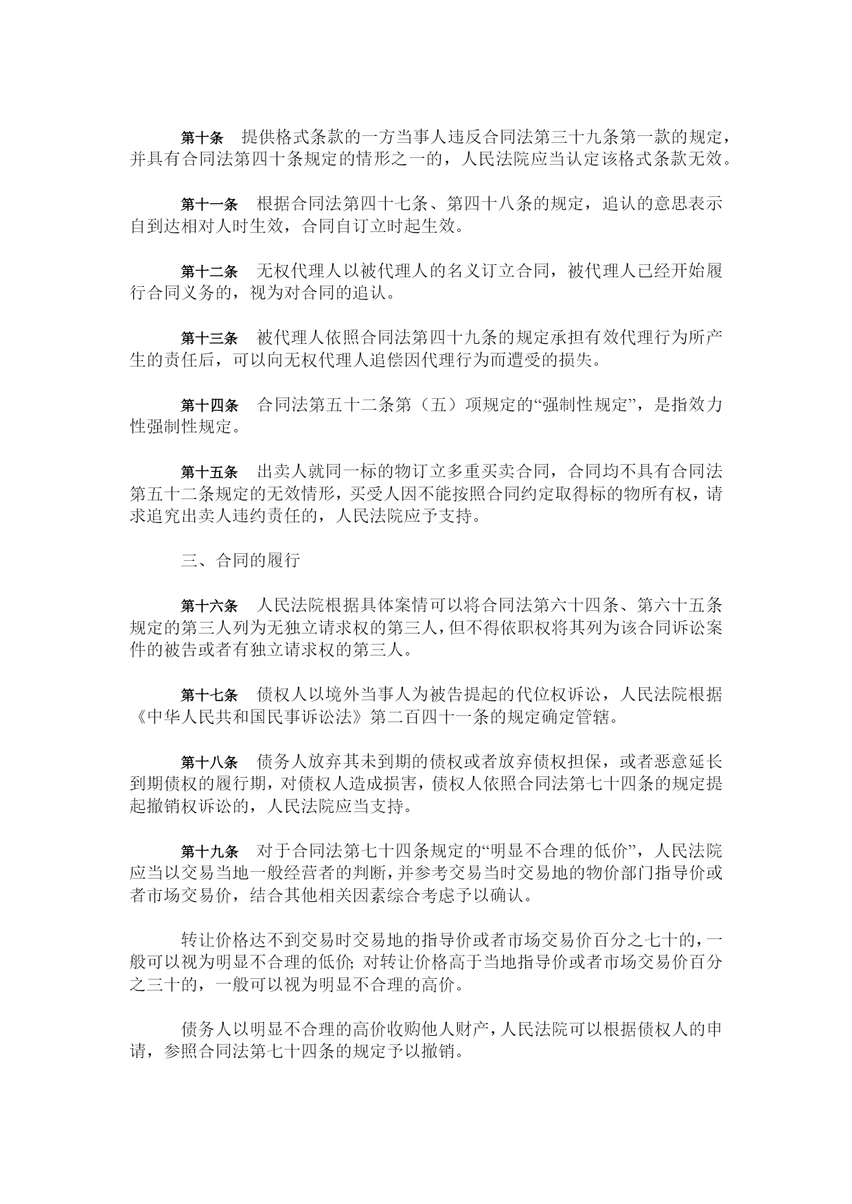 【发布单位】最高人民法院【发布文号】法释〔2009〕5号【发布日期】2009-04-24【生效日期】2009-05-13【失效日期】-----------【所属类别】国家法律法规【文件来源】HYPERLINK"http://rmfyb.chinacourt.org/public/detail.php?id=128300"\t"_blank"人民法院报最高人民法院关于适用《中华人民共和国合同法》若干问题的解释(二)(法释〔2009〕5号,2009年2月9日最高人民法院审判委员会第1462次会议通过)中华人民共和国最高人民法院公告《最高人民法院关于适用〈中华人民共和国合同法〉若干问题的解释(二)》已于2009年2月9日由最高人民法院审判委员会第1462次会议通过,现予公布,自2009年5月13日起施行。二○○九年四月二十四日为了正确审理合同纠纷案件,根据《HYPERLINK"javascript:ROF(32429,0)"中华人民共和国合同法》的规定,对人民法院适用合同法的有关问题作出如下解释:一、合同的订立第一条当事人对合同是否成立存在争议,人民法院能够确定当事人名称或者姓名、标的和数量的,一般应当认定合同成立。但法律另有规定或者当事人另有约定的除外。对合同欠缺的前款规定以外的其他内容,当事人达不成协议的,人民法院依照合同法第六十一条、第六十二条、第一百二十五条等有关规定予以确定。第二条当事人未以书面形式或者口头形式订立合同,但从双方从事的民事行为能够推定双方有订立合同意愿的,人民法院可以认定是以合同法第十条第一款中的“其他形式”订立的合同。但法律另有规定的除外。第三条悬赏人以公开方式声明对完成一定行为的人支付报酬,完成特定行为的人请求悬赏人支付报酬的,人民法院依法予以支持。但悬赏有合同法第五十二条规定情形的除外。第四条采用书面形式订立合同,合同约定的签订地与实际签字或者盖章地点不符的,人民法院应当认定约定的签订地为合同签订地;合同没有约定签订地,双方当事人签字或者盖章不在同一地点的,人民法院应当认定最后签字或者盖章的地点为合同签订地。第五条当事人采用合同书形式订立合同的,应当签字或者盖章。当事人在合同书上摁手印的,人民法院应当认定其具有与签字或者盖章同等的法律效力。第六条提供格式条款的一方对格式条款中免除或者限制其责任的内容,在合同订立时采用足以引起对方注意的文字、符号、字体等特别标识,并按照对方的要求对该格式条款予以说明的,人民法院应当认定符合合同法第三十九条所称“采取合理的方式”。提供格式条款一方对已尽合理提示及说明义务承担举证责任。第七条下列情形,不违反法律、行政法规强制性规定的,人民法院可以认定为合同法所称“交易习惯”:(一)在交易行为当地或者某一领域、某一行业通常采用并为交易对方订立合同时所知道或者应当知道的做法;(二)当事人双方经常使用的习惯做法。对于交易习惯,由提出主张的一方当事人承担举证责任。第八条依照法律、行政法规的规定经批准或者登记才能生效的合同成立后,有义务办理申请批准或者申请登记等手续的一方当事人未按照法律规定或者合同约定办理申请批准或者未申请登记的,属于合同法第四十二条第(三)项规定的“其他违背诚实信用原则的行为”,人民法院可以根据案件的具体情况和相对人的请求,判决相对人自己办理有关手续;对方当事人对由此产生的费用和给相对人造成的实际损失,应当承担损害赔偿责任。二、合同的效力第九条提供格式条款的一方当事人违反合同法第三十九条第一款关于提示和说明义务的规定,导致对方没有注意免除或者限制其责任的条款,对方当事人申请撤销该格式条款的,人民法院应当支持。第十条提供格式条款的一方当事人违反合同法第三十九条第一款的规定,并具有合同法第四十条规定的情形之一的,人民法院应当认定该格式条款无效。第十一条根据合同法第四十七条、第四十八条的规定,追认的意思表示自到达相对人时生效,合同自订立时起生效。第十二条无权代理人以被代理人的名义订立合同,被代理人已经开始履行合同义务的,视为对合同的追认。第十三条被代理人依照合同法第四十九条的规定承担有效代理行为所产生的责任后,可以向无权代理人追偿因代理行为而遭受的损失。第十四条合同法第五十二条第(五)项规定的“强制性规定”,是指效力性强制性规定。第十五条出卖人就同一标的物订立多重买卖合同,合同均不具有合同法第五十二条规定的无效情形,买受人因不能按照合同约定取得标的物所有权,请求追究出卖人违约责任的,人民法院应予支持。三、合同的履行第十六条人民法院根据具体案情可以将合同法第六十四条、第六十五条规定的第三人列为无独立请求权的第三人,但不得依职权将其列为该合同诉讼案件的被告或者有独立请求权的第三人。第十七条债权人以境外当事人为被告提起的代位权诉讼,人民法院根据《中华人民共和国