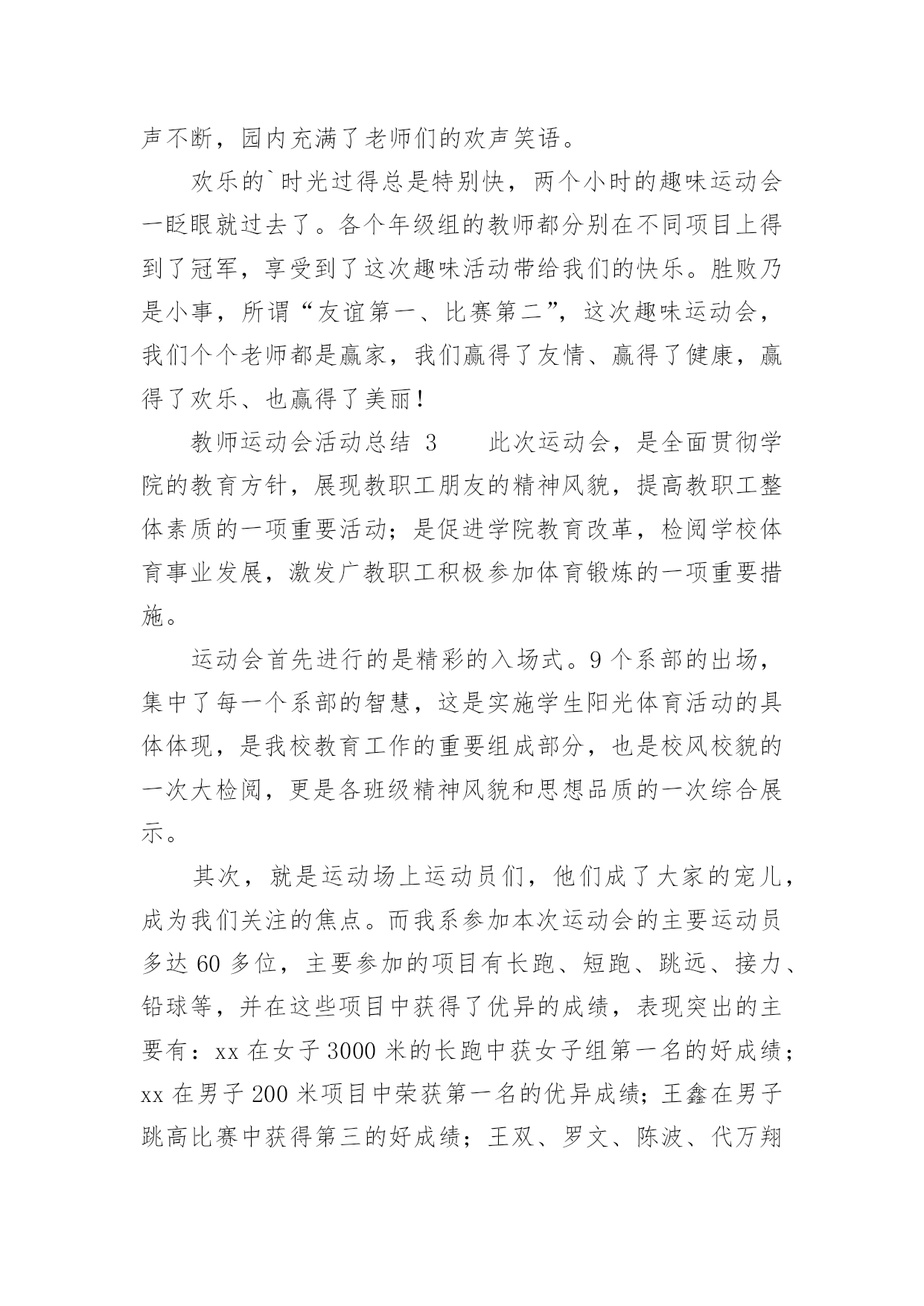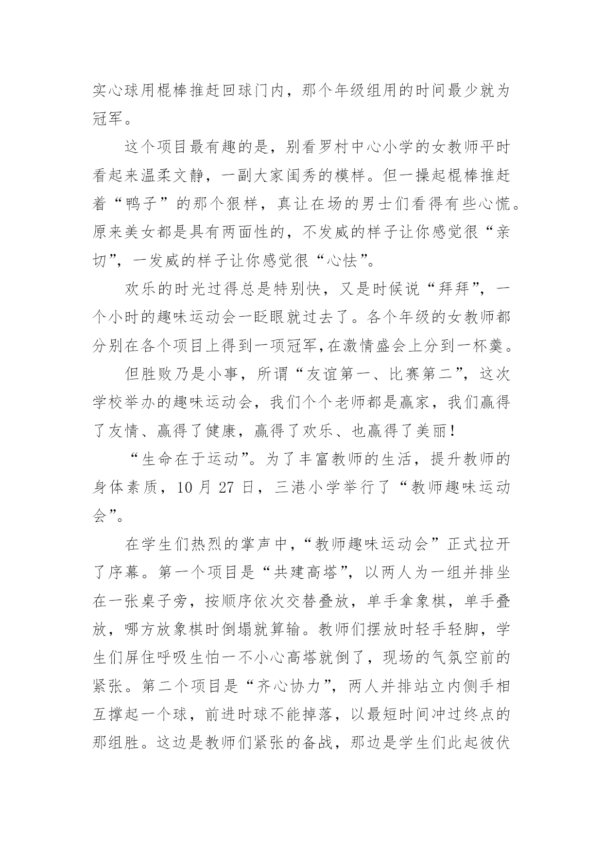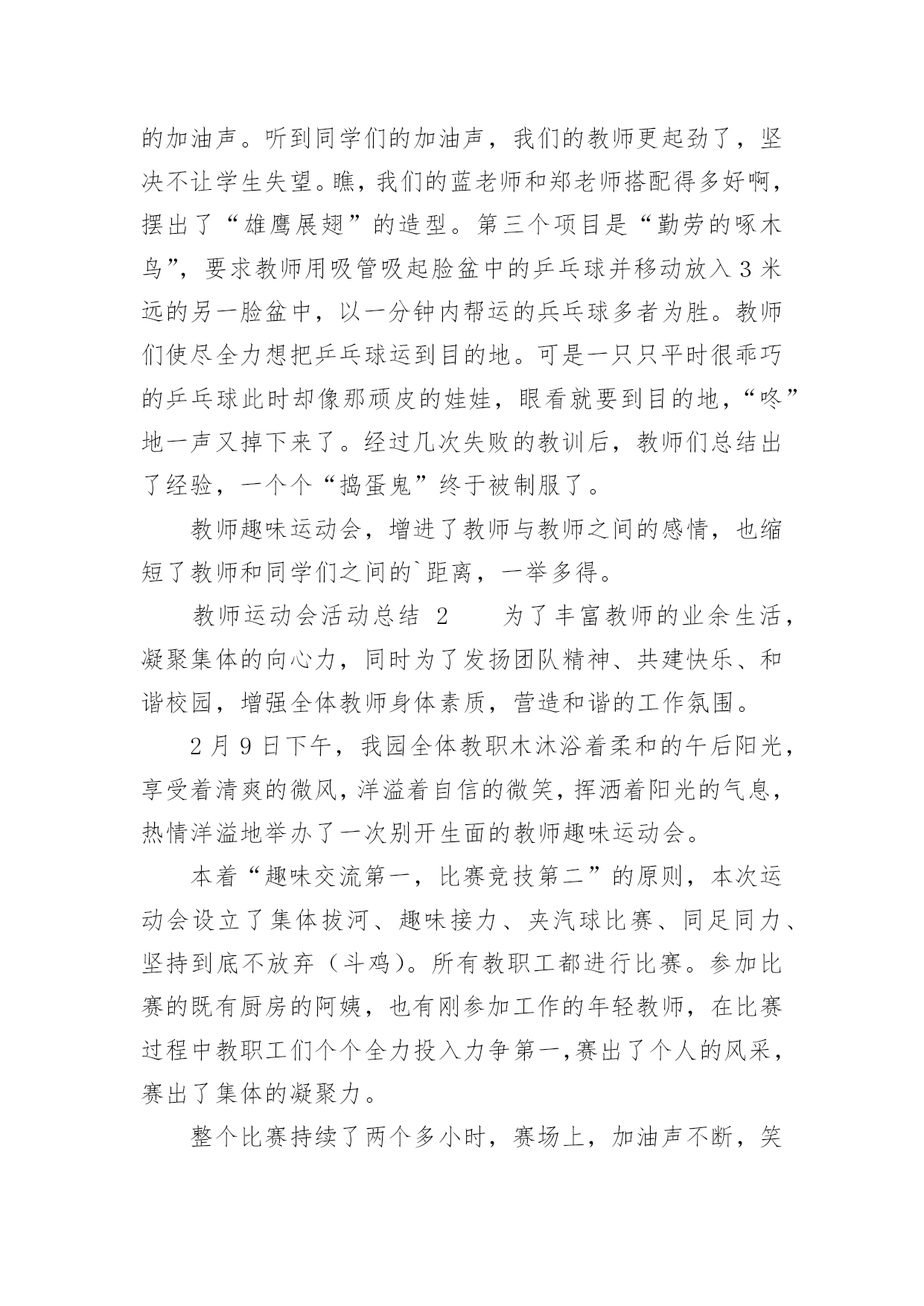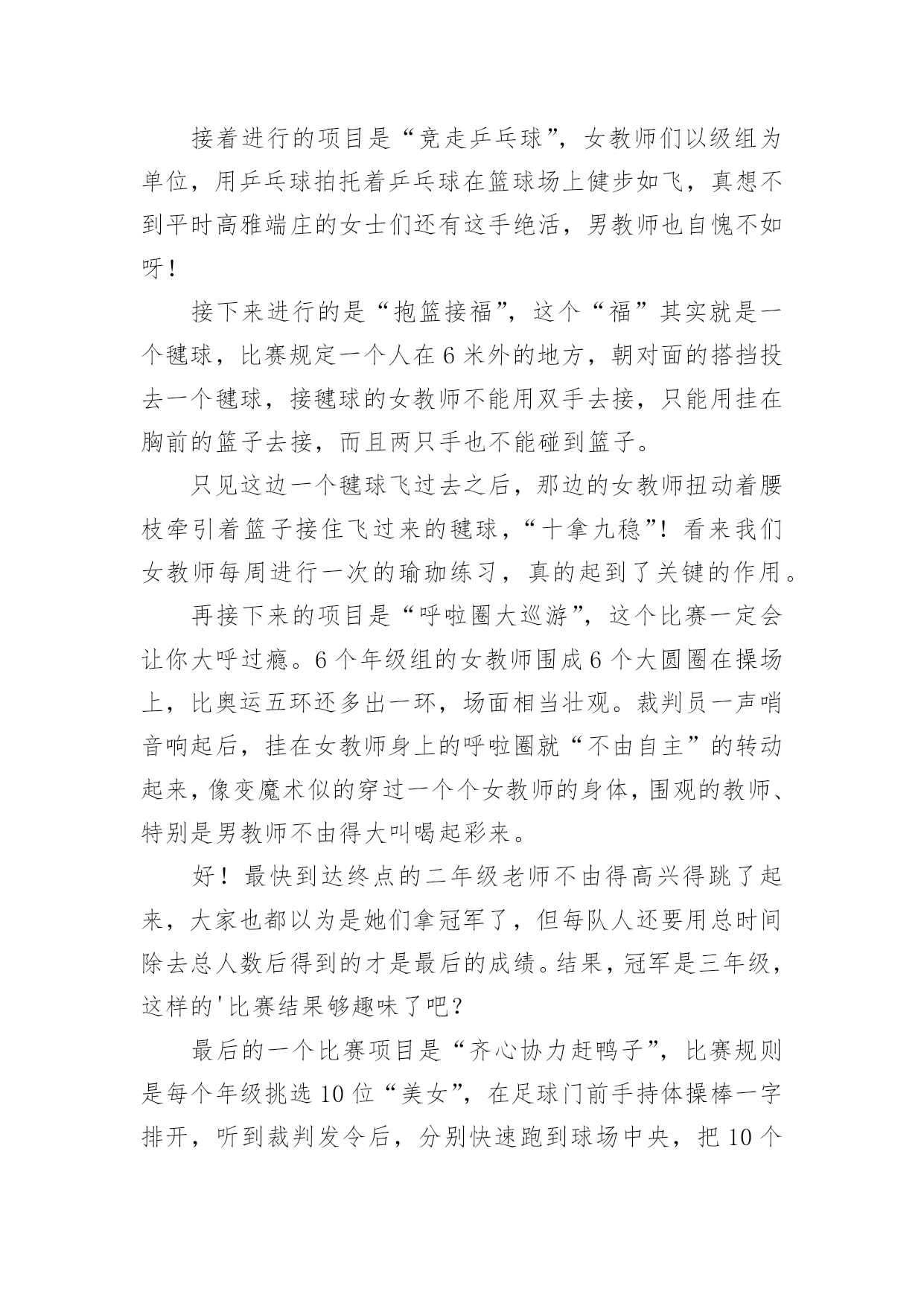教师运动会活动总结教师运动会活动总结(通用13篇)不经意间,一个活动就结束了,相信你一定有很多值得分享的经验,不如来好好的做个总结。那么活动总结应该包括什么内容呢?以下是小编帮大家整理的教师运动会活动总结,供大家参考借鉴,希望可以帮助到有需要的朋友。教师运动会活动总结1为了丰富广大教师的业余生活,凝聚集体的向心力,同时发扬亚运精神、增强身体素质,并深入践行学校绿色生态教育,营造和谐的工作氛围。罗村中心小学在12月14日举行了一次别开生面的教师趣味运动会。说它别开生面,是因为参赛的选手一律是女教师,裁判员一律是男教师。这次活动是罗村中心小学继开展了“激情盛会、和谐校园”田径运动会后,又一个大型的运动盛会。为了不影响学生的上课,老师们是选在放学后的时间里来举行盛会的,虽然只有短短的一个小时比赛过程,却把罗村中心小学全体教师那种团结协作、和谐进取的团队精神体现了出来,也把罗村中心小学女教师那种阳光健康、青春靓丽的整体形象绽放了出来。这次活动首先是进行“青春保龄球”项目比赛,这个项目的“趣味”体现在“保龄球”不是真的保龄球,而是一瓶瓶还没开盖的矿泉水,这些“保龄球”被女士们抛出的实心球撞得满场乱滚,惹来了满场的欢笑。接着进行的项目是“竞走乒乓球”,女教师们以级组为单位,用乒乓球拍托着乒乓球在篮球场上健步如飞,真想不到平时高雅端庄的女士们还有这手绝活,男教师也自愧不如呀!接下来进行的是“抱篮接福”,这个“福”其实就是一个毽球,比赛规定一个人在6米外的地方,朝对面的搭挡投去一个毽球,接毽球的女教师不能用双手去接,只能用挂在胸前的篮子去接,而且两只手也不能碰到篮子。只见这边一个毽球飞过去之后,那边的女教师扭动着腰枝牵引着篮子接住飞过来的毽球,“十拿九稳”!看来我们女教师每周进行一次的瑜珈练习,真的起到了关键的作用。再接下来的项目是“呼啦圈大巡游”,这个比赛一定会让你大呼过瘾。6个年级组的女教师围成6个大圆圈在操场上,比奥运五环还多出一环,场面相当壮观。裁判员一声哨音响起后,挂在女教师身上的呼啦圈就“不由自主”的转动起来,像变魔术似的穿过一个个女教师的身体,围观的教师、特别是男教师不由得大叫喝起彩来。好!最快到达终点的二年级老师不由得高兴得跳了起来,大家也都以为是她们拿冠军了,但每队人还要用总时间除去总人数后得到的才是最后的成绩。结果,冠军是三年级,这样的'比赛结果够趣味了吧?最后的一个比赛项目是“齐心协力赶鸭子”,比赛规则是每个年级挑选10位“美女”,在足球门前手持体操棒一字排开,听到裁判发令后,分别快速跑到球场中央,把10个实心球用棍棒推赶回球门内,那个年级组用的时间最少就为冠军。这个项目最有趣的是,别看罗村中心小学的女教师平时看起来温柔文静,一副大家闺秀的模样。但一操起棍棒推赶着“鸭子”的那个狠样,真让在场的男士们看得有些心慌。原来美女都是具有两面性的,不发威的样子让你感觉很“亲切”,一发威的样子让你感觉很“心怯”。欢乐的时光过得总是特别快,又是时候说“拜拜”,一个小时的趣味运动会一眨眼就过去了。各个年级的女教师都分别在各个项目上得到一项冠军,在激情盛会上分到一杯羹。但胜败乃是小事,所谓“友谊第一、比赛第二”,这次学校举办的趣味运动会,我们个个老师都是赢家,我们赢得了友情、赢得了健康,赢得了欢乐、也赢得了美丽!“生命在于运动”。为了丰富教师的生活,提升教师的身体素质,10月27日,三港小学举行了“教师趣味运动会”。在学生们热烈的掌声中,“教师趣味运动会”正式拉开了序幕。第一个项目是“共建高塔”,以两人为一组并排坐在一张桌子旁,按顺序依次交替叠放,单手拿象棋,单手叠放,哪方放象棋时倒塌就算输。教师们摆放时轻手轻脚,学生们屏住呼吸生怕一不小心高塔就倒了,现场的气氛空前的紧张。第二个项目是“齐心协力”,两人并排站立内侧手相互撑起一个球,前进时球不能掉落,以最短时间冲过终点的那组胜。这边是教师们紧张的备战,那边是学生们此起彼伏的加油声。听到同学们的加油声,我们的教师更起劲了,坚决不让学生失望。瞧,我们的蓝老师和郑老师搭配得多好啊,摆出了“雄鹰展翅”的造型。第三个项目是“勤劳的啄木鸟”,要求教师用吸管吸起脸盆中的乒乓球并移动放入3米远的另一脸盆中,以一分钟内帮运的兵乓球多者为胜。教师们使尽全力想把乒乓球运到目的地。可是一只只平时很乖巧的乒乓球此时却像那顽皮的娃娃,眼看就要到目的地,“咚”地一声又掉下来了。经过几次失败的教训后,教师们总结出了经验,一个个“捣蛋鬼”终于被制服了。教师趣味运动会,增进了教师与教师之间的感情,也缩短了教师和同学们之间的`距离,一举多得。教师运动会活动总结2为了丰富教师的业余生活,凝聚集体的向心力,同时为了发扬团队精神、共建快乐、和谐校园,增强全体教师身体素质,营造和谐的工作氛围。2月9日下午,我园全体教职木沐浴着柔和