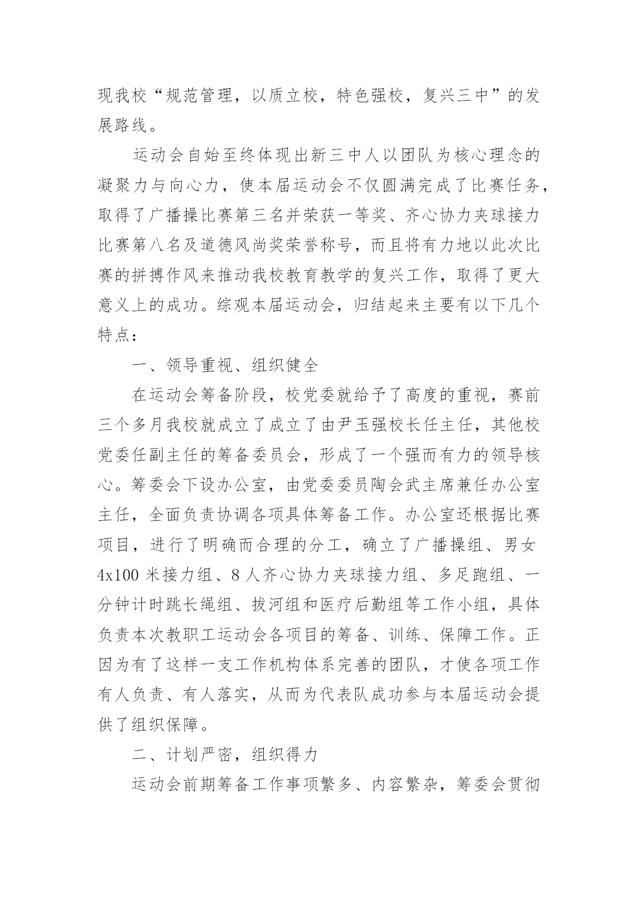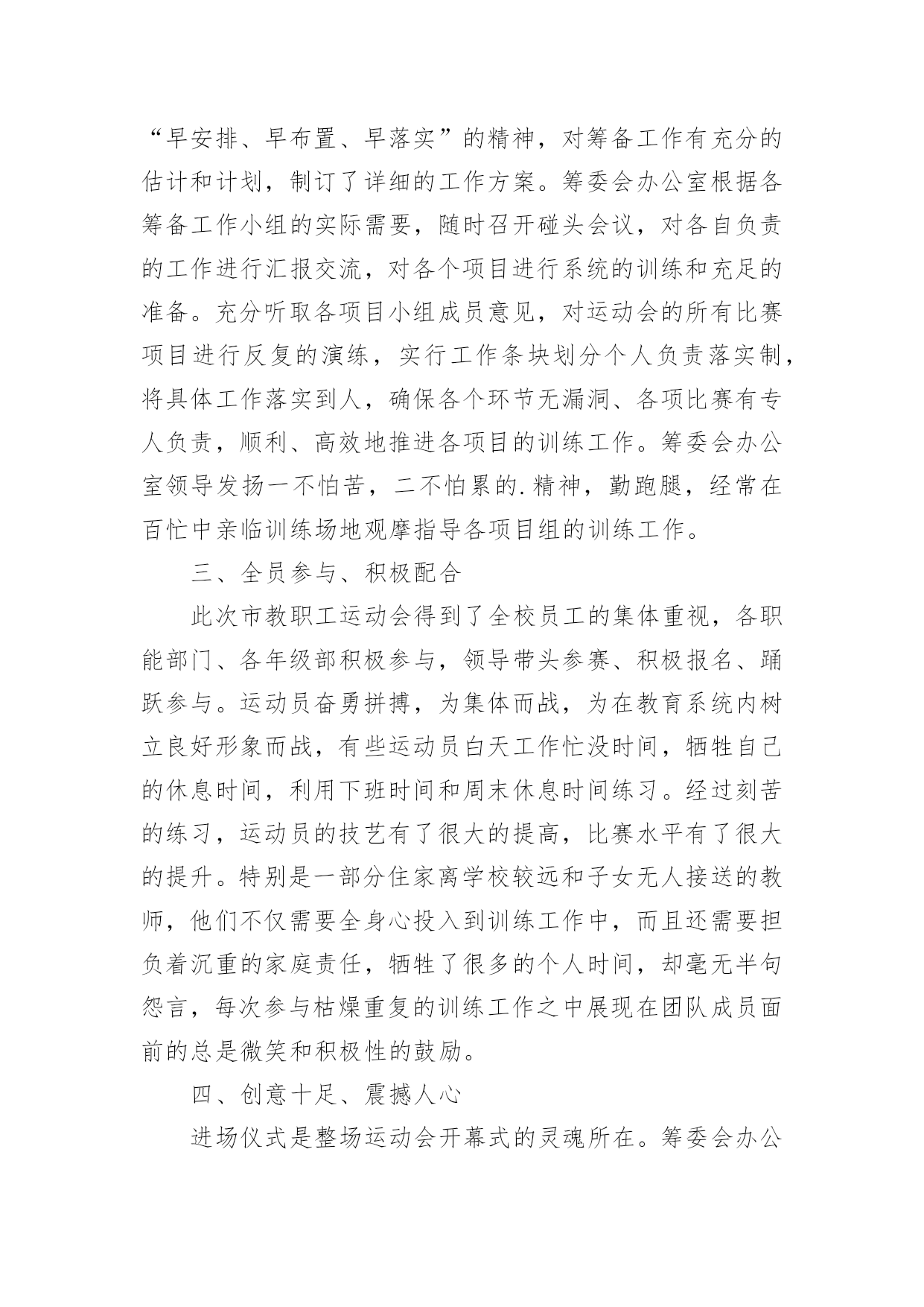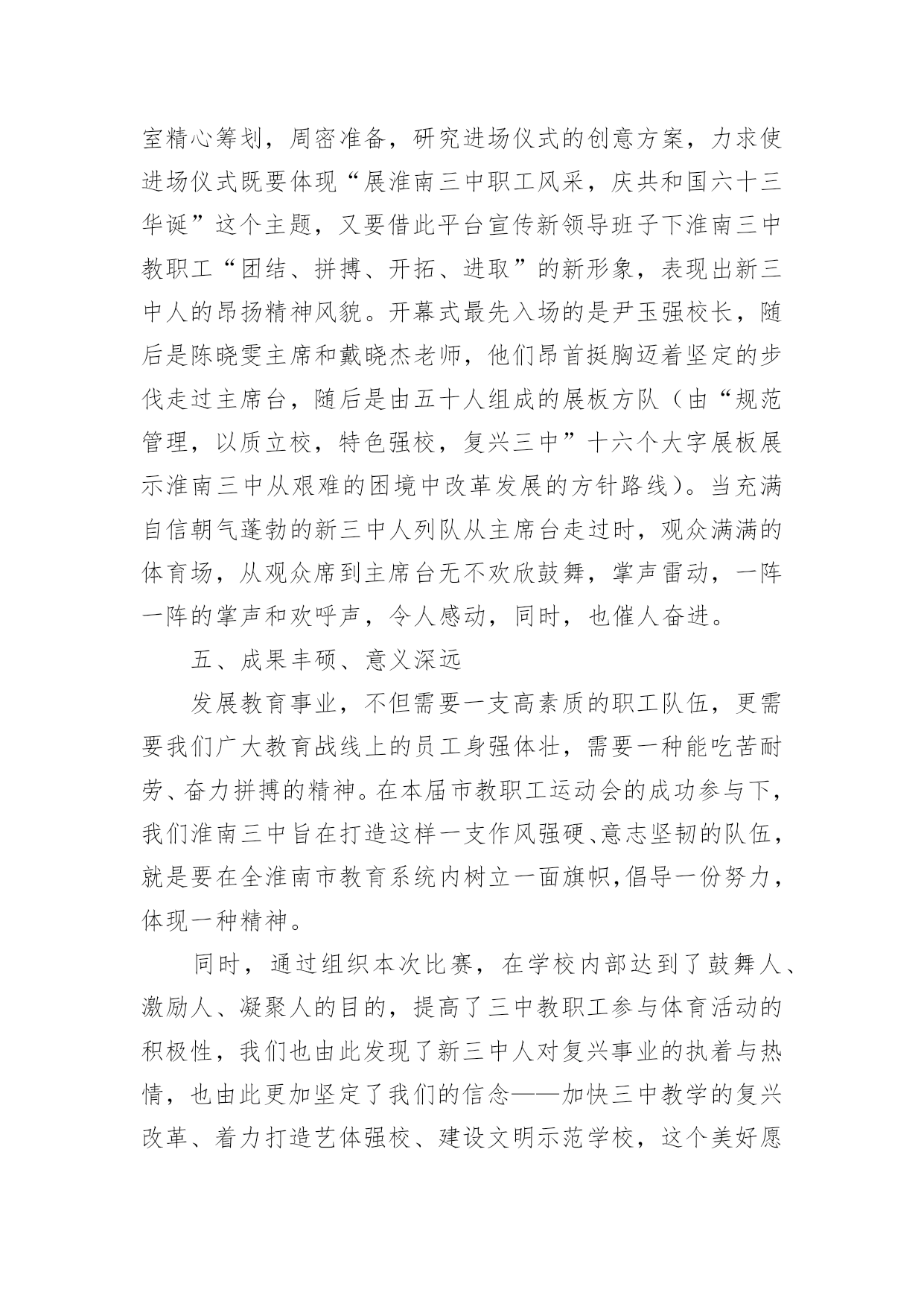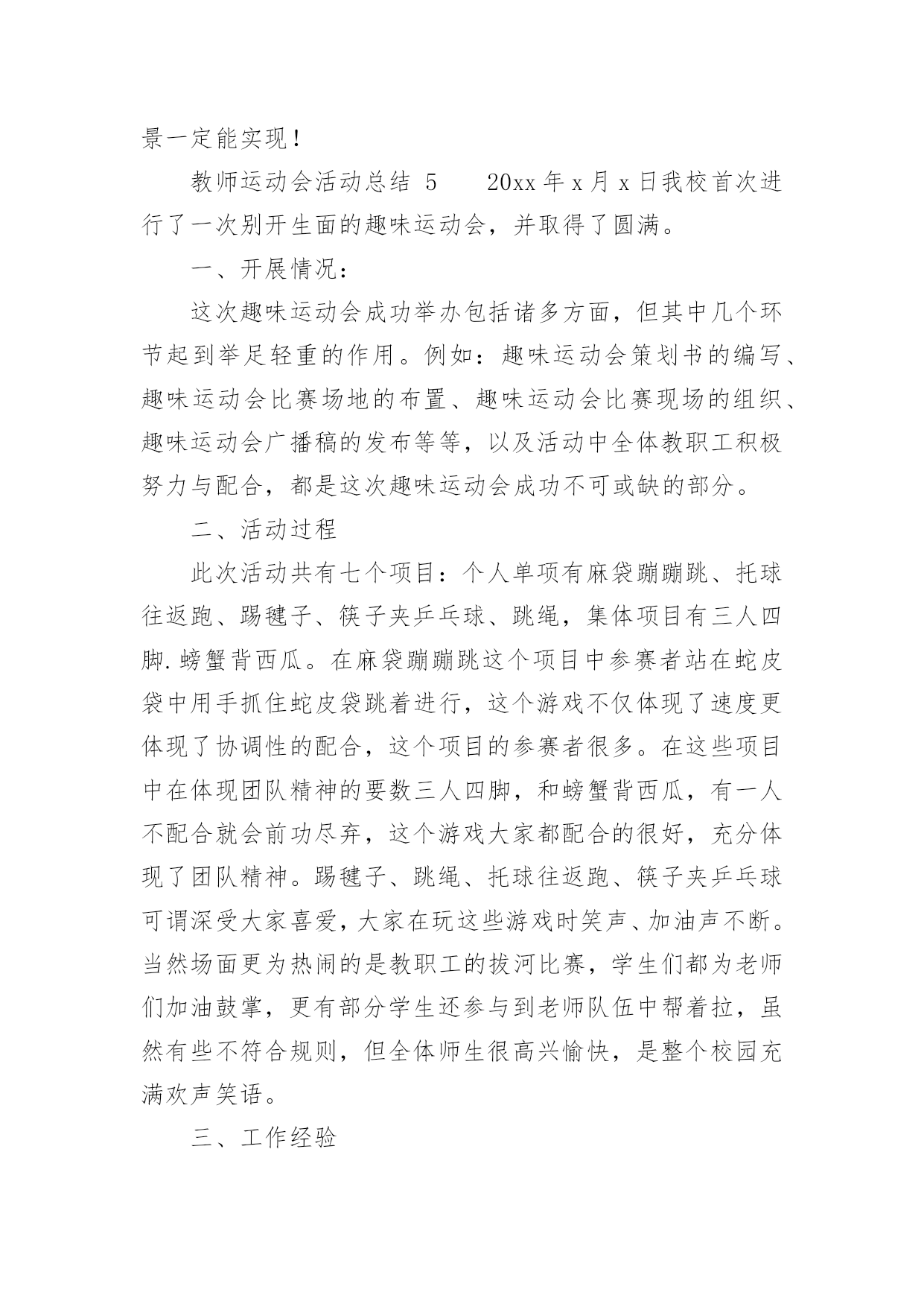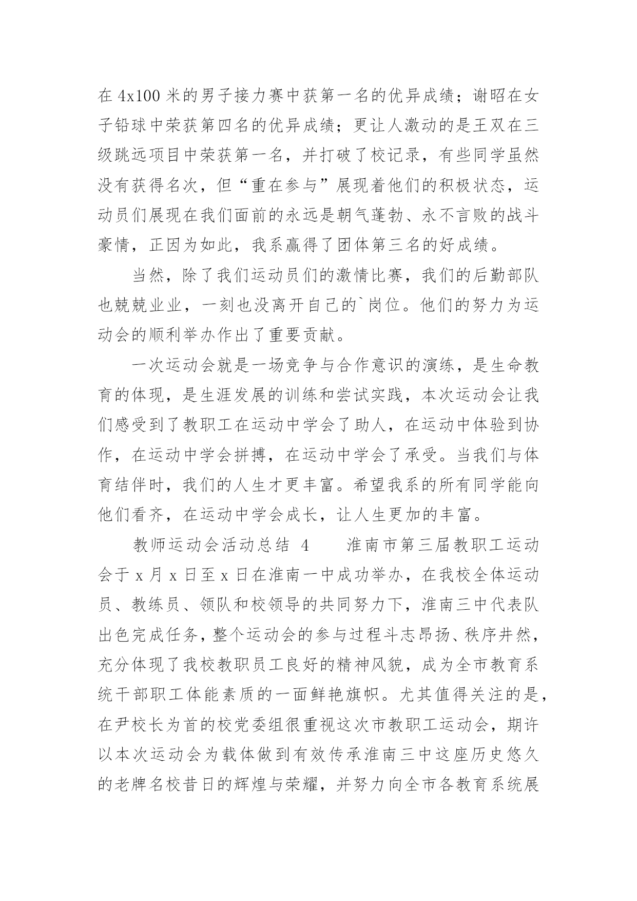 教师运动会活动总结教师运动会活动总结(通用13篇)不经意间,一个活动就结束了,相信你一定有很多值得分享的经验,不如来好好的做个总结。那么活动总结应该包括什么内容呢?以下是小编帮大家整理的教师运动会活动总结,供大家参考借鉴,希望可以帮助到有需要的朋友。教师运动会活动总结1为了丰富广大教师的业余生活,凝聚集体的向心力,同时发扬亚运精神、增强身体素质,并深入践行学校绿色生态教育,营造和谐的工作氛围。罗村中心小学在12月14日举行了一次别开生面的教师趣味运动会。说它别开生面,是因为参赛的选手一律是女教师,裁判员一律是男教师。这次活动是罗村中心小学继开展了“激情盛会、和谐校园”田径运动会后,又一个大型的运动盛会。为了不影响学生的上课,老师们是选在放学后的时间里来举行盛会的,虽然只有短短的一个小时比赛过程,却把罗村中心小学全体教师那种团结协作、和谐进取的团队精神体现了出来,也把罗村中心小学女教师那种阳光健康、青春靓丽的整体形象绽放了出来。这次活动首先是进行“青春保龄球”项目比赛,这个项目的“趣味”体现在“保龄球”不是真的保龄球,而是一瓶瓶还没开盖的矿泉水,这些“保龄球”被女士们抛出的实心球撞得满场乱滚,惹来了满场的欢笑。接着进行的项目是“竞走乒乓球”,女教师们以级组为单位,用乒乓球拍托着乒乓球在篮球场上健步如飞,真想不到平时高雅端庄的女士们还有这手绝活,男教师也自愧不如呀!接下来进行的是“抱篮接福”,这个“福”其实就是一个毽球,比赛规定一个人在6米外的地方,朝对面的搭挡投去一个毽球,接毽球的女教师不能用双手去接,只能用挂在胸前的篮子去接,而且两只手也不能碰到篮子。只见这边一个毽球飞过去之后,那边的女教师扭动着腰枝牵引着篮子接住飞过来的毽球,“十拿九稳”!看来我们女教师每周进行一次的瑜珈练习,真的起到了关键的作用。再接下来的项目是“呼啦圈大巡游”,这个比赛一定会让你大呼过瘾。6个年级组的女教师围成6个大圆圈在操场上,比奥运五环还多出一环,场面相当壮观。裁判员一声哨音响起后,挂在女教师身上的呼啦圈就“不由自主”的转动起来,像变魔术似的穿过一个个女教师的身体,围观的教师、特别是男教师不由得大叫喝起彩来。好!最快到达终点的二年级老师不由得高兴得跳了起来,大家也都以为是她们拿冠军了,但每队人还要用总时间除去总人数后得到的才是最后的成绩。结果,冠军是三年级,这样的'比赛结果够趣味了吧?最后的一个比赛项目是“齐心协力赶鸭子”,比赛规则是每个年级挑选10位“美女”,在足球门前手持体操棒一字排开,听到裁判发令后,分别快速跑到球场中央,把10个实心球用棍棒推赶回球门内,那个年级组用的时间最少就为冠军。这个项目最有趣的是,别看罗村中心小学的女教师平时看起来温柔文静,一副大家闺秀的模样。但一操起棍棒推赶着“鸭子”的那个狠样,真让在场的男士们看得有些心慌。原来美女都是具有两面性的,不发威的样子让你感觉很“亲切”,一发威的样子让你感觉很“心怯”。欢乐的时光过得总是特别快,又是时候说“拜拜”,一个小时的趣味运动会一眨眼就过去了。各个年级的女教师都分别在各个项目上得到一项冠军,在激情盛会上分到一杯羹。但胜败乃是小事,所谓“友谊第一、比赛第二”,这次学校举办的趣味运动会,我们个个老师都是赢家,我们赢得了友情、赢得了健康,赢得了欢乐、也赢得了美丽!“生命在于运动”。为了丰富教师的生活,提升教师的身体素质,10月27日,三港小学举行了“教师趣味运动会”。在学生们热烈的掌声中,“教师趣味运动会”正式拉开了序幕。第一个项目是“共建高塔”,以两人为一组并排坐在一张桌子旁,按顺序依次交替叠放,单手拿象棋,单手叠放,哪方放象棋时倒塌就算输。教师们摆放时轻手轻脚,学生们屏住呼吸生怕一不小心高塔就倒了,现场的气氛空前的紧张。第二个项目是“齐心协力”,两人并排站立内侧手相互撑起一个球,前进时球不能掉落,以最短时间冲过终点的那组胜。这边是教师们紧张的备战,那边是学生们此起彼伏的加油声。听到同学们的加油声,我们的教师更起劲了,坚决不让学生失望。瞧,我们的蓝老师和郑老师搭配得多好啊,摆出了“雄鹰展翅”的造型。第三个项目是“勤劳的啄木鸟”,要求教师用吸管吸起脸盆中的乒乓球并移动放入3米远的另一脸盆中,以一分钟内帮运的兵乓球多者为胜。教师们使尽全力想把乒乓球运到目的地。可是一只只平时很乖巧的乒乓球此时却像那顽皮的娃娃,眼看就要到目的地,“咚”地一声又掉下来了。经过几次失败的教训后,教师们总结出了经验,一个个“捣蛋鬼”终于被制服了。教师趣味运动会,增进了教师与教师之间的感情,也缩短了教师和同学们之间的`距离,一举多得。教师运动会活动总结2为了丰富教师的业余生活,凝聚集体的向心力,同时为了发扬团队精神、共建快乐、和谐校园,增强全体教师身体素质,营造和谐的工作氛围。2月9日下午,我园全体教职木沐浴着柔和