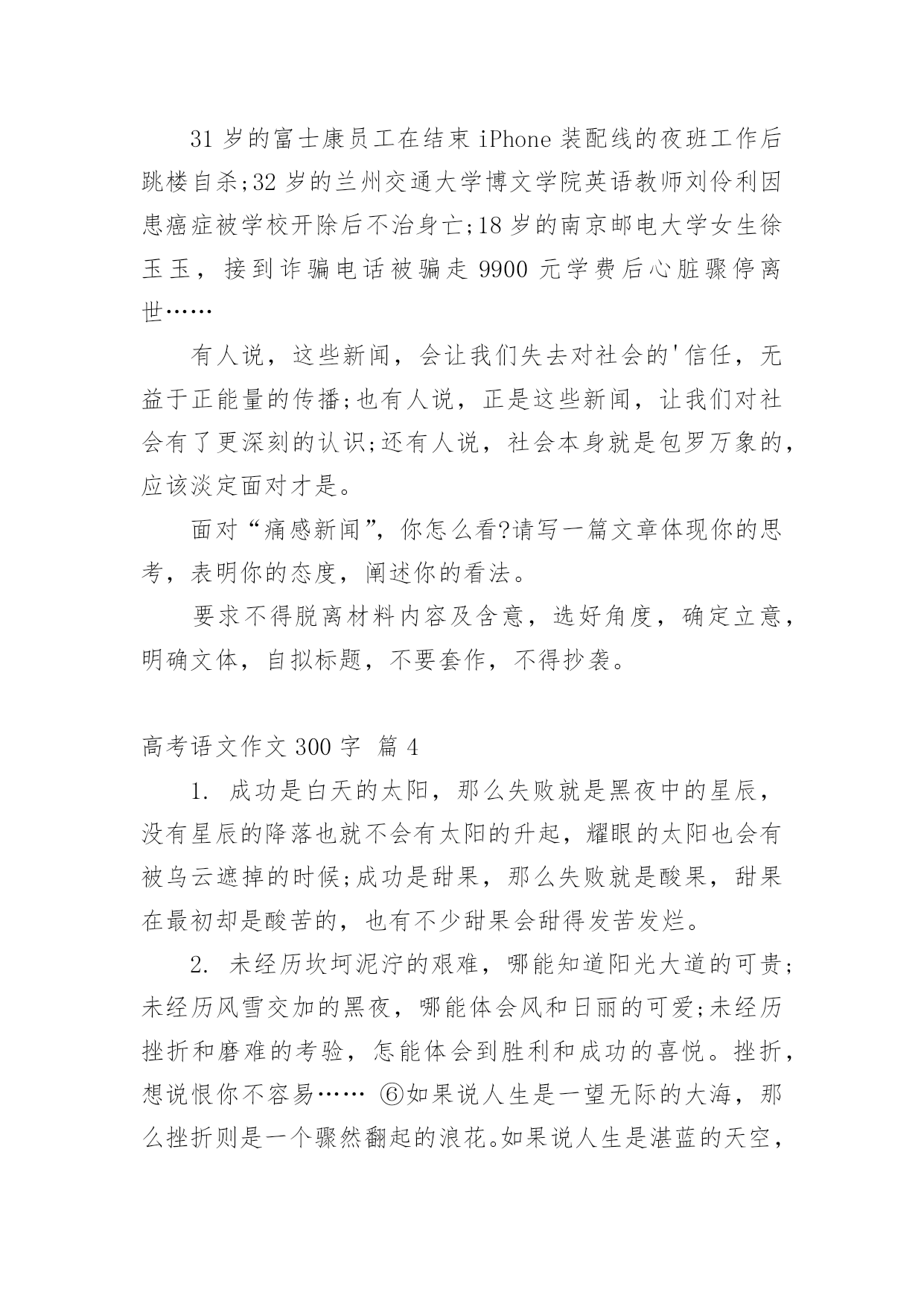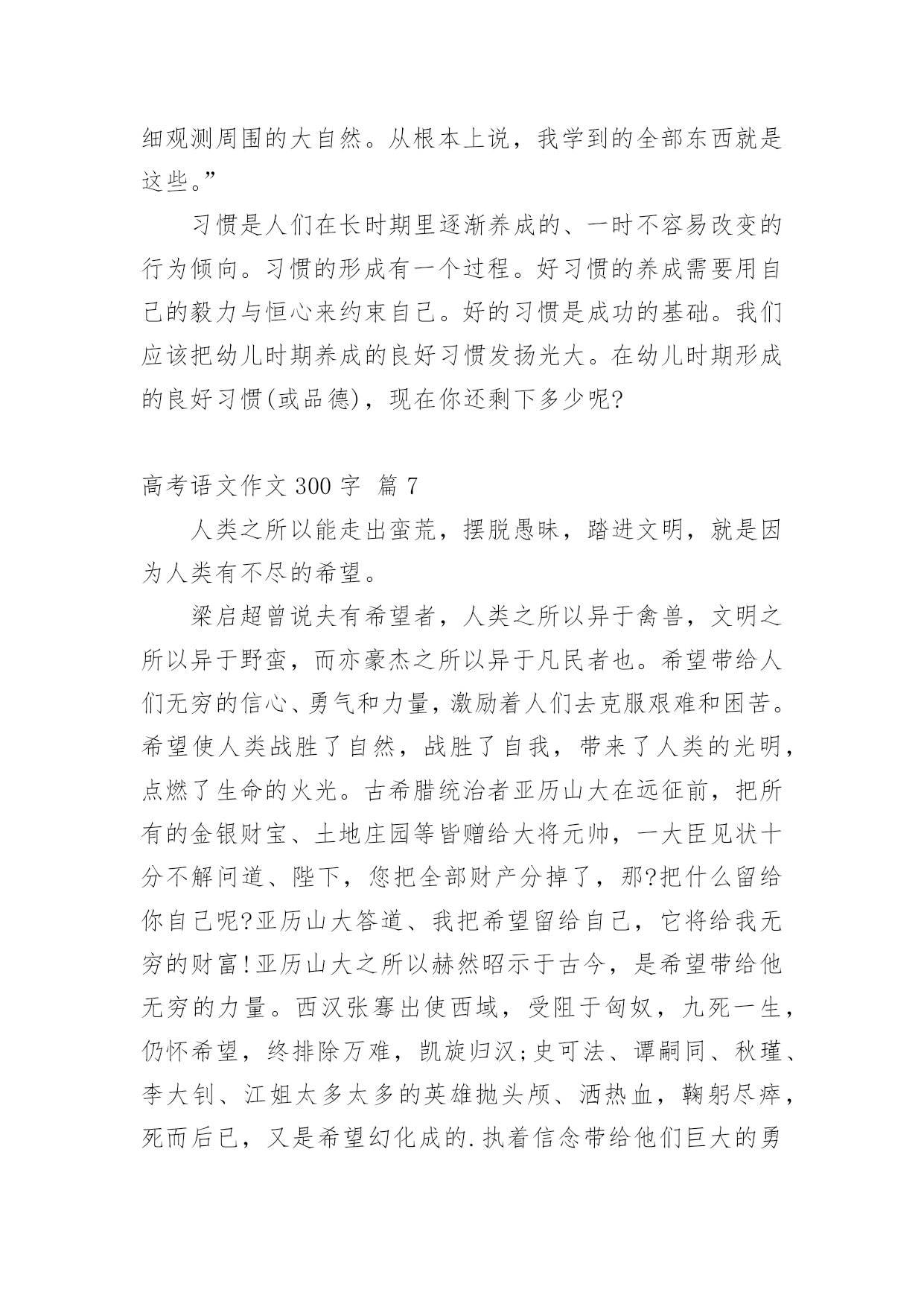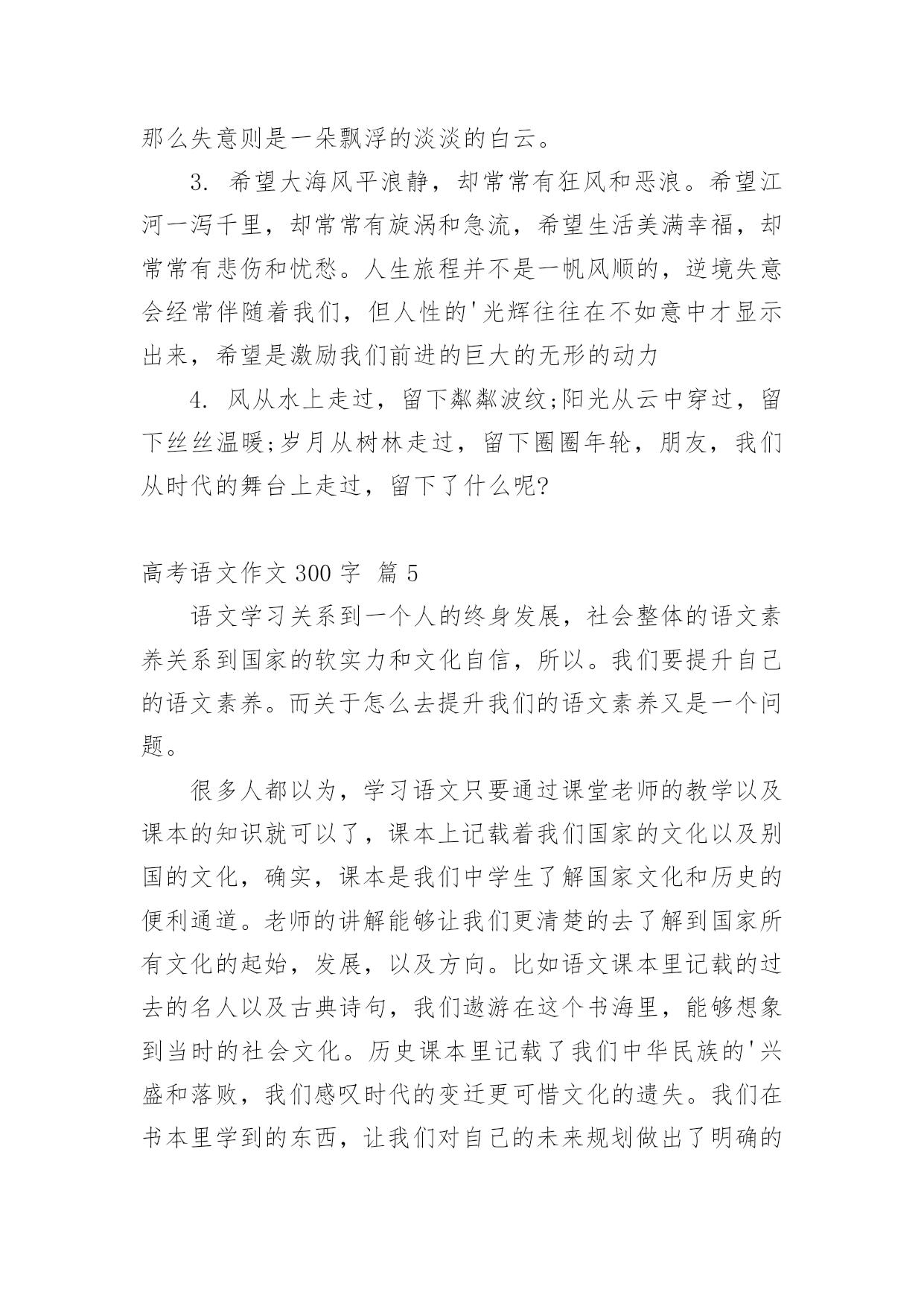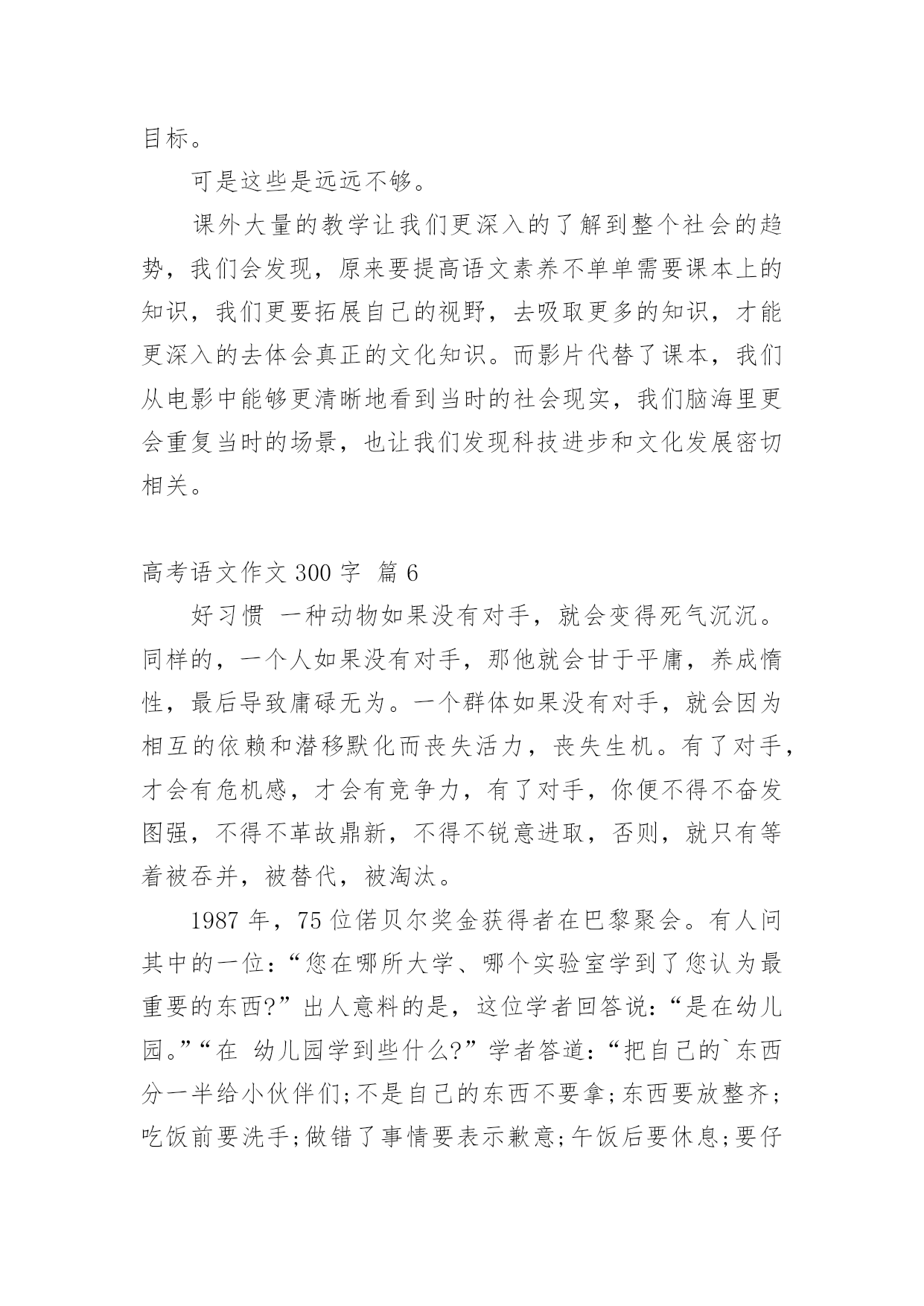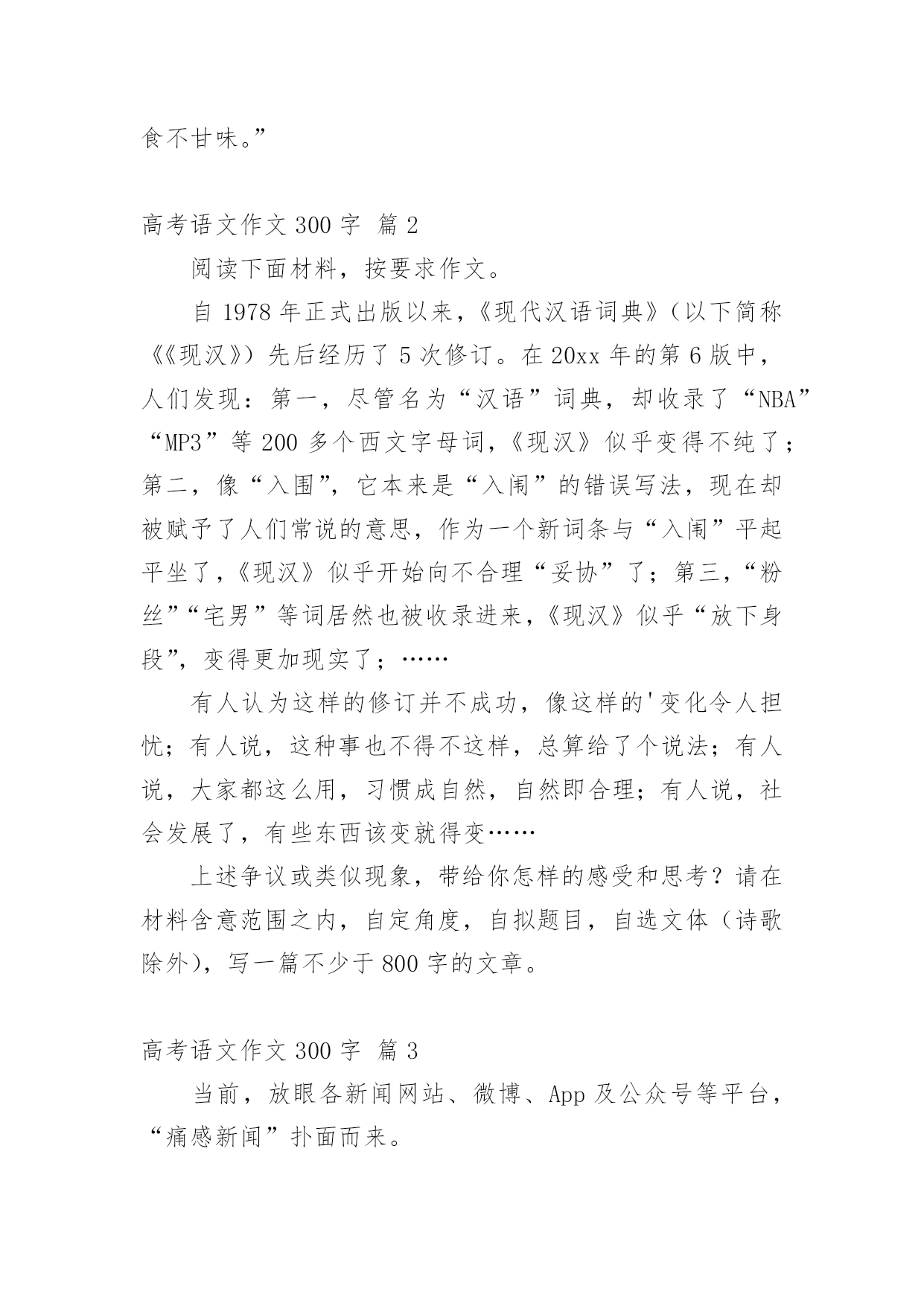 高考语文作文300字关于高考语文作文300字锦集七篇在我们平凡的日常里,大家都不可避免地要接触到作文吧,作文一定要做到主题集中,围绕同一主题作深入阐述,切忌东拉西扯,主题涣散甚至无主题。那么,怎么去写作文呢?以下是小编为大家收集的高考语文作文300字8篇,仅供参考,希望能够帮助到大家。高考语文作文300字篇1食不甘味战国后期,有齐、秦、楚、燕、韩、魏七国,其中七雄之一的`秦国是最为强大,它经常侵犯其他国家有一年,秦惠文王派使者去见楚威王,要挟说:“如果楚国不服从秦国,秦国就要出兵伐楚。楚威王闻听大怒,下令把秦国使者驱逐出境。但楚威王又因实力不足而焦虑不安,如果强秦发兵入侵该如何办呢?恰在这时说客苏秦(曾任赵国相国、武安侯)前来拜他劝楚威王与赵、魏等国联合起来抗秦。楚威王一听,十分高兴,说:“非常感谢你的妙计,我正为这件事‘卧不安席,食不甘味’呢,现在就按你的计策去做。”【释读】甘味:感到味道好。吃东西都觉得没有味道。形容心里有事或身体不好,吃东西也不香。【出处】《战国策·齐策五》:“秦王恐之,寝不安席,食不甘味。”高考语文作文300字篇2阅读下面材料,按要求作文。自1978年正式出版以来,《现代汉语词典》(以下简称《《现汉》)先后经历了5次修订。在20xx年的第6版中,人们发现:第一,尽管名为“汉语”词典,却收录了“NBA”“MP3”等200多个西文字母词,《现汉》似乎变得不纯了;第二,像“入围”,它本来是“入闱”的错误写法,现在却被赋予了人们常说的意思,作为一个新词条与“入闱”平起平坐了,《现汉》似乎开始向不合理“妥协”了;第三,“粉丝”“宅男”等词居然也被收录进来,《现汉》似乎“放下身段”,变得更加现实了;……有人认为这样的修订并不成功,像这样的'变化令人担忧;有人说,这种事也不得不这样,总算给了个说法;有人说,大家都这么用,习惯成自然,自然即合理;有人说,社会发展了,有些东西该变就得变……上述争议或类似现象,带给你怎样的感受和思考?请在材料含意范围之内,自定角度,自拟题目,自选文体(诗歌除外),写一篇不少于800字的文章。高考语文作文300字篇3当前,放眼各新闻网站、微博、App及公众号等平台,“痛感新闻”扑面而来。31岁的富士康员工在结束iPhone装配线的夜班工作后跳楼自杀;32岁的兰州交通大学博文学院英语教师刘伶利因患癌症被学校开除后不治身亡;18岁的南京邮电大学女生徐玉玉,接到诈骗电话被骗走9900元学费后心脏骤停离世……有人说,这些新闻,会让我们失去对社会的'信任,无益于正能量的传播;也有人说,正是这些新闻,让我们对社会有了更深刻的认识;还有人说,社会本身就是包罗万象的,应该淡定面对才是。面对“痛感新闻”,你怎么看?请写一篇文章体现你的思考,表明你的态度,阐述你的看法。要求不得脱离材料内容及含意,选好角度,确定立意,明确文体,自拟标题,不要套作,不得抄袭。高考语文作文300字篇41.成功是白天的太阳,那么失败就是黑夜中的星辰,没有星辰的降落也就不会有太阳的升起,耀眼的太阳也会有被乌云遮掉的时候;成功是甜果,那么失败就是酸果,甜果在最初却是酸苦的,也有不少甜果会甜得发苦发烂。2.未经历坎坷泥泞的艰难,哪能知道阳光大道的可贵;未经历风雪交加的黑夜,哪能体会风和日丽的可爱;未经历挫折和磨难的考验,怎能体会到胜利和成功的喜悦。挫折,想说恨你不容易……⑥如果说人生是一望无际的大海,那么挫折则是一个骤然翻起的浪花。如果说人生是湛蓝的天空,那么失意则是一朵飘浮的淡淡的白云。3.希望大海风平浪静,却常常有狂风和恶浪。希望江河一泻千里,却常常有旋涡和急流,希望生活美满幸福,却常常有悲伤和忧愁。人生旅程并不是一帆风顺的,逆境失意会经常伴随着我们,但人性的'光辉往往在不如意中才显示出来,希望是激励我们前进的巨大的无形的动力4.风从水上走过,留下粼粼波纹;阳光从云中穿过,留下丝丝温暖;岁月从树林走过,留下圈圈年轮,朋友,我们从时代的舞台上走过,留下了什么呢?高考语文作文300字篇5语文学习关系到一个人的终身发展,社会整体的语文素养关系到国家的软实力和文化自信,所以。我们要提升自己的语文素养。而关于怎么去提升我们的语文素养又是一个问题。很多人都以为,学习语文只要通过课堂老师的教学以及课本的知识就可以了,课本上记载着我们国家的文化以及别国的文化,确实,课本是我们中学生了解国家文化和历史的便利通道。老师的讲解能够让我们更清楚的去了解到国家所有文化的起始,发展,以及方向。比如语文课本里记载的过去的名人以及古典诗句,我们遨游在这个书海里,能够想象到当时的社会文化。历史课本里记载了我们中华民族的'兴盛和落败,我们感叹时代的变迁更可惜文化的遗失。我们在书本里学到的东西,让我们对自己的未来规划做出了明确的目标。可是这些是远远不够。课外大量的教学让