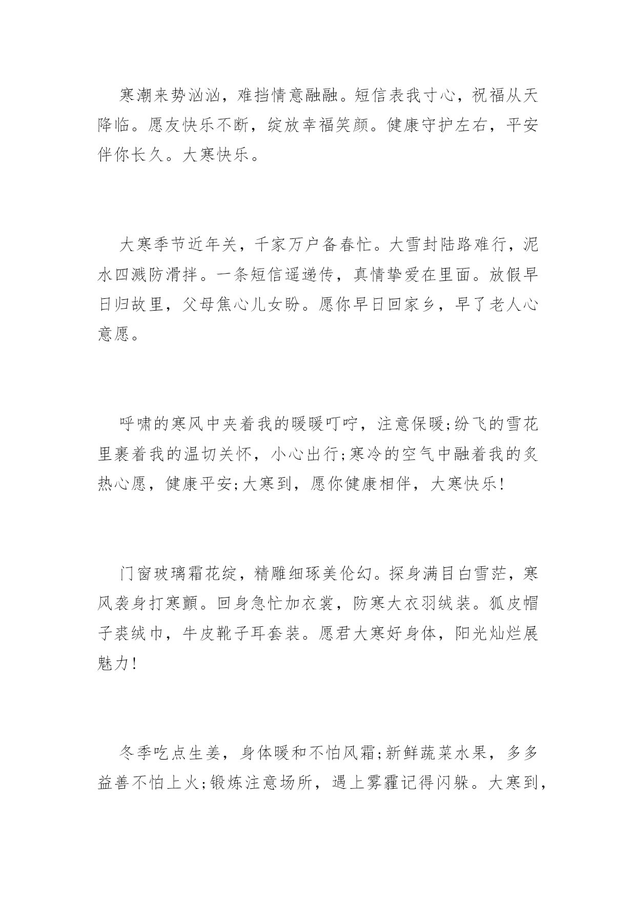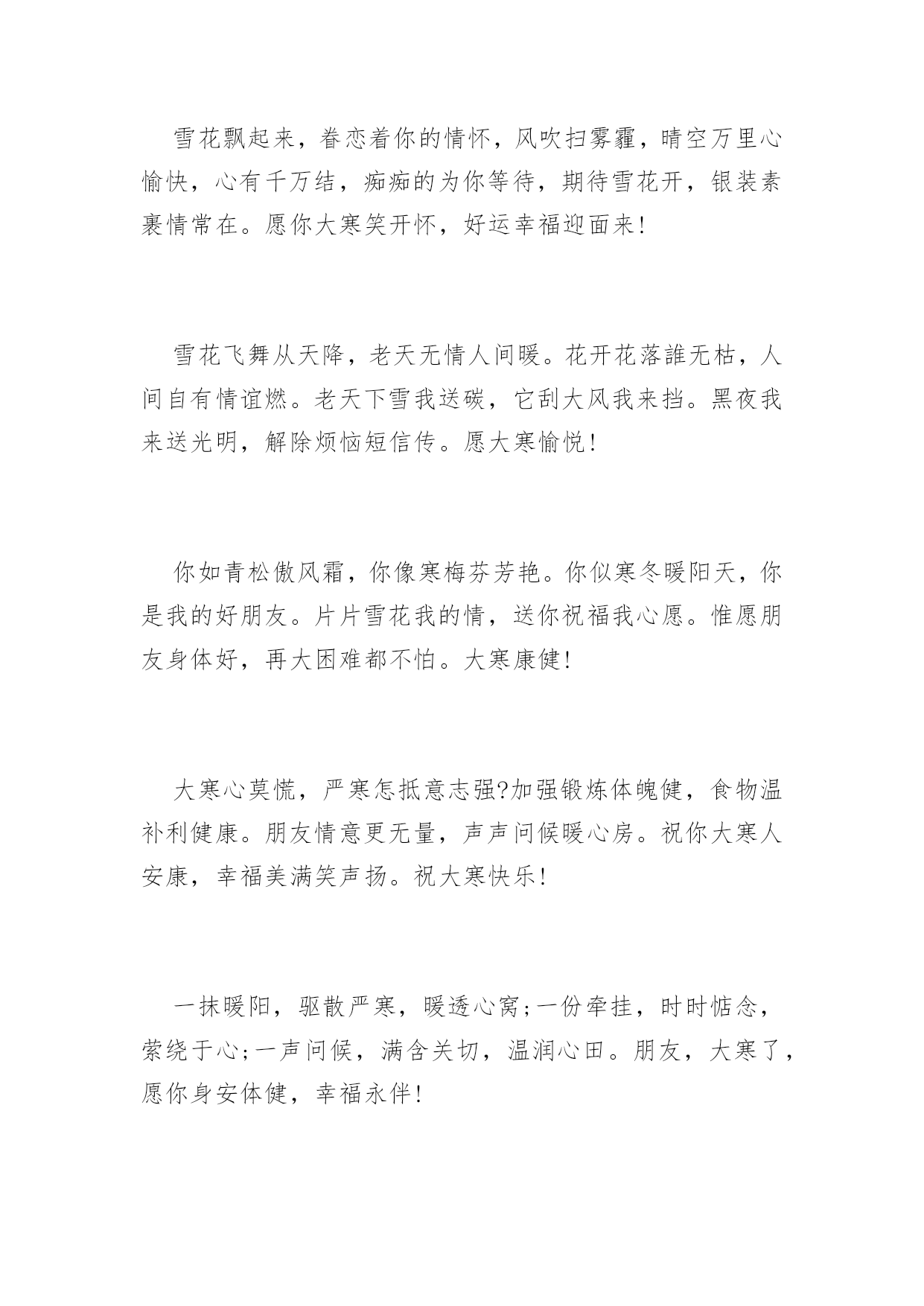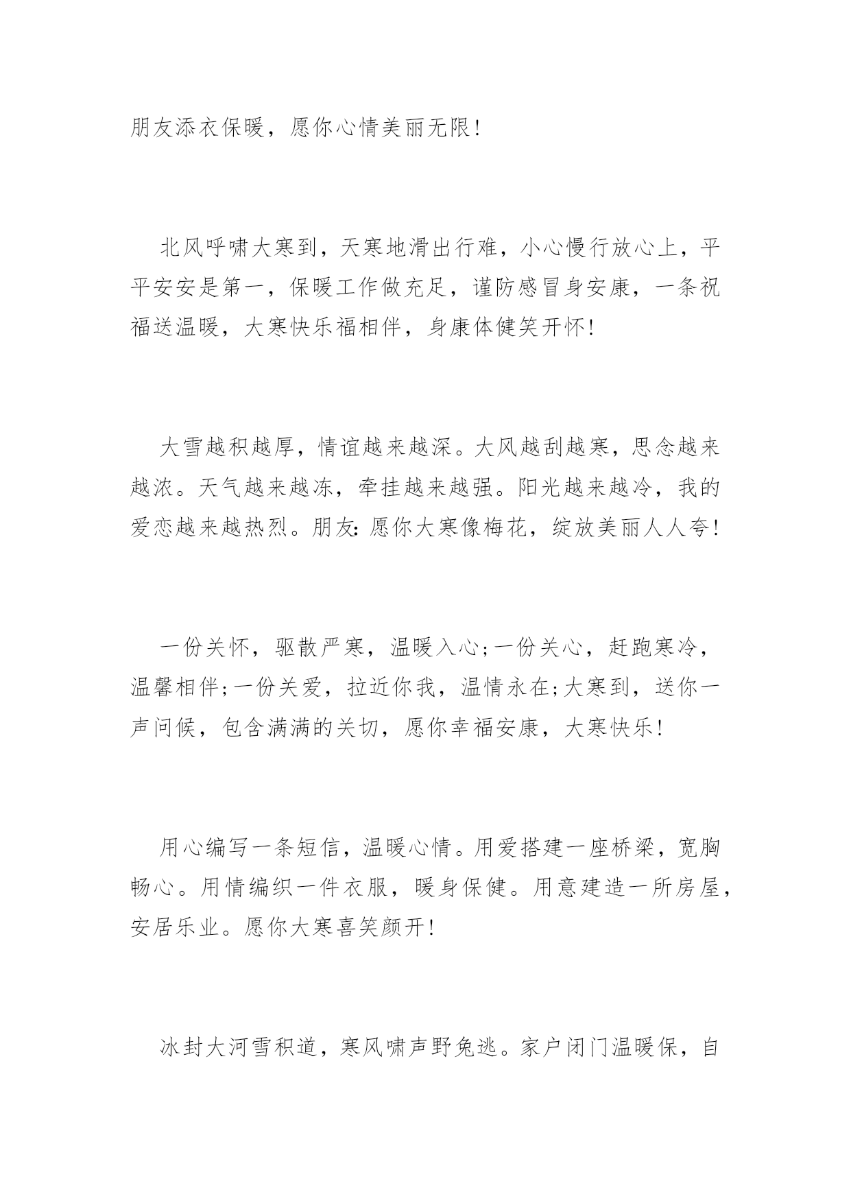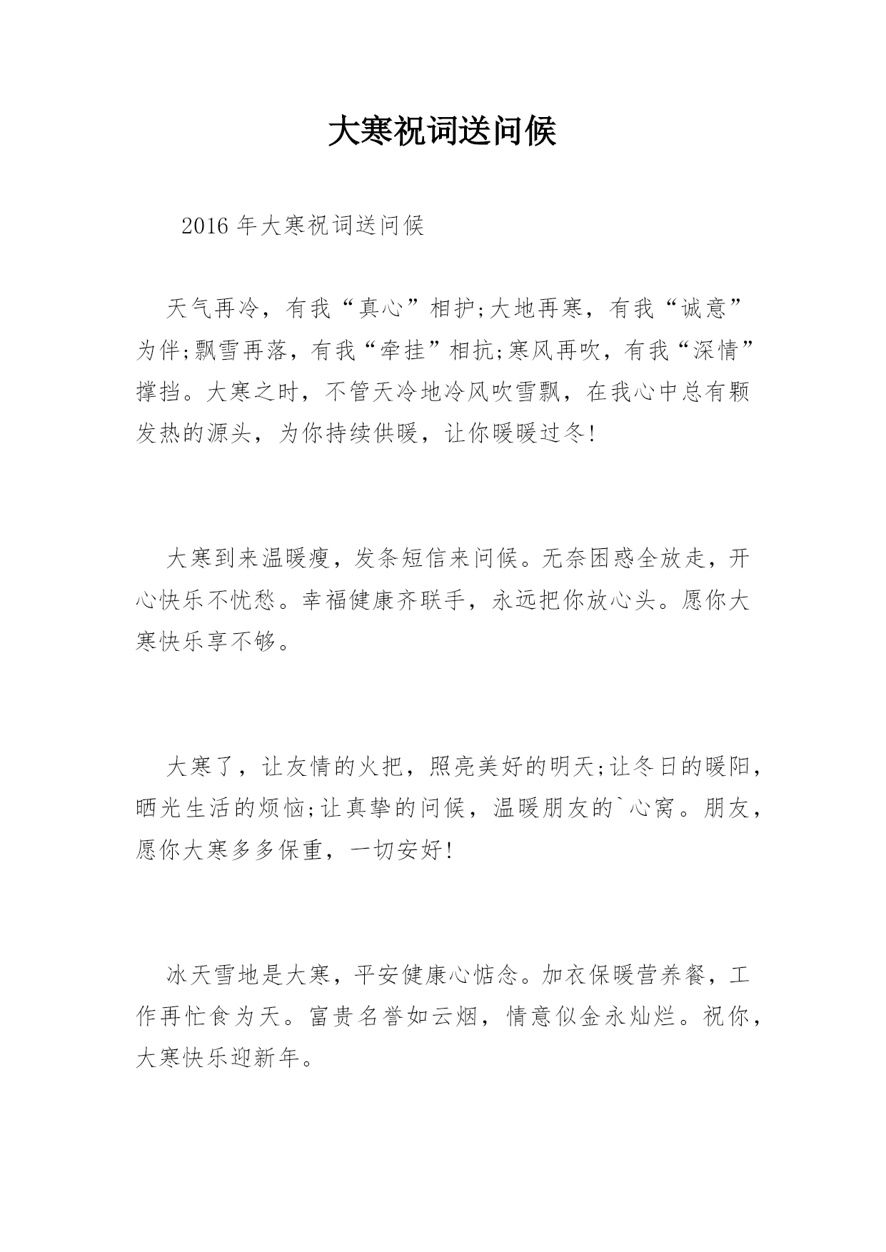 大寒祝词送问候2016年大寒祝词送问候天气再冷,有我“真心”相护;大地再寒,有我“诚意”为伴;飘雪再落,有我“牵挂”相抗;寒风再吹,有我“深情”撑挡。大寒之时,不管天冷地冷风吹雪飘,在我心中总有颗发热的源头,为你持续供暖,让你暖暖过冬!大寒到来温暖瘦,发条短信来问候。无奈困惑全放走,开心快乐不忧愁。幸福健康齐联手,永远把你放心头。愿你大寒快乐享不够。大寒了,让友情的火把,照亮美好的明天;让冬日的暖阳,晒光生活的烦恼;让真挚的问候,温暖朋友的`心窝。朋友,愿你大寒多多保重,一切安好!冰天雪地是大寒,平安健康心惦念。加衣保暖营养餐,工作再忙食为天。富贵名誉如云烟,情意似金永灿烂。祝你,大寒快乐迎新年。联系久了,幸福才能不断;祝福多了,关系才能不变淡;问候多了,情谊才能更深远;衣服多了,冷意才能不侵犯;朋友多了,提醒更要到身边;大寒节气,一丝温暖把情谊相连,幸福味道贵在简单温暖,愿你温暖健康,快乐不随天冷淡。大寒时节又来到,温馨提示少不了,早睡早起身体好,防寒御风要做到,每晚睡前烫双脚,补肝益气疾病掉,心情舒畅保持好,黄绿蔬菜顿顿妙,小小口诀心中咏,保你今冬壮又健。祝愿您健康平安度大寒!大寒里,刮来的不是寒风,是我悠长的思念;飘下的不是寒雪,是我堆积的惦记;袭来的不是寒意,是我温馨的问候;我发的不是短信,是我虔诚的祝福。祝你大寒无寒感,温暖常相伴,幸福乐绵绵。大寒快乐!短信到,开颜笑,眼前寒冷即刻消;问候传,心里暖,冰雪融化风不啸;祝福绕,好运到,万事顺利成功抱。大寒到了,祝你健康如意!寒潮来势汹汹,难挡情意融融。短信表我寸心,祝福从天降临。愿友快乐不断,绽放幸福笑颜。健康守护左右,平安伴你长久。大寒快乐。大寒季节近年关,千家万户备春忙。大雪封陆路难行,泥水四溅防滑拌。一条短信遥递传,真情挚爱在里面。放假早日归故里,父母焦心儿女盼。愿你早日回家乡,早了老人心意愿。呼啸的寒风中夹着我的暖暖叮咛,注意保暖;纷飞的雪花里裹着我的温切关怀,小心出行;寒冷的空气中融着我的炙热心愿,健康平安;大寒到,愿你健康相伴,大寒快乐!门窗玻璃霜花绽,精雕细琢美伦幻。探身满目白雪茫,寒风袭身打寒顫。回身急忙加衣裳,防寒大衣羽绒装。狐皮帽子裘绒巾,牛皮靴子耳套装。愿君大寒好身体,阳光灿烂展魅力!冬季吃点生姜,身体暖和不怕风霜;新鲜蔬菜水果,多多益善不怕上火;锻炼注意场所,遇上雾霾记得闪躲。大寒到,朋友添衣保暖,愿你心情美丽无限!北风呼啸大寒到,天寒地滑出行难,小心慢行放心上,平平安安是第一,保暖工作做充足,谨防感冒身安康,一条祝福送温暖,大寒快乐福相伴,身康体健笑开怀!大雪越积越厚,情谊越来越深。大风越刮越寒,思念越来越浓。天气越来越冻,牵挂越来越强。阳光越来越冷,我的爱恋越来越热烈。朋友:愿你大寒像梅花,绽放美丽人人夸!一份关怀,驱散严寒,温暖入心;一份关心,赶跑寒冷,温馨相伴;一份关爱,拉近你我,温情永在;大寒到,送你一声问候,包含满满的关切,愿你幸福安康,大寒快乐!用心编写一条短信,温暖心情。用爱搭建一座桥梁,宽胸畅心。用情编织一件衣服,暖身保健。用意建造一所房屋,安居乐业。愿你大寒喜笑颜开!冰封大河雪积道,寒风啸声野兔逃。家户闭门温暖保,自烧暖气燃气耗。维修保证好管道,一旦泄漏事不好。造成后果难预料,定期检测安全保。愿大寒舒心!寒流入侵气势汹,祝福不断暖融融。此条短信真不同,温暖幸福在其中。字里行间情意浓,驱散冰霜数万重。君若安好我心宽,大寒时节无它念。大寒快乐。风起云涌大雪降,茫茫原野天地寒。乡下取暖煤炭炉,多加注意有危险。烟筒吸口要完善,注意泄漏有煤烟。适当开窗换空气,晚间睡觉重安全。大寒天冷注意煤烟!健康需要保养,饮食不要随便,有空多多锻炼,千万不要偷懒,压力及时排解,每天心情灿烂,朋友时常聚会,绽放快乐笑脸。大寒到,愿幸福为你呐“寒”!送走小寒又到大寒,季节变迁祝福依然。冰冻忧伤快乐满满,吹散磨难幸福无限。养精蓄锐勤加锻炼,滋补调养健康永远。愿你大寒快乐翩翩。雪花飘起来,眷恋着你的情怀,风吹扫雾霾,晴空万里心愉快,心有千万结,痴痴的为你等待,期待雪花开,银装素裹情常在。愿你大寒笑开怀,好运幸福迎面来!雪花飞舞从天降,老天无情人间暖。花开花落誰无枯,人间自有情谊燃。老天下雪我送碳,它刮大风我来挡。黑夜我来送光明,解除烦恼短信传。愿大寒愉悦!你如青松傲风霜,你像寒梅芬芳艳。你似寒冬暖阳天,你是我的好朋友。片片雪花我的情,送你祝福我心愿。惟愿朋友身体好,再大困难都不怕。大寒康健!大寒心莫慌,严寒怎抵意志强?加强锻炼体魄健,食物温补利健康。朋友情意更无量,声声问候暖心房。祝你大寒人安康,幸福美满笑声扬。祝大寒快乐!一抹暖阳,驱散严寒,暖透心窝;一份牵挂,时时惦念,萦绕于心;一声问候,满含关切,