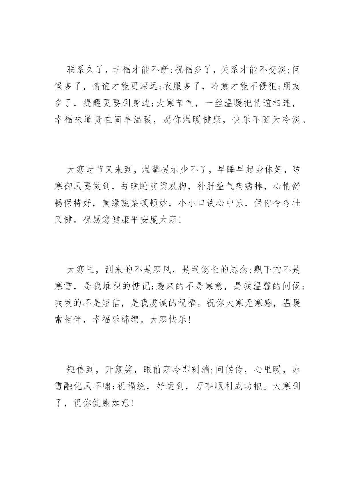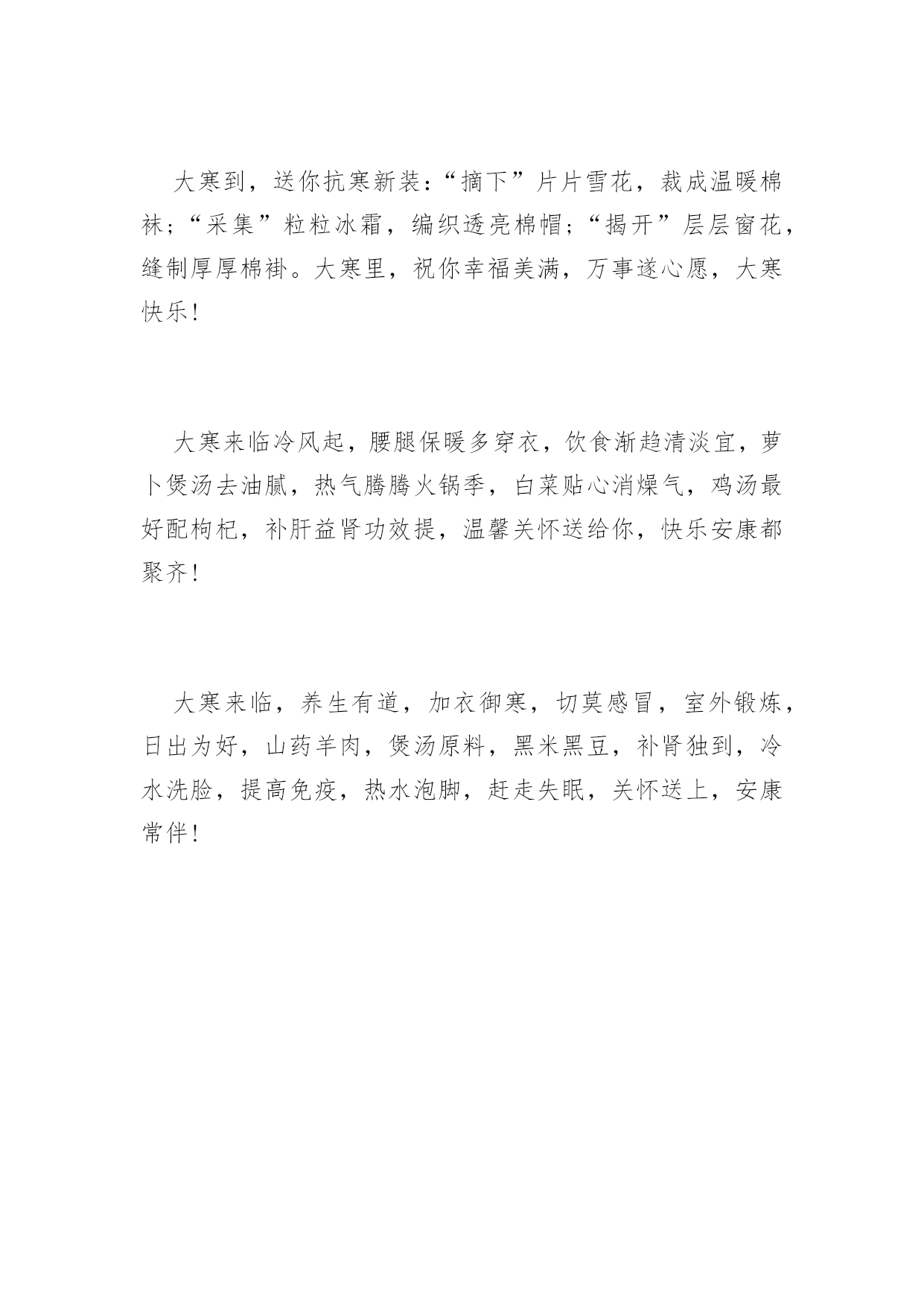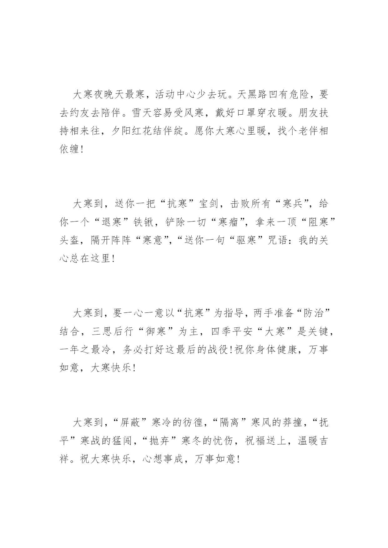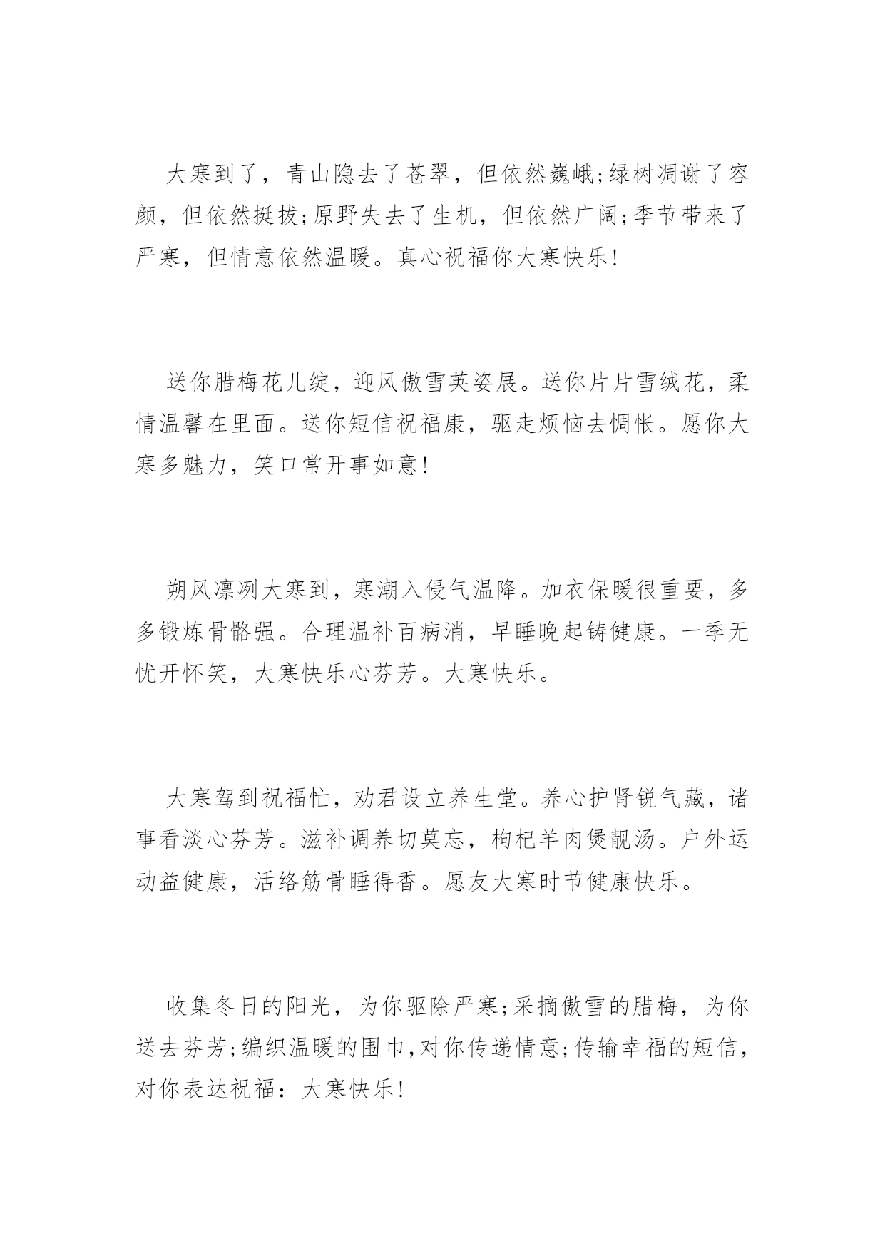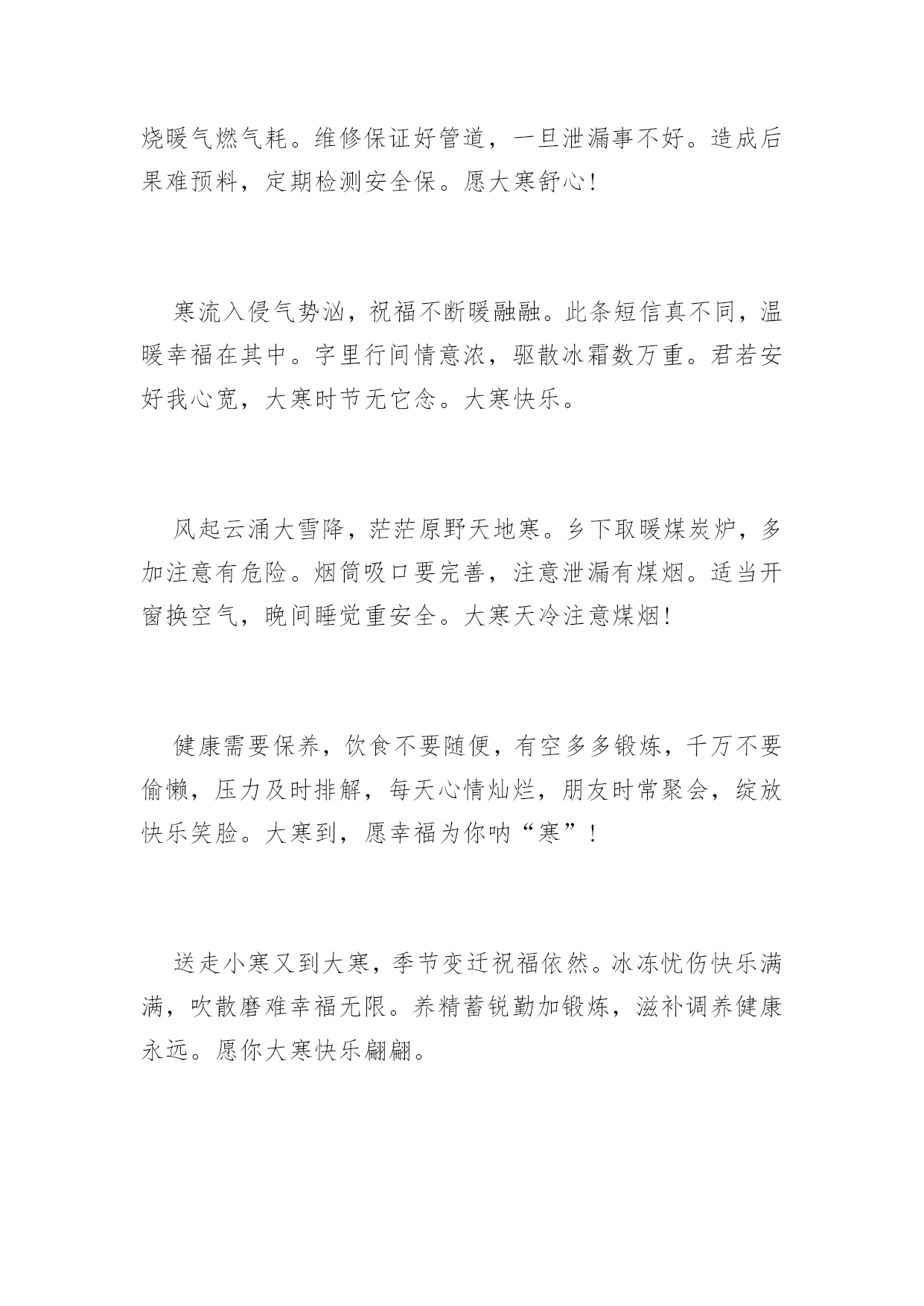 大寒祝词送问候2016年大寒祝词送问候天气再冷,有我“真心”相护;大地再寒,有我“诚意”为伴;飘雪再落,有我“牵挂”相抗;寒风再吹,有我“深情”撑挡。大寒之时,不管天冷地冷风吹雪飘,在我心中总有颗发热的源头,为你持续供暖,让你暖暖过冬!大寒到来温暖瘦,发条短信来问候。无奈困惑全放走,开心快乐不忧愁。幸福健康齐联手,永远把你放心头。愿你大寒快乐享不够。大寒了,让友情的火把,照亮美好的明天;让冬日的暖阳,晒光生活的烦恼;让真挚的问候,温暖朋友的`心窝。朋友,愿你大寒多多保重,一切安好!冰天雪地是大寒,平安健康心惦念。加衣保暖营养餐,工作再忙食为天。富贵名誉如云烟,情意似金永灿烂。祝你,大寒快乐迎新年。联系久了,幸福才能不断;祝福多了,关系才能不变淡;问候多了,情谊才能更深远;衣服多了,冷意才能不侵犯;朋友多了,提醒更要到身边;大寒节气,一丝温暖把情谊相连,幸福味道贵在简单温暖,愿你温暖健康,快乐不随天冷淡。大寒时节又来到,温馨提示少不了,早睡早起身体好,防寒御风要做到,每晚睡前烫双脚,补肝益气疾病掉,心情舒畅保持好,黄绿蔬菜顿顿妙,小小口诀心中咏,保你今冬壮又健。祝愿您健康平安度大寒!大寒里,刮来的不是寒风,是我悠长的思念;飘下的不是寒雪,是我堆积的惦记;袭来的不是寒意,是我温馨的问候;我发的不是短信,是我虔诚的祝福。祝你大寒无寒感,温暖常相伴,幸福乐绵绵。大寒快乐!短信到,开颜笑,眼前寒冷即刻消;问候传,心里暖,冰雪融化风不啸;祝福绕,好运到,万事顺利成功抱。大寒到了,祝你健康如意!寒潮来势汹汹,难挡情意融融。短信表我寸心,祝福从天降临。愿友快乐不断,绽放幸福笑颜。健康守护左右,平安伴你长久。大寒快乐。大寒季节近年关,千家万户备春忙。大雪封陆路难行,泥水四溅防滑拌。一条短信遥递传,真情挚爱在里面。放假早日归故里,父母焦心儿女盼。愿你早日回家乡,早了老人心意愿。呼啸的寒风中夹着我的暖暖叮咛,注意保暖;纷飞的雪花里裹着我的温切关怀,小心出行;寒冷的空气中融着我的炙热心愿,健康平安;大寒到,愿你健康相伴,大寒快乐!门窗玻璃霜花绽,精雕细琢美伦幻。探身满目白雪茫,寒风袭身打寒顫。回身急忙加衣裳,防寒大衣羽绒装。狐皮帽子裘绒巾,牛皮靴子耳套装。愿君大寒好身体,阳光灿烂展魅力!冬季吃点生姜,身体暖和不怕风霜;新鲜蔬菜水果,多多益善不怕上火;锻炼注意场所,遇上雾霾记得闪躲。大寒到,朋友添衣保暖,愿你心情美丽无限!北风呼啸大寒到,天寒地滑出行难,小心慢行放心上,平平安安是第一,保暖工作做充足,谨防感冒身安康,一条祝福送温暖,大寒快乐福相伴,身康体健笑开怀!大雪越积越厚,情谊越来越深。大风越刮越寒,思念越来越浓。天气越来越冻,牵挂越来越强。阳光越来越冷,我的爱恋越来越热烈。朋友:愿你大寒像梅花,绽放美丽人人夸!一份关怀,驱散严寒,温暖入心;一份关心,赶跑寒冷,温馨相伴;一份关爱,拉近你我,温情永在;大寒到,送你一声问候,包含满满的关切,愿你幸福安康,大寒快乐!用心编写一条短信,温暖心情。用爱搭建一座桥梁,宽胸畅心。用情编织一件衣服,暖身保健。用意建造一所房屋,安居乐业。愿你大寒喜笑颜开!冰封大河雪积道,寒风啸声野兔逃。家户闭门温暖保,自烧暖气燃气耗。维修保证好管道,一旦泄漏事不好。造成后果难预料,定期检测安全保。愿大寒舒心!寒流入侵气势汹,祝福不断暖融融。此条短信真不同,温暖幸福在其中。字里行间情意浓,驱散冰霜数万重。君若安好我心宽,大寒时节无它念。大寒快乐。风起云涌大雪降,茫茫原野天地寒。乡下取暖煤炭炉,多加注意有危险。烟筒吸口要完善,注意泄漏有煤烟。适当开窗换空气,晚间睡觉重安全。大寒天冷注意煤烟!健康需要保养,饮食不要随便,有空多多锻炼,千万不要偷懒,压力及时排解,每天心情灿烂,朋友时常聚会,绽放快乐笑脸。大寒到,愿幸福为你呐“寒”!送走小寒又到大寒,季节变迁祝福依然。冰冻忧伤快乐满满,吹散磨难幸福无限。养精蓄锐勤加锻炼,滋补调养健康永远。愿你大寒快乐翩翩。雪花飘起来,眷恋着你的情怀,风吹扫雾霾,晴空万里心愉快,心有千万结,痴痴的为你等待,期待雪花开,银装素裹情常在。愿你大寒笑开怀,好运幸福迎面来!雪花飞舞从天降,老天无情人间暖。花开花落誰无枯,人间自有情谊燃。老天下雪我送碳,它刮大风我来挡。黑夜我来送光明,解除烦恼短信传。愿大寒愉悦!你如青松傲风霜,你像寒梅芬芳艳。你似寒冬暖阳天,你是我的好朋友。片片雪花我的情,送你祝福我心愿。惟愿朋友身体好,再大困难都不怕。大寒康健!大寒心莫慌,严寒怎抵意志强?加强锻炼体魄健,食物温补利健康。朋友情意更无量,声声问候暖心房。祝你大寒人安康,幸福美满笑声扬。祝大寒快乐!一抹暖阳,驱散严寒,暖透心窝;一份牵挂,时时惦念,萦绕于心;一声问候,满含关切,