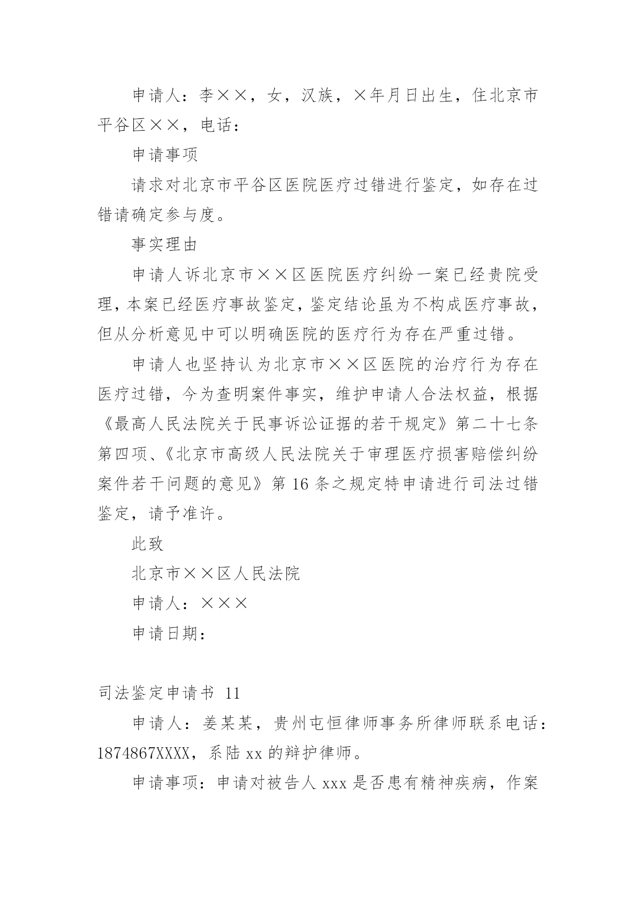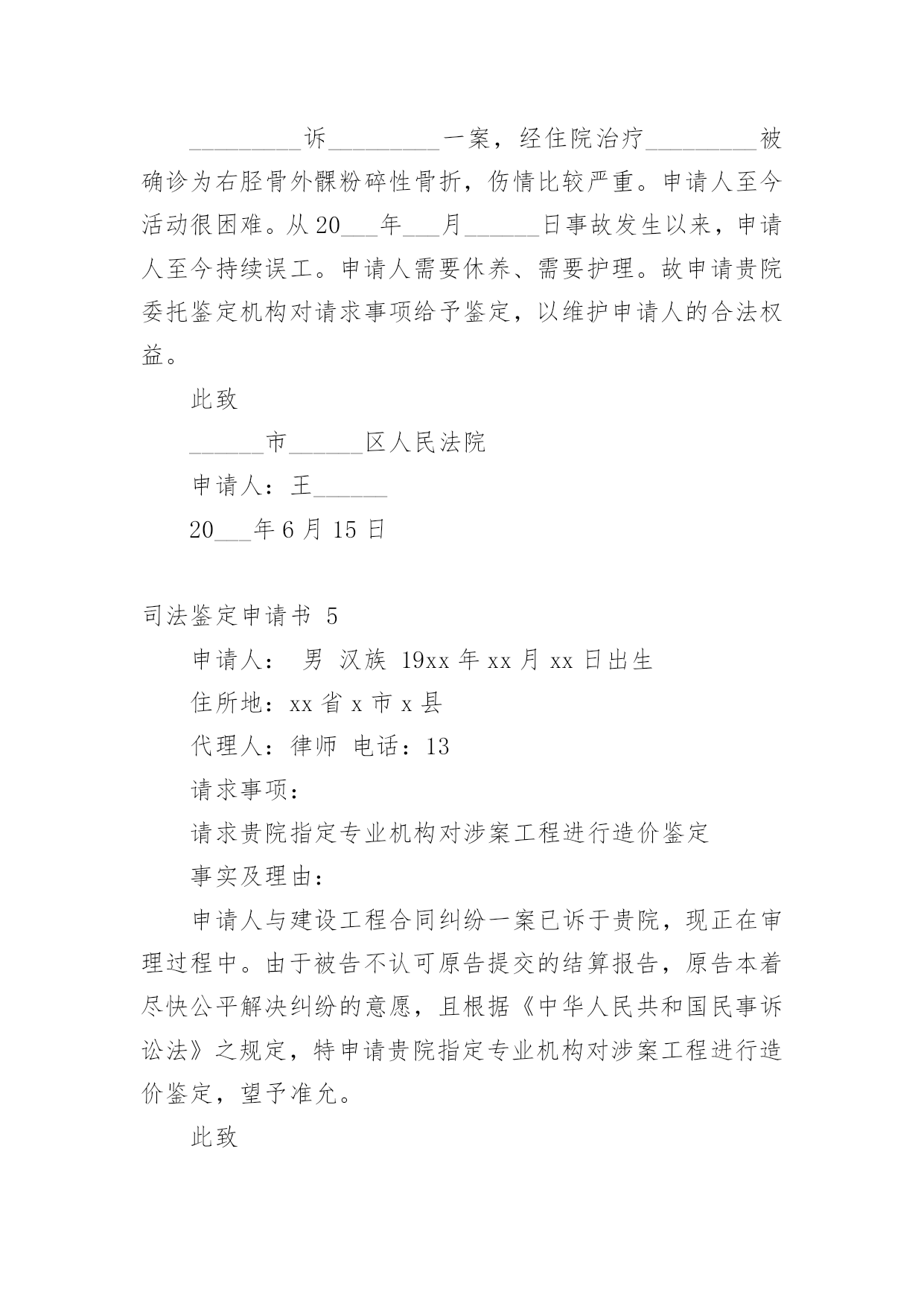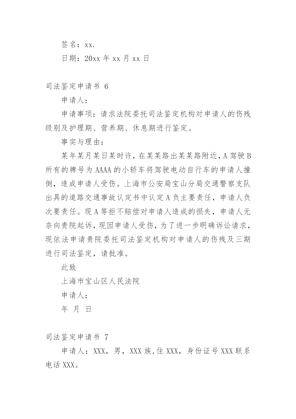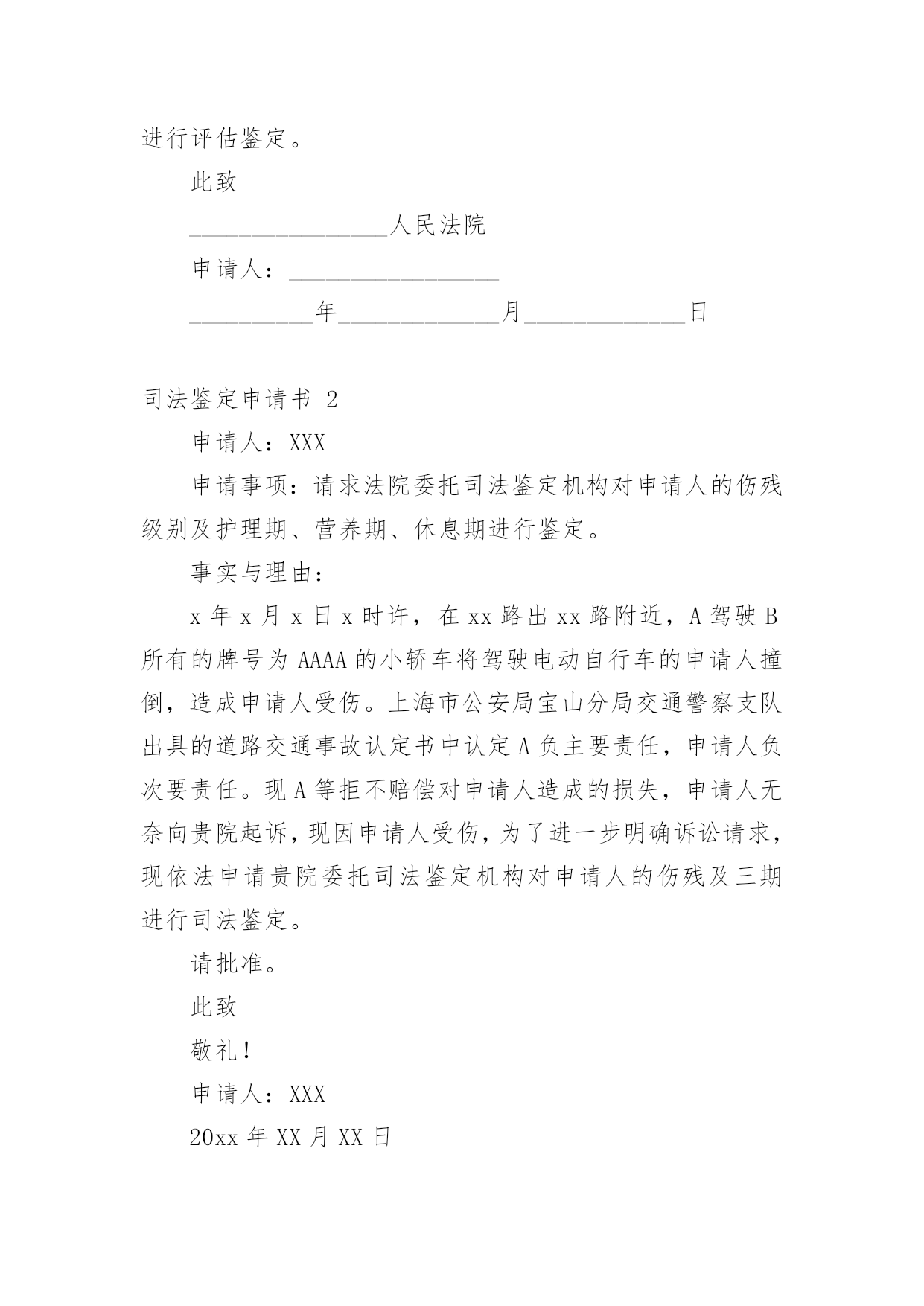 司法鉴定申请书司法鉴定申请书(精选15篇)在一步步向前发展的社会中,有各项事务需要申请书,在写作上,申请书也具有一定的格式。那么写申请书真的很难吗?以下是小编收集整理的司法鉴定申请书,欢迎大家借鉴与参考,希望对大家有所帮助。司法鉴定申请书1申请人:_________________,性别:_________,__________________年_____________月_____________日出生,_____________族,住址是__________________________被申请人,性别:_________,____________年_____________月_____________日,____________族,住址是_______________________________请求事项:_________________请求法院依法委托具备相关资质的司法鉴定单位对申请人的经济损失进行评估。事实和理由__________年_____________月_____________日,被告________________公司所修的涵洞质量不合格,导致原告在运输小麦的运输过程中车辆发生侧翻,将车上的小麦倾倒入附近的水渠中,给原告造成了重大的经济损失。为查清事实损失的________________数额,请求法院依法委托鉴定单位进行评估鉴定。此致________________人民法院申请人:___________________________年_____________月_____________日司法鉴定申请书2申请人:XXX申请事项:请求法院委托司法鉴定机构对申请人的伤残级别及护理期、营养期、休息期进行鉴定。事实与理由:x年x月x日x时许,在xx路出xx路附近,A驾驶B所有的牌号为AAAA的小轿车将驾驶电动自行车的申请人撞倒,造成申请人受伤。上海市公安局宝山分局交通警察支队出具的道路交通事故认定书中认定A负主要责任,申请人负次要责任。现A等拒不赔偿对申请人造成的损失,申请人无奈向贵院起诉,现因申请人受伤,为了进一步明确诉讼请求,现依法申请贵院委托司法鉴定机构对申请人的伤残及三期进行司法鉴定。请批准。此致敬礼!申请人:XXX20xx年XX月XX日司法鉴定申请书3申请人:案由:刑事附带民事诉讼申请事项:对申请人受伤部位伤残等级和休息期、护理期、营养期等三期进行司法鉴定。事实与理由申请人是贵院受理的刑事附带民事诉讼的被害人、附带民事诉讼原告人,现在本人受伤尚未治愈,须要继续治疗、休养,为主张民事赔偿权利,特申请贵院指定相关鉴定机构对申请人受伤部位伤残等级和休息期、护理期、营养期等三期进行司法鉴定。为正确维护权益,请求法院准予我的申请事项。此致XX市XXX区人民法院____年____月____日司法鉴定申请书4申请人:____________申请事项一、对申请人的伤残状况作出伤残等级鉴定;二、对申请人误工期限、护理期限进行鉴定;(部分地区不给鉴定,南方有的地区有鉴定的)事实与理由_________诉_________一案,经住院治疗_________被确诊为右胫骨外髁粉碎性骨折,伤情比较严重。申请人至今活动很困难。从20___年___月______日事故发生以来,申请人至今持续误工。申请人需要休养、需要护理。故申请贵院委托鉴定机构对请求事项给予鉴定,以维护申请人的合法权益。此致______市______区人民法院申请人:王______20___年6月15日司法鉴定申请书5申请人:男汉族19xx年xx月xx日出生住所地:xx省x市x县代理人:律师电话:13请求事项:请求贵院指定专业机构对涉案工程进行造价鉴定事实及理由:申请人与建设工程合同纠纷一案已诉于贵院,现正在审理过程中。由于被告不认可原告提交的结算报告,原告本着尽快公平解决纠纷的意愿,且根据《中华人民共和国民事诉讼法》之规定,特申请贵院指定专业机构对涉案工程进行造价鉴定,望予准允。此致签名:xx.日期:20xx年xx月xx日司法鉴定申请书6申请人:申请事项:请求法院委托司法鉴定机构对申请人的伤残级别及护理期、营养期、休息期进行鉴定。事实与理由:某年某月某日某时许,在某某路出某某路附近,A驾驶B所有的牌号为AAAA的小轿车将驾驶电动自行车的申请人撞倒,造成申请人受伤。上海市公安局宝山分局交通警察支队出具的道路交通事故认定书中认定A负主要责任,申请人负次要责任。现A等拒不赔偿对申请人造成的损失,申请人无奈向贵院起诉,现因申请人受伤,为了进一步明确诉讼请求,现依法申请贵院委托司法鉴定机构对申请人的伤残及三期进行司法鉴定,请批准。此致上海市宝山区人民法院申请人:年月日司法鉴定申请书7申请人:XXX,男,XXX族,住XXX,身份证号XXX联系电话XXX。申请事项: