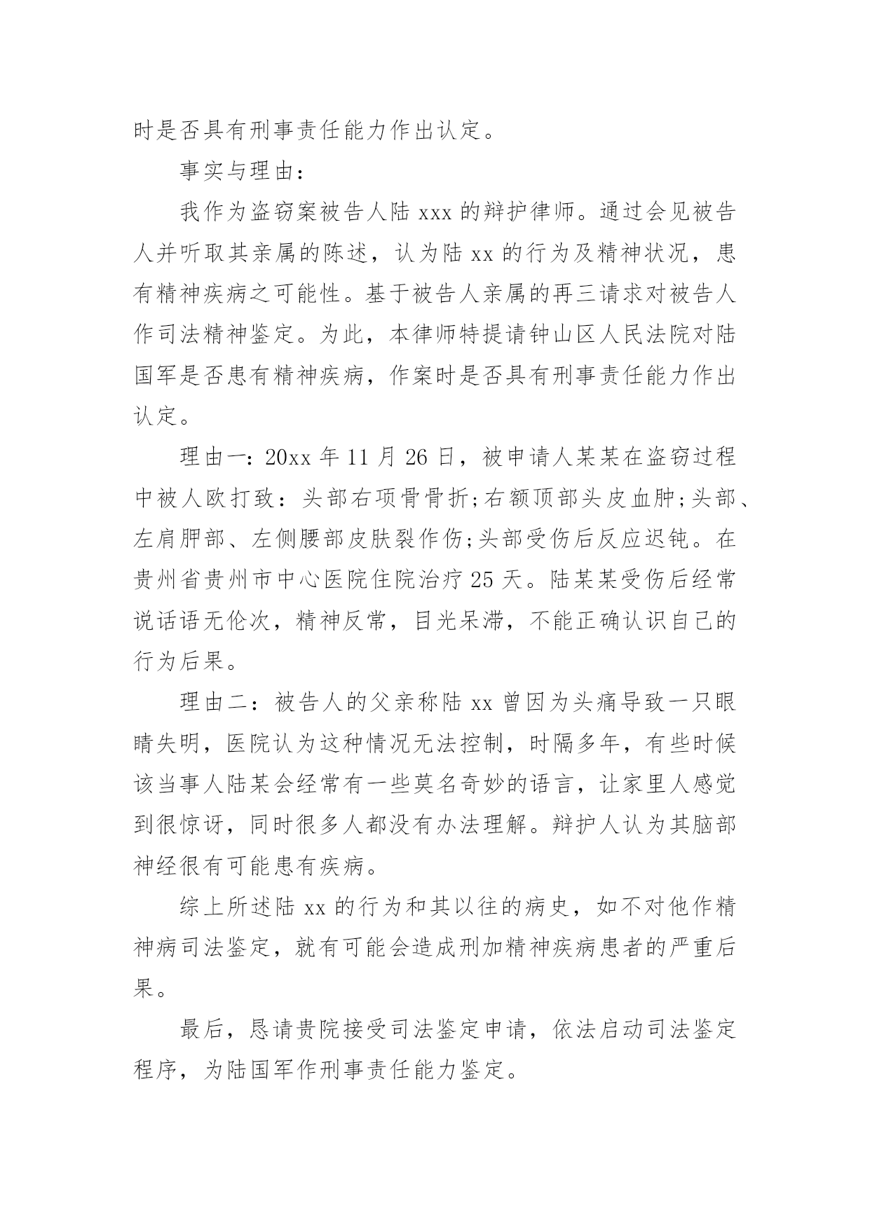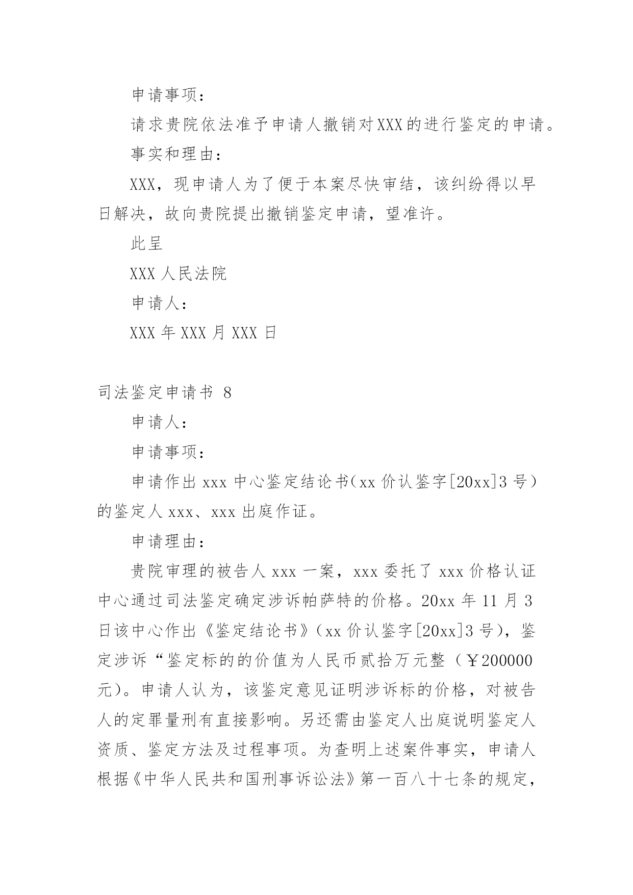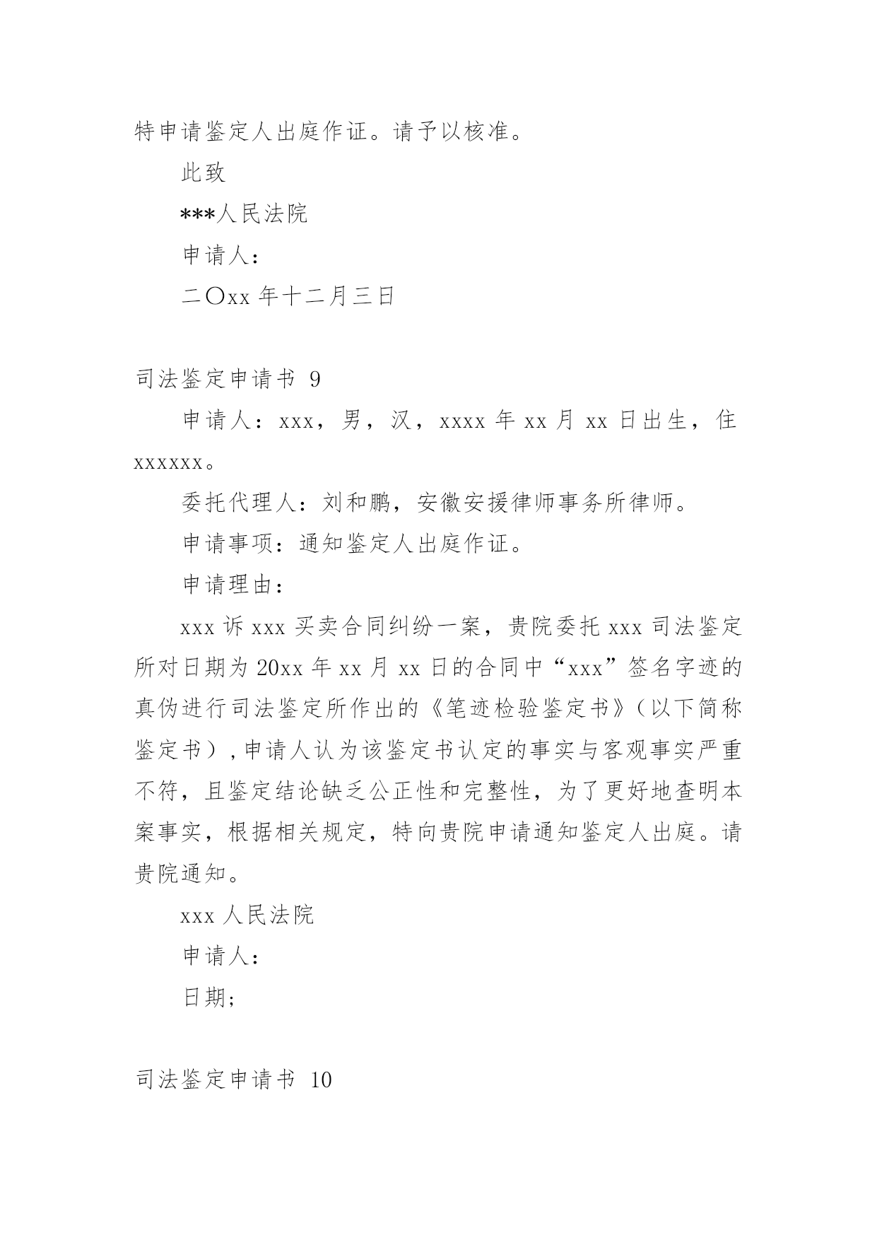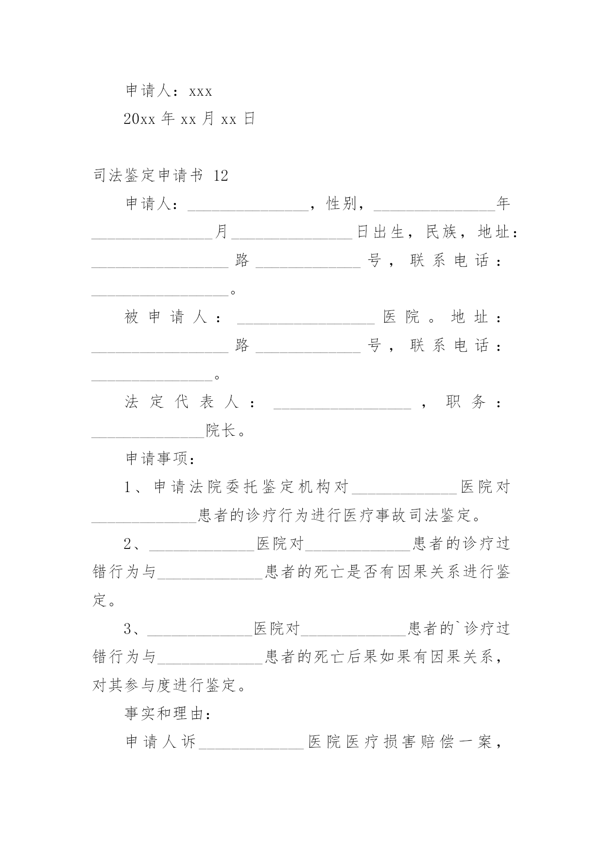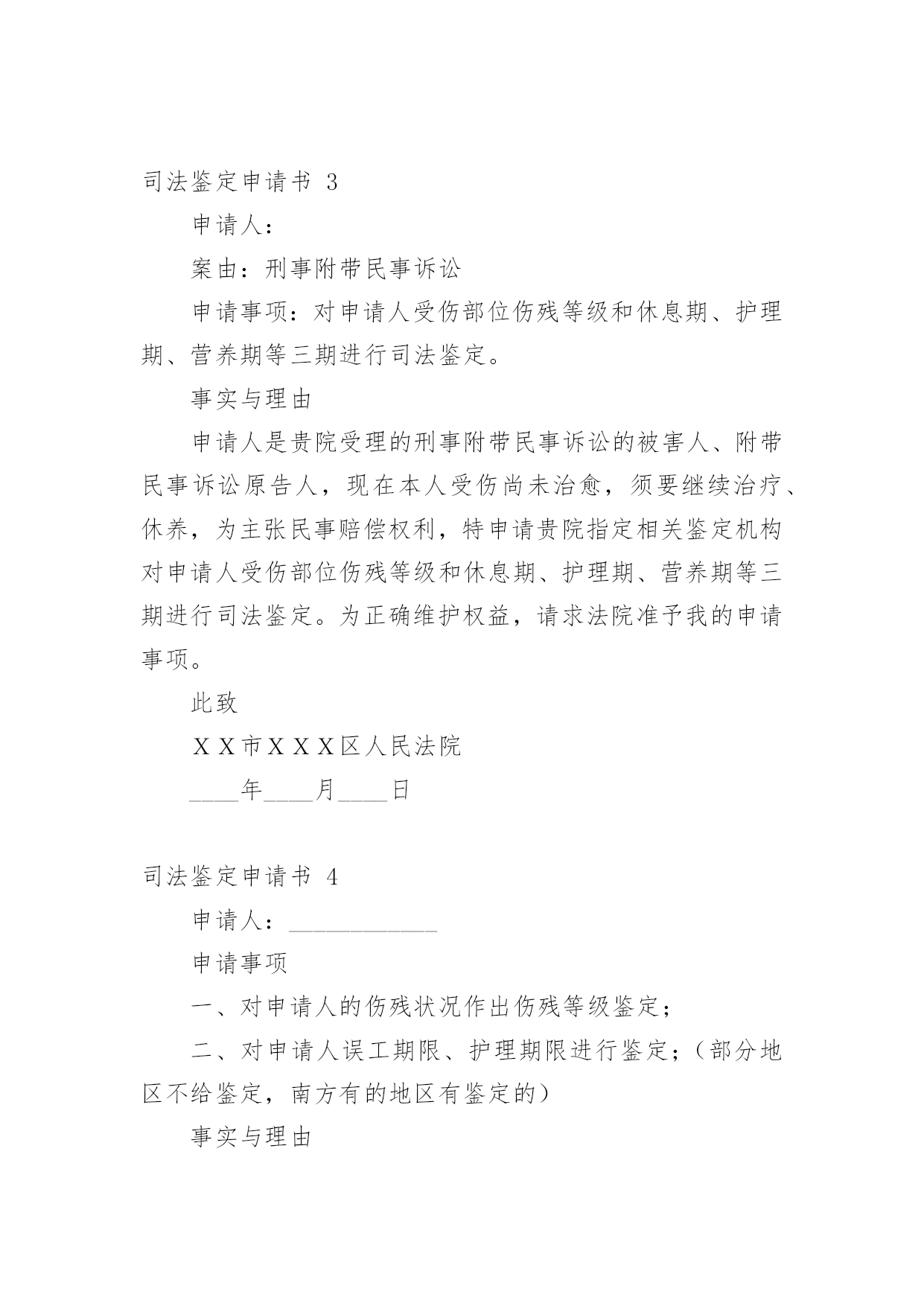 司法鉴定申请书司法鉴定申请书(精选15篇)在一步步向前发展的社会中,有各项事务需要申请书,在写作上,申请书也具有一定的格式。那么写申请书真的很难吗?以下是小编收集整理的司法鉴定申请书,欢迎大家借鉴与参考,希望对大家有所帮助。司法鉴定申请书1申请人:_________________,性别:_________,__________________年_____________月_____________日出生,_____________族,住址是__________________________被申请人,性别:_________,____________年_____________月_____________日,____________族,住址是_______________________________请求事项:_________________请求法院依法委托具备相关资质的司法鉴定单位对申请人的经济损失进行评估。事实和理由__________年_____________月_____________日,被告________________公司所修的涵洞质量不合格,导致原告在运输小麦的运输过程中车辆发生侧翻,将车上的小麦倾倒入附近的水渠中,给原告造成了重大的经济损失。为查清事实损失的________________数额,请求法院依法委托鉴定单位进行评估鉴定。此致________________人民法院申请人:___________________________年_____________月_____________日司法鉴定申请书2申请人:XXX申请事项:请求法院委托司法鉴定机构对申请人的伤残级别及护理期、营养期、休息期进行鉴定。事实与理由:x年x月x日x时许,在xx路出xx路附近,A驾驶B所有的牌号为AAAA的小轿车将驾驶电动自行车的申请人撞倒,造成申请人受伤。上海市公安局宝山分局交通警察支队出具的道路交通事故认定书中认定A负主要责任,申请人负次要责任。现A等拒不赔偿对申请人造成的损失,申请人无奈向贵院起诉,现因申请人受伤,为了进一步明确诉讼请求,现依法申请贵院委托司法鉴定机构对申请人的伤残及三期进行司法鉴定。请批准。此致敬礼!申请人:XXX20xx年XX月XX日司法鉴定申请书3申请人:案由:刑事附带民事诉讼申请事项:对申请人受伤部位伤残等级和休息期、护理期、营养期等三期进行司法鉴定。事实与理由申请人是贵院受理的刑事附带民事诉讼的被害人、附带民事诉讼原告人,现在本人受伤尚未治愈,须要继续治疗、休养,为主张民事赔偿权利,特申请贵院指定相关鉴定机构对申请人受伤部位伤残等级和休息期、护理期、营养期等三期进行司法鉴定。为正确维护权益,请求法院准予我的申请事项。此致XX市XXX区人民法院____年____月____日司法鉴定申请书4申请人:____________申请事项一、对申请人的伤残状况作出伤残等级鉴定;二、对申请人误工期限、护理期限进行鉴定;(部分地区不给鉴定,南方有的地区有鉴定的)事实与理由_________诉_________一案,经住院治疗_________被确诊为右胫骨外髁粉碎性骨折,伤情比较严重。申请人至今活动很困难。从20___年___月______日事故发生以来,申请人至今持续误工。申请人需要休养、需要护理。故申请贵院委托鉴定机构对请求事项给予鉴定,以维护申请人的合法权益。此致______市______区人民法院申请人:王______20___年6月15日司法鉴定申请书5申请人:男汉族19xx年xx月xx日出生住所地:xx省x市x县代理人:律师电话:13请求事项:请求贵院指定专业机构对涉案工程进行造价鉴定事实及理由:申请人与建设工程合同纠纷一案已诉于贵院,现正在审理过程中。由于被告不认可原告提交的结算报告,原告本着尽快公平解决纠纷的意愿,且根据《中华人民共和国民事诉讼法》之规定,特申请贵院指定专业机构对涉案工程进行造价鉴定,望予准允。此致签名:xx.日期:20xx年xx月xx日司法鉴定申请书6申请人:申请事项:请求法院委托司法鉴定机构对申请人的伤残级别及护理期、营养期、休息期进行鉴定。事实与理由:某年某月某日某时许,在某某路出某某路附近,A驾驶B所有的牌号为AAAA的小轿车将驾驶电动自行车的申请人撞倒,造成申请人受伤。上海市公安局宝山分局交通警察支队出具的道路交通事故认定书中认定A负主要责任,申请人负次要责任。现A等拒不赔偿对申请人造成的损失,申请人无奈向贵院起诉,现因申请人受伤,为了进一步明确诉讼请求,现依法申请贵院委托司法鉴定机构对申请人的伤残及三期进行司法鉴定,请批准。此致上海市宝山区人民法院申请人:年月日司法鉴定申请书7申请人:XXX,男,XXX族,住XXX,身份证号XXX联系电话XXX。申请事项: