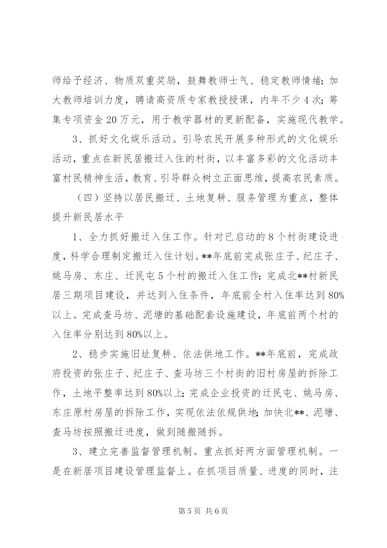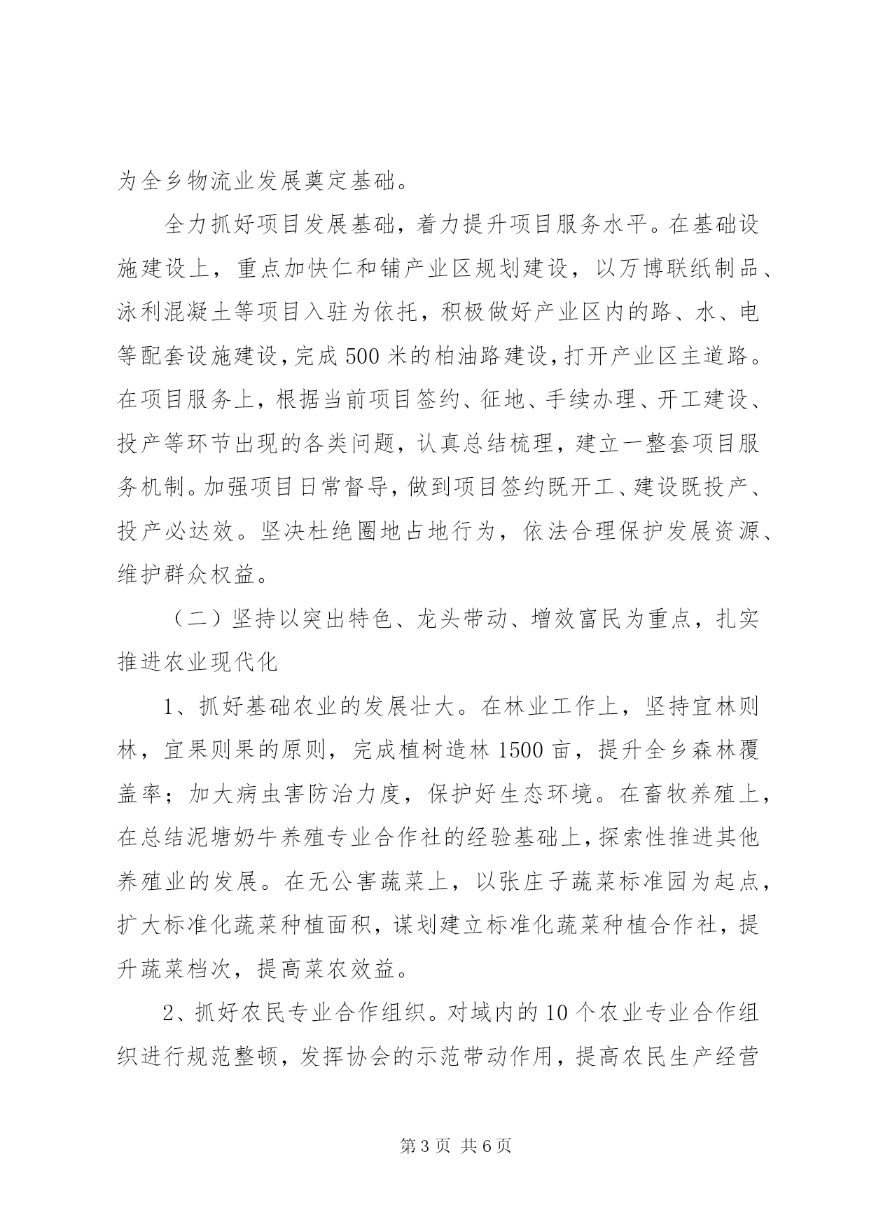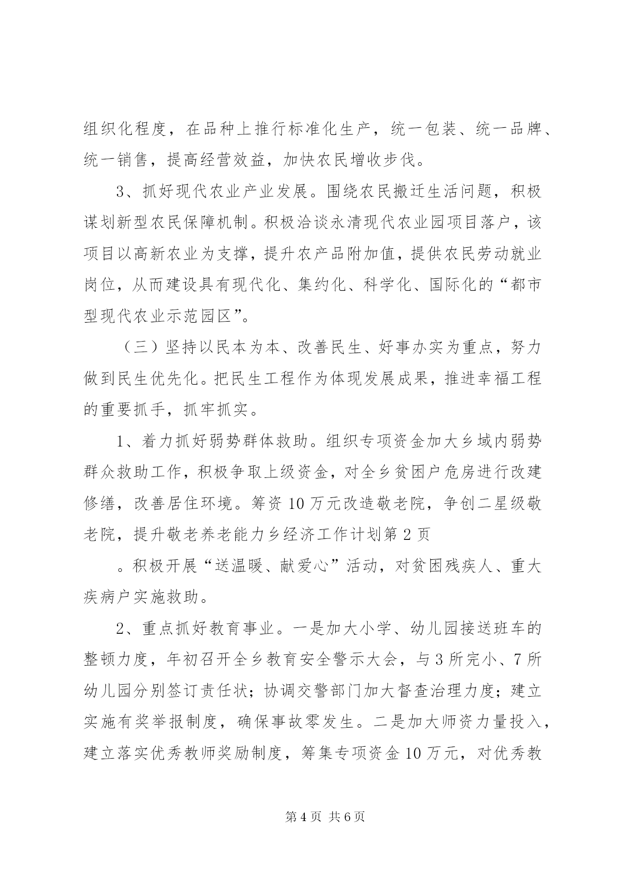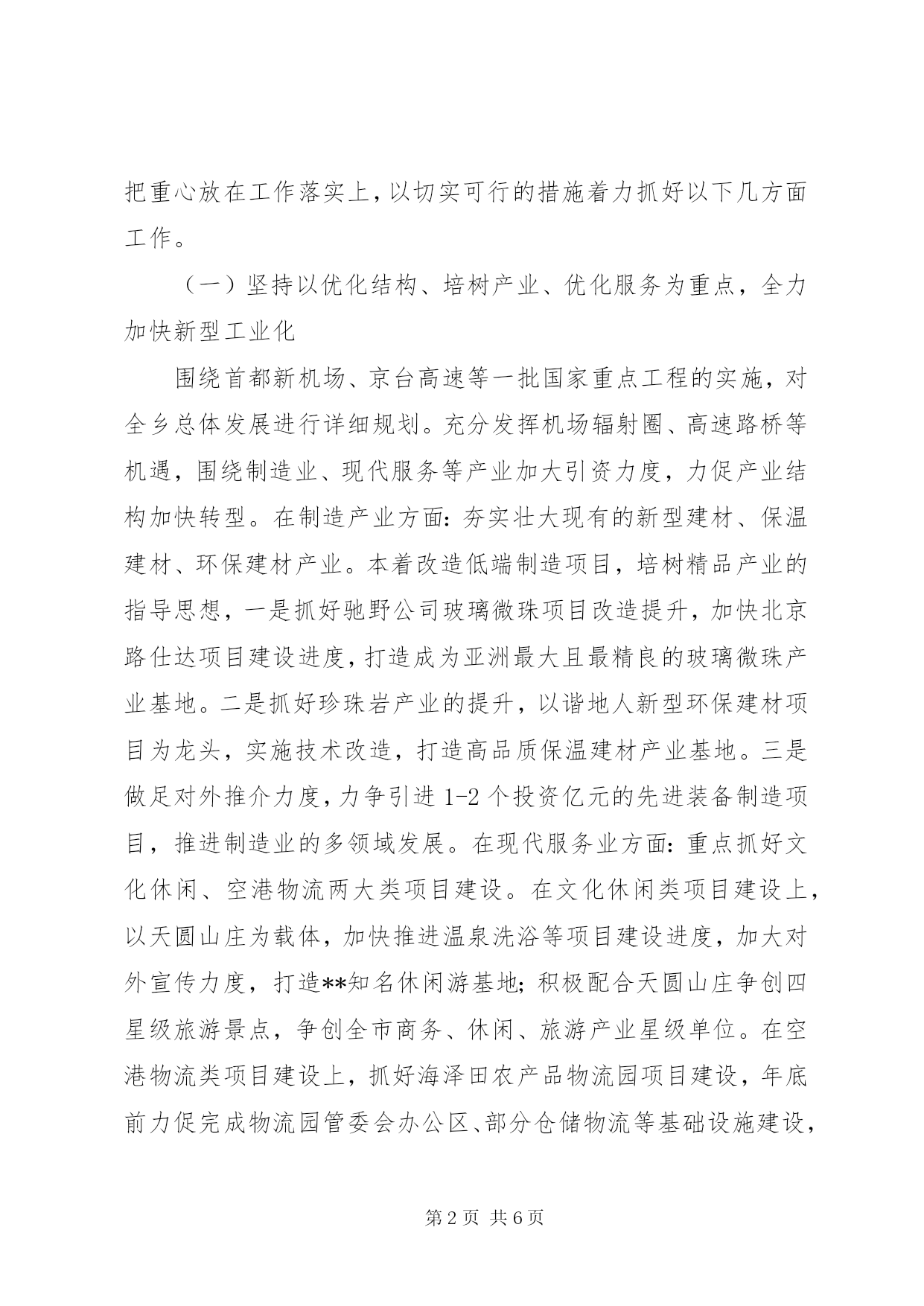 第PAGE\*Arabic\*MERGEFORMAT6页共NUMPAGES\*MERGEFORMAT6页乡经济工作计划乡工作计划**年是我乡经济社会实现快速发展的重要一年,也是贯彻落实十八大,实现“十二五”规划目标的关键一年。扎实做好明年工作,对全乡经济社会平稳向好发展具有强大的战略意义,为此我乡全面提高思想站位,科学分析发展形势,准确把握发展态势,科学谋划了**年工作思路及目标。**年工作思路。深入落实科学发展观,全面贯彻中央、省、市、县党代会精神,按照市县提出的“精良管理、高端发展”的要求,坚持以“科学发展、和谐富民、建设强镇”的发展主题,围绕“先进产业聚集地、生态宜居幸福城”的总体目标,以加快转变经济发展方式为主线,抓班子带队伍,求和谐保稳定,以产业促发展,促进乡域经济又好又快发展。以县委“五个不放松”为抓手,全力以赴推进新型工业化、农业现代化、城镇特色化、社会和谐化、组织保障化、民生优先化。抢抓机遇、攻坚克难,创新思路、务实重效,突出重点、打造亮点,不断优化发展环境,奋力开创全乡经济社会平稳较快发展的新局面。**年主要工作目标。财政收入增长15%以上,突破5000万元;引进亿元以上项目4个;农民人均纯收入增长10%以上,达到6800元。为圆满完成既定工作目标,我乡将围绕“精良管理”的要求,把重心放在工作落实上,以切实可行的措施着力抓好以下几方面工作。(一)坚持以优化结构、培树产业、优化服务为重点,全力加快新型工业化围绕首都新机场、京台高速等一批国家重点工程的实施,对全乡总体发展进行详细规划。充分发挥机场辐射圈、高速路桥等机遇,围绕制造业、现代服务等产业加大引资力度,力促产业结构加快转型。在制造产业方面:夯实壮大现有的新型建材、保温建材、环保建材产业。本着改造低端制造项目,培树精品产业的指导思想,一是抓好驰野公司玻璃微珠项目改造提升,加快北京路仕达项目建设进度,打造成为亚洲最大且最精良的玻璃微珠产业基地。二是抓好珍珠岩产业的提升,以谐地人新型环保建材项目为龙头,实施技术改造,打造高品质保温建材产业基地。三是做足对外推介力度,力争引进1-2个投资亿元的先进装备制造项目,推进制造业的多领域发展。在现代服务业方面:重点抓好文化休闲、空港物流两大类项目建设。在文化休闲类项目建设上,以天圆山庄为载体,加快推进温泉洗浴等项目建设进度,加大对外宣传力度,打造**知名休闲游基地;积极配合天圆山庄争创四星级旅游景点,争创全市商务、休闲、旅游产业星级单位。在空港物流类项目建设上,抓好海泽田农产品物流园项目建设,年底前力促完成物流园管委会办公区、部分仓储物流等基础设施建设,为全乡物流业发展奠定基础。全力抓好项目发展基础,着力提升项目服务水平。在基础设施建设上,重点加快仁和铺产业区规划建设,以万博联纸制品、泳利混凝土等项目入驻为依托,积极做好产业区内的路、水、电等配套设施建设,完成500米的柏油路建设,打开产业区主道路。在项目服务上,根据当前项目签约、征地、手续办理、开工建设、投产等环节出现的各类问题,认真总结梳理,建立一整套项目服务机制。加强项目日常督导,做到项目签约既开工、建设既投产、投产必达效。坚决杜绝圈地占地行为,依法合理保护发展资源、维护群众权益。(二)坚持以突出特色、龙头带动、增效富民为重点,扎实推进农业现代化1、抓好基础农业的发展壮大。在林业工作上,坚持宜林则林,宜果则果的原则,完成植树造林1500亩,提升全乡森林覆盖率;加大病虫害防治力度,保护好生态环境。在畜牧养殖上,在总结泥塘奶牛养殖专业合作社的经验基础上,探索性推进其他养殖业的发展。在无公害蔬菜上,以张庄子蔬菜标准园为起点,扩大标准化蔬菜种植面积,谋划建立标准化蔬菜种植合作社,提升蔬菜档次,提高菜农效益。2、抓好农民专业合作组织。对域内的10个农业专业合作组织进行规范整顿,发挥协会的示范带动作用,提高农民生产经营组织化程度,在品种上推行标准化生产,统一包装、统一品牌、统一销售,提高经营效益,加快农民增收步伐。3、抓好现代农业产业发展。围绕农民搬迁生活问题,积极谋划新型农民保障机制。积极洽谈永清现代农业园项目落户,该项目以高新农业为支撑,提升农产品附加值,提供农民劳动就业岗位,从而建设具有现代化、集约化、科学化、国际化的“都市型现代农业示范园区”。(三)坚持以民本为本、改善民生、好事办实为重点,努力做到民生优先化。把民生工程作为体现发展成果,推进幸福工程的重要抓手,抓牢抓实。1、着力抓好弱势群体救助。组织专项资金加大乡域内弱势群众救助工作,积极争取上级资金,对全乡贫困户危房进行改建修缮,改善居住环境。筹资10万元改造敬老院,争创二星级敬老院,提升敬老养老能力乡经济工作计划。积极开展“送温暖、献爱心”活动,对贫困残疾人、重大疾病户实施救助。2、重点抓好