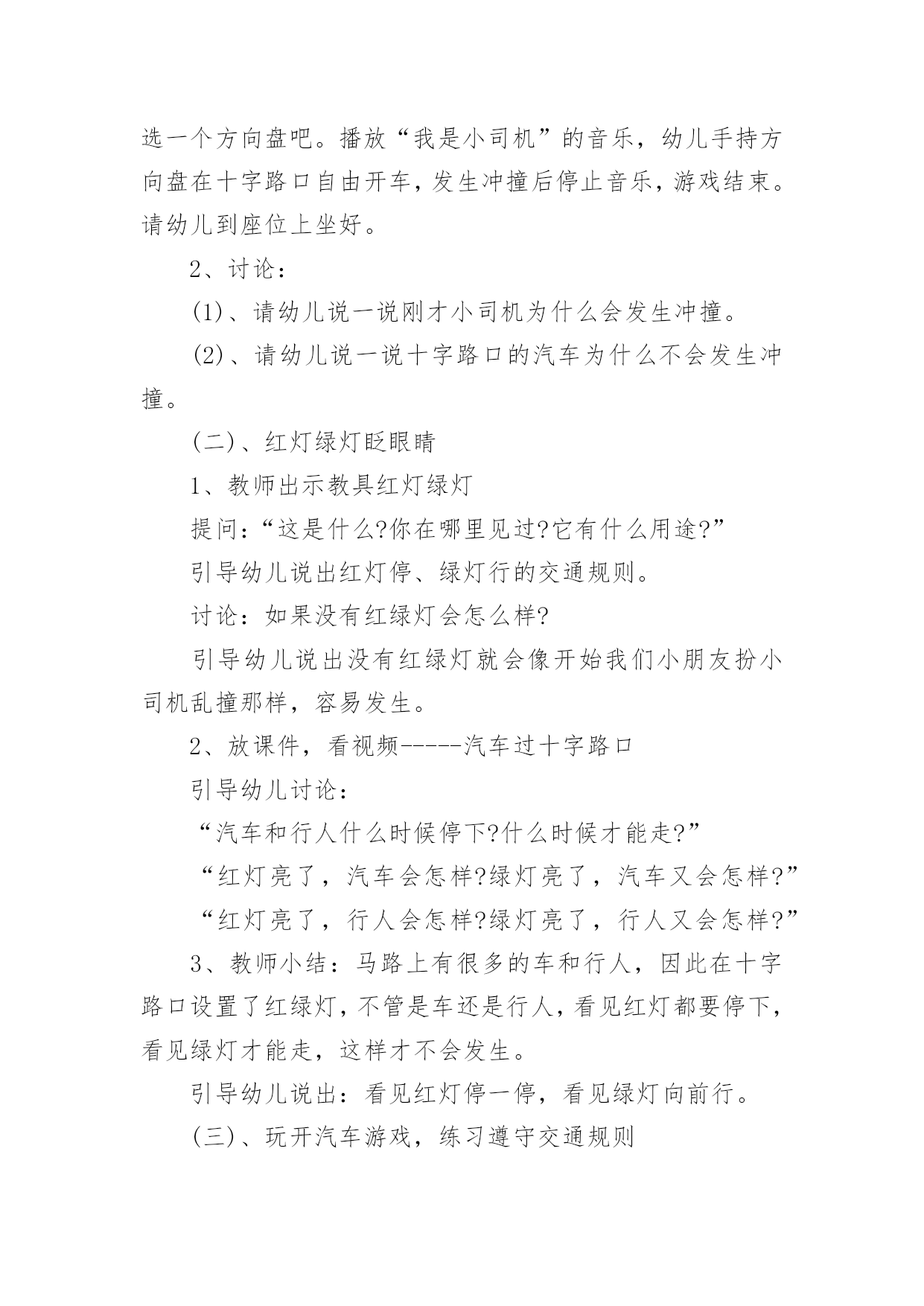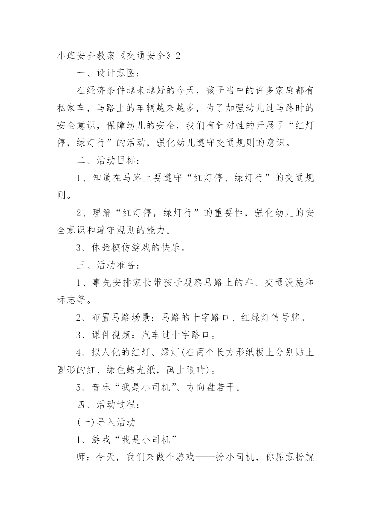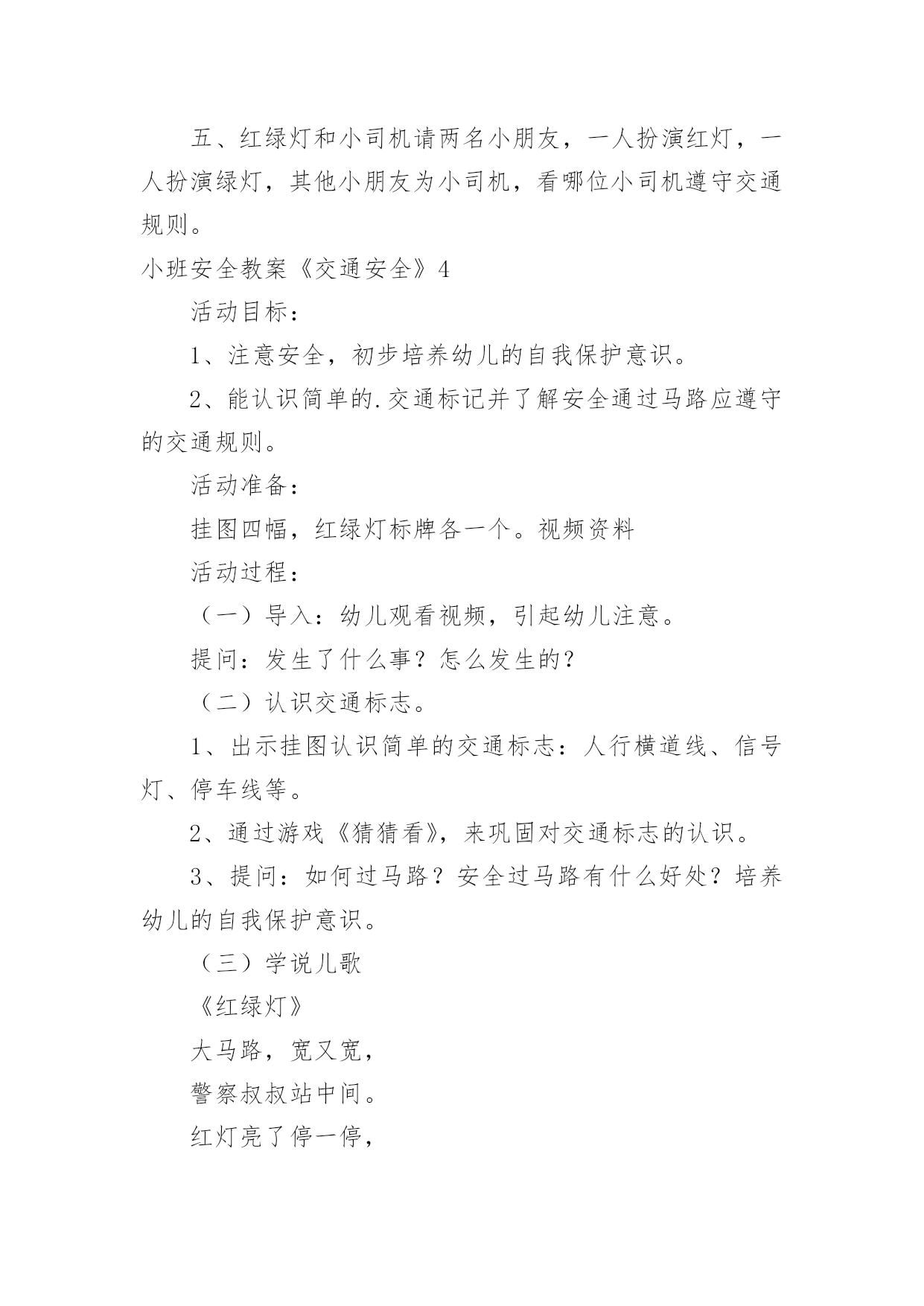 小班安全教案《交通安全》小班安全教案《交通安全》作为一名老师,通常需要准备好一份教案,借助教案可以更好地组织教学活动。那么写教案需要注意哪些问题呢?下面是小编为大家整理的小班安全教案《交通安全》,仅供参考,欢迎大家阅读。小班安全教案《交通安全》1活动目标:1.幼儿了解一些基本的道路交通安全知识,认识一些常见的交通标志。2.幼儿能积极参与到活动中来,在游戏活动中体验交通规则的重要性,懂得如何在实际情景中运用所知道的交通安全知识。3.幼儿养成自觉地遵守交通规则的好习惯。活动重点:幼儿了解一些基本的道路交通安全知识,认识一些常见的交通标志。活动难点:幼儿在游戏活动中体验交通规则的'重要性,懂得如何在实际情景中运用所知道的交通安全知识。活动准备:物质准备:课件,儿童自行车两辆,小汽车(扭扭车)两辆,红绿信号灯标志,汽车方向盘4个,一顶警帽,交通安全小卫士的贴纸。经验准备:幼儿知道一些简单的道路交通安全知识。场地准备:布置好活动场景(模拟十字路口),画好机动车道、非机动车道、人行横道。活动过程:一、幼儿观看课件,教师引导幼儿讨论:1.幼儿观看课件1――《上学路上》,教师提问:刚才的动画片告诉我们上学路上应该注意些什么?哪些行为是违反交通规则的?正确的应该怎么做?对回答问题的小朋友进行鼓励,把交通安全小卫士的贴片贴在小朋友的胸前。2.幼儿观看课件2――认识一些常见的交通标志,教师提问:你认识这些标志吗?你知道它们是什么意思吗?(禁止非机动车行驶,行人走道,禁止行人通过,减速慢行、注意行人)二、设置情境,幼儿模拟过十字路口:1.组织幼儿按十字型分组坐在画好的场地上。幼儿认识斑马线、非机动车道,机动车道。2.幼儿游戏,模拟看信号灯过马路:两个小朋友开扭扭车当司机,两个小朋友骑单车以及四个行人模拟过十字路口。幼儿在没有指挥的情况下过十字路口,车辆和行人任意穿行。引导幼儿讨论:小朋友,刚才你们看到了什么?他们做得对吗?他们应该怎么做?教师小结幼儿讲述,出示红绿信号灯,请出一位幼儿来当指挥,幼儿再次有序地过马路。3.幼儿模拟看现场指挥过十字路口刚才我们认识的红绿灯和交通标志对维护交通安全起着重要的作用。但不是每个路口都有红绿灯,没有红绿灯的路口由谁来指挥交通呢?(交通警察)交通警察怎么指挥交通呢?你们想学交通指挥手势吗?幼儿学习几种简单的交通指挥手势。请一名幼儿戴上警帽当交警,幼儿模拟看现场指挥过十字路口。三、创设游戏情境:去郊游现在,我们开车去郊游吧!请一名幼儿戴上警帽当交警,其他幼儿分为四组,前面的小朋友当司机(每人一个方向盘),后面的小朋友依次抱着前一位小朋友的腰,做成开公共汽车的样子。教师提示:在没有任何交通标志的马路上,大家应该靠右边行走,过马路时,应看看两边没有车辆时再过马路。幼儿看交通警察指挥手势,教师播放课件,幼儿在交通安全童谣的音乐中模拟过十字路口(幼儿轮流当司机)。教师进行活动总结,鼓励幼儿养成自觉地遵守交通规则的好习惯:今天大家表现得都很出色,都可以成为一名合格的交通安全小卫士(给没有得到贴片的幼儿贴上小贴片)。希望小朋友从小养成遵守交通规则的好习惯,并告诉我们的爸爸妈妈及身边所有的人,自觉维护交通安全,让更多的孩子安安全全到家。小班安全教案《交通安全》2一、设计意图:在经济条件越来越好的今天,孩子当中的许多家庭都有私家车,马路上的车辆越来越多,为了加强幼儿过马路时的安全意识,保障幼儿的安全,我们有针对性的开展了“红灯停,绿灯行”的活动,强化幼儿遵守交通规则的意识。二、活动目标:1、知道在马路上要遵守“红灯停、绿灯行”的交通规则。2、理解“红灯停,绿灯行”的重要性,强化幼儿的安全意识和遵守规则的能力。3、体验模仿游戏的快乐。三、活动准备:1、事先安排家长带孩子观察马路上的车、交通设施和标志等。2、布置马路场景:马路的十字路口、红绿灯信号牌。3、课件视频:汽车过十字路口。4、拟人化的红灯、绿灯(在两个长方形纸板上分别贴上圆形的红、绿色蜡光纸,画上眼睛)。5、音乐“我是小司机”、方向盘若干。四、活动过程:(一)导入活动1、游戏“我是小司机”师:今天,我们来做个游戏——扮小司机,你愿意扮就选一个方向盘吧。播放“我是小司机”的音乐,幼儿手持方向盘在十字路口自由开车,发生冲撞后停止音乐,游戏结束。请幼儿到座位上坐好。2、讨论:(1)、请幼儿说一说刚才小司机为什么会发生冲撞。(2)、请幼儿说一说十字路口的汽车为什么不会发生冲撞。(二)、红灯绿灯眨眼睛1、教师出示教具红灯绿灯提问:“这是什么?你在哪里见过?它有什么用途?”引导幼儿说出红灯停、绿灯行的交通规则。讨论:如果没有红绿灯会怎么样?引导幼儿说出没有红绿灯就会像开始我们小朋友扮小司机乱撞那样,容易发生。2、放课件,看视频-----汽车过十字路口引导幼儿讨论:“汽车和行人什么时候停下