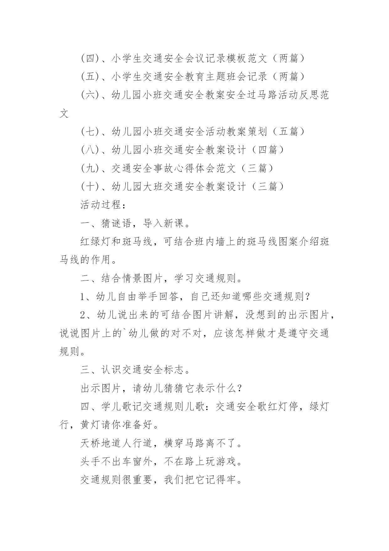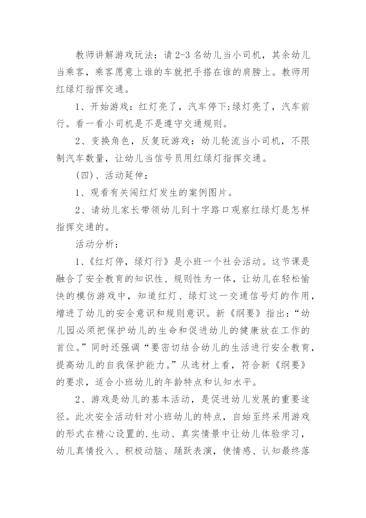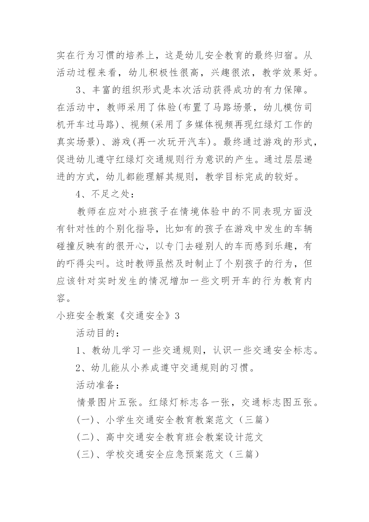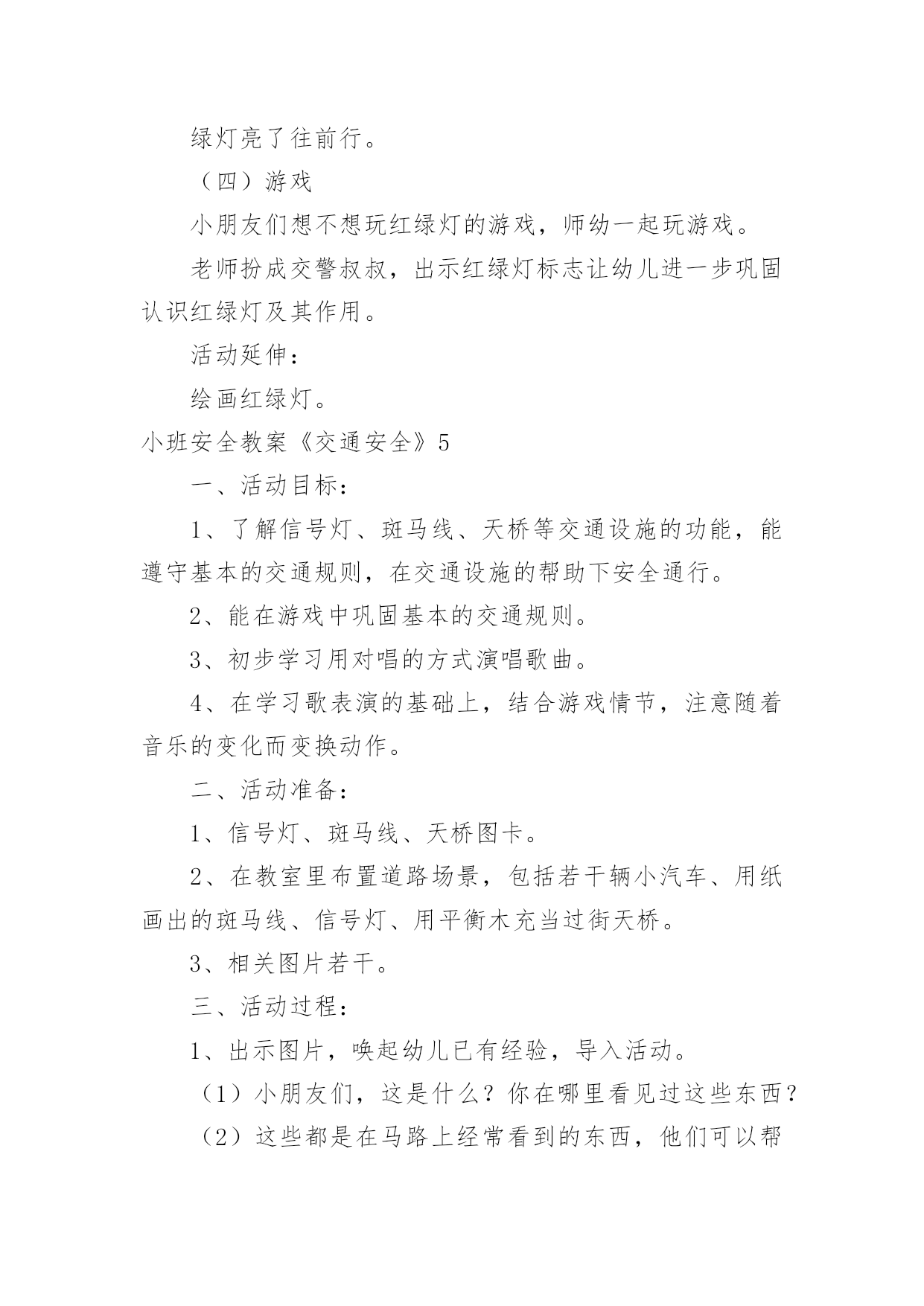 小班安全教案《交通安全》小班安全教案《交通安全》作为一名老师,通常需要准备好一份教案,借助教案可以更好地组织教学活动。那么写教案需要注意哪些问题呢?下面是小编为大家整理的小班安全教案《交通安全》,仅供参考,欢迎大家阅读。小班安全教案《交通安全》1活动目标:1.幼儿了解一些基本的道路交通安全知识,认识一些常见的交通标志。2.幼儿能积极参与到活动中来,在游戏活动中体验交通规则的重要性,懂得如何在实际情景中运用所知道的交通安全知识。3.幼儿养成自觉地遵守交通规则的好习惯。活动重点:幼儿了解一些基本的道路交通安全知识,认识一些常见的交通标志。活动难点:幼儿在游戏活动中体验交通规则的'重要性,懂得如何在实际情景中运用所知道的交通安全知识。活动准备:物质准备:课件,儿童自行车两辆,小汽车(扭扭车)两辆,红绿信号灯标志,汽车方向盘4个,一顶警帽,交通安全小卫士的贴纸。经验准备:幼儿知道一些简单的道路交通安全知识。场地准备:布置好活动场景(模拟十字路口),画好机动车道、非机动车道、人行横道。活动过程:一、幼儿观看课件,教师引导幼儿讨论:1.幼儿观看课件1――《上学路上》,教师提问:刚才的动画片告诉我们上学路上应该注意些什么?哪些行为是违反交通规则的?正确的应该怎么做?对回答问题的小朋友进行鼓励,把交通安全小卫士的贴片贴在小朋友的胸前。2.幼儿观看课件2――认识一些常见的交通标志,教师提问:你认识这些标志吗?你知道它们是什么意思吗?(禁止非机动车行驶,行人走道,禁止行人通过,减速慢行、注意行人)二、设置情境,幼儿模拟过十字路口:1.组织幼儿按十字型分组坐在画好的场地上。幼儿认识斑马线、非机动车道,机动车道。2.幼儿游戏,模拟看信号灯过马路:两个小朋友开扭扭车当司机,两个小朋友骑单车以及四个行人模拟过十字路口。幼儿在没有指挥的情况下过十字路口,车辆和行人任意穿行。引导幼儿讨论:小朋友,刚才你们看到了什么?他们做得对吗?他们应该怎么做?教师小结幼儿讲述,出示红绿信号灯,请出一位幼儿来当指挥,幼儿再次有序地过马路。3.幼儿模拟看现场指挥过十字路口刚才我们认识的红绿灯和交通标志对维护交通安全起着重要的作用。但不是每个路口都有红绿灯,没有红绿灯的路口由谁来指挥交通呢?(交通警察)交通警察怎么指挥交通呢?你们想学交通指挥手势吗?幼儿学习几种简单的交通指挥手势。请一名幼儿戴上警帽当交警,幼儿模拟看现场指挥过十字路口。三、创设游戏情境:去郊游现在,我们开车去郊游吧!请一名幼儿戴上警帽当交警,其他幼儿分为四组,前面的小朋友当司机(每人一个方向盘),后面的小朋友依次抱着前一位小朋友的腰,做成开公共汽车的样子。教师提示:在没有任何交通标志的马路上,大家应该靠右边行走,过马路时,应看看两边没有车辆时再过马路。幼儿看交通警察指挥手势,教师播放课件,幼儿在交通安全童谣的音乐中模拟过十字路口(幼儿轮流当司机)。教师进行活动总结,鼓励幼儿养成自觉地遵守交通规则的好习惯:今天大家表现得都很出色,都可以成为一名合格的交通安全小卫士(给没有得到贴片的幼儿贴上小贴片)。希望小朋友从小养成遵守交通规则的好习惯,并告诉我们的爸爸妈妈及身边所有的人,自觉维护交通安全,让更多的孩子安安全全到家。小班安全教案《交通安全》2一、设计意图:在经济条件越来越好的今天,孩子当中的许多家庭都有私家车,马路上的车辆越来越多,为了加强幼儿过马路时的安全意识,保障幼儿的安全,我们有针对性的开展了“红灯停,绿灯行”的活动,强化幼儿遵守交通规则的意识。二、活动目标:1、知道在马路上要遵守“红灯停、绿灯行”的交通规则。2、理解“红灯停,绿灯行”的重要性,强化幼儿的安全意识和遵守规则的能力。3、体验模仿游戏的快乐。三、活动准备:1、事先安排家长带孩子观察马路上的车、交通设施和标志等。2、布置马路场景:马路的十字路口、红绿灯信号牌。3、课件视频:汽车过十字路口。4、拟人化的红灯、绿灯(在两个长方形纸板上分别贴上圆形的红、绿色蜡光纸,画上眼睛)。5、音乐“我是小司机”、方向盘若干。四、活动过程:(一)导入活动1、游戏“我是小司机”师:今天,我们来做个游戏——扮小司机,你愿意扮就选一个方向盘吧。播放“我是小司机”的音乐,幼儿手持方向盘在十字路口自由开车,发生冲撞后停止音乐,游戏结束。请幼儿到座位上坐好。2、讨论:(1)、请幼儿说一说刚才小司机为什么会发生冲撞。(2)、请幼儿说一说十字路口的汽车为什么不会发生冲撞。(二)、红灯绿灯眨眼睛1、教师出示教具红灯绿灯提问:“这是什么?你在哪里见过?它有什么用途?”引导幼儿说出红灯停、绿灯行的交通规则。讨论:如果没有红绿灯会怎么样?引导幼儿说出没有红绿灯就会像开始我们小朋友扮小司机乱撞那样,容易发生。2、放课件,看视频-----汽车过十字路口引导幼儿讨论:“汽车和行人什么时候停下