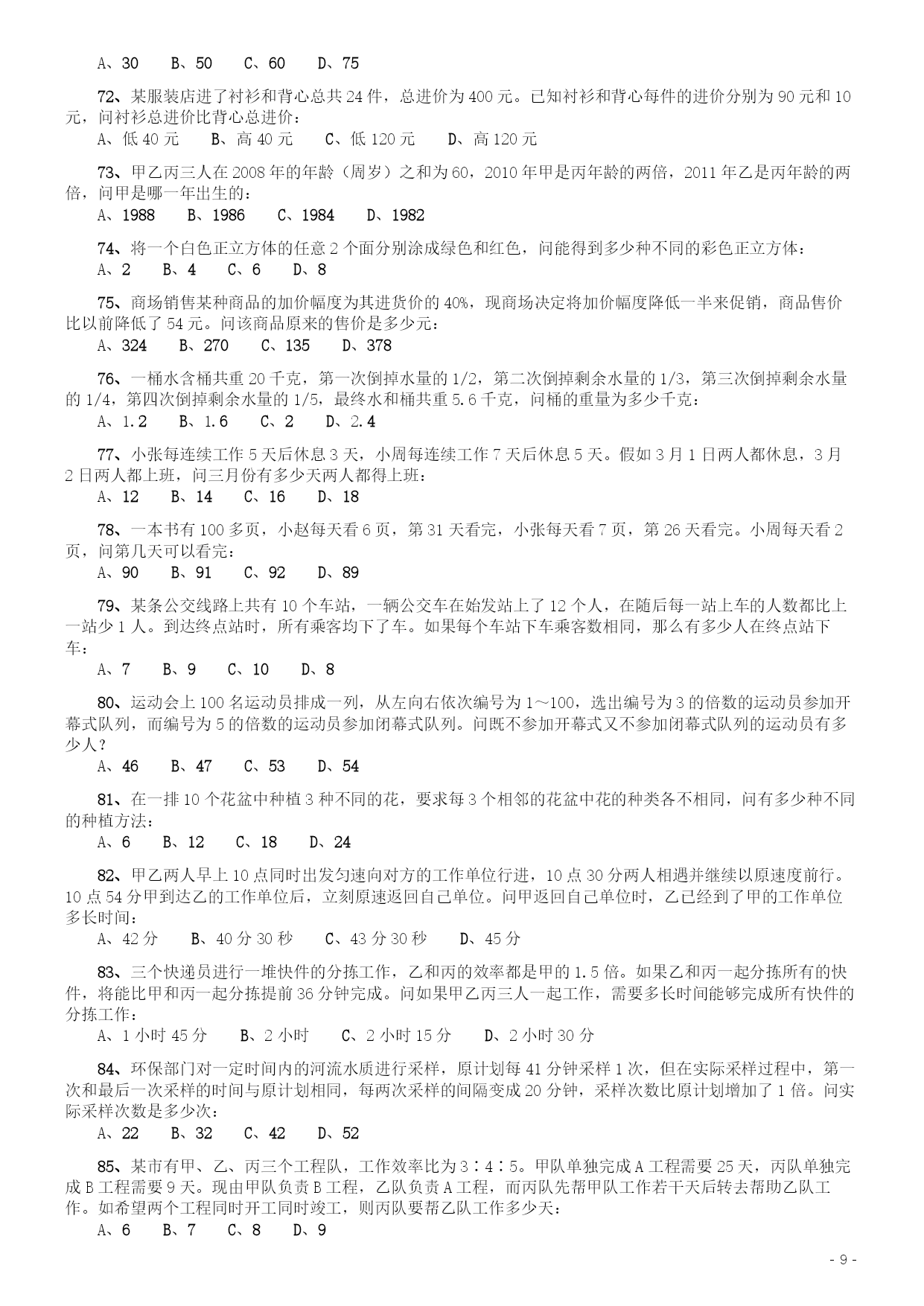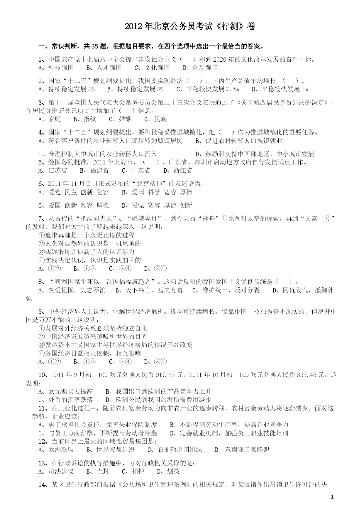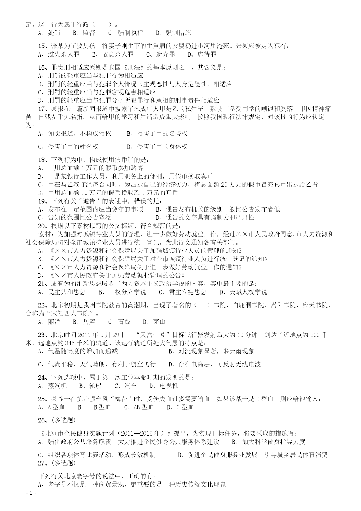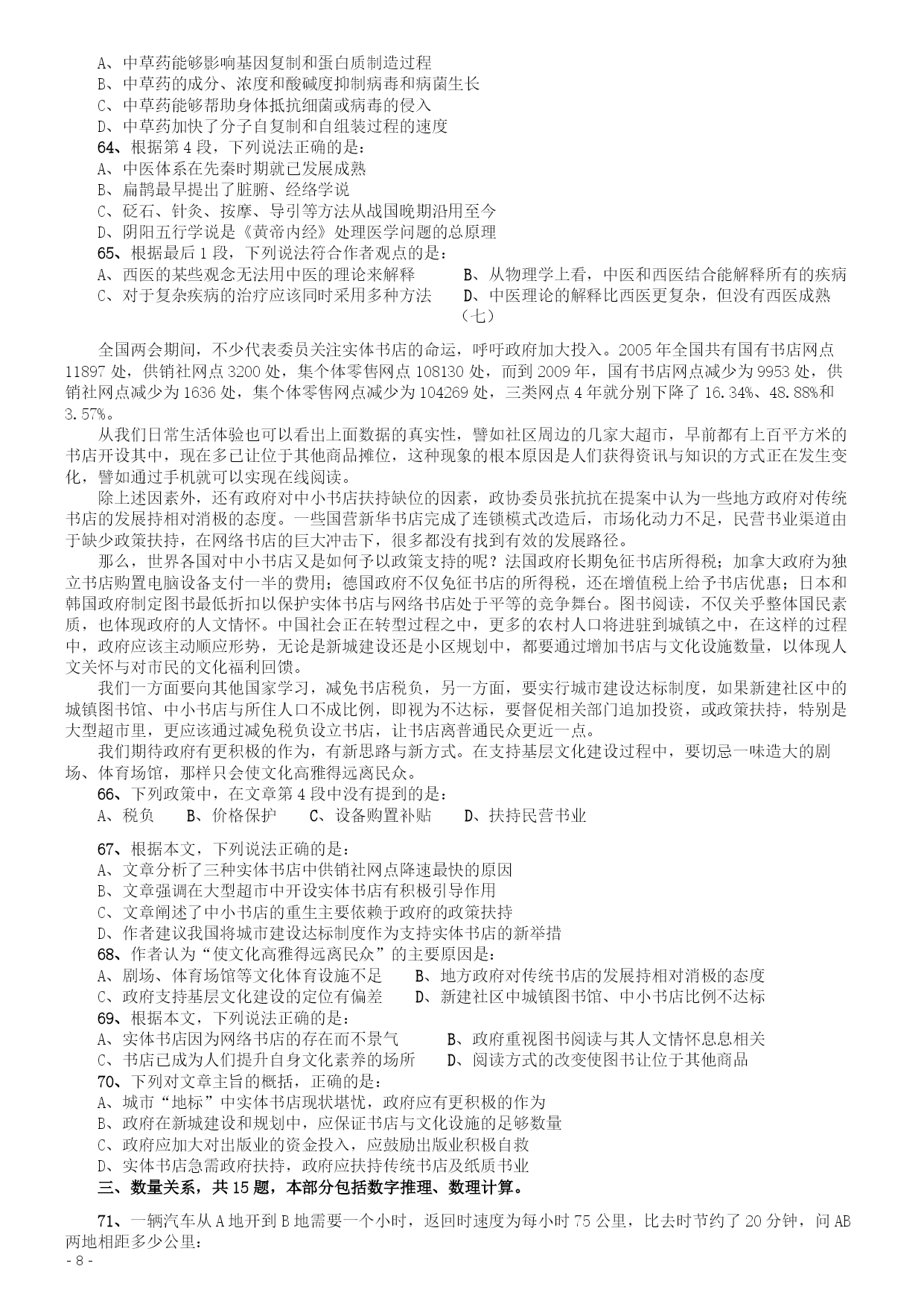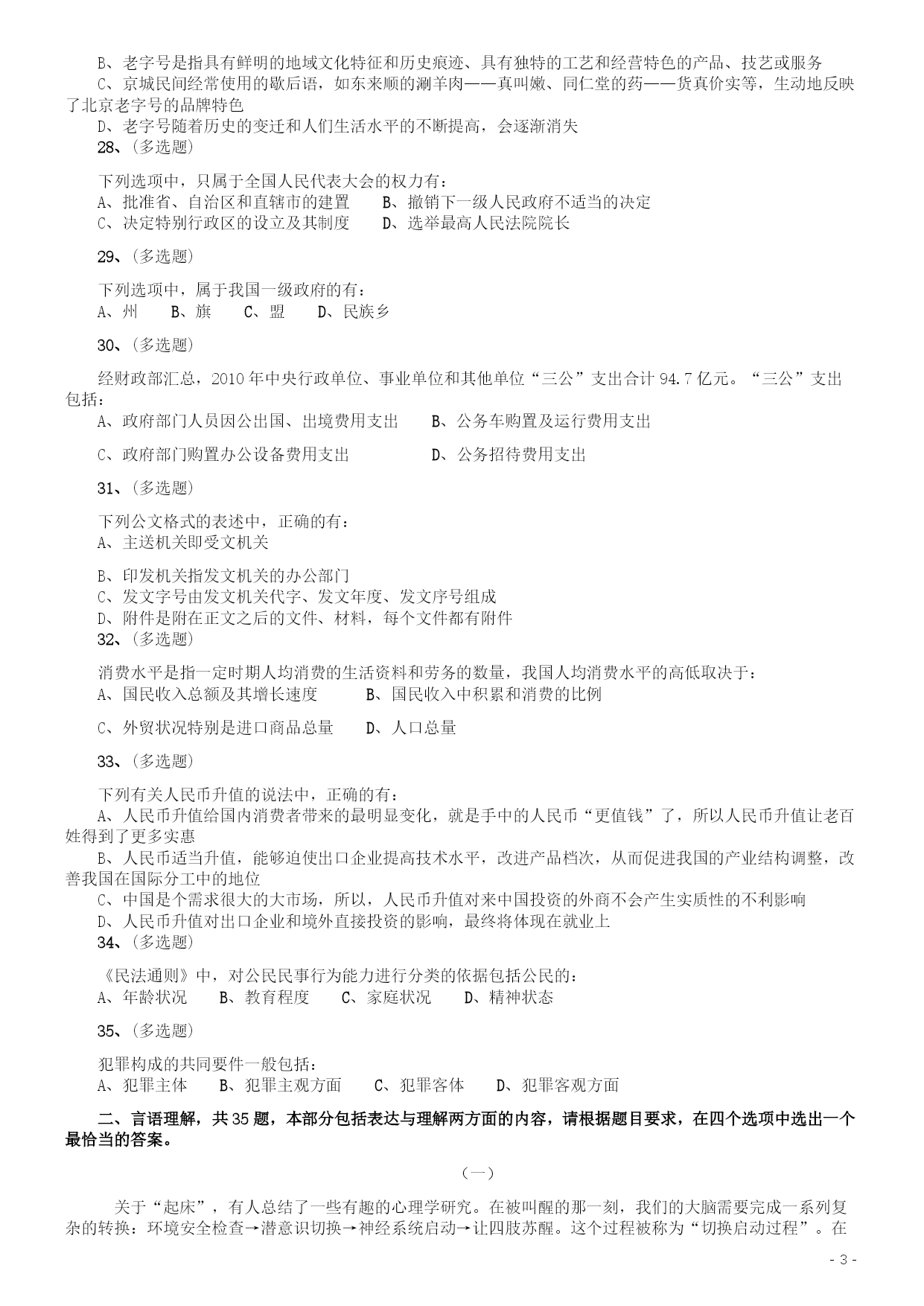 PAGE\*MERGEFORMAT-18-2012年北京公务员考试《行测》卷一、常识判断,共35题,根据题目要求,在四个选项中选出一个最恰当的答案。1、中国共产党十七届六中全会提出建设社会主义()和到2020年的文化改革发展的奋斗目标。A、科技强国B、人才强国C、文化强国D、创新强国2、国家“十二五”规划纲要提出,我国要实现经济(),国内生产总值年均增长()。A、持续稳定发展7%B、持续稳定发展8%C、平稳较快发展7.5%D、平稳较快发展7%3、第十一届全国人民代表大会常务委员会第二十三次会议表决通过了《关于修改居民身份证法的决定》,在居民身份证登记项目中增加了()信息。A、家庭B、指纹C、婚姻D、民族4、国家“十二五”规划纲要提出,要积极稳妥推进城镇化,把()作为推进城镇化的重要任务。A、符合落户条件的农业转移人口逐步转为城镇居民B、促进农村转移人口城镇就业C、合理控制大中城市的农业转移人口流入D、鼓励和支持中西部地区、中小城市发展5、经国务院批准,2011年上海市、()、广东省、深圳市启动地方政府自行发债试点工作。A、江苏省B、福建省C、山东省D、浙江省6、2011年11月2日正式发布的“北京精神”的表述语为:A、爱党民主创新包容B、爱国科学宽容厚德C、爱国创新包容厚德D、爱党宽容厚德创新7、从古代的“把酒问青天”、“嫦娥奔月”,到今天的“神舟”号系列对太空的探索,再到“天宫一号”的发射,我们对太空的了解越来越深入,这说明:①追求真理是一个永无止境的过程②人类对自然界的认识是一帆风顺的③实践锻炼并提高了人的认识能力④实践决定认识,认识是实践的目的A、①②B、①③C、②④D、③④8、“苟利国家生死以,岂因祸福避趋之”。这句话反映的我国爱国主义优良传统是()。A、热爱祖国,矢志不渝B、天下兴亡,匹夫有责C、维护统一,反对分裂D、同仇敌忾,抵御外强9、中外经济界人士认为,化解世界经济危机、推动可持续增长,仅靠中国一枝独秀是不现实的,但离开中国是万万不能的。这说明:①发展对外经济关系必须坚持独立自主②中国经济发展越来越吸引世界的目光③发达资本主义国家主导世界经济格局的情况已经改变④各国经济日益相互依赖、相互影响A、①②B、①③C、③④D、②④10、2011年9月初,100欧元兑换人民币917.33元,2011年10月初,100欧元兑换人民币853.45元。这表明:A、欧元购买力提高B、我国出口到欧洲的产品竞争力上升C、外币的汇率跌落D、欧洲公民到我国旅游所需费用减少11、在工业化过程中,随着农村富余劳动力向非农产业的逐步转移,农村富余劳动力将逐渐减少。面对这一趋势,企业应该:A、勇于承担社会责任,完善失业保险制度B、不断提高劳动生产率,提高企业竞争力C、与员工协商薪酬,不断提高劳动者待遇D、完善就业机制,加强员工职业技能培训12、当前世界上最大的区域性贸易集团是:A、欧洲联盟B、世界贸易组织C、石油输出国组织D、东南亚国家联盟13、在行政诉讼的执行措施中,可对行政机关采取的是:A、司法建议B、查封C、扣押D、划拨14、某区卫生行政部门根据《公共场所卫生管理条例》的相关规定,对某饭馆作出吊销卫生许可证的决定。这一行为属于行政()。A、处罚B、监督C、强制执行D、强制措施15、张某为了要男孩,将妻子刚生下的生重病的女婴扔进小河里淹死。张某应被定为犯有:A、过失杀人罪B、故意杀人罪C、遗弃罪D、虐待罪16、罪责刑相适应原则是我国《刑法》的基本原则之一,其含义是:A、刑罚的轻重应当与犯罪行为相适应B、刑罚的轻重应当与犯罪个人情况(主观恶性与人身危险性)相适应C、刑罚的轻重应当与犯罪客观危害相适应D、刑罚的轻重应当与犯罪分子所犯罪行和承担的刑事责任相适应17、某报在一篇新闻报道中披露了未成年人甲是乙的私生子,致使甲备受同学的嘲讽和奚落,甲因精神痛苦,自残左手无名指,从而给甲的学习和生活造成重大影响。按照我国现行法律规定,对该报的行为应认定为:A、如实报道,不构成侵权B、侵害了甲的名誉权C、侵害了甲的姓名权D、侵害了甲的身体权18、下列行为中,构成使用假币罪的是:A、甲用总面额1万元的假币参加赌博B、甲是某银行工作人员,利用职务上的便利,用假币换取真币C、甲在与乙签订经济合同时,为显示自己的经济实力,将总面额20万元的假币冒充真币出示给乙看D、甲用总面额10万元的假币换取乙1万元的真币19、下列有关“通告”的表述中,错误的是:A、发布在一定范围内应当遵守的事项B、通告发布机关的级别一般比公告发布者低C、告知的范围比公告宽泛D、通告的文字具有强制力和严肃性20、根据以下素材拟写的公文标题,符合规范的