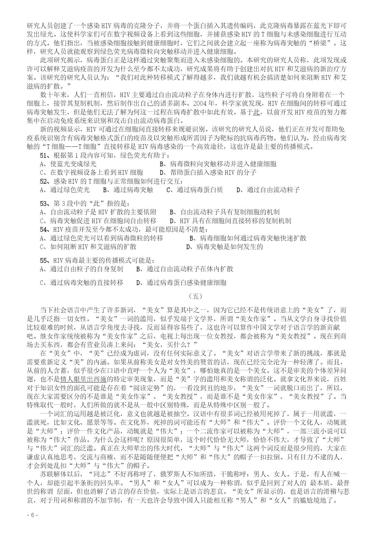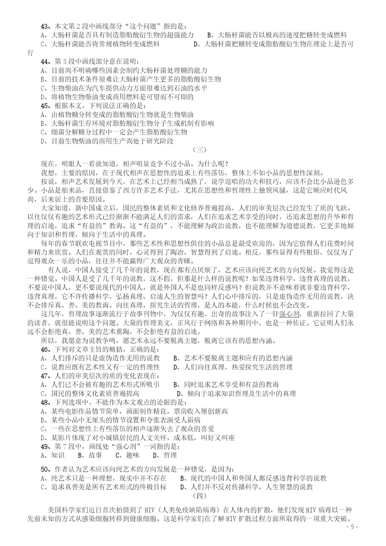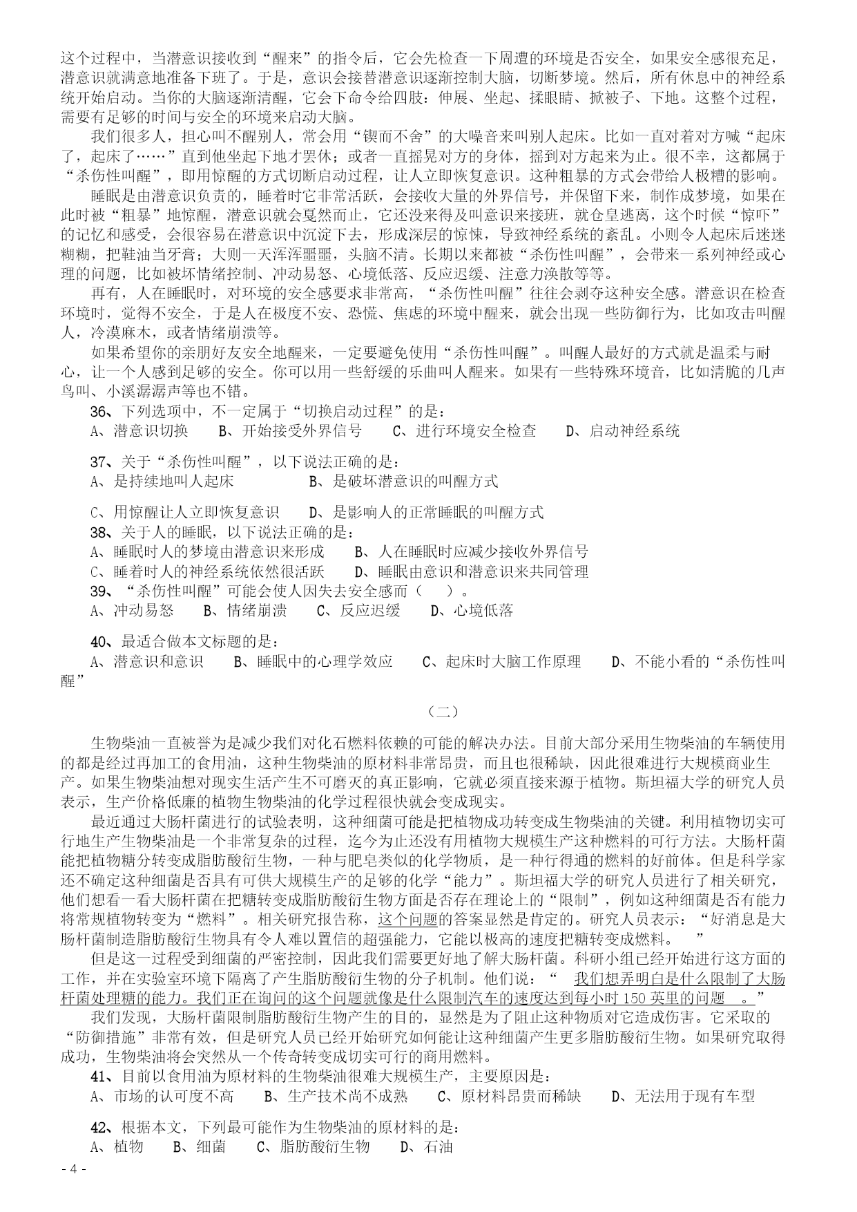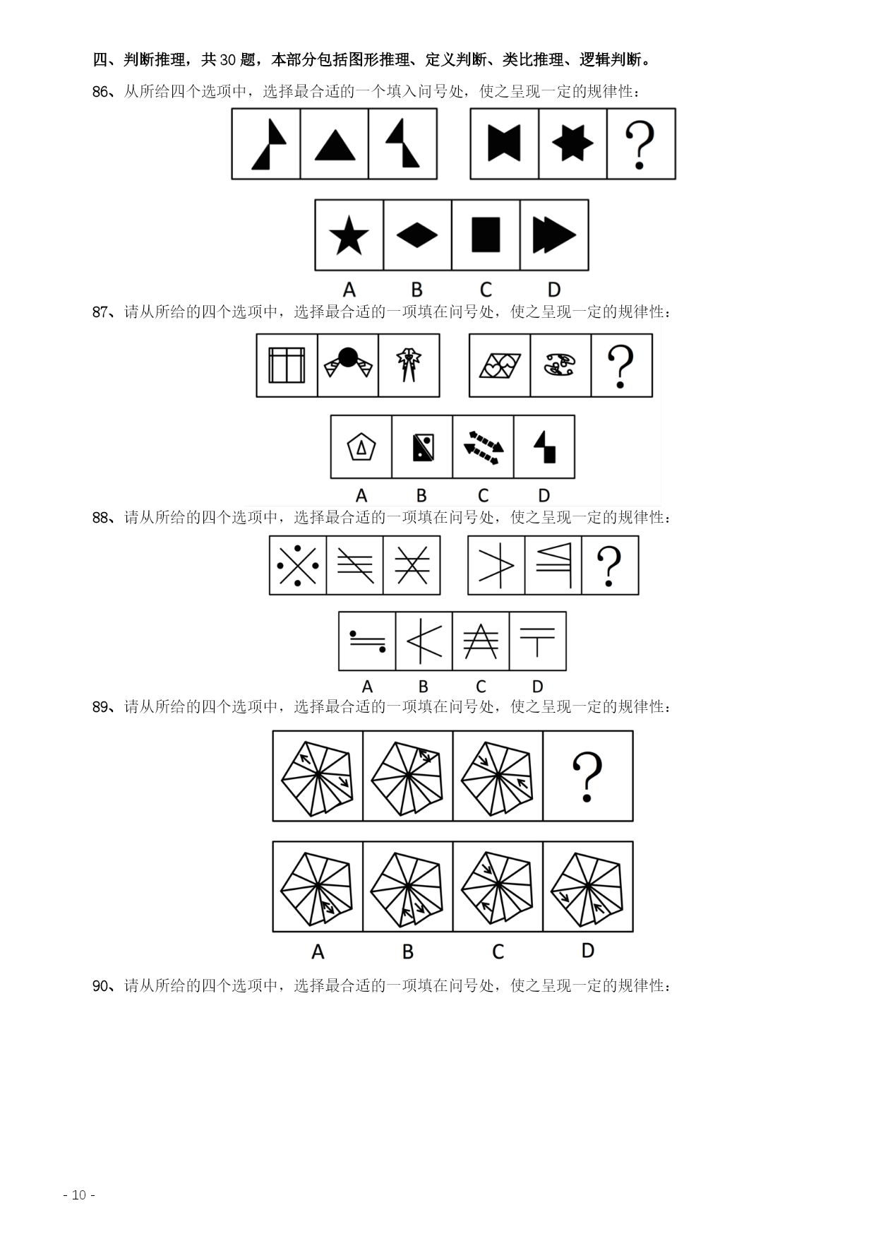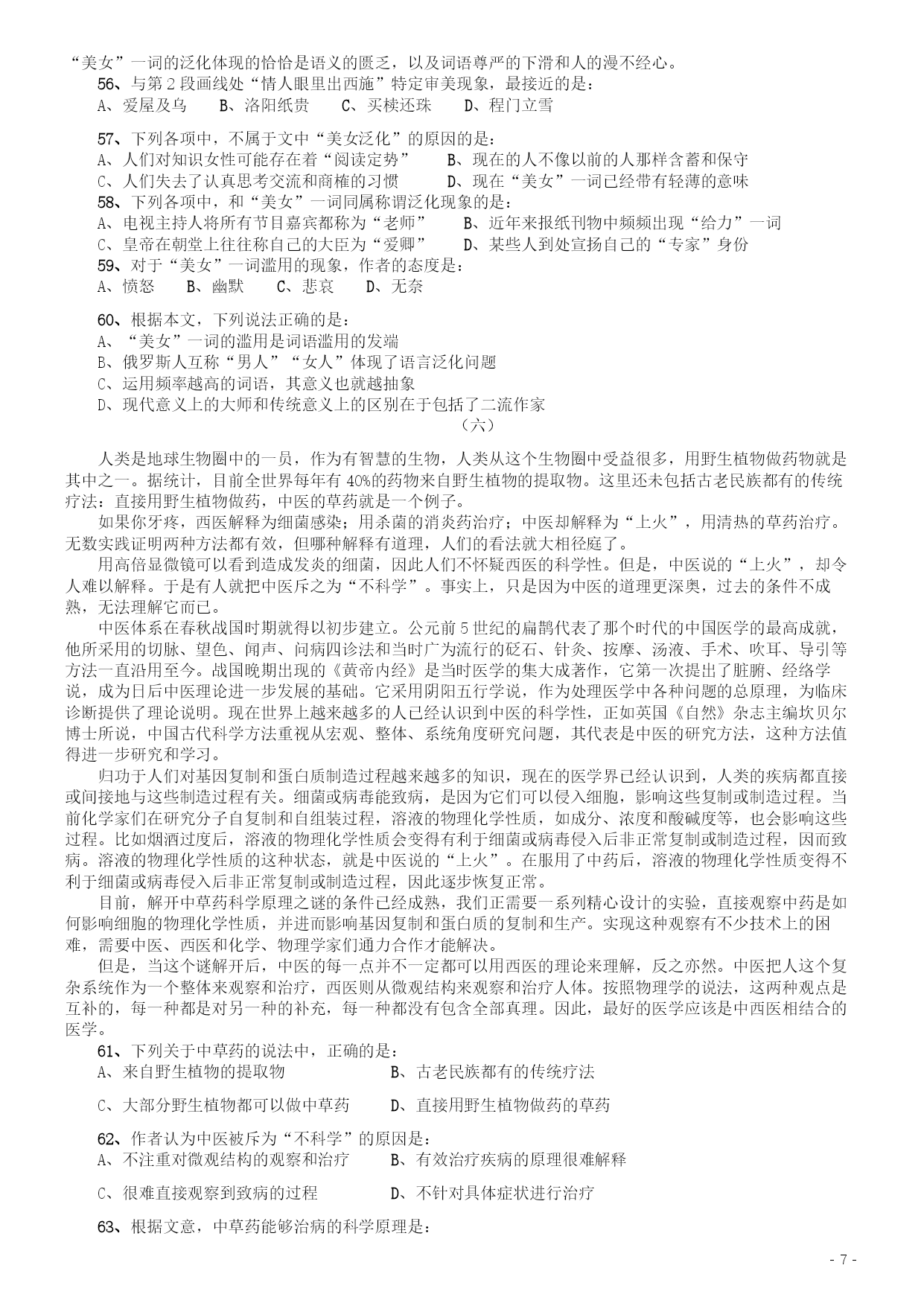 PAGE\*MERGEFORMAT-18-2012年北京公务员考试《行测》卷一、常识判断,共35题,根据题目要求,在四个选项中选出一个最恰当的答案。1、中国共产党十七届六中全会提出建设社会主义()和到2020年的文化改革发展的奋斗目标。A、科技强国B、人才强国C、文化强国D、创新强国2、国家“十二五”规划纲要提出,我国要实现经济(),国内生产总值年均增长()。A、持续稳定发展7%B、持续稳定发展8%C、平稳较快发展7.5%D、平稳较快发展7%3、第十一届全国人民代表大会常务委员会第二十三次会议表决通过了《关于修改居民身份证法的决定》,在居民身份证登记项目中增加了()信息。A、家庭B、指纹C、婚姻D、民族4、国家“十二五”规划纲要提出,要积极稳妥推进城镇化,把()作为推进城镇化的重要任务。A、符合落户条件的农业转移人口逐步转为城镇居民B、促进农村转移人口城镇就业C、合理控制大中城市的农业转移人口流入D、鼓励和支持中西部地区、中小城市发展5、经国务院批准,2011年上海市、()、广东省、深圳市启动地方政府自行发债试点工作。A、江苏省B、福建省C、山东省D、浙江省6、2011年11月2日正式发布的“北京精神”的表述语为:A、爱党民主创新包容B、爱国科学宽容厚德C、爱国创新包容厚德D、爱党宽容厚德创新7、从古代的“把酒问青天”、“嫦娥奔月”,到今天的“神舟”号系列对太空的探索,再到“天宫一号”的发射,我们对太空的了解越来越深入,这说明:①追求真理是一个永无止境的过程②人类对自然界的认识是一帆风顺的③实践锻炼并提高了人的认识能力④实践决定认识,认识是实践的目的A、①②B、①③C、②④D、③④8、“苟利国家生死以,岂因祸福避趋之”。这句话反映的我国爱国主义优良传统是()。A、热爱祖国,矢志不渝B、天下兴亡,匹夫有责C、维护统一,反对分裂D、同仇敌忾,抵御外强9、中外经济界人士认为,化解世界经济危机、推动可持续增长,仅靠中国一枝独秀是不现实的,但离开中国是万万不能的。这说明:①发展对外经济关系必须坚持独立自主②中国经济发展越来越吸引世界的目光③发达资本主义国家主导世界经济格局的情况已经改变④各国经济日益相互依赖、相互影响A、①②B、①③C、③④D、②④10、2011年9月初,100欧元兑换人民币917.33元,2011年10月初,100欧元兑换人民币853.45元。这表明:A、欧元购买力提高B、我国出口到欧洲的产品竞争力上升C、外币的汇率跌落D、欧洲公民到我国旅游所需费用减少11、在工业化过程中,随着农村富余劳动力向非农产业的逐步转移,农村富余劳动力将逐渐减少。面对这一趋势,企业应该:A、勇于承担社会责任,完善失业保险制度B、不断提高劳动生产率,提高企业竞争力C、与员工协商薪酬,不断提高劳动者待遇D、完善就业机制,加强员工职业技能培训12、当前世界上最大的区域性贸易集团是:A、欧洲联盟B、世界贸易组织C、石油输出国组织D、东南亚国家联盟13、在行政诉讼的执行措施中,可对行政机关采取的是:A、司法建议B、查封C、扣押D、划拨14、某区卫生行政部门根据《公共场所卫生管理条例》的相关规定,对某饭馆作出吊销卫生许可证的决定。这一行为属于行政()。A、处罚B、监督C、强制执行D、强制措施15、张某为了要男孩,将妻子刚生下的生重病的女婴扔进小河里淹死。张某应被定为犯有:A、过失杀人罪B、故意杀人罪C、遗弃罪D、虐待罪16、罪责刑相适应原则是我国《刑法》的基本原则之一,其含义是:A、刑罚的轻重应当与犯罪行为相适应B、刑罚的轻重应当与犯罪个人情况(主观恶性与人身危险性)相适应C、刑罚的轻重应当与犯罪客观危害相适应D、刑罚的轻重应当与犯罪分子所犯罪行和承担的刑事责任相适应17、某报在一篇新闻报道中披露了未成年人甲是乙的私生子,致使甲备受同学的嘲讽和奚落,甲因精神痛苦,自残左手无名指,从而给甲的学习和生活造成重大影响。按照我国现行法律规定,对该报的行为应认定为:A、如实报道,不构成侵权B、侵害了甲的名誉权C、侵害了甲的姓名权D、侵害了甲的身体权18、下列行为中,构成使用假币罪的是:A、甲用总面额1万元的假币参加赌博B、甲是某银行工作人员,利用职务上的便利,用假币换取真币C、甲在与乙签订经济合同时,为显示自己的经济实力,将总面额20万元的假币冒充真币出示给乙看D、甲用总面额10万元的假币换取乙1万元的真币19、下列有关“通告”的表述中,错误的是:A、发布在一定范围内应当遵守的事项B、通告发布机关的级别一般比公告发布者低C、告知的范围比公告宽泛D、通告的文字具有强制力和严肃性20、根据以下素材拟写的公文标题,符合规范的