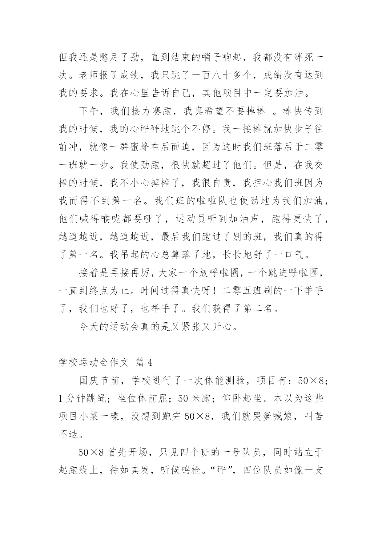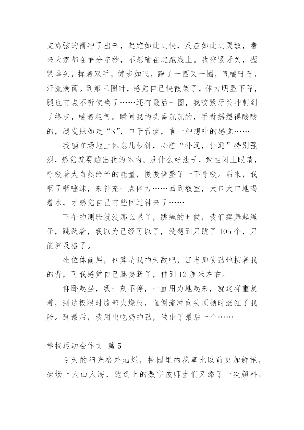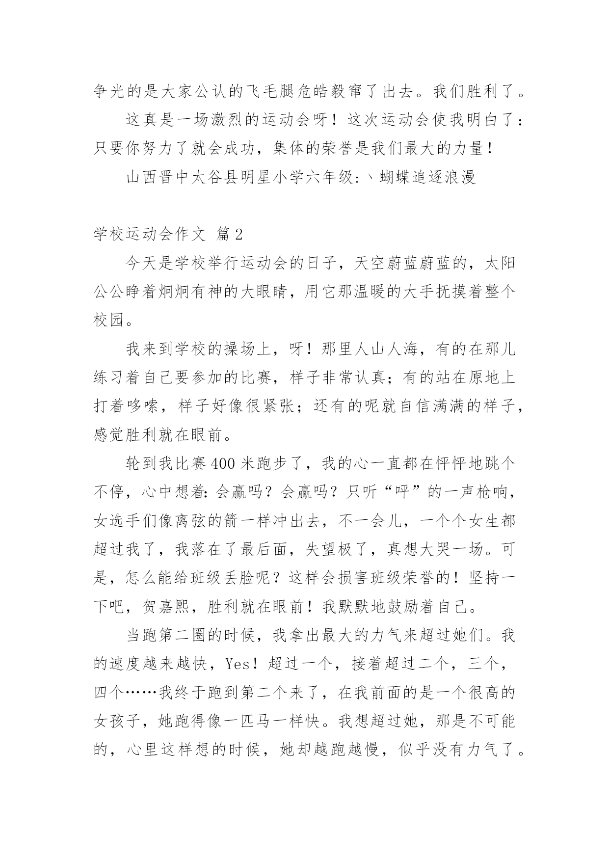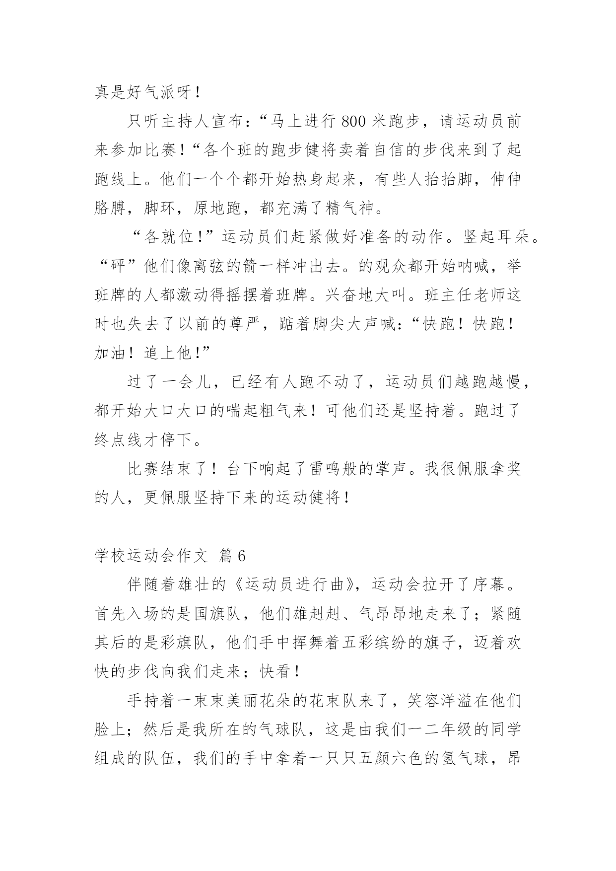 学校运动会作文【实用】学校运动会作文合集10篇在日常学习、工作和生活中,大家都经常看到作文的身影吧,作文根据体裁的不同可以分为记叙文、说明文、应用文、议论文。怎么写作文才能避免踩雷呢?下面是小编收集整理的学校运动会作文10篇,欢迎阅读,希望大家能够喜欢。学校运动会作文篇1去年的一个星期四的下午,我盼望已久的运动会来临了。入场式开始了,音乐也响起来了,我们排着整整齐齐的队伍从教学楼走了出来,雄纠纠,气昂昂。比赛项目有:跳远、踢毽子、跳网绳、投准、跳高其中最精彩的就是接力赛了。在起跑线上,只听啪的一声,小运动员像一支离弦的箭,飞快地冲出去。加油,加油!在操场周围五(1)班的同学们,有的举着牌子,有的挥舞着拳头,有的跃跃欲试,恨不得从啦啦队中跳出去参加奔跑的行列。接力棒一个一个往下传,归我接力了,我的心怦怦地跳,像只小白兔在怀里乱跳,又如一个大鼓不停地敲着。这时我想:我要跑得更快,比别的班还快。于是我稳稳地接住接力棒,加速度向终点飞奔而去,风在耳边呼呼地响,周逸帆加油!周逸帆加油!叫声越来越大,在我这一棒,把其它班甩开一大截,现在为我们班争光的是大家公认的飞毛腿危皓毅窜了出去。我们胜利了。这真是一场激烈的运动会呀!这次运动会使我明白了:只要你努力了就会成功,集体的荣誉是我们最大的力量!山西晋中太谷县明星小学六年级:丶蝴蝶追逐浪漫学校运动会作文篇2今天是学校举行运动会的日子,天空蔚蓝蔚蓝的,太阳公公睁着炯炯有神的大眼睛,用它那温暖的大手抚摸着整个校园。我来到学校的操场上,呀!那里人山人海,有的在那儿练习着自己要参加的比赛,样子非常认真;有的站在原地上打着哆嗦,样子好像很紧张;还有的呢就自信满满的样子,感觉胜利就在眼前。轮到我比赛400米跑步了,我的心一直都在怦怦地跳个不停,心中想着:会赢吗?会赢吗?只听“呯”的一声枪响,女选手们像离弦的箭一样冲出去,不一会儿,一个个女生都超过我了,我落在了最后面,失望极了,真想大哭一场。可是,怎么能给班级丢脸呢?这样会损害班级荣誉的!坚持一下吧,贺嘉熙,胜利就在眼前!我默默地鼓励着自己。当跑第二圈的时候,我拿出最大的力气来超过她们。我的速度越来越快,Yes!超过一个,接着超过二个,三个,四个……我终于跑到第二个来了,在我前面的是一个很高的女孩子,她跑得像一匹马一样快。我想超过她,那是不可能的,心里这样想的时候,她却越跑越慢,似乎没有力气了。嗯!好机会来了,我的体力还有一点点,耳边传来了同学们的声音:“加油!贺嘉熙,加油……”同学们的加油呐喊声激励了我,让我再次充满了力量和信心。我闭上眼睛,快速地奔跑着,当我的.腰碰到什么东西的时候,我睁开眼睛一看,“Yes!”我得了第一名,那个高个子女孩居然在我后面,太不可思议!同学们高兴得手舞足蹈,顷刻间,欢呼声,呐喊声汇成了美妙的乐章,我笑了,笑得那么灿烂,那么可爱。运动会在同学们的加油呐喊声中结束了。这次比赛让我感觉到了坚持是如此的珍贵!学校运动会作文篇3学校开运动会,我早早地就起了床,做好比赛需要的一切准备。来到班级里,同学们个个都很兴奋,运动员们说着要怎样好好发挥,争取为班级争光;其他同学在为运动员打气。运动会快要开始了,朱老师给我们每个运动员带上203班的号码牌。带上号码牌,我好一阵激动,因为我是我们班的运动员之一,我暗暗下定决心,一点要为班级出力,争取好成绩,我可不想拖班级的后腿。来先来热一下身,动动手呀,动动脚呀。马上轮到我们了,赶紧排好队进操场。在炎炎的太阳下站着,可真热呀!跳绳比赛开始了,哨子一响,同学们就“嗖嗖嗖”跳起来了,耳朵里只听到绳子发出的“呼呼呼“的声音。我用最快的速度跳着,今天我要争取一口气跳两百个。虽然很累,但我还是憋足了劲,直到结束的哨子响起,我都没有绊死一次。老师报了成绩,我只跳了一百八十多个,成绩没有达到我的要求。我在心里告诉自己,其他项目中一定要加油。下午,我们接力赛跑,我真希望不要掉棒。棒快传到我的时候,我的心砰砰地跳个不停。我一接棒就加快步子往前冲,就像一群蜜蜂在后面追,因为这时我们班落后于二零一班就一步。我使劲跑,很快就超过了他们。但是,在我交棒的时候,我不小心掉棒了,我很自责,我担心我们班因为我而得不到第一名。我们班的啦啦队也使劲地为我们加油,他们喊得喉咙都要哑了,运动员听到加油声,跑得更快了,越追越近,越追越近,最后我们跑过了别的班,我们真的得了第一名。我吊起的心总算落了地,长长地舒了一口气。接着是再接再厉,大家一个放呼啦圈,一个跳进呼啦圈,一直到终点为止。时间过得真快呀!二零五班刷的一下举手了,我们也好了,也举手了。我们获得了第二名。今天的运动会真的是又紧张又开心。学校运动会作文篇4国庆节前,学校进行了一次体能测验,项目有:50×8;1分钟跳绳;坐位体前屈;50米跑;仰卧起坐。本以为这些项目小菜一碟,没想到跑完