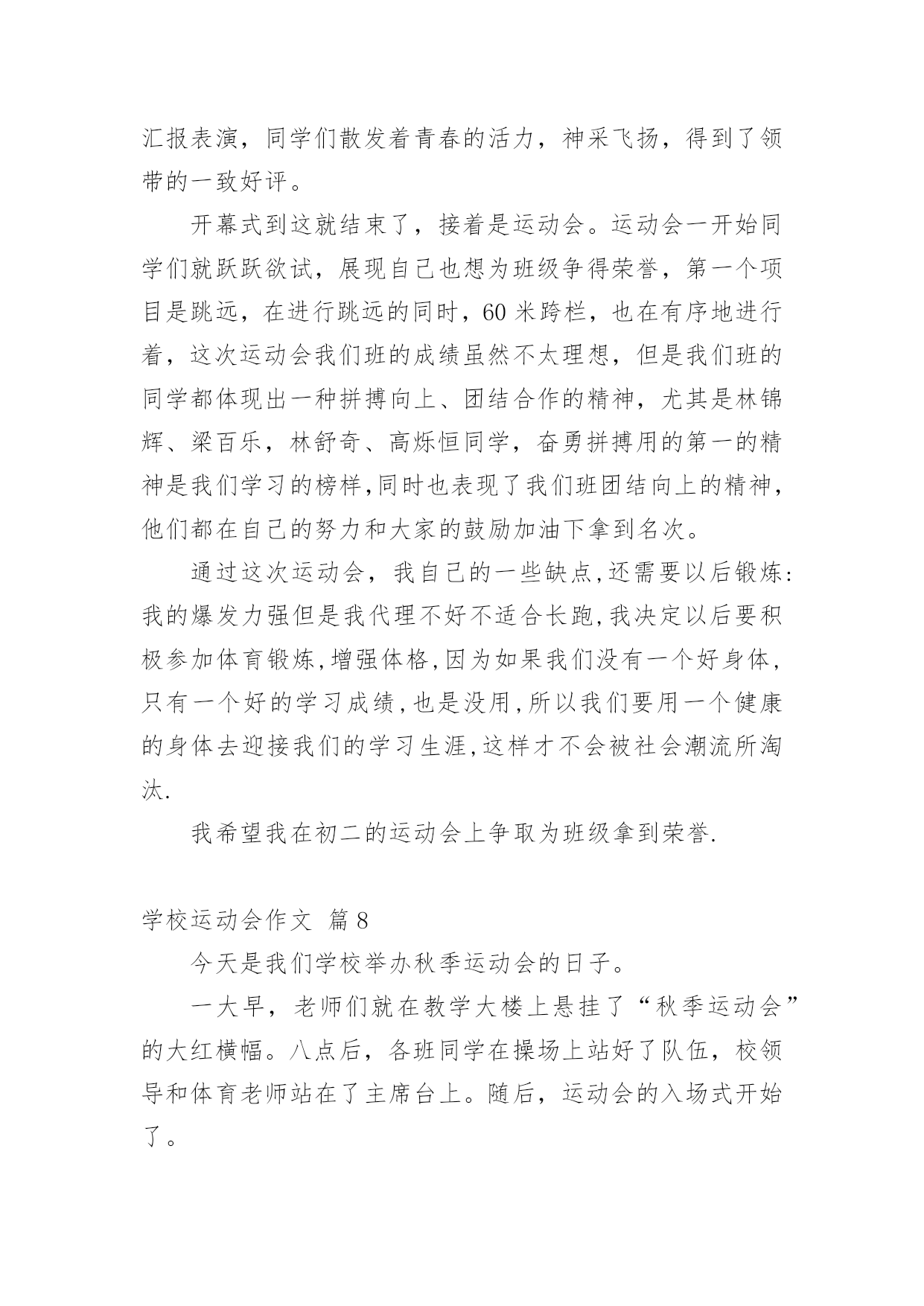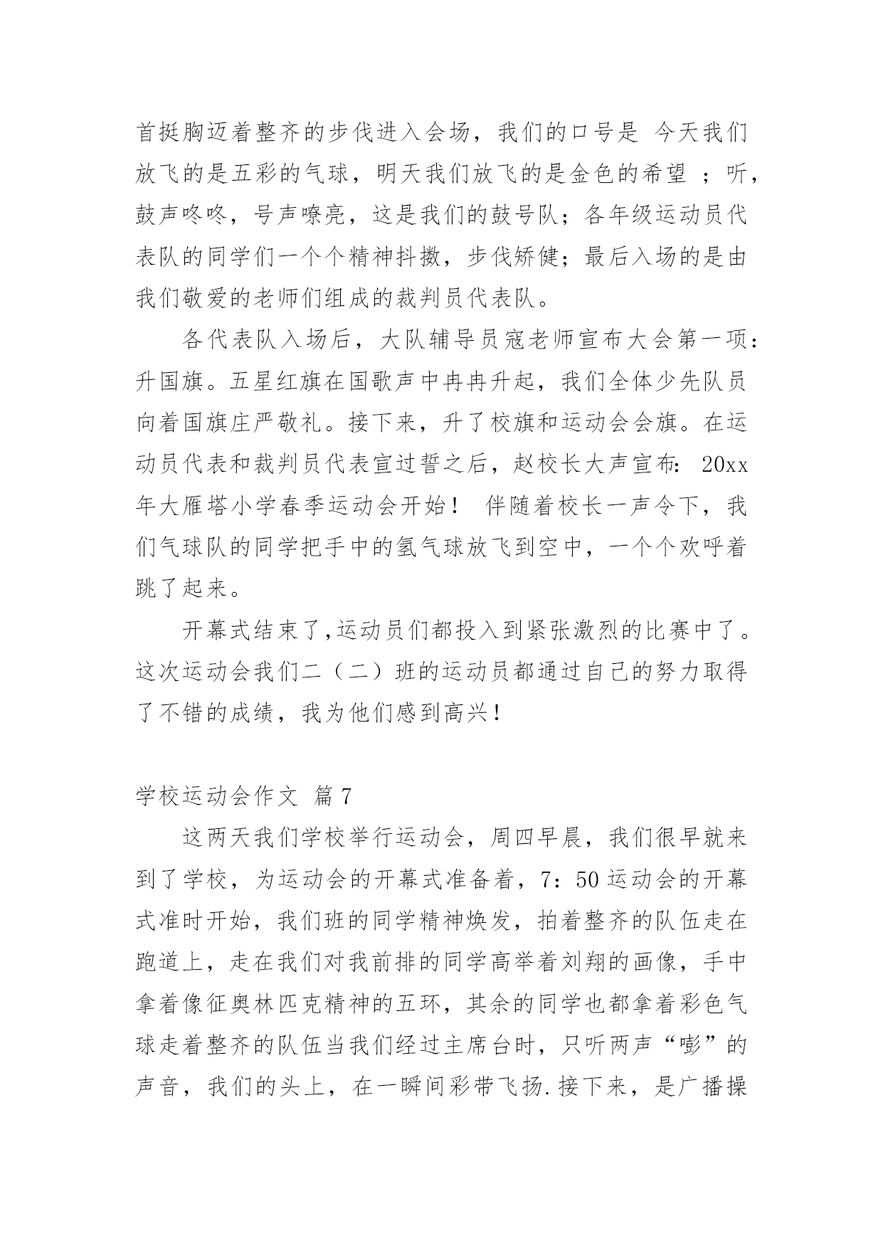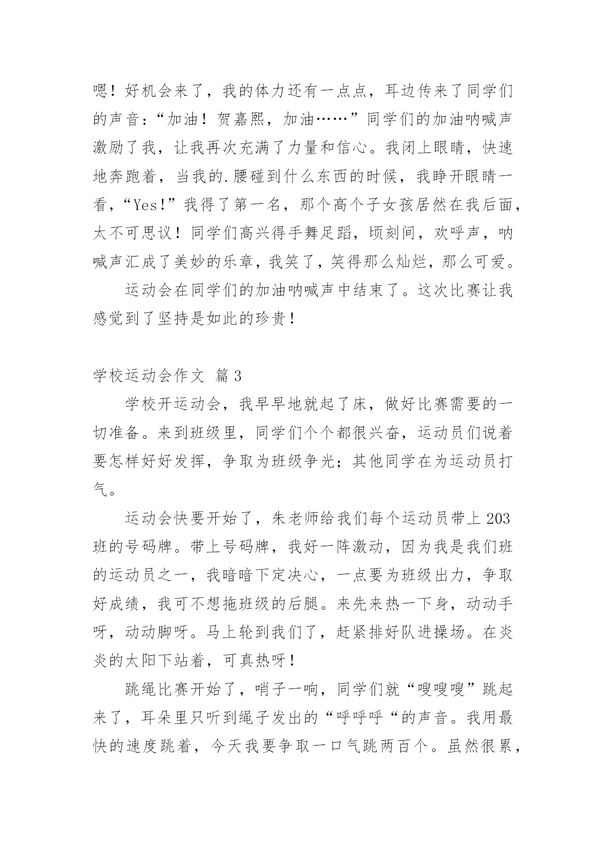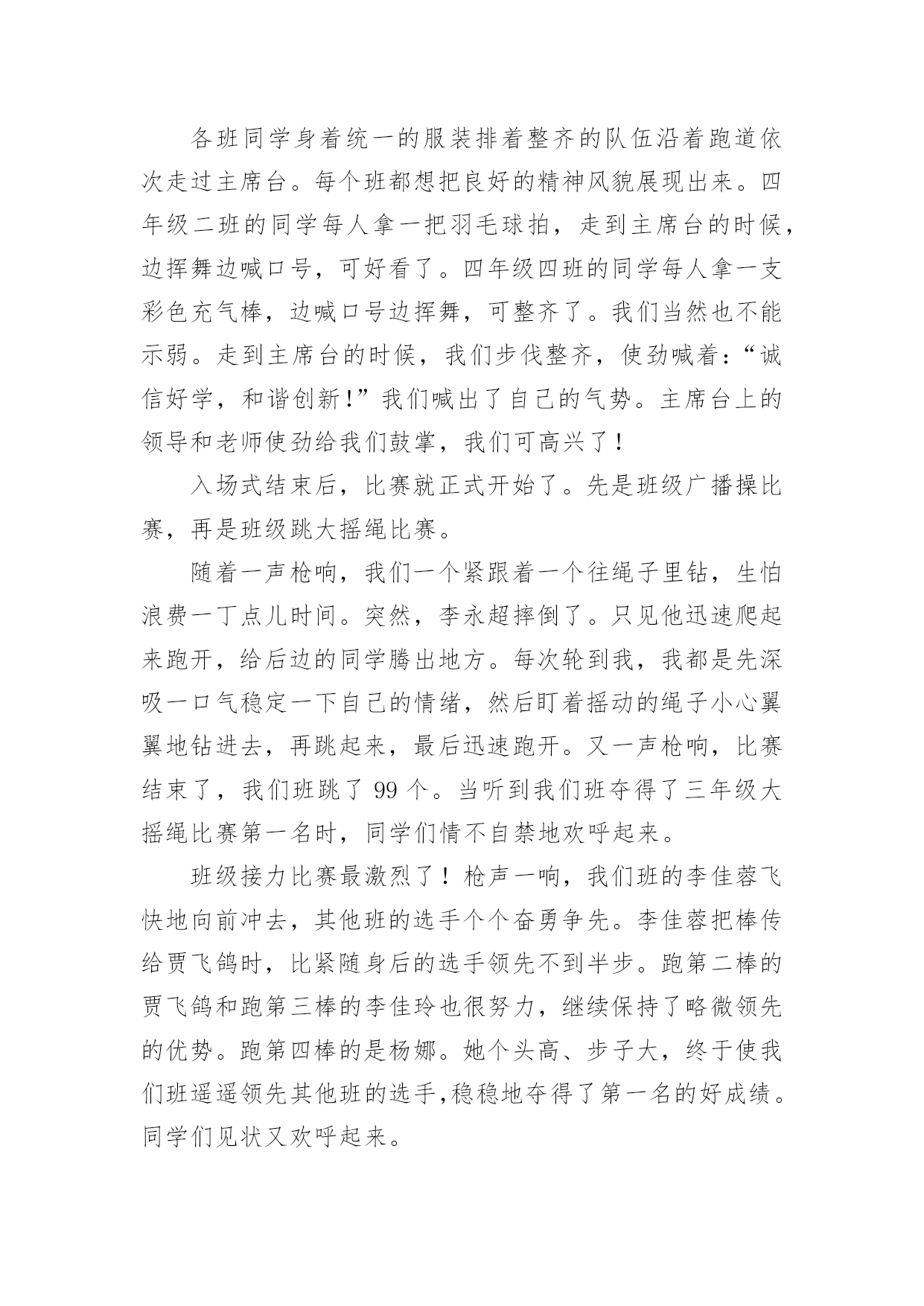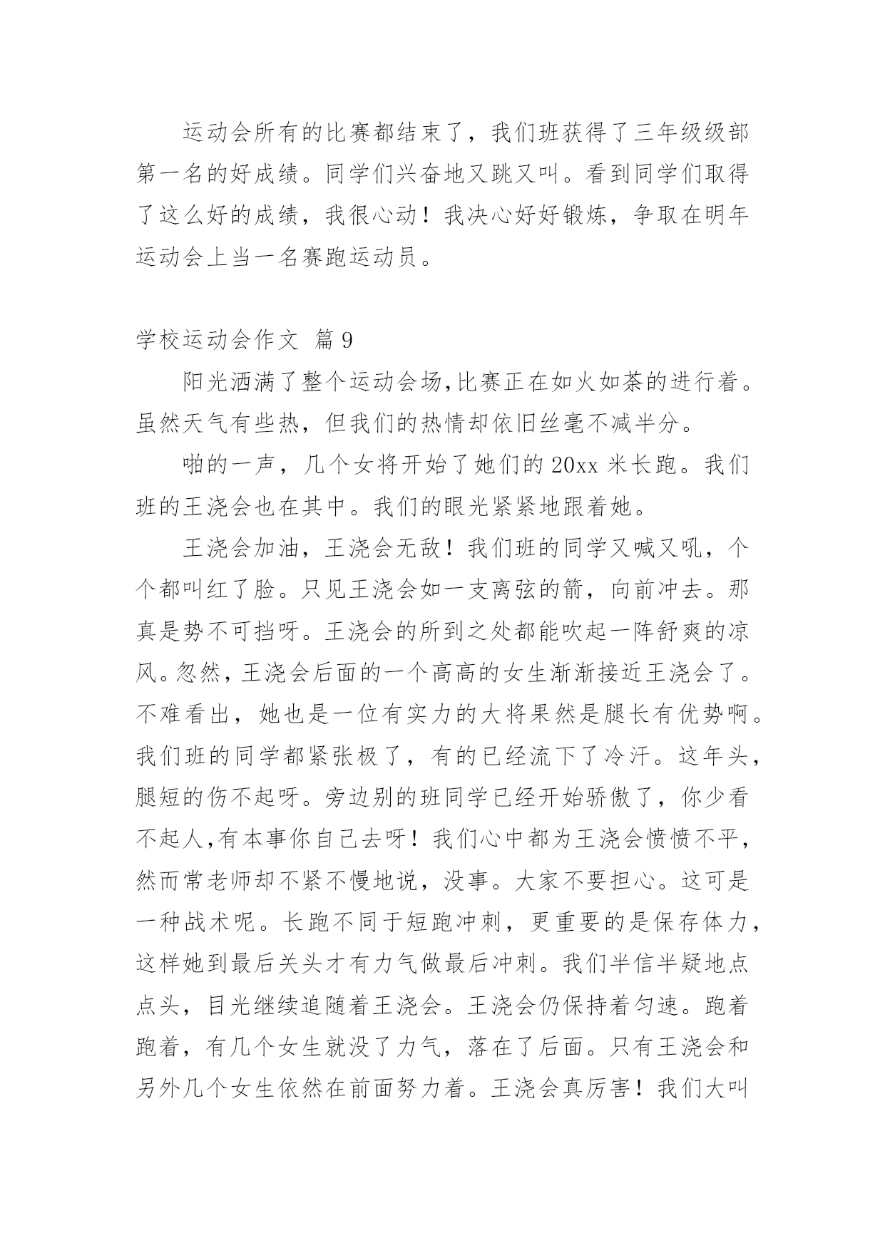 学校运动会作文【实用】学校运动会作文合集10篇在日常学习、工作和生活中,大家都经常看到作文的身影吧,作文根据体裁的不同可以分为记叙文、说明文、应用文、议论文。怎么写作文才能避免踩雷呢?下面是小编收集整理的学校运动会作文10篇,欢迎阅读,希望大家能够喜欢。学校运动会作文篇1去年的一个星期四的下午,我盼望已久的运动会来临了。入场式开始了,音乐也响起来了,我们排着整整齐齐的队伍从教学楼走了出来,雄纠纠,气昂昂。比赛项目有:跳远、踢毽子、跳网绳、投准、跳高其中最精彩的就是接力赛了。在起跑线上,只听啪的一声,小运动员像一支离弦的箭,飞快地冲出去。加油,加油!在操场周围五(1)班的同学们,有的举着牌子,有的挥舞着拳头,有的跃跃欲试,恨不得从啦啦队中跳出去参加奔跑的行列。接力棒一个一个往下传,归我接力了,我的心怦怦地跳,像只小白兔在怀里乱跳,又如一个大鼓不停地敲着。这时我想:我要跑得更快,比别的班还快。于是我稳稳地接住接力棒,加速度向终点飞奔而去,风在耳边呼呼地响,周逸帆加油!周逸帆加油!叫声越来越大,在我这一棒,把其它班甩开一大截,现在为我们班争光的是大家公认的飞毛腿危皓毅窜了出去。我们胜利了。这真是一场激烈的运动会呀!这次运动会使我明白了:只要你努力了就会成功,集体的荣誉是我们最大的力量!山西晋中太谷县明星小学六年级:丶蝴蝶追逐浪漫学校运动会作文篇2今天是学校举行运动会的日子,天空蔚蓝蔚蓝的,太阳公公睁着炯炯有神的大眼睛,用它那温暖的大手抚摸着整个校园。我来到学校的操场上,呀!那里人山人海,有的在那儿练习着自己要参加的比赛,样子非常认真;有的站在原地上打着哆嗦,样子好像很紧张;还有的呢就自信满满的样子,感觉胜利就在眼前。轮到我比赛400米跑步了,我的心一直都在怦怦地跳个不停,心中想着:会赢吗?会赢吗?只听“呯”的一声枪响,女选手们像离弦的箭一样冲出去,不一会儿,一个个女生都超过我了,我落在了最后面,失望极了,真想大哭一场。可是,怎么能给班级丢脸呢?这样会损害班级荣誉的!坚持一下吧,贺嘉熙,胜利就在眼前!我默默地鼓励着自己。当跑第二圈的时候,我拿出最大的力气来超过她们。我的速度越来越快,Yes!超过一个,接着超过二个,三个,四个……我终于跑到第二个来了,在我前面的是一个很高的女孩子,她跑得像一匹马一样快。我想超过她,那是不可能的,心里这样想的时候,她却越跑越慢,似乎没有力气了。嗯!好机会来了,我的体力还有一点点,耳边传来了同学们的声音:“加油!贺嘉熙,加油……”同学们的加油呐喊声激励了我,让我再次充满了力量和信心。我闭上眼睛,快速地奔跑着,当我的.腰碰到什么东西的时候,我睁开眼睛一看,“Yes!”我得了第一名,那个高个子女孩居然在我后面,太不可思议!同学们高兴得手舞足蹈,顷刻间,欢呼声,呐喊声汇成了美妙的乐章,我笑了,笑得那么灿烂,那么可爱。运动会在同学们的加油呐喊声中结束了。这次比赛让我感觉到了坚持是如此的珍贵!学校运动会作文篇3学校开运动会,我早早地就起了床,做好比赛需要的一切准备。来到班级里,同学们个个都很兴奋,运动员们说着要怎样好好发挥,争取为班级争光;其他同学在为运动员打气。运动会快要开始了,朱老师给我们每个运动员带上203班的号码牌。带上号码牌,我好一阵激动,因为我是我们班的运动员之一,我暗暗下定决心,一点要为班级出力,争取好成绩,我可不想拖班级的后腿。来先来热一下身,动动手呀,动动脚呀。马上轮到我们了,赶紧排好队进操场。在炎炎的太阳下站着,可真热呀!跳绳比赛开始了,哨子一响,同学们就“嗖嗖嗖”跳起来了,耳朵里只听到绳子发出的“呼呼呼“的声音。我用最快的速度跳着,今天我要争取一口气跳两百个。虽然很累,但我还是憋足了劲,直到结束的哨子响起,我都没有绊死一次。老师报了成绩,我只跳了一百八十多个,成绩没有达到我的要求。我在心里告诉自己,其他项目中一定要加油。下午,我们接力赛跑,我真希望不要掉棒。棒快传到我的时候,我的心砰砰地跳个不停。我一接棒就加快步子往前冲,就像一群蜜蜂在后面追,因为这时我们班落后于二零一班就一步。我使劲跑,很快就超过了他们。但是,在我交棒的时候,我不小心掉棒了,我很自责,我担心我们班因为我而得不到第一名。我们班的啦啦队也使劲地为我们加油,他们喊得喉咙都要哑了,运动员听到加油声,跑得更快了,越追越近,越追越近,最后我们跑过了别的班,我们真的得了第一名。我吊起的心总算落了地,长长地舒了一口气。接着是再接再厉,大家一个放呼啦圈,一个跳进呼啦圈,一直到终点为止。时间过得真快呀!二零五班刷的一下举手了,我们也好了,也举手了。我们获得了第二名。今天的运动会真的是又紧张又开心。学校运动会作文篇4国庆节前,学校进行了一次体能测验,项目有:50×8;1分钟跳绳;坐位体前屈;50米跑;仰卧起坐。本以为这些项目小菜一碟,没想到跑完