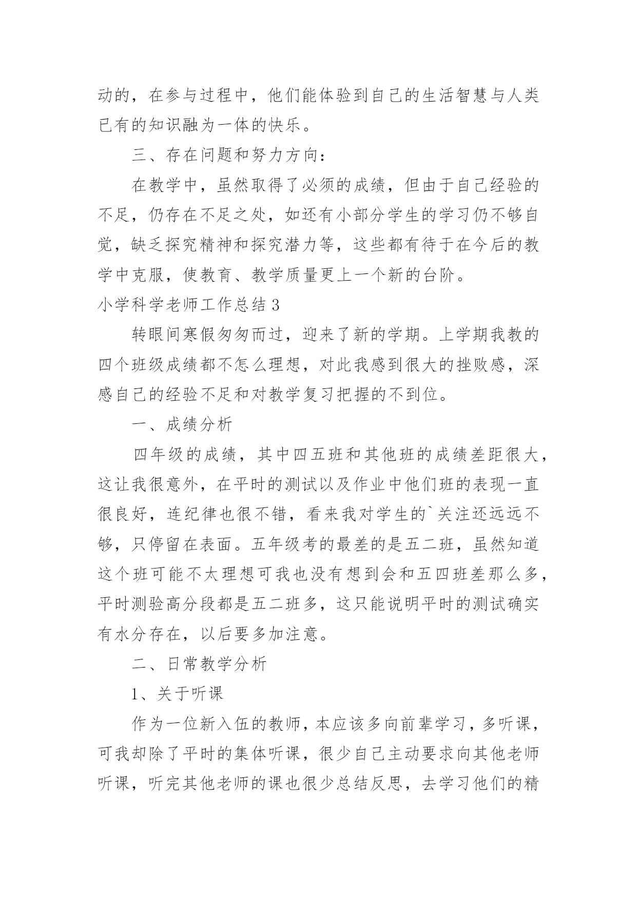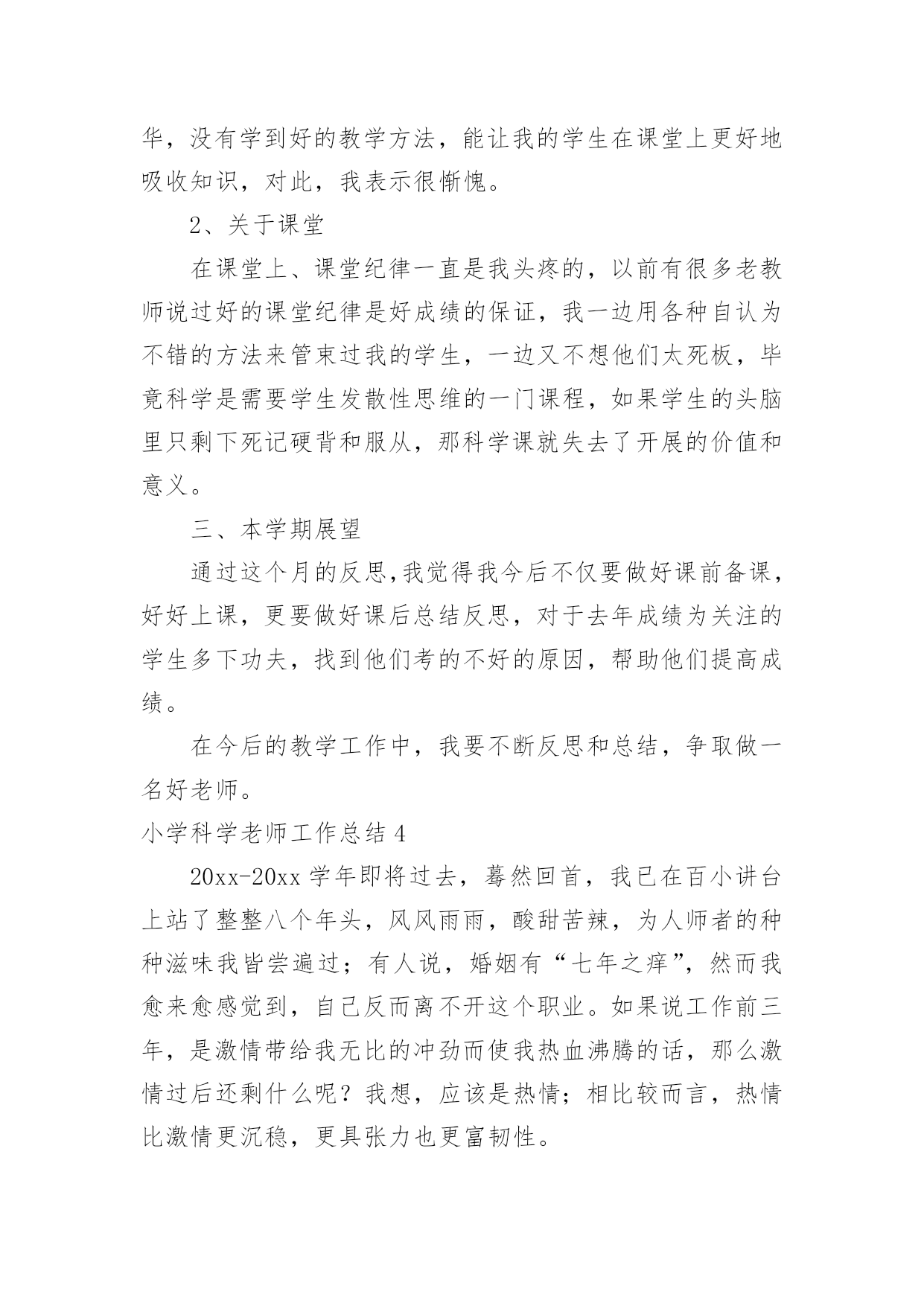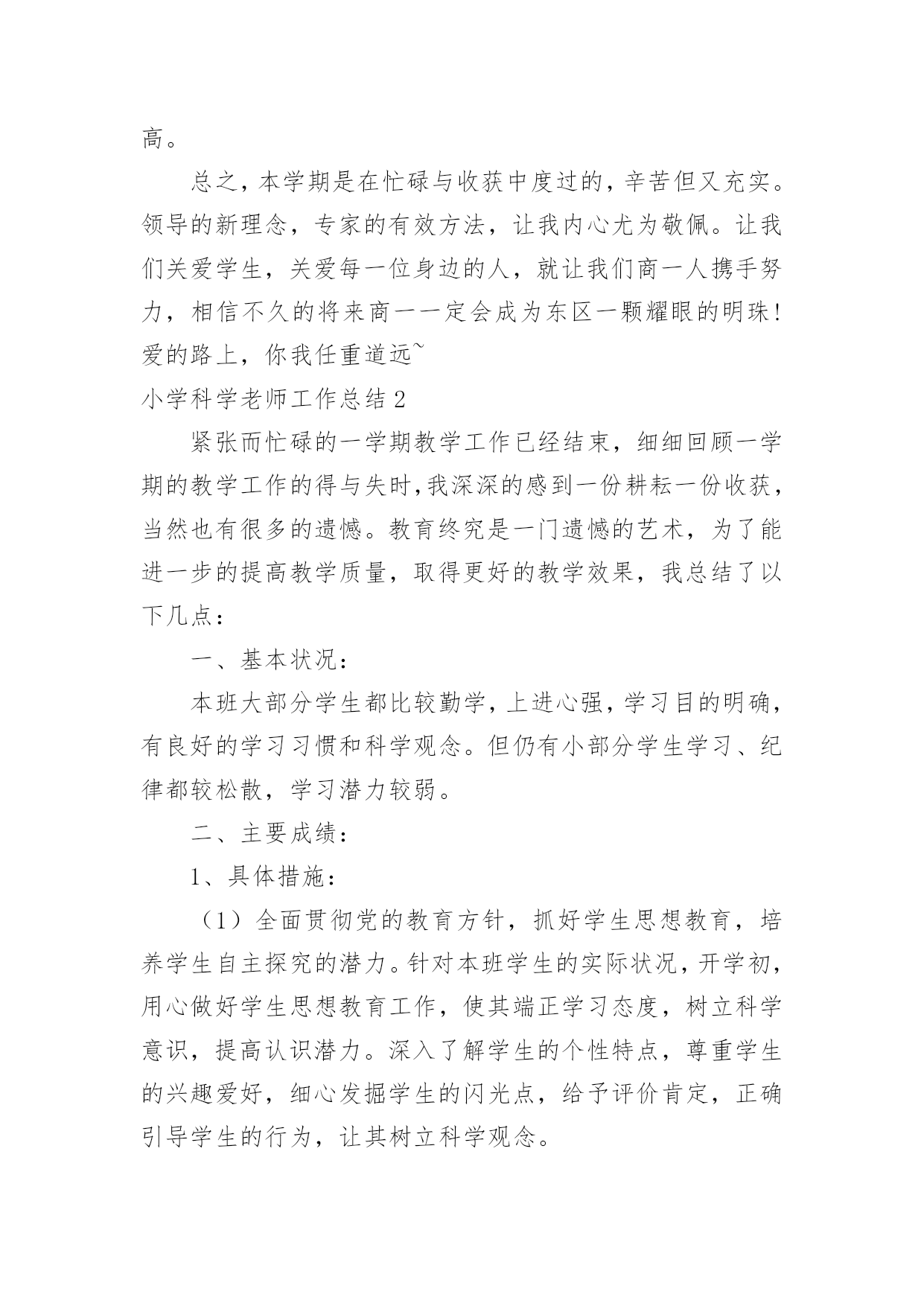 小学科学老师工作总结小学科学老师工作总结(15篇)总结是指对某一阶段的工作、学习或思想中的经验或情况加以总结和概括的书面材料,它能使我们及时找出错误并改正,我想我们需要写一份总结了吧。那么你知道总结如何写吗?下面是小编为大家收集的小学科学老师工作总结,希望对大家有所帮助。小学科学老师工作总结1本学期已接近尾声,回首刚刚走过的这一学期,有太多的体会、收获、汗水与回味。这学期是商一提升的开始,收获的开始。一、收获经历,收获喜悦暑期未尽我们就在王校长"做幸福老师"的讲座培训中拉开了帷幕。开学初大家信心百倍的迎来"最美商一人"的大型活动。与xx电台主持人共同主持我校第一次大型活动的重任放到了我的肩上,我深知代表学校的门面与喉舌,周末晚上加班修改稿子,最终一切顺利,我很欣慰。这是九月值得商一人骄傲的日子,因为通过大家的努力第一次让商一走了出去。王校长在开学初就提出了"请进来,走出去"的理念,请了多位教育界著名的专家来我校指导工作,培训教师,我从中很受精神鼓舞,学到了许多新的理念与方法。也陆续的让老师们出去学习,接受各地新的理念与教学方法。在北师大学习,聆听特级教师们的教学育儿经验,接受教授们和特级教师思想高度的洗礼,真的是受益匪浅,让我懂得了一切教育要用"爱"去唤醒。除了老师们的培训,还有一月一次的家长培训会,让作为家长教师的我感受颇深,真正的拉近了学校与家长,学校与社会的联系,做到了家校合一,促进家长学生的共同进步。"家长开放日"我深知这是第一次把商一展示给社会,于是我精心准备了公开课,那天上午我连上了三个班的英语公开课,虽然有些累,但是得到家长们频频的点头与肯定,我倍感欣慰。之后的督导听课,我依然挤出时间精心准备,得到了督导老师的肯定和对我课程忠恳的指点。本学期最值得我们商一人高兴的是,在王校的'带领指引下,我们全体老师共同努力准备"文明单位"和"绿色学校"的评选,最后的结果还是值得每一位商一人高兴的!而我个人在教课之余,积极准备学校材料,没有完成的拿回家,在安置好女儿饮食起居让她九点入睡后,我再打开电脑进行学校以及我个人进职称的材料,那段时间每晚到凌晨12点多,想想一路过来,自己的付出还是有所回报的。终于再一次次的核审和最终的答辩后,职称得出了可喜的结果。二、教学本学期我带五个班的英语课,我深知责任的重大,孩子多,作业任务量大,我在客观条件无法改变的情况下,尽力不断改变检查方式,分层布置或抽查等,确保完成正常教学任务的同时提高效率。每天三节英语课连上,即使很累,课堂上我也不放弃任何知识点,反复让学生练习巩固,形式多样,抓紧每分每秒让孩子多说多练。我崇尚鼓励式教学,不放弃每一位孩子。在刚接个别班时,英语课堂上几乎没人敢举手发言,要么被动地叫起来声音却很小。于是课堂上,我尽量变化形式,调动孩子们的积极性,鼓励着每一位学生。几周时间,原来不爱发言的学生也踊跃举手对话了,甚至有些时候孩子们的热情让我感到小小的压力,生怕因为时间关系对叫不到发言的孩子一种打击,同时我倍感欣慰的是,这帮孩子们终于乐于开口说英语了。在听过北京一所小学的英语课后,我感触很深,如专家所说"教学不能局限于应试考试之中,那我们教育方向就走偏了。"我想以后也尽量尝试用全英教学,对于孩子和自身都是一种锻炼,从长远来看对孩子英语语言学习英语思维形成是肯定有帮助的。三、困惑与期望相信每一位教师都是尽力想让所教班级成绩优异,我也同样。只是所带班级多,人数大,精力和时间分布较散,没有集中点,这对于每班一周三节的主课来说,确实心有余而力不足的感觉。客观条件的存在,确实需要我们两个动动脑筋,监督检查力度不够,就会造成成绩提高缓慢。这也是我最为困惑的一点,因为毕竟我们本职工作就是教学。因此,我想在新的学期,要在教学方法上大胆创新,特别对于学生的检查评价力度要想办法提高。我想只有鼓动家长和老师一起配合好,课堂课下都抓好了,学生成绩才能顺利成章的提高。总之,本学期是在忙碌与收获中度过的,辛苦但又充实。领导的新理念,专家的有效方法,让我内心尤为敬佩。让我们关爱学生,关爱每一位身边的人,就让我们商一人携手努力,相信不久的将来商一一定会成为东区一颗耀眼的明珠!爱的路上,你我任重道远~小学科学老师工作总结2紧张而忙碌的一学期教学工作已经结束,细细回顾一学期的教学工作的得与失时,我深深的感到一份耕耘一份收获,当然也有很多的遗憾。教育终究是一门遗憾的艺术,为了能进一步的提高教学质量,取得更好的教学效果,我总结了以下几点:一、基本状况:本班大部分学生都比较勤学,上进心强,学习目的明确,有良好的学习习惯和科学观念。但仍有小部分学生学习、纪律都较松散,学习潜力较弱。二、主要成绩:1、具体措施:(1)全面贯彻党的教育方针,抓好学生思想教育,培养学生自主探究的潜力。针对本班学生的实际状况,开学初,用心做好学生